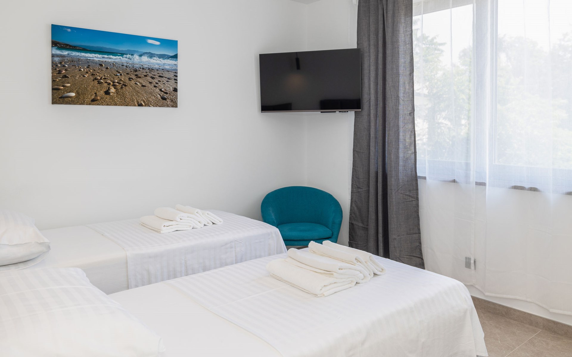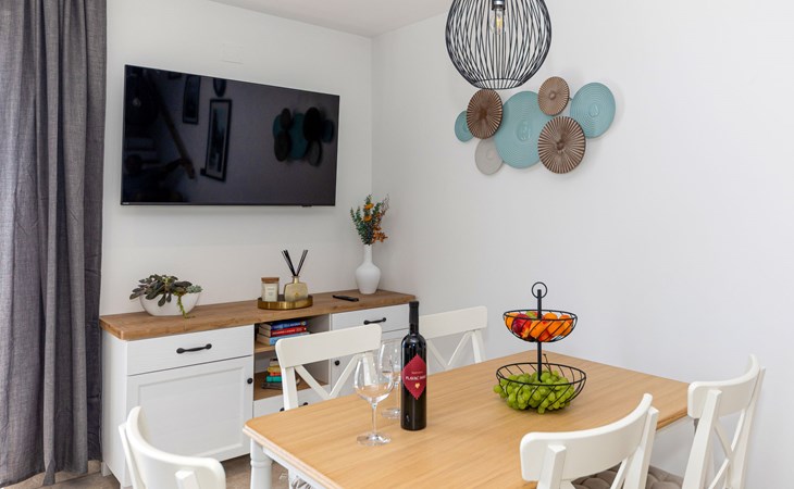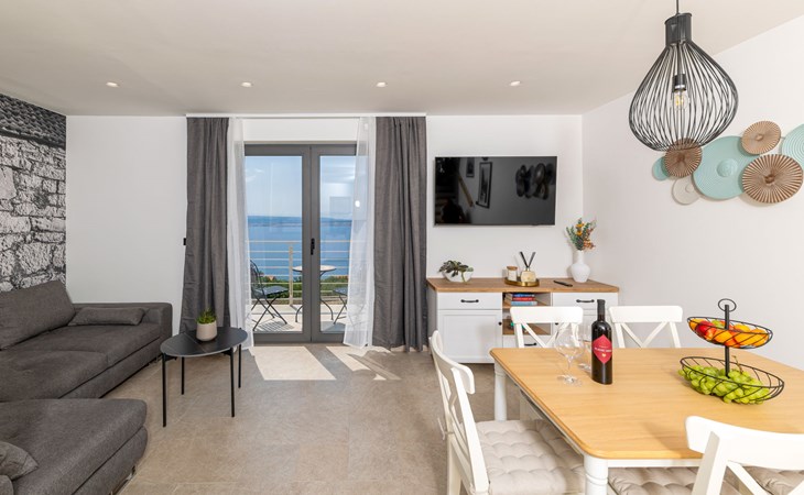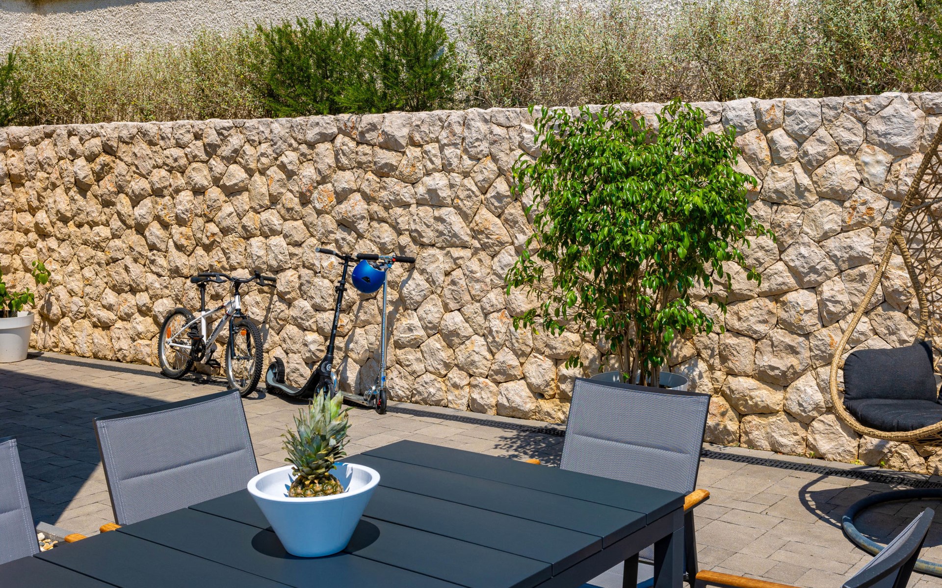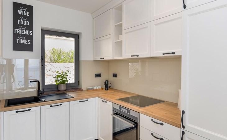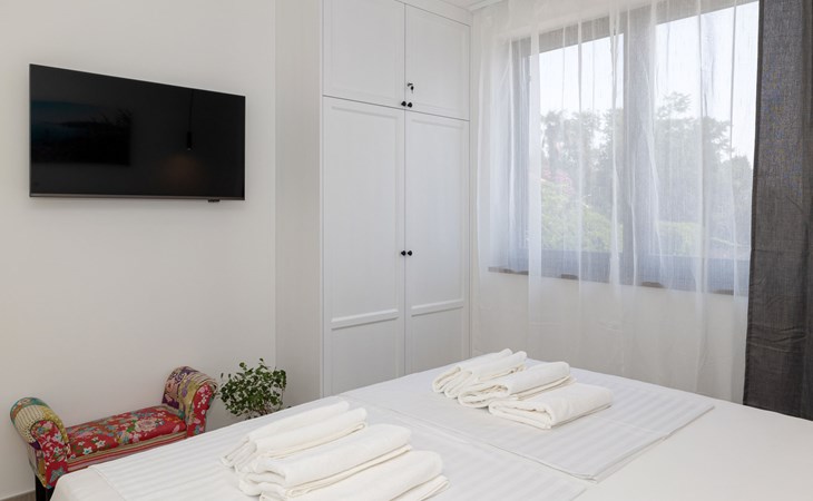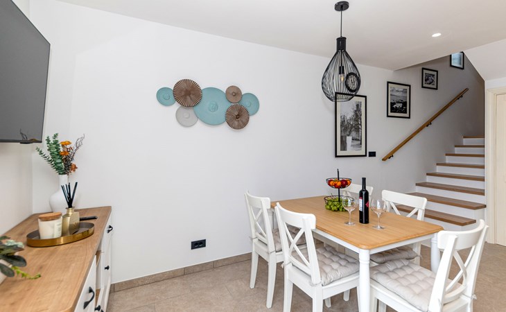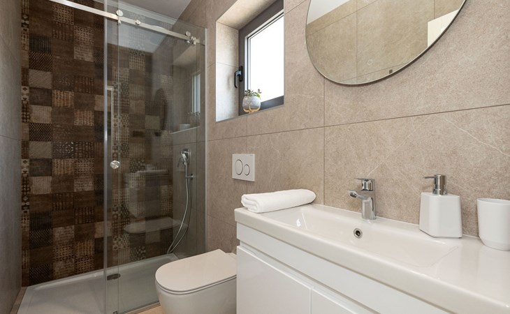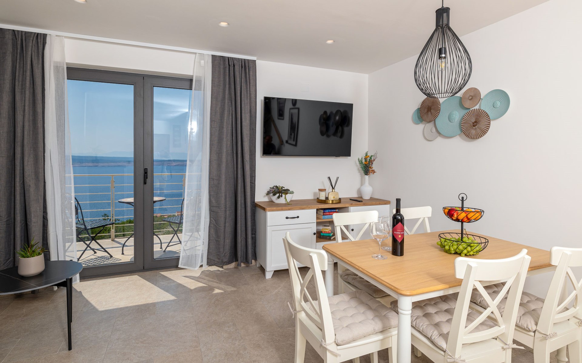 Dramalj 4 km from Crikvenica: Modern, comfortable semi-detached house "Marika", 2 storeys. 650 m from the centre of Dramalj, in a quiet, sunny position, 500 m from the sea, 500 m from the beach. Private: property 200 m2 (fenced), swimming pool angular (24 m2, depth 140 cm, seasonal availability: 01.May. - 31.Oct.) with internal staircase. Outdoor shower, pool maintenance by the owner/gardener. In the house: internet access, washing machine. Parking (for 3 cars) at the house on the premises. Shop 650 m, supermarket 2.2 km, restaurant 600 m, bus stop 1.3 km, pebble beach, concrete beach 500 m. The owner does not accept any youth groups.