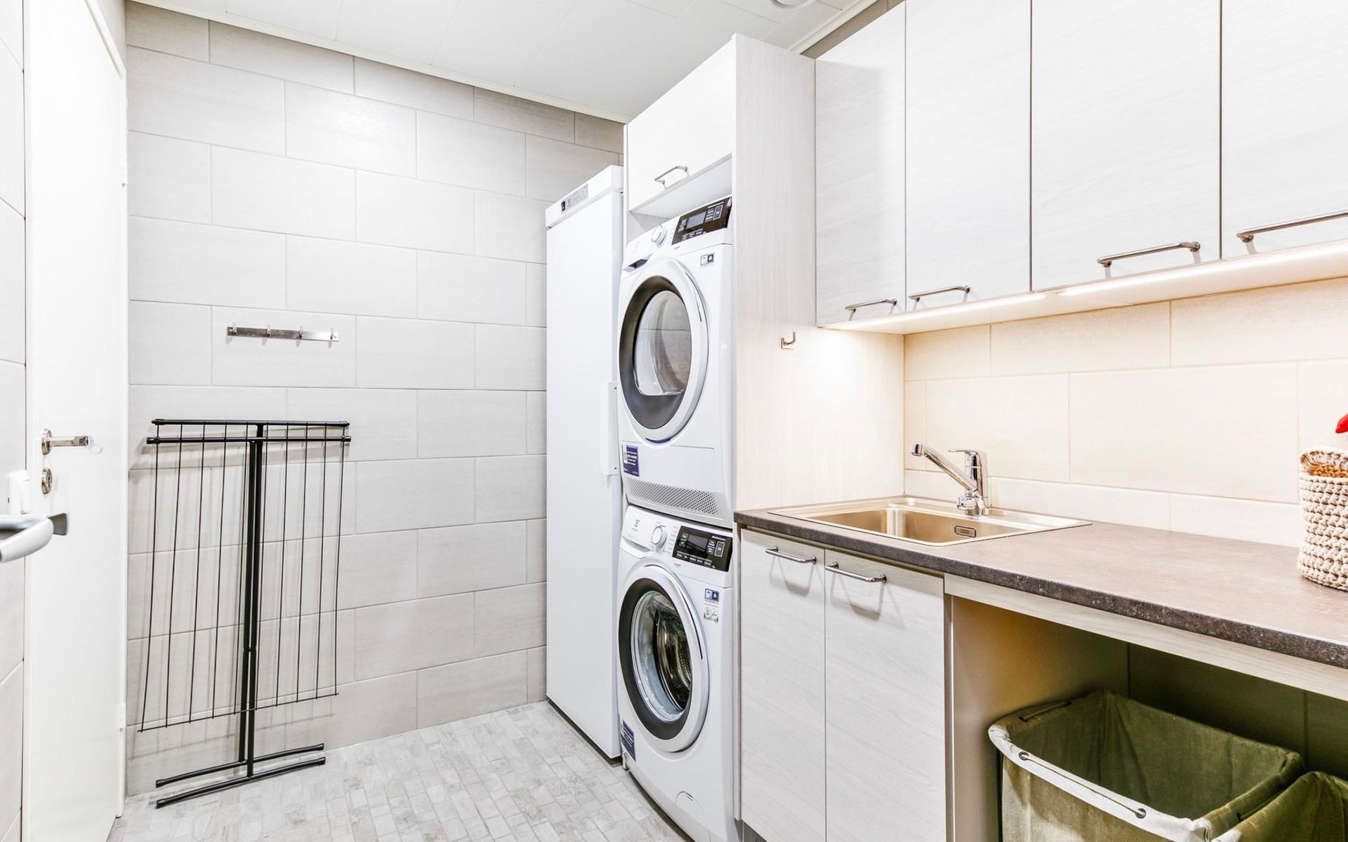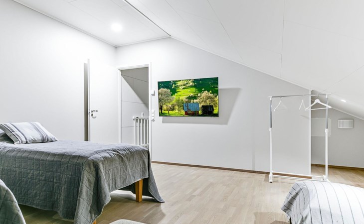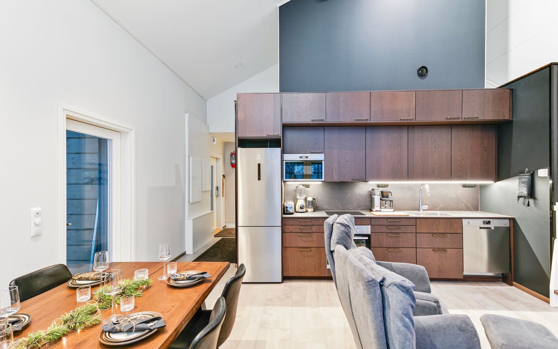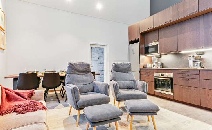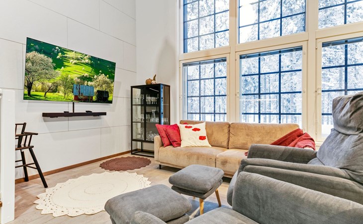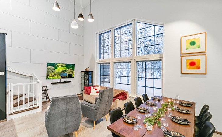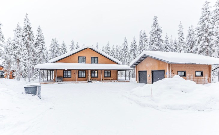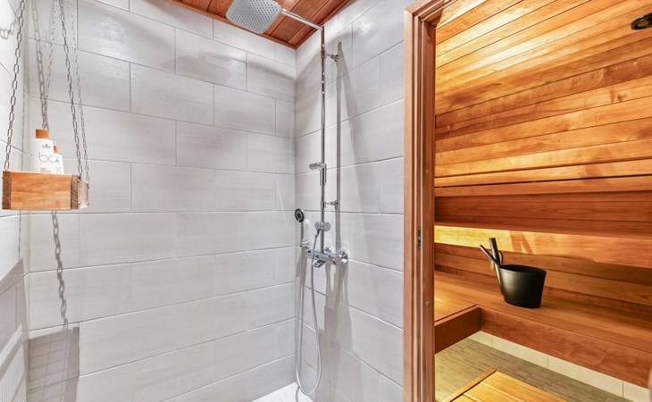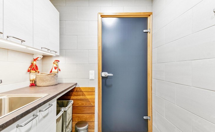 The modernly decorated open-plan kitchen and spacious living areas provide plenty of room for togetherness. The utility room includes a washing machine, dryer, and sink, adding extra convenience to your stay. You can enjoy relaxing sauna moments in the sauna and cozy bathroom.