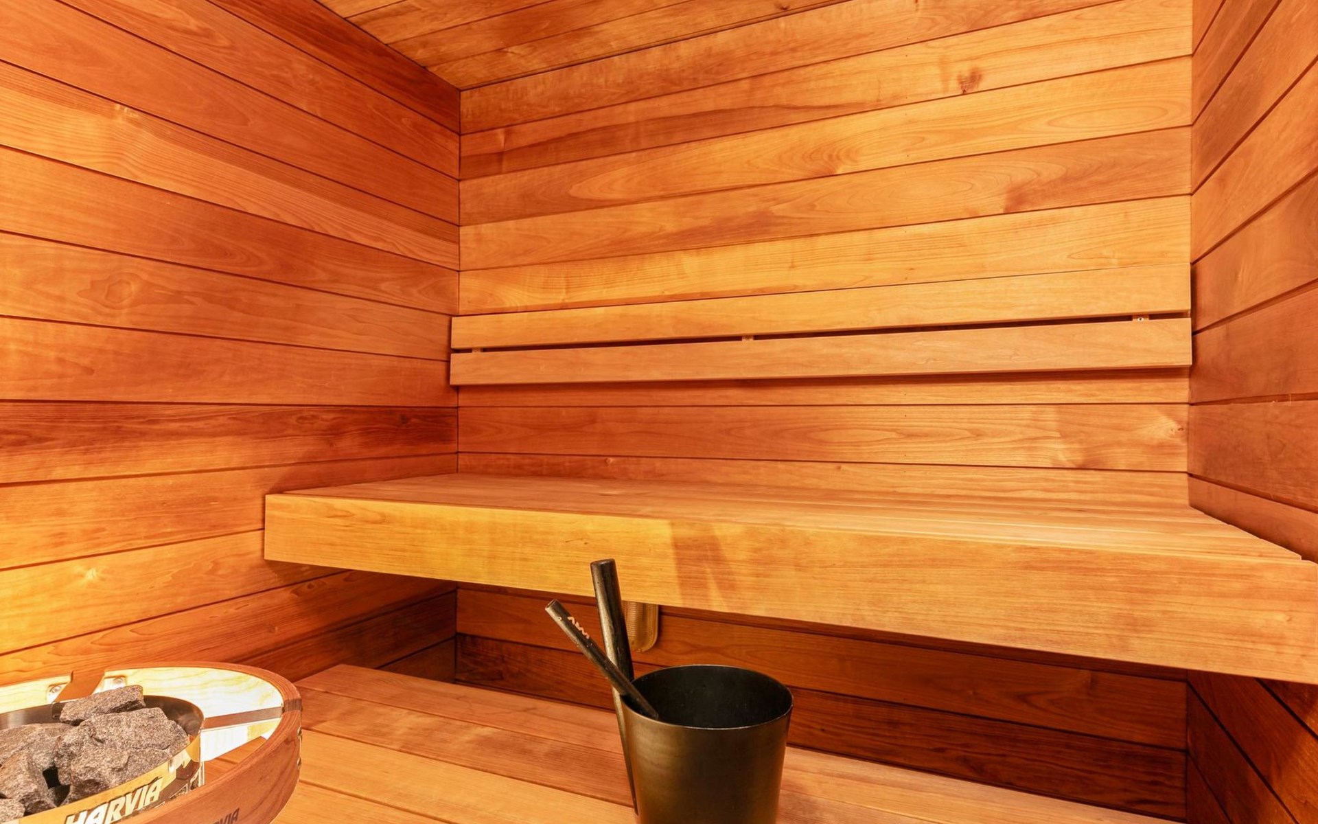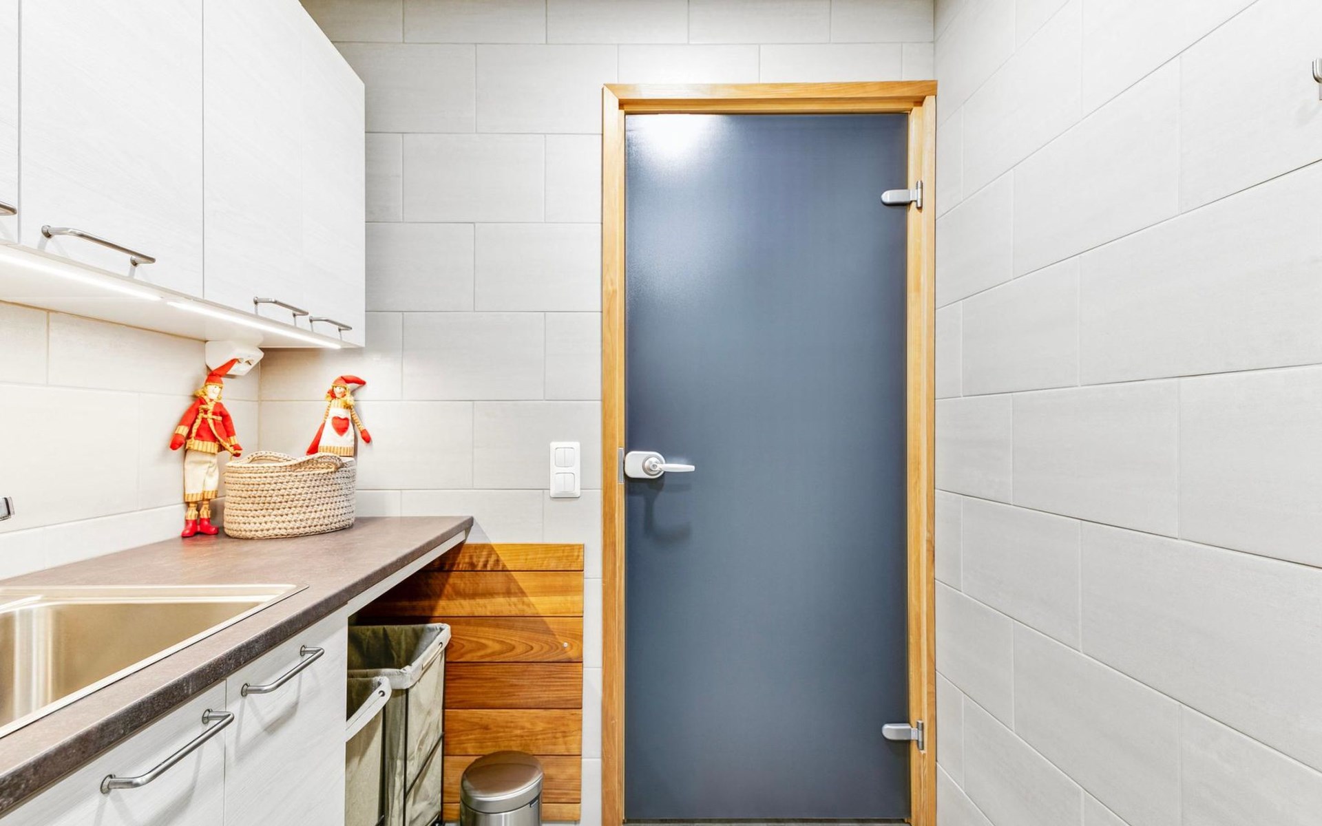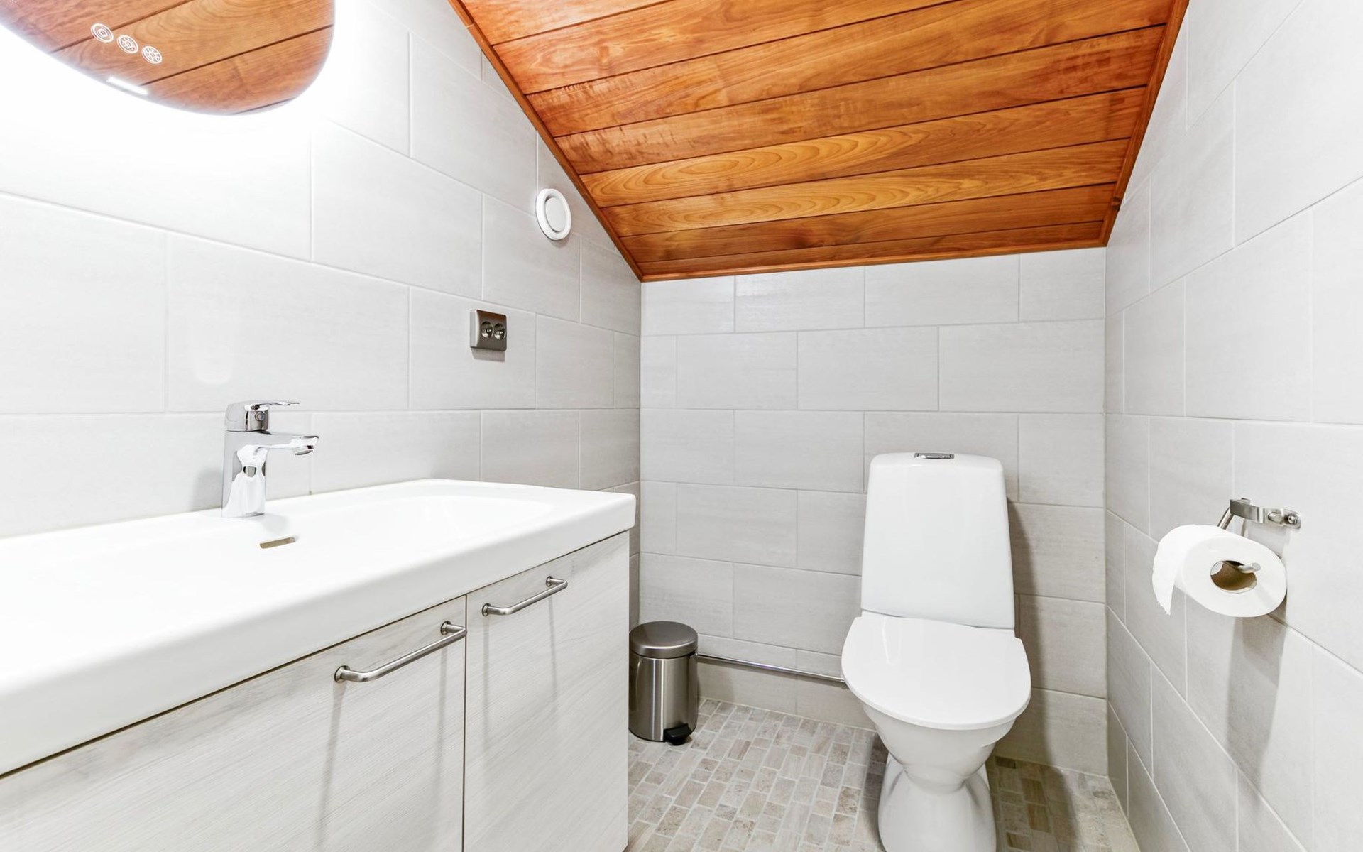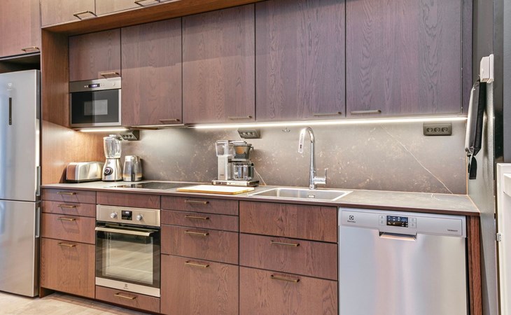 The modernly decorated open-plan kitchen and spacious living areas provide plenty of room for togetherness. The utility room includes a washing machine, dryer, and sink, adding extra convenience to your stay. You can enjoy relaxing sauna moments in the sauna and cozy bathroom.