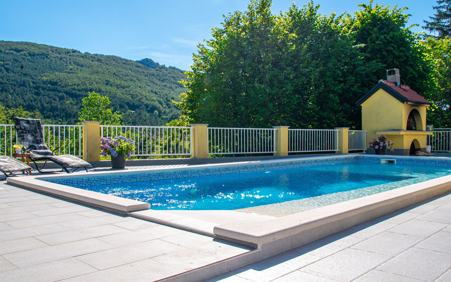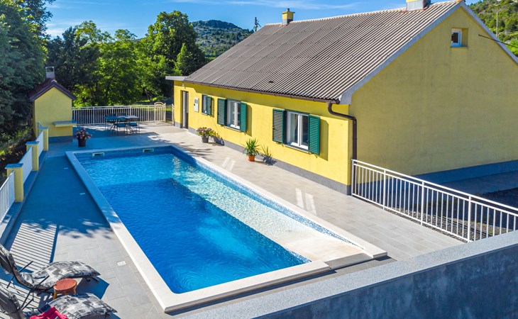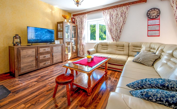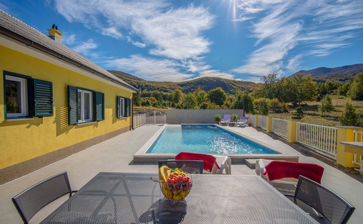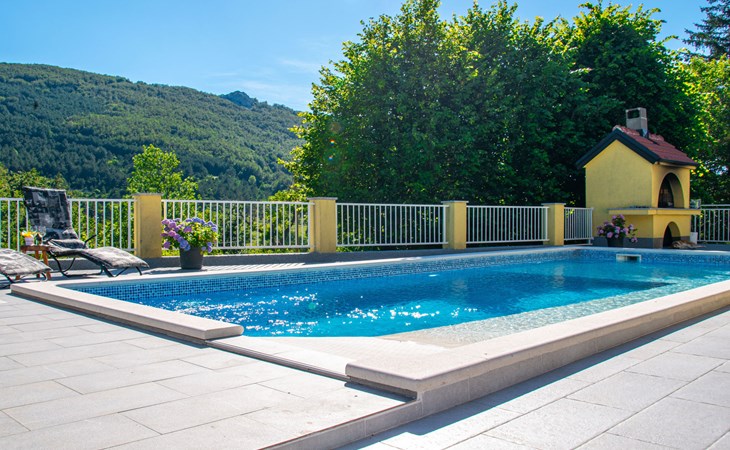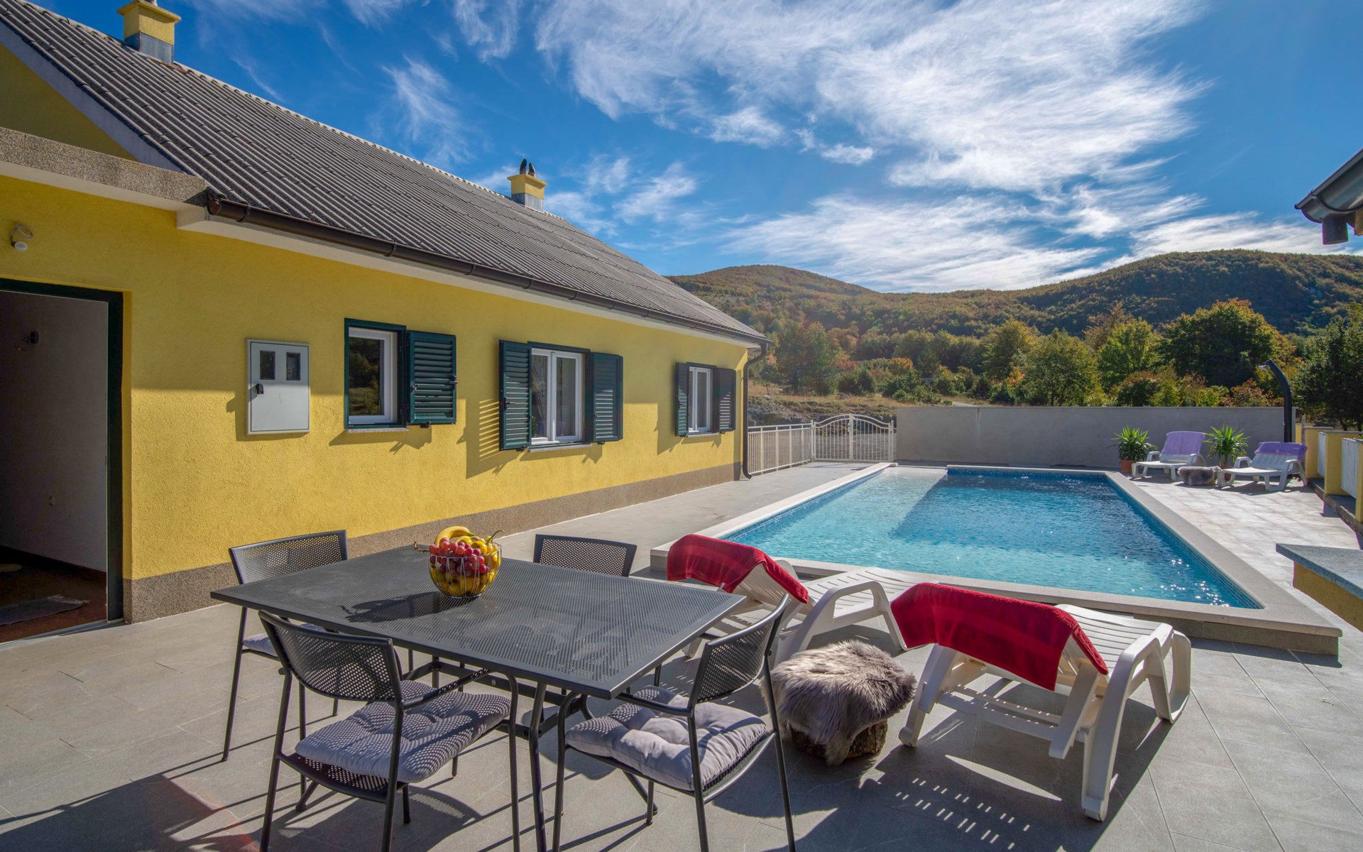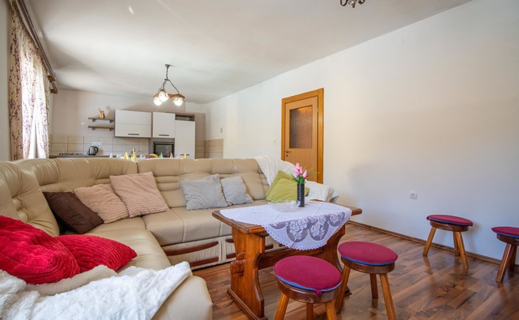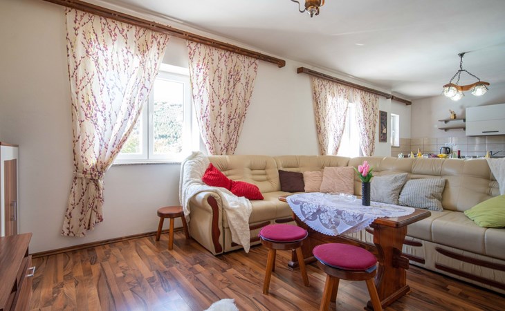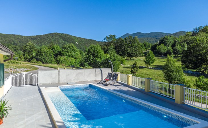 Single-family house "Saulja". In the hamlet Oltari 14 km from the centre of Sveti Juraj, in a quiet, sunny position, 14 km from the sea, in the countryside. Private: property 960 m2, swimming pool angular (10 x 4 m, depth 80 - 140 cm, seasonal availability: 01.May. - 01.Oct.) with internal staircase and salt-electrolysis pool-cleaning system. Outdoor shower, terrace (45 m2), garden furniture, barbecue, pool maintenance by the owner/gardener. In the house: internet access, washing machine. Parking (for 3 cars) at the house on the premises. Shop 10 km, restaurant 10 km, bus stop 500 m, pebble beach 14 km, concrete beach 14 km. Nearby attractions: national parki Sjeverni Velebit 18 km. Swimming pool with hydromassage. Swimming pool with handicap access.