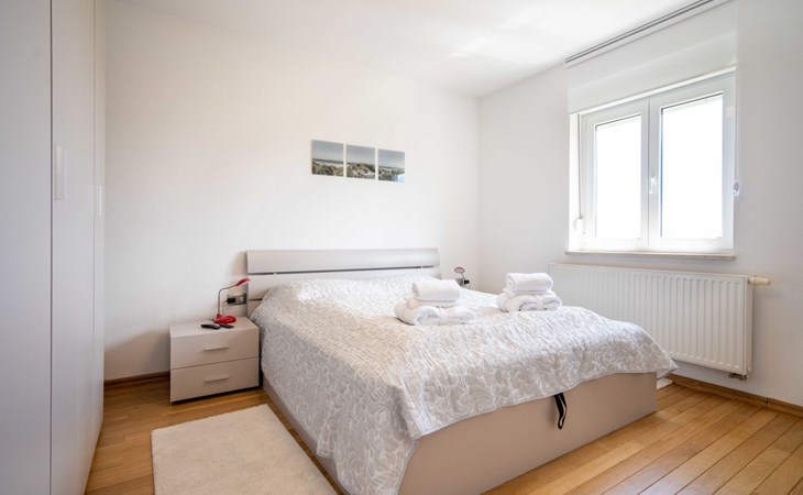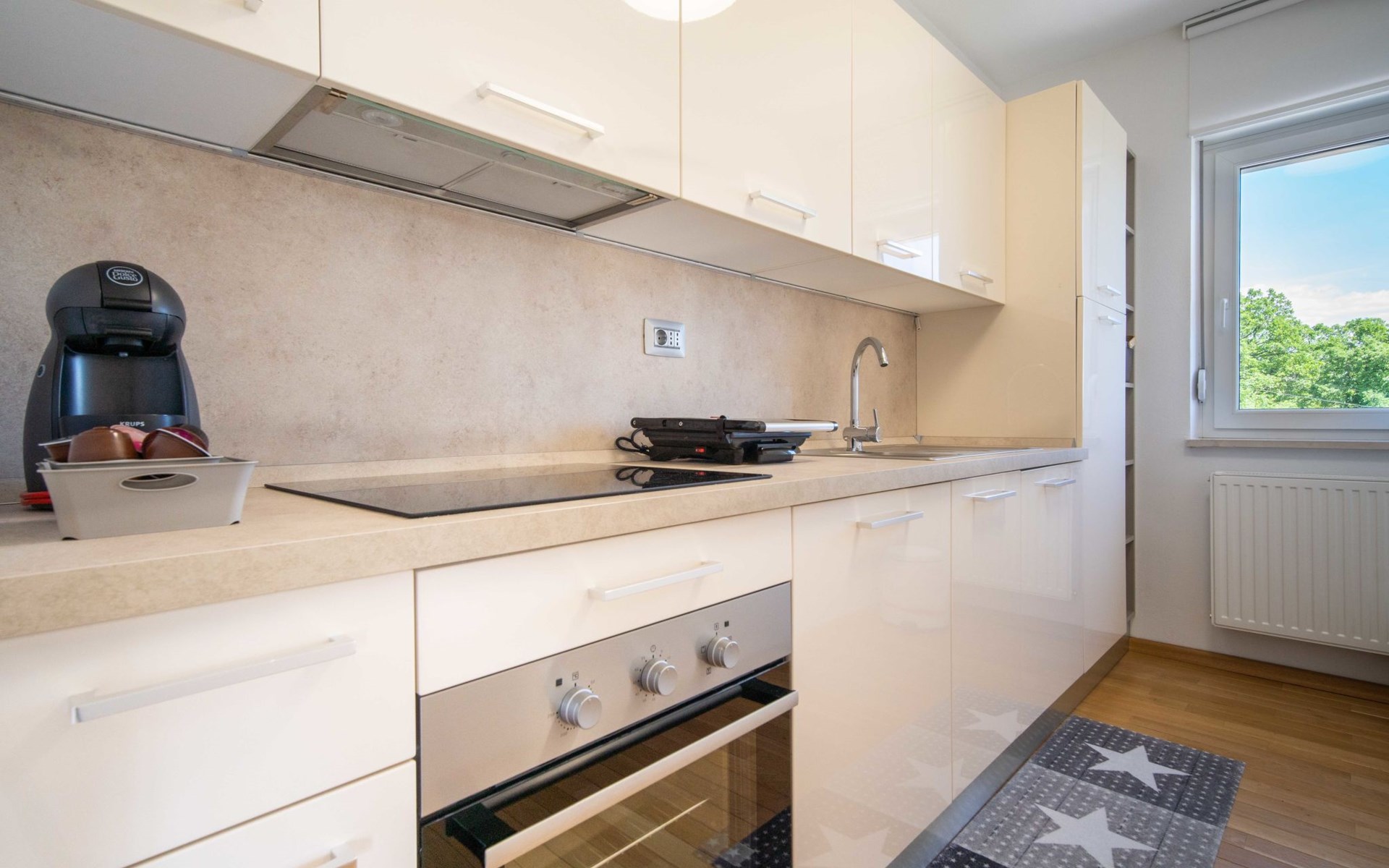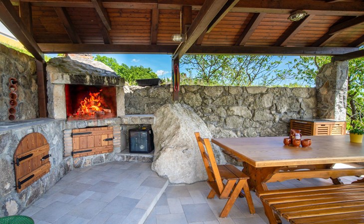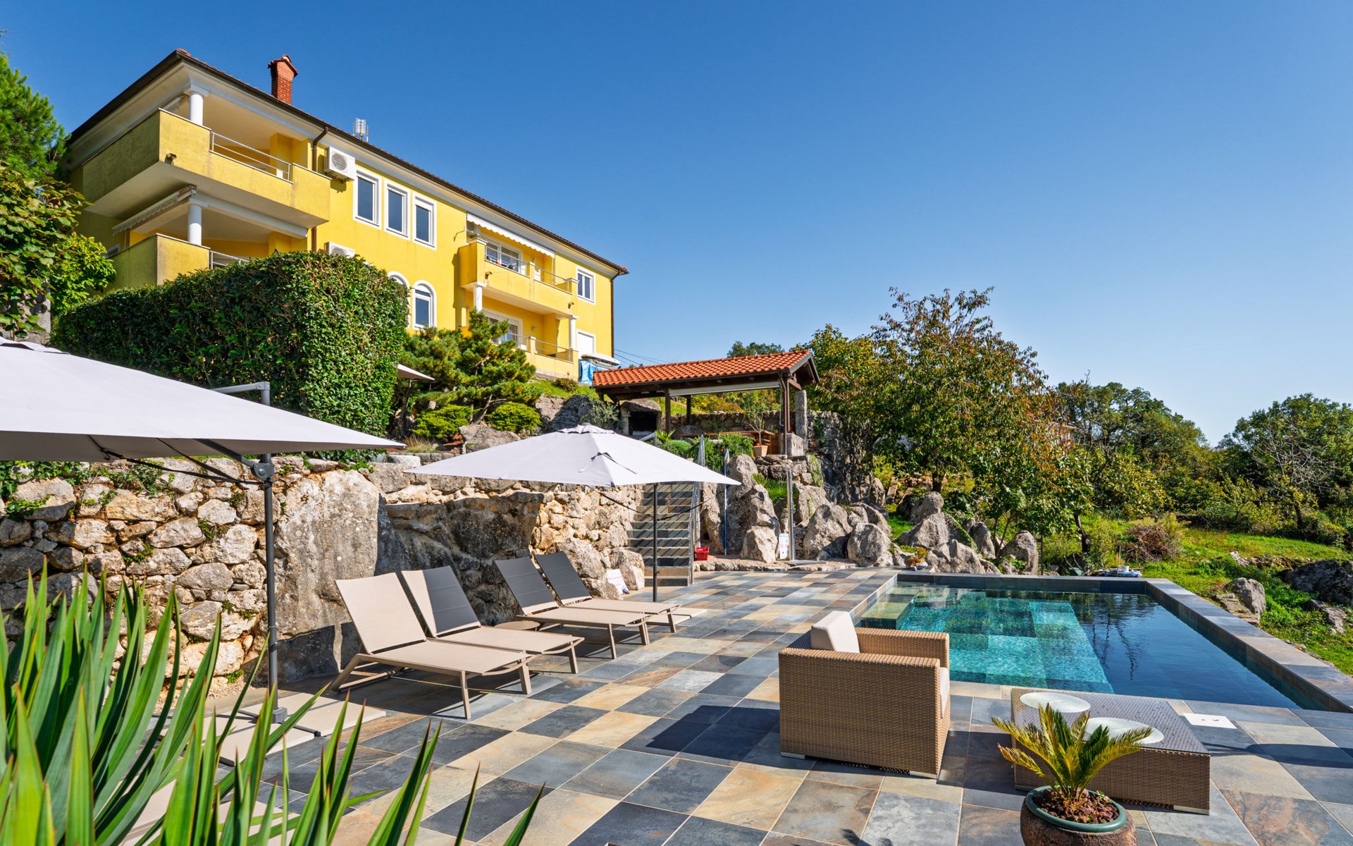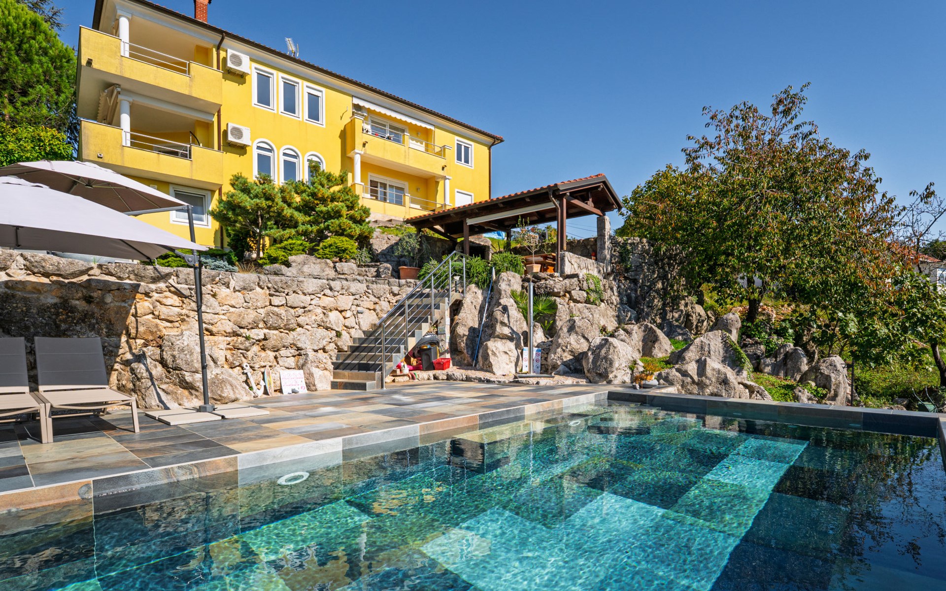 Kastav 7 km from Opatija: 3-family house "Kvarner house". 850 m from the centre of Kastav, 9.5 km from the centre of Rijeka, in a quiet, sunny, elevated position, 5.5 km from the sea. For shared use: property 2'000 m2 with lawn and plants, swimming pool angular (7 x 4 m, depth 150 cm, seasonal availability: 01.May. - 01.Oct.) with internal staircase and salt-electrolysis pool-cleaning system. Outdoor shower, hot tub, terrace (30 m2), garden furniture, barbecue. In the house: internet access. Parking at the house on the premises. Shop, supermarket 650 m, restaurant 850 m, bus stop 500 m, pebble beach 5.5 km, concrete beach 5.5 km. ,The hot tub can be used all year round.