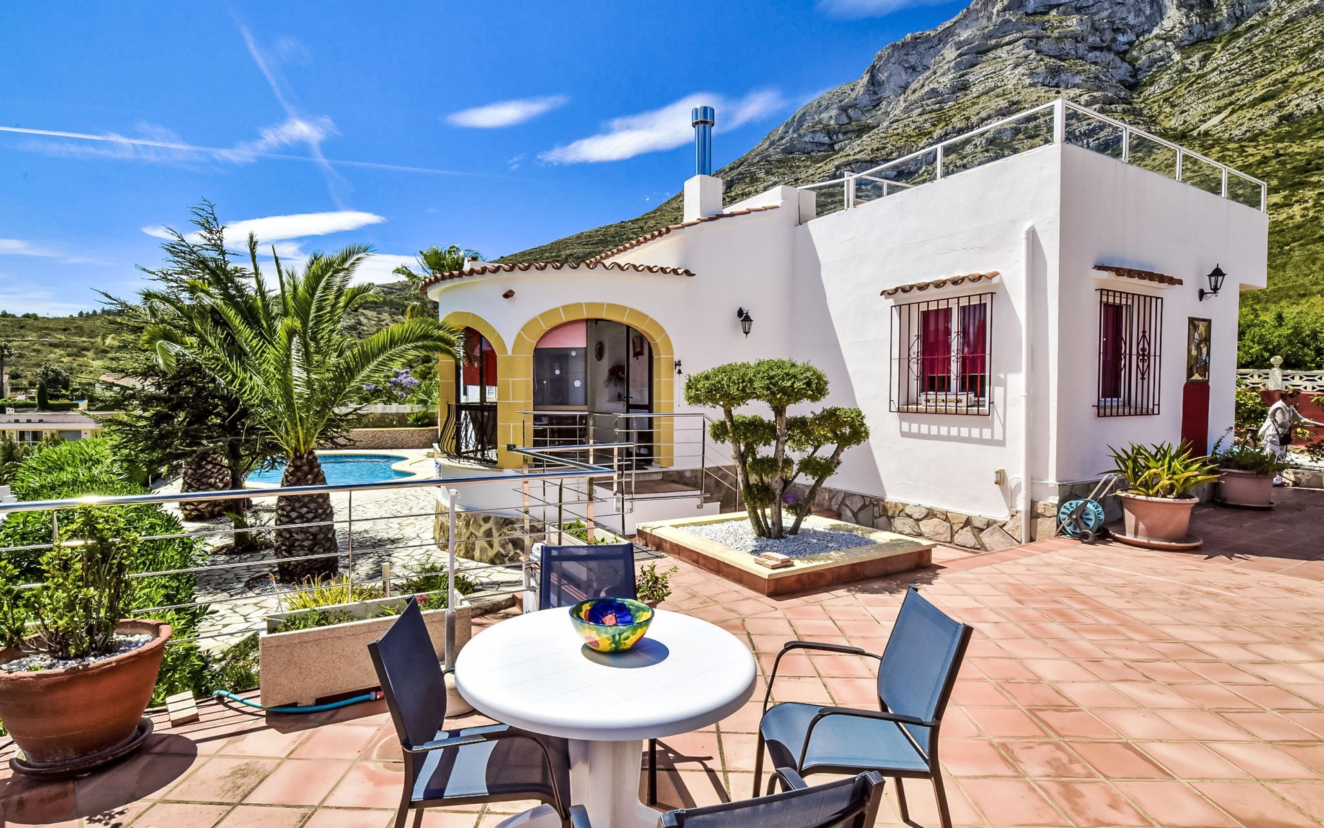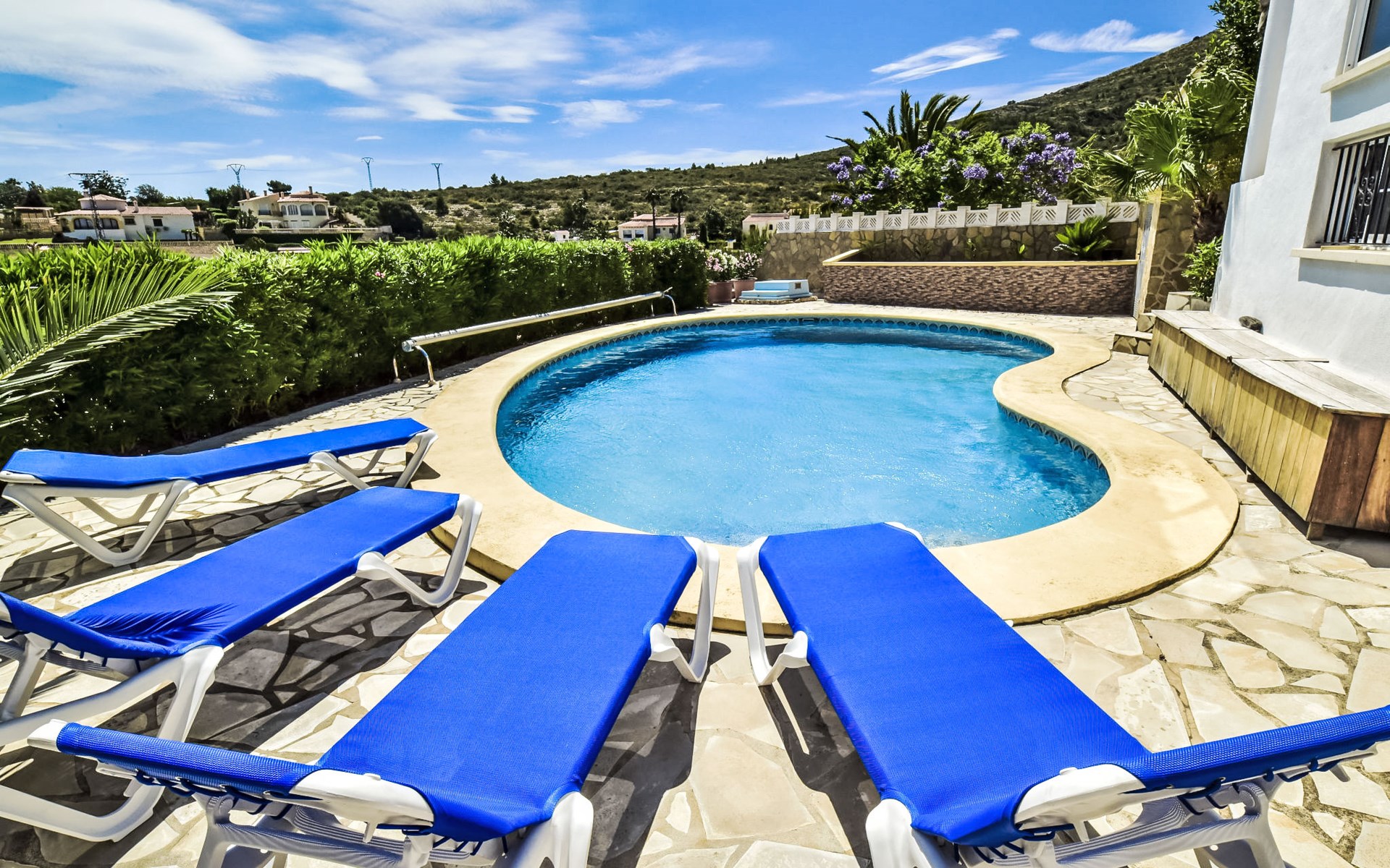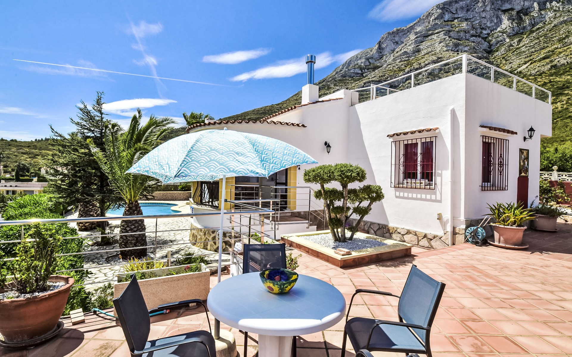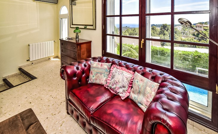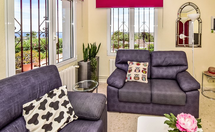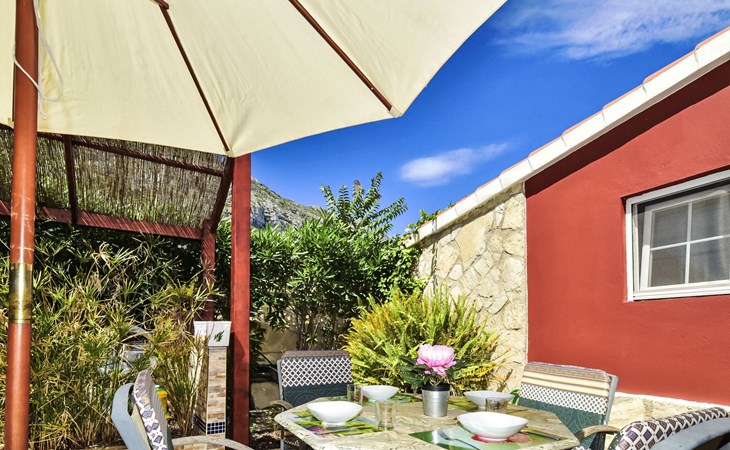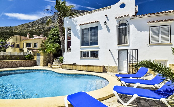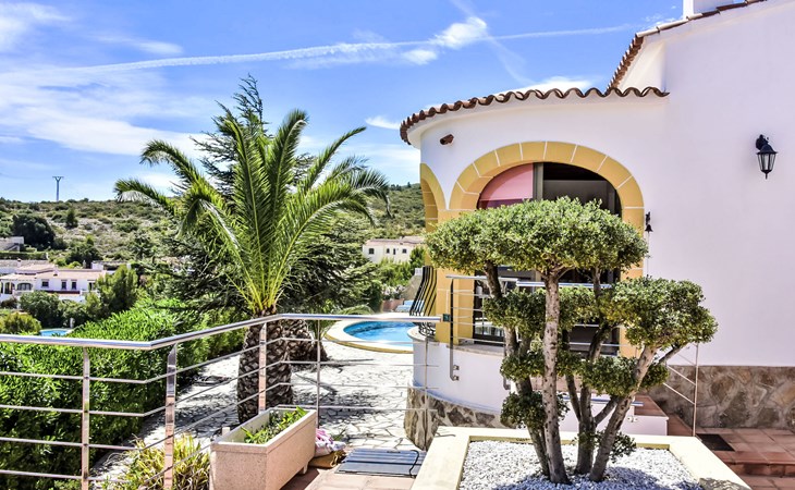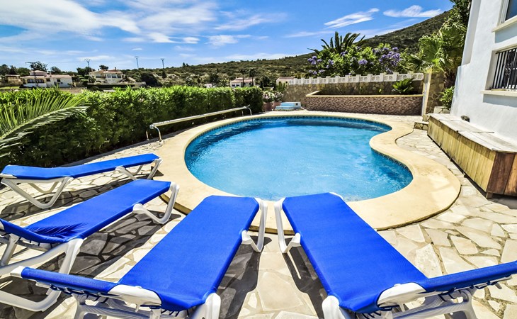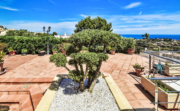 Bellavista: Beautiful, cosy house "Bellavista". In the resort 4.5 km from the centre of Dénia, 3 km from the sea, 3.9 km from the beach, in a cul-de-sac. Private: beautiful, well-kept garden with wildlife garden and trees, swimming pool kidney shaped (5 x 10 m, depth 1 - depth 180 cm, seasonal availability: 01.Jan. - 31.Dec.). Stepped path (17 steps) to the house. Parking, single garage. Supermarket 4 km, restaurant 2 km, bar 1.5 km, bus stop 4.5 km, railway station 4.5 km, ferry 4.5 km, sandy beach 4.5 km. Sports harbour 4.5 km, marina 4.5 km, surf school 4.5 km, sailing school 4.5 km. Please note: not suitable for small children. The owner does not accept any youth groups.