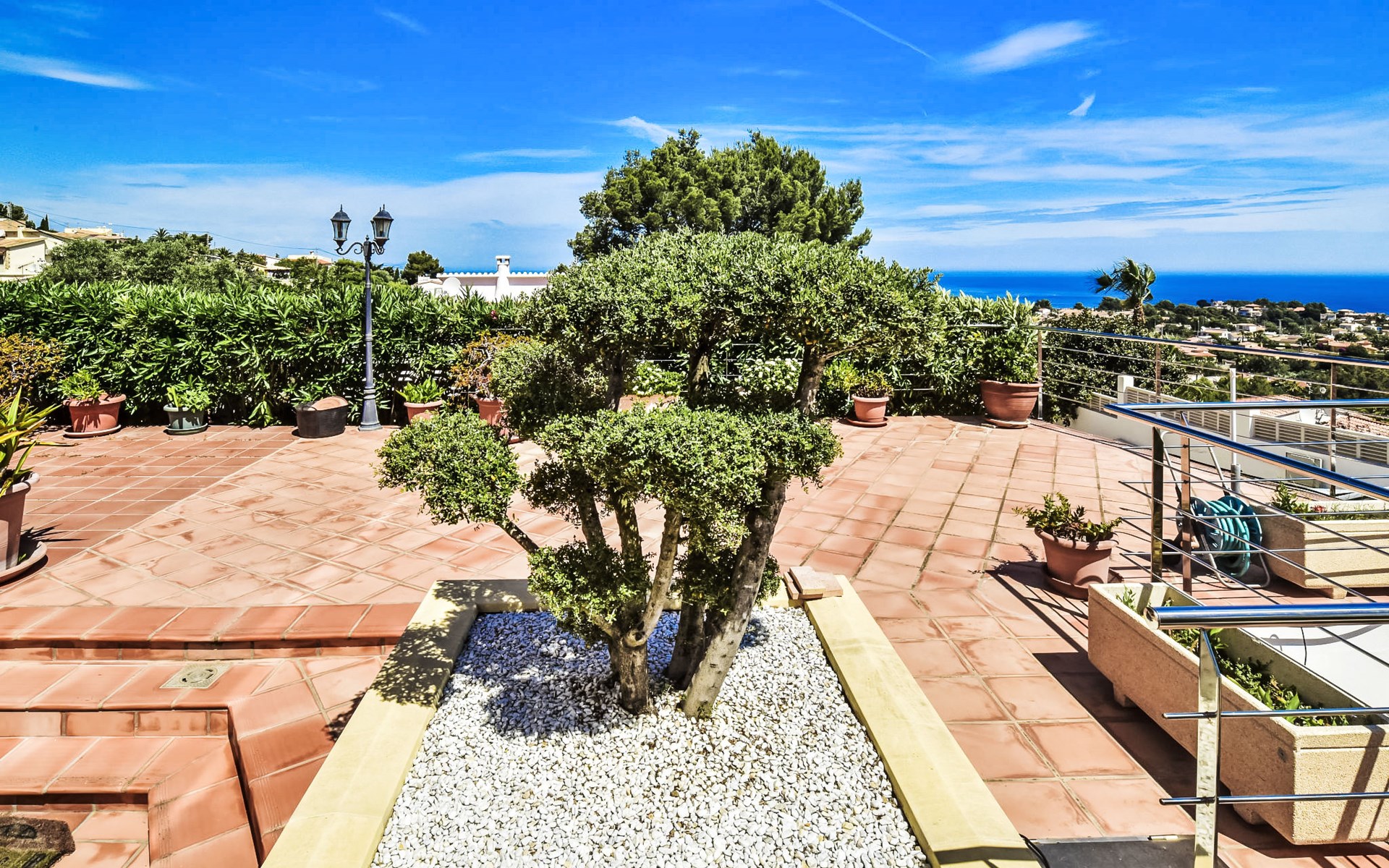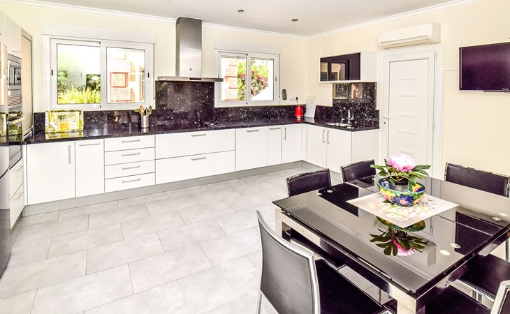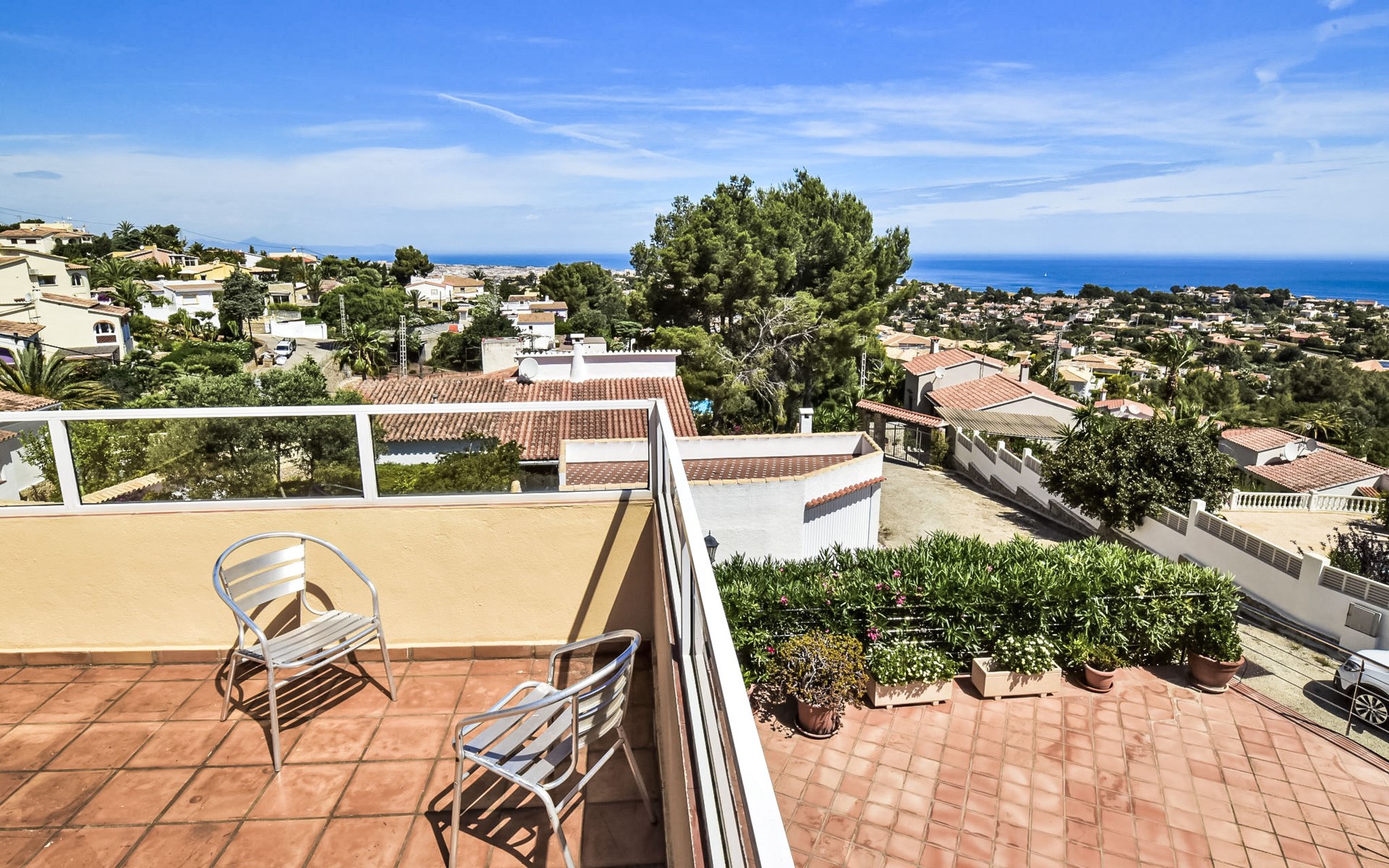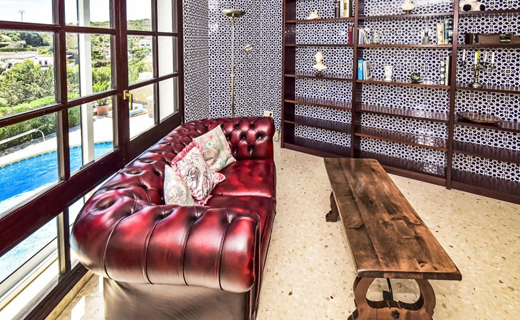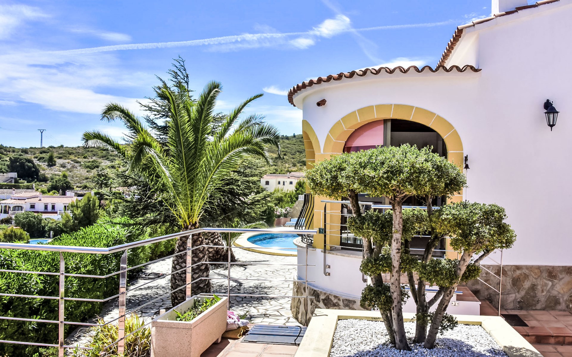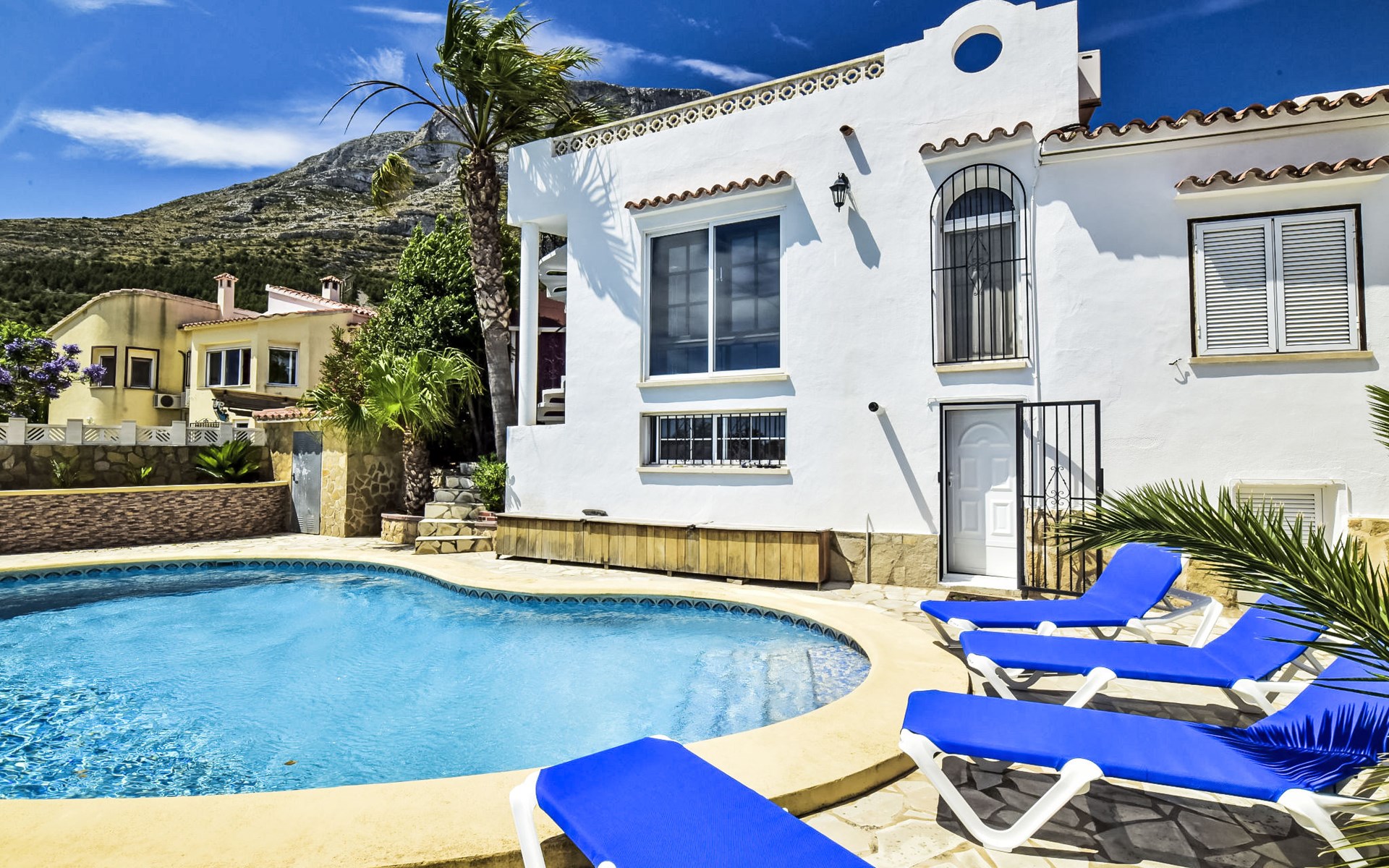 Bellavista: Beautiful, cosy house "Bellavista". In the resort 4.5 km from the centre of Dénia, 3 km from the sea, 3.9 km from the beach, in a cul-de-sac. Private: beautiful, well-kept garden with wildlife garden and trees, swimming pool kidney shaped (5 x 10 m, depth 1 - depth 180 cm, seasonal availability: 01.Jan. - 31.Dec.). Stepped path (17 steps) to the house. Parking, single garage. Supermarket 4 km, restaurant 2 km, bar 1.5 km, bus stop 4.5 km, railway station 4.5 km, ferry 4.5 km, sandy beach 4.5 km. Sports harbour 4.5 km, marina 4.5 km, surf school 4.5 km, sailing school 4.5 km. Please note: not suitable for small children. The owner does not accept any youth groups.