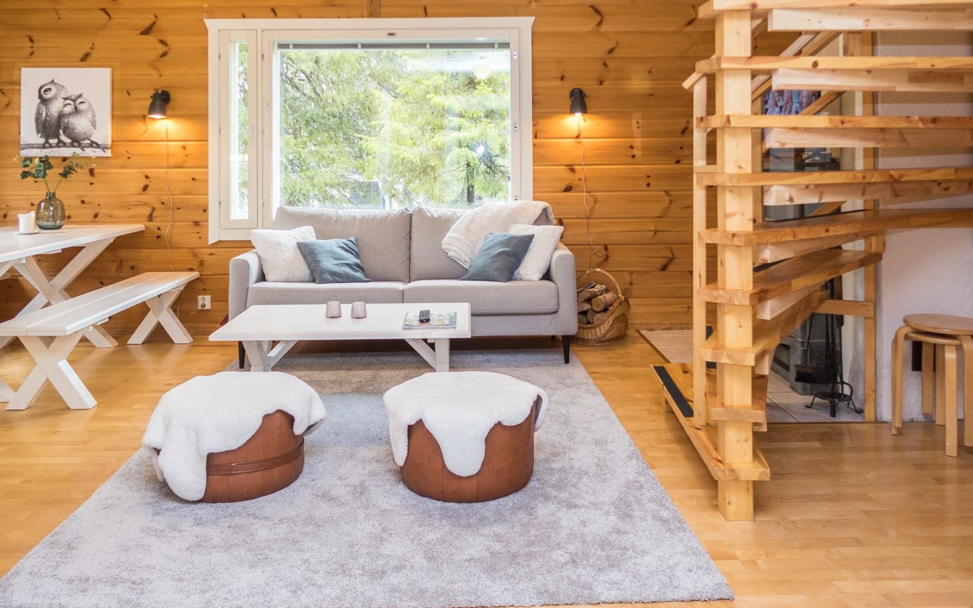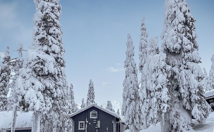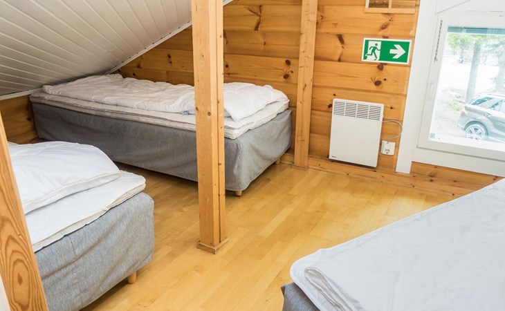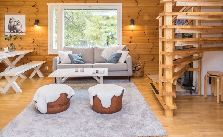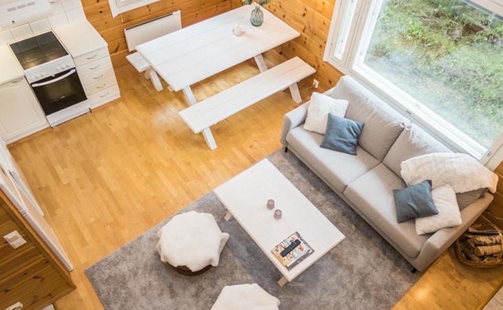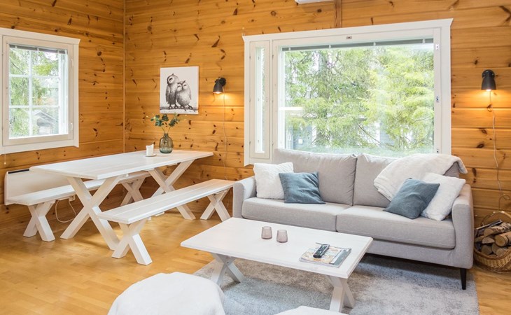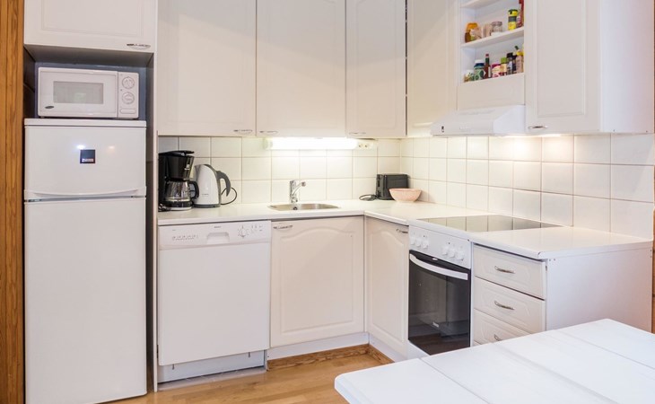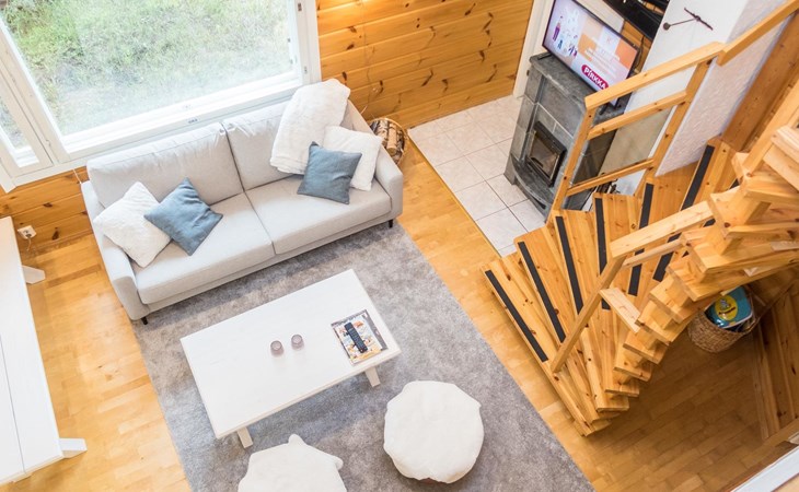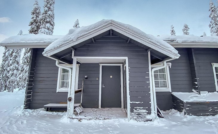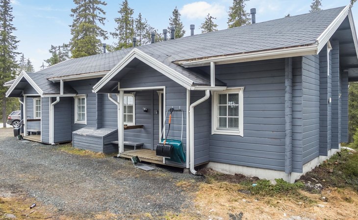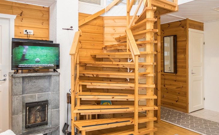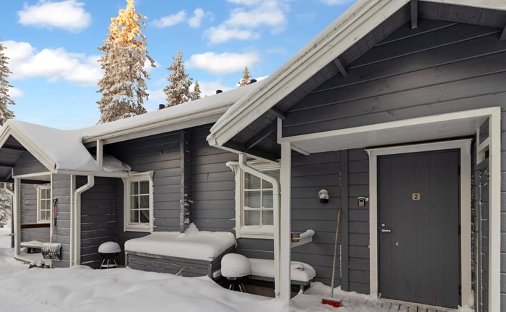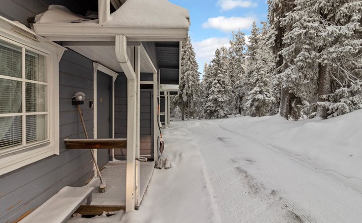 27 km to the north from Kuusamo, Vuosseli (East-Ruka) 900 m, Ruka village 4,9 km. Apartment in a log-built semi-detached house, built in 1995. Bedrooms 1-2 (on the ground floor): 2 beds, bedroom 1 in the loft (folding door): 3 beds, bedroom 2 in the loft (folding door): 120 cm bed, lobby in the loft: 3 beds, living room/kitchen, electric sauna.