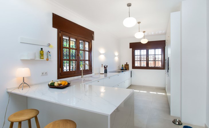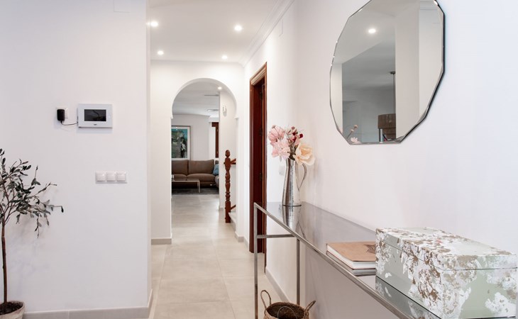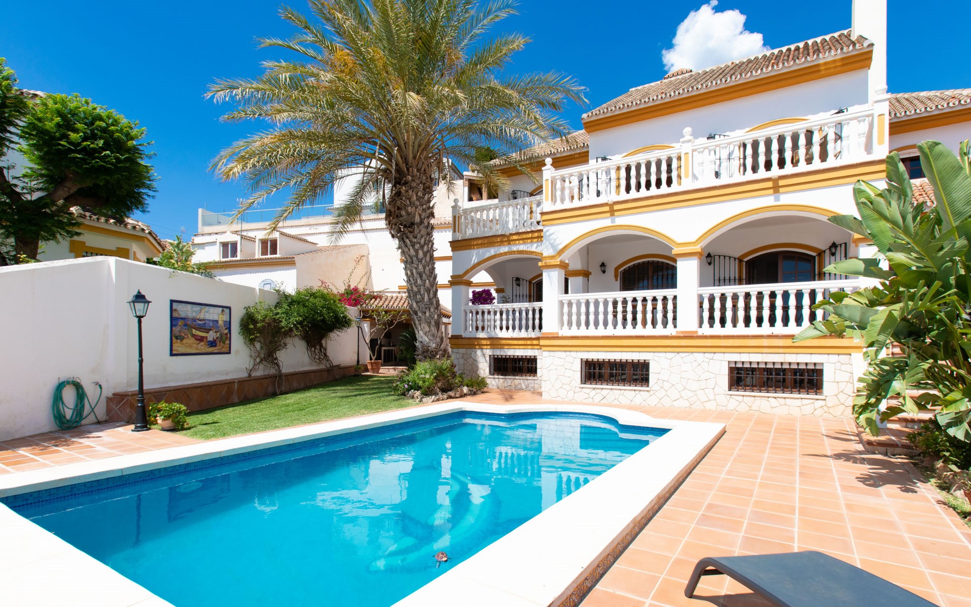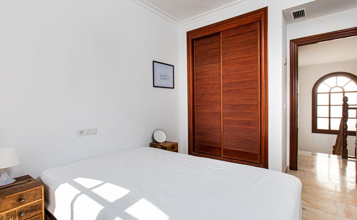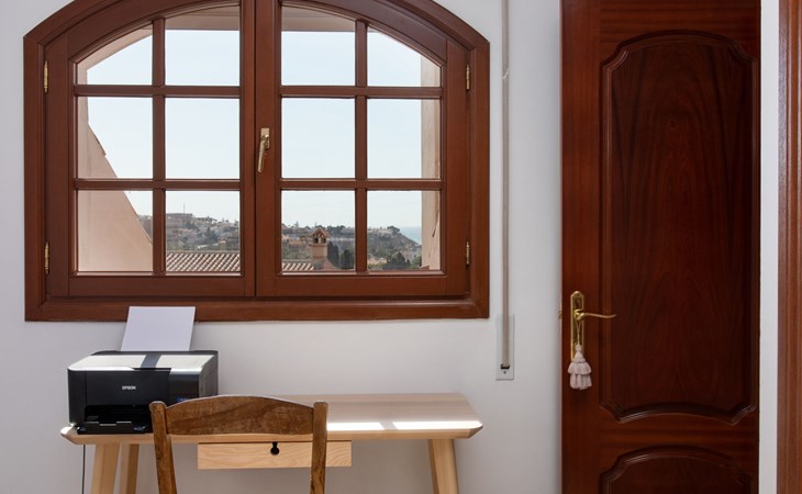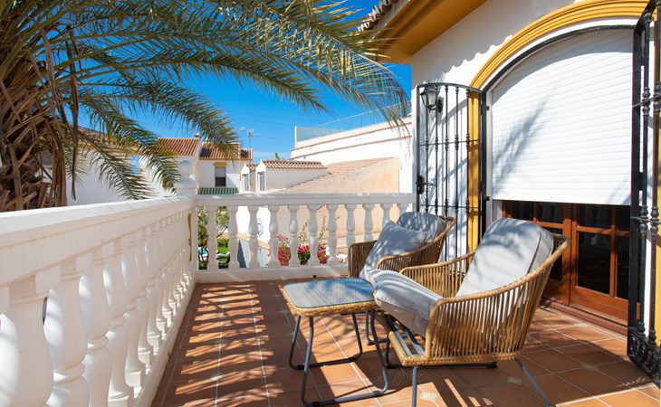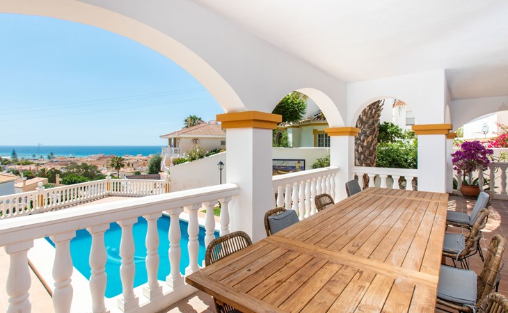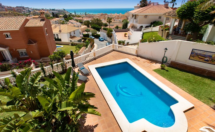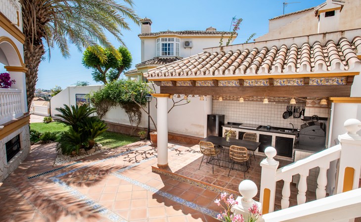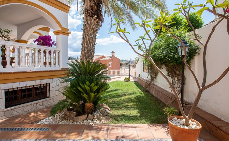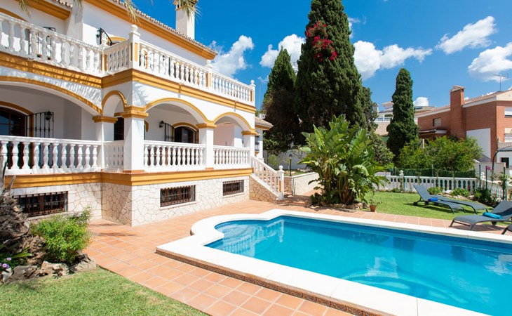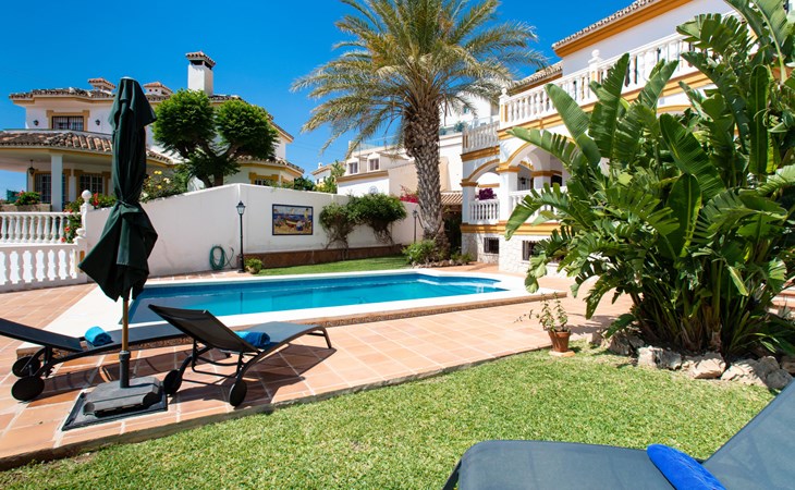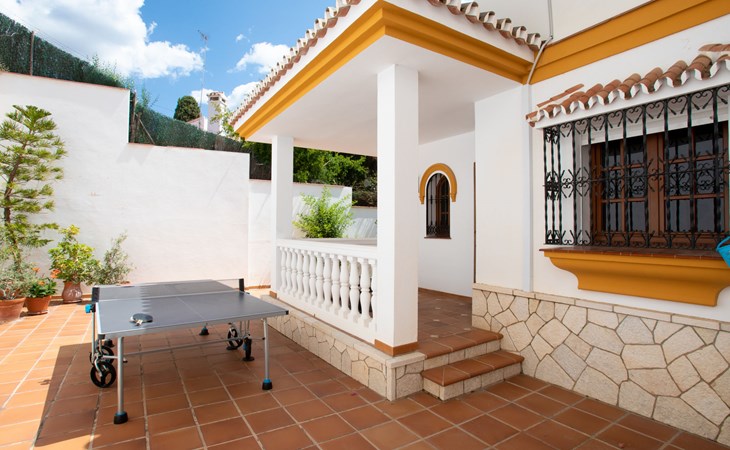 Cala del moral 2 km from Rincón de la Victoria: Beautiful, cosy single-family house "Fragata House", renovated in 2022. In the resort 350 m from the centre of Cala del moral, in a sunny position, 600 m from the sea. Private: garden with lawn, swimming pool angular (4 x 8 m, depth 105 - 230 cm, seasonal availability: 01.Mar. - 01.Dec.). Shower/WC in the pool area, table tennis, patio, garden furniture, barbecue. In the house: WiFi, central heating system, air conditioning, washing machine. Shop, supermarket 300 m, shopping centre 800 m, restaurant 500 m, bus stop "walking distance" 500 m, sandy beach 600 m. Golf course (18 hole) 4 km. Please note: no lift. The owner does not accept any youth groups.