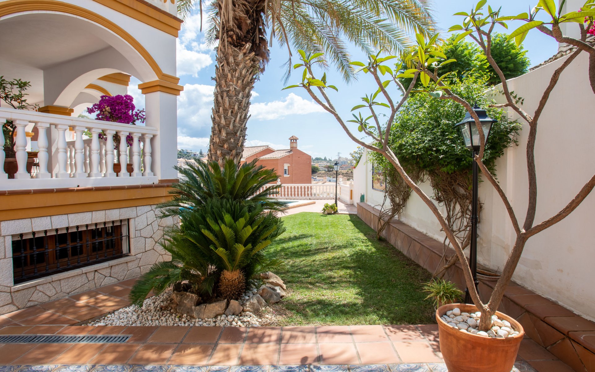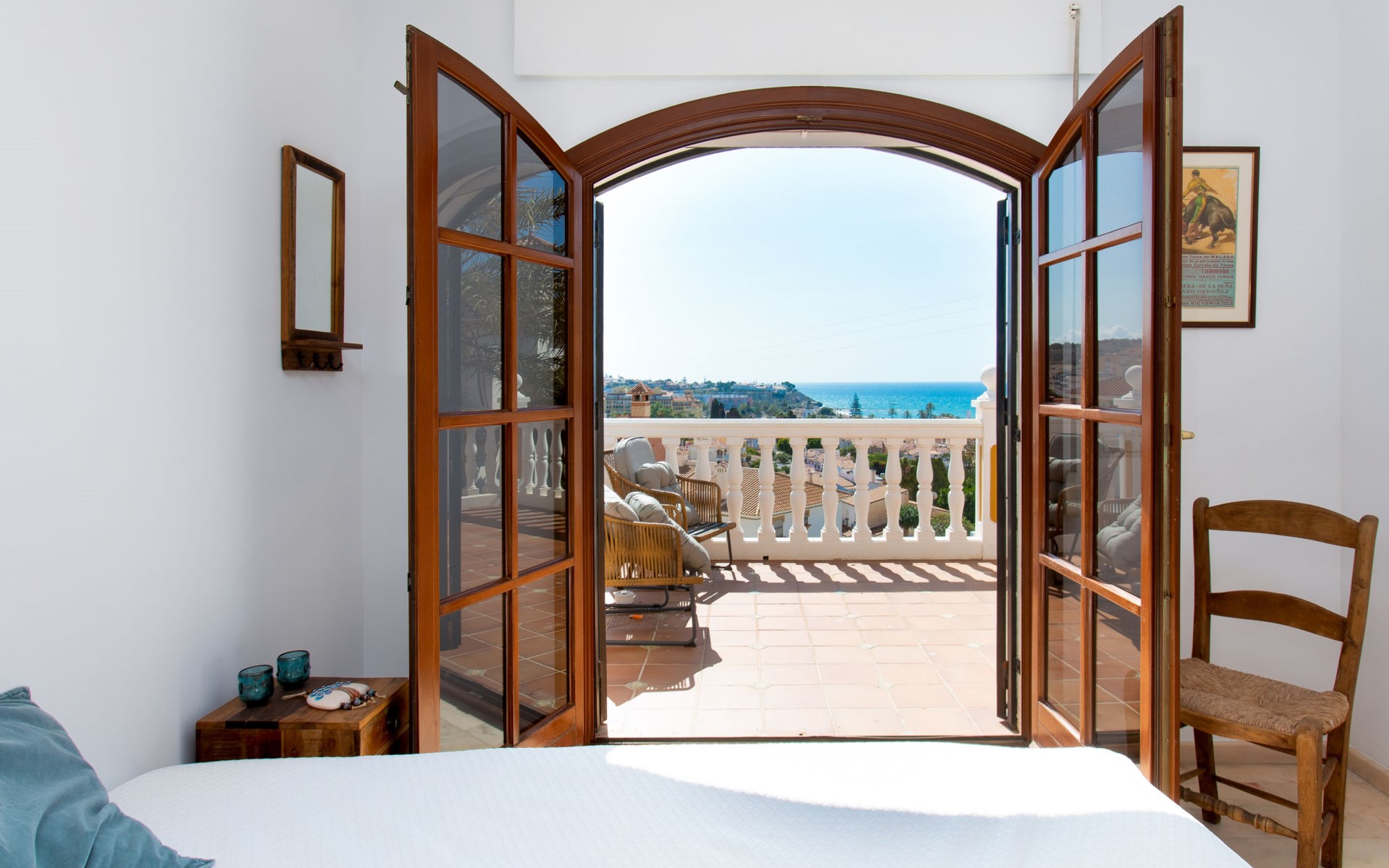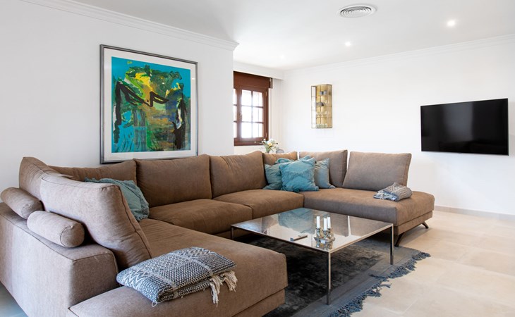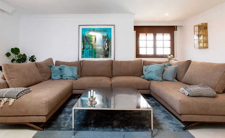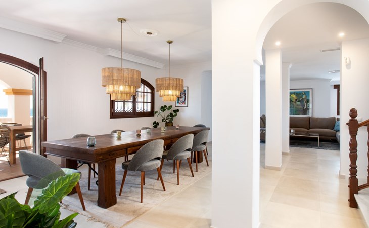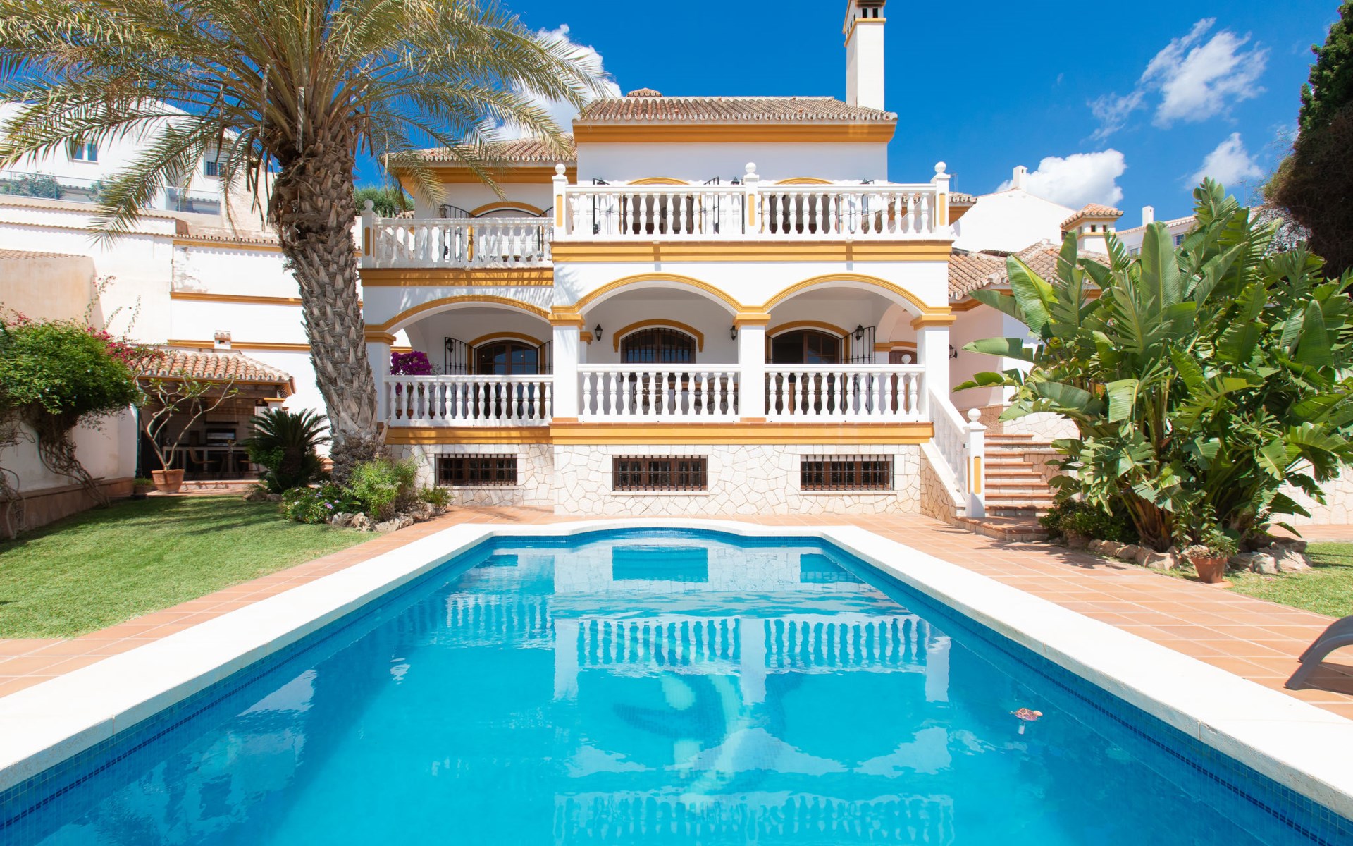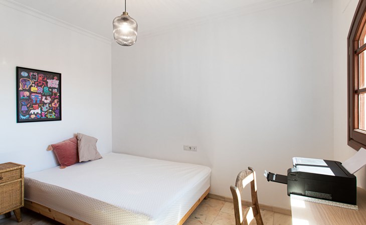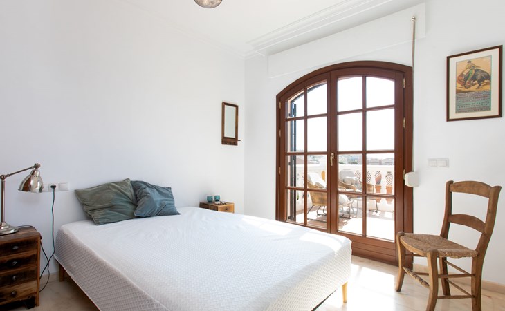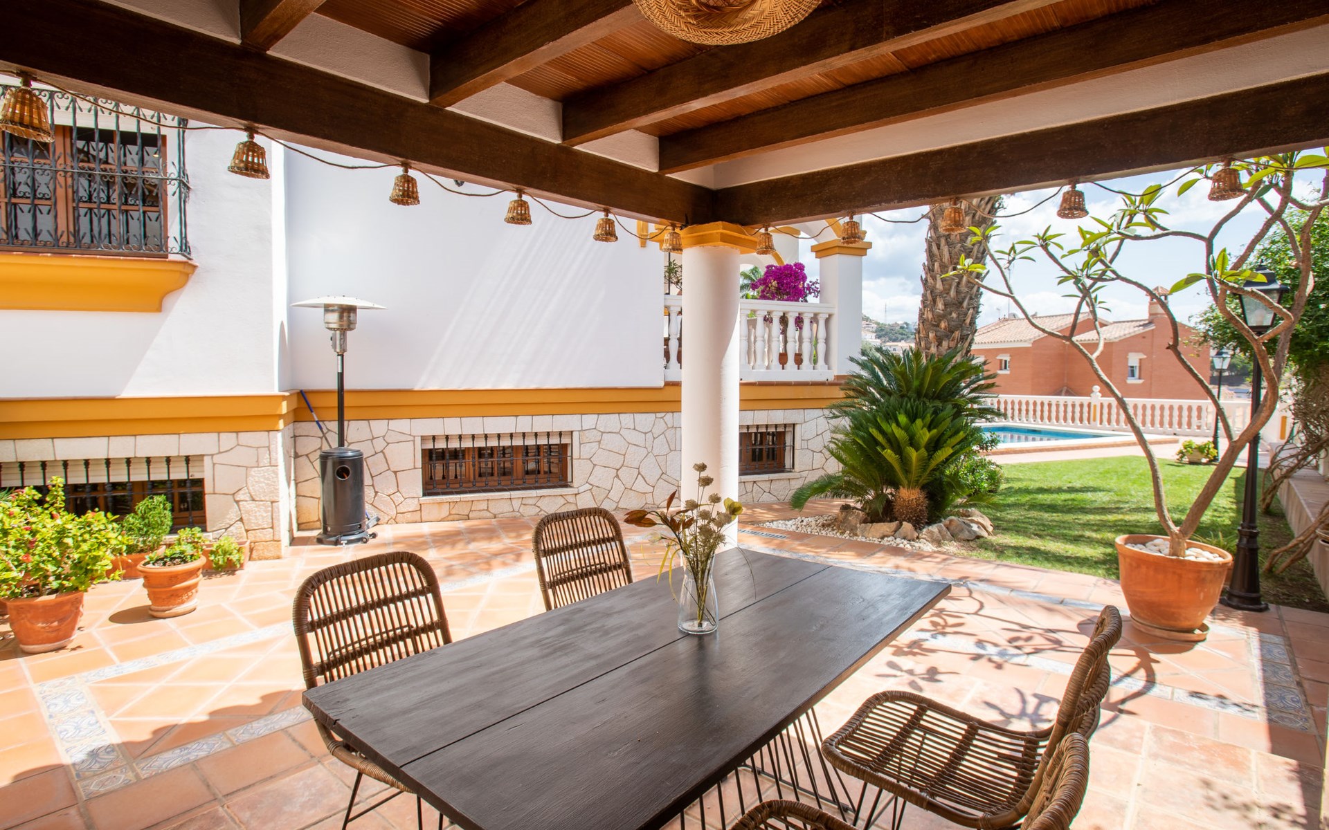 Cala del moral 2 km from Rincón de la Victoria: Beautiful, cosy single-family house "Fragata House", renovated in 2022. In the resort 350 m from the centre of Cala del moral, in a sunny position, 600 m from the sea. Private: garden with lawn, swimming pool angular (4 x 8 m, depth 105 - 230 cm, seasonal availability: 01.Mar. - 01.Dec.). Shower/WC in the pool area, table tennis, patio, garden furniture, barbecue. In the house: WiFi, central heating system, air conditioning, washing machine. Shop, supermarket 300 m, shopping centre 800 m, restaurant 500 m, bus stop "walking distance" 500 m, sandy beach 600 m. Golf course (18 hole) 4 km. Please note: no lift. The owner does not accept any youth groups.