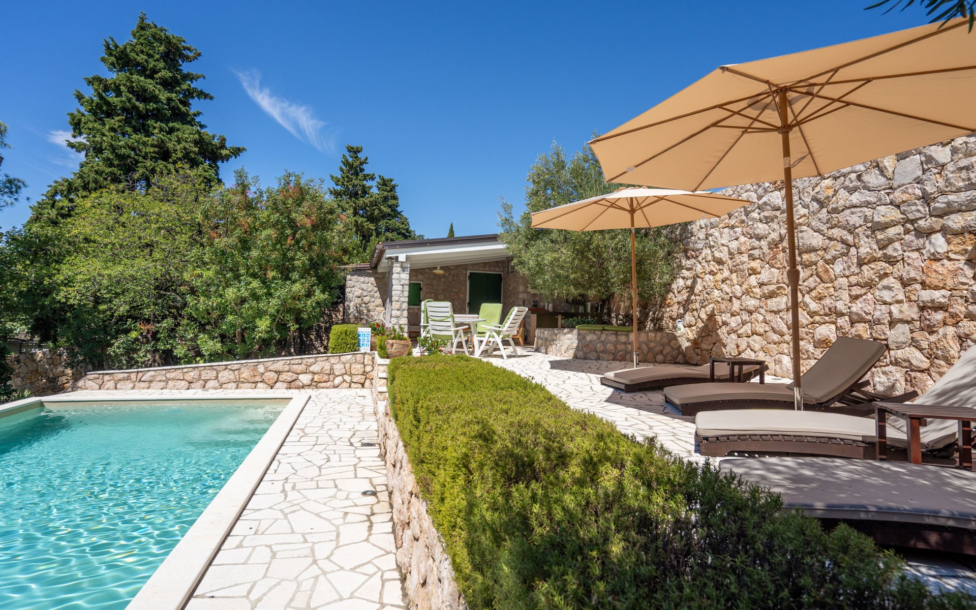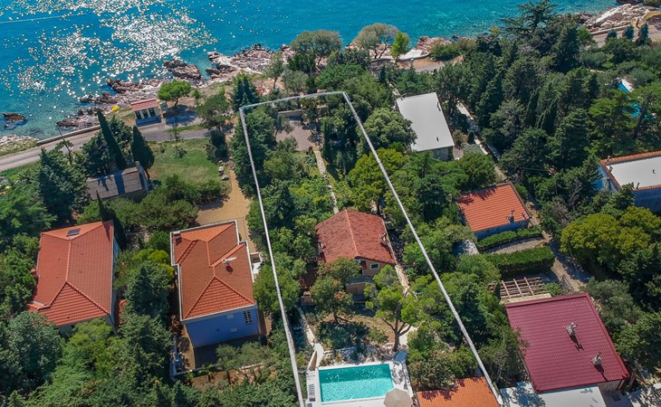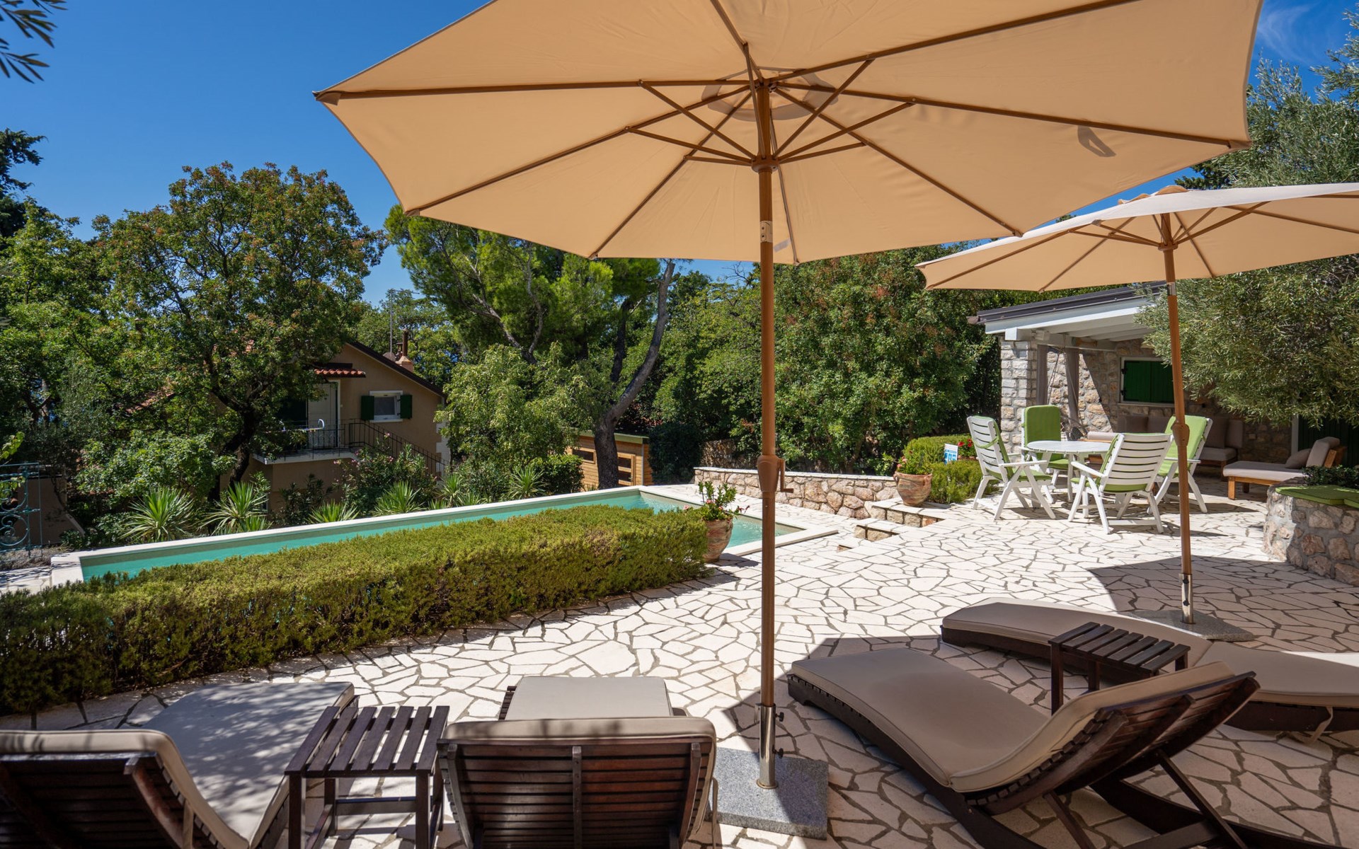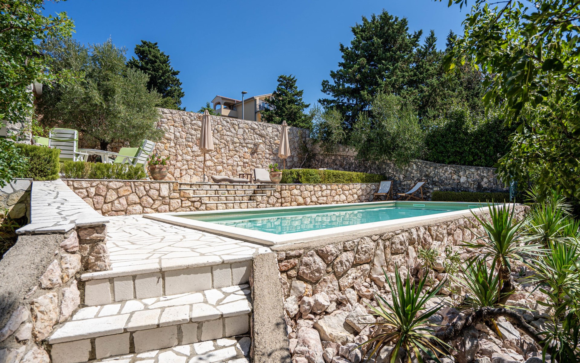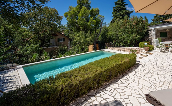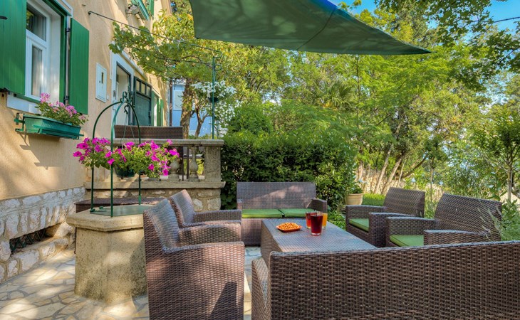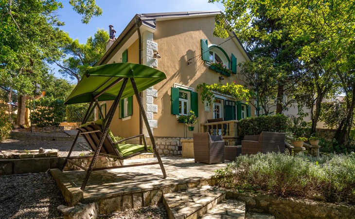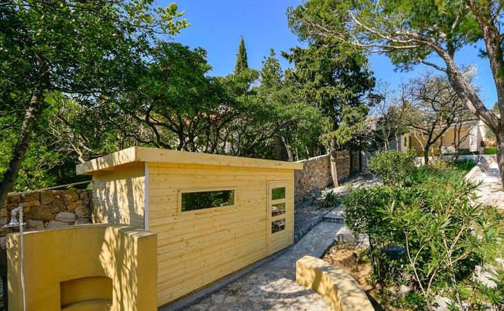 Single-family house "Villa Mo-Re", 2 storeys. 750 m from the centre of Novi Vinodolski, in a quiet, sunny position, 20 m from the sea, 20 m from the beach, in the countryside. Private: property 1'800 m2 (fenced), garden with lawn 300 m2 trees, swimming pool angular, heated (4 x 8 m, depth 140 cm, seasonal availability: 20.Apr. - 15.Oct.) with internal staircase. Outdoor shower, terrace (25 m2), garden furniture, barbecue (swing, sandbox). In the house: internet access, sauna, washing machine. Parking at the house on the premises. Supermarket 400 m, restaurant 130 m, bus stop 1 km, sandy beach 1.2 km pebble beach 1.2 km, rocky beach 20 m, public bathing area 550 m, concrete beach 20 m. Marina 300 m, tennis 1.1 km. Sauna at small, separate house on the property, 10 m from the pool. The house consists of 2 apartments rented as one unit. 2 massages (included in the price) on request. By groups of young people double deposit is requested on arrival. Property completely fenced, providing safety and privacy.