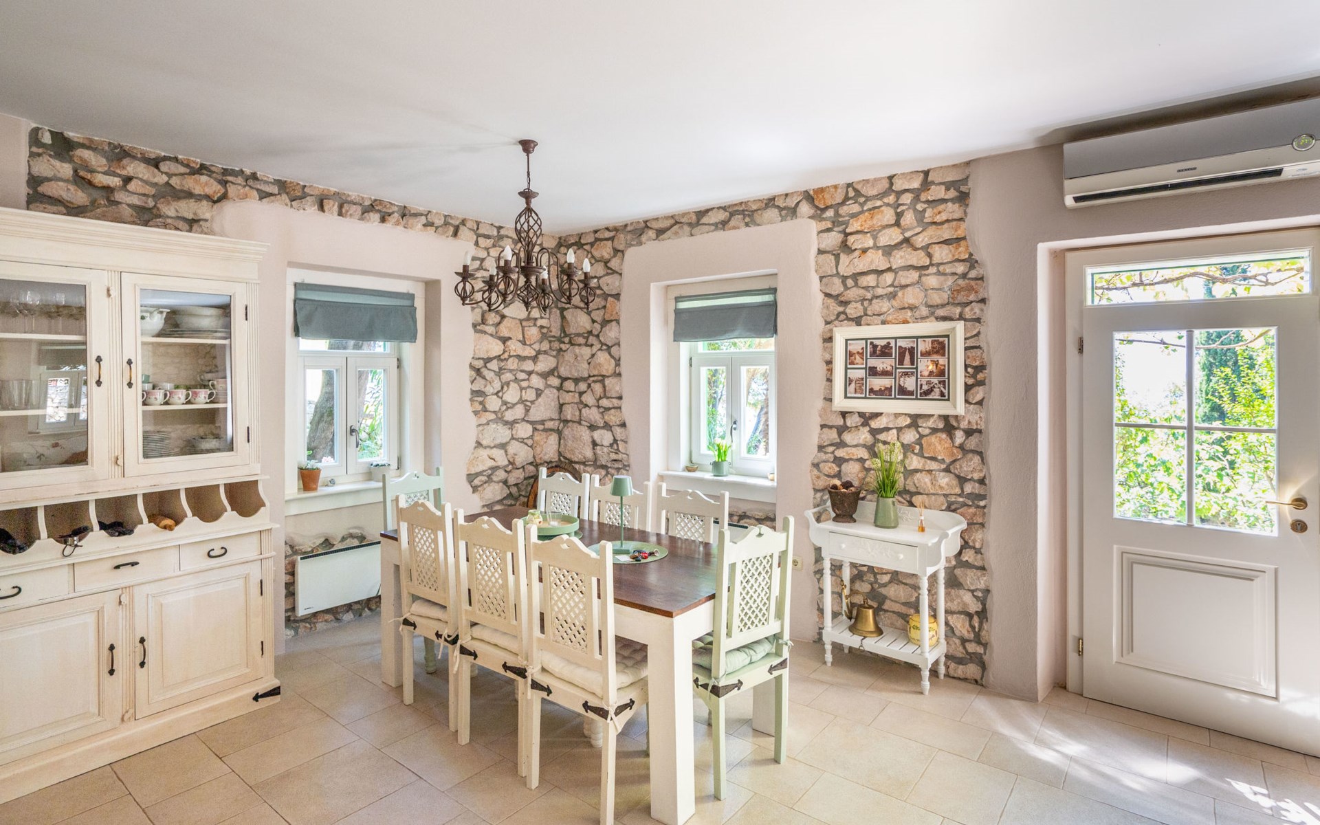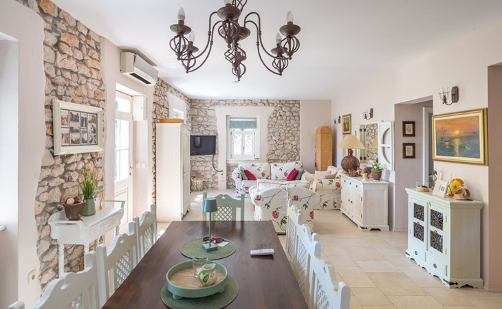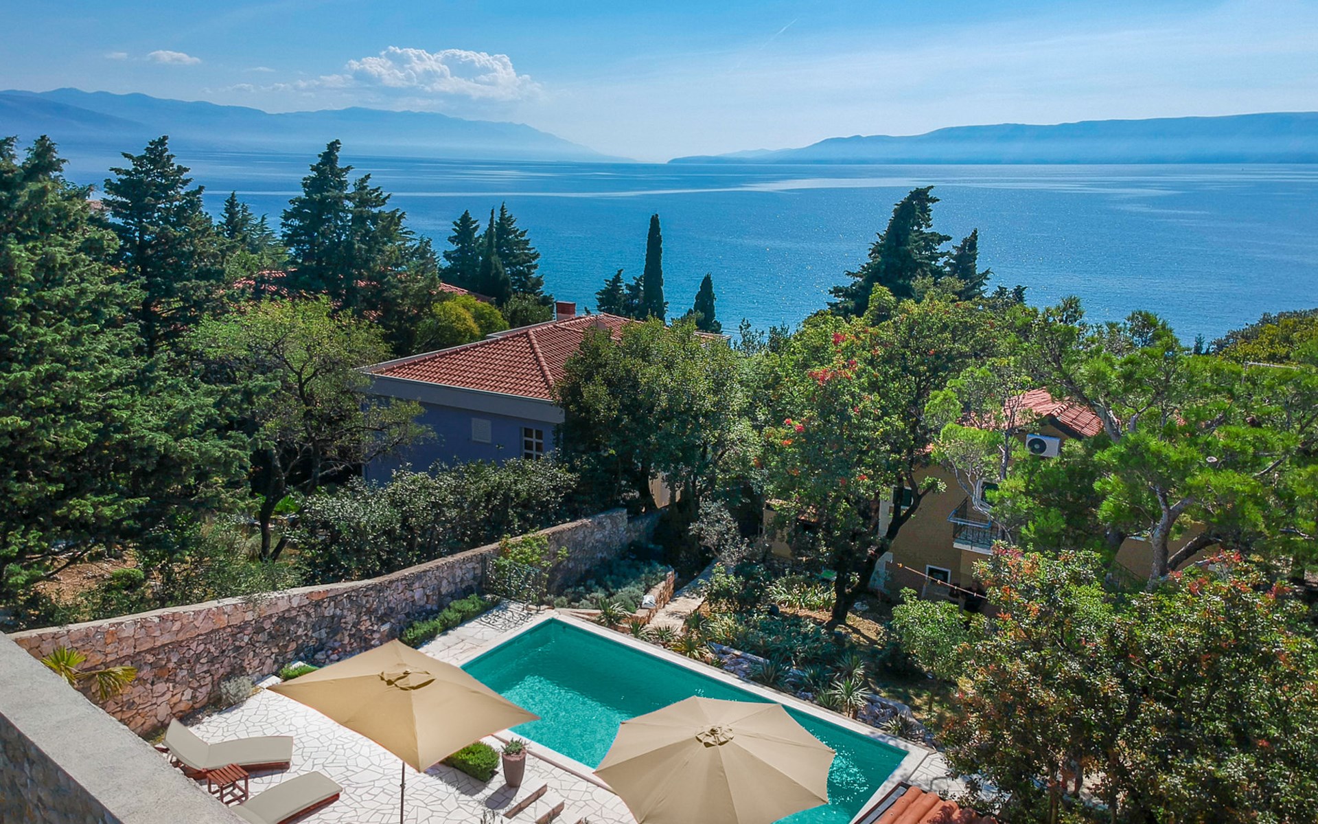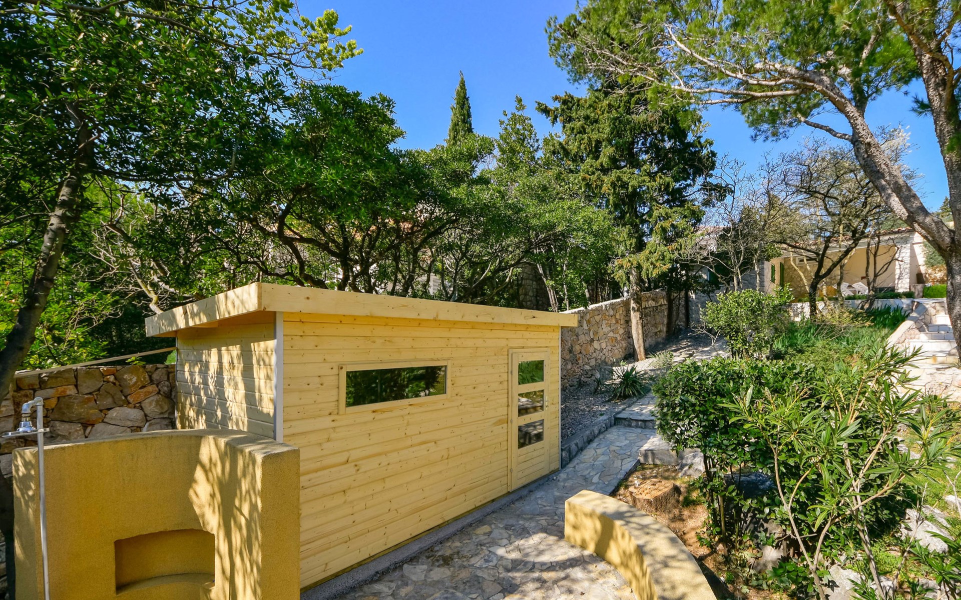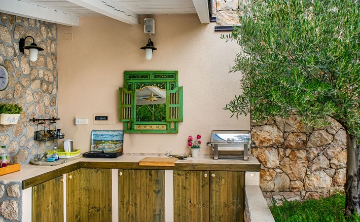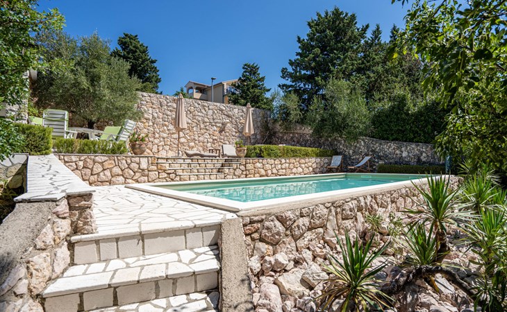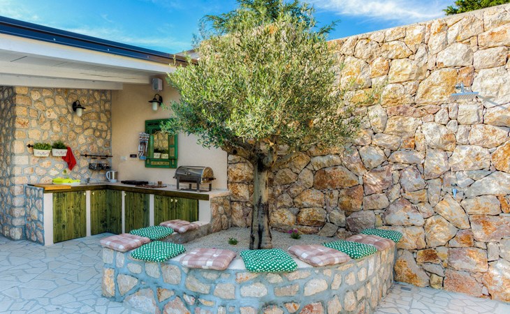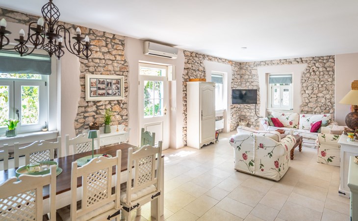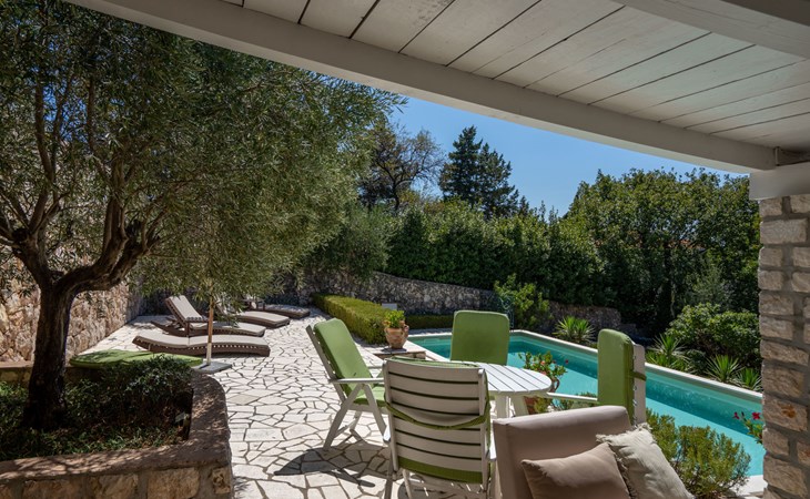 Single-family house "Villa Mo-Re", 2 storeys. 750 m from the centre of Novi Vinodolski, in a quiet, sunny position, 20 m from the sea, 20 m from the beach, in the countryside. Private: property 1'800 m2 (fenced), garden with lawn 300 m2 trees, swimming pool angular, heated (4 x 8 m, depth 140 cm, seasonal availability: 20.Apr. - 15.Oct.) with internal staircase. Outdoor shower, terrace (25 m2), garden furniture, barbecue (swing, sandbox). In the house: internet access, sauna, washing machine. Parking at the house on the premises. Supermarket 400 m, restaurant 130 m, bus stop 1 km, sandy beach 1.2 km pebble beach 1.2 km, rocky beach 20 m, public bathing area 550 m, concrete beach 20 m. Marina 300 m, tennis 1.1 km. Sauna at small, separate house on the property, 10 m from the pool. The house consists of 2 apartments rented as one unit. 2 massages (included in the price) on request. By groups of young people double deposit is requested on arrival. Property completely fenced, providing safety and privacy.