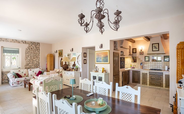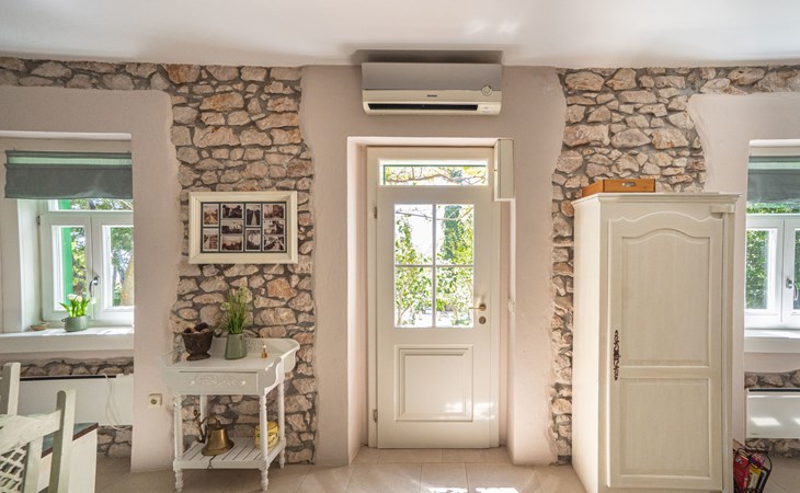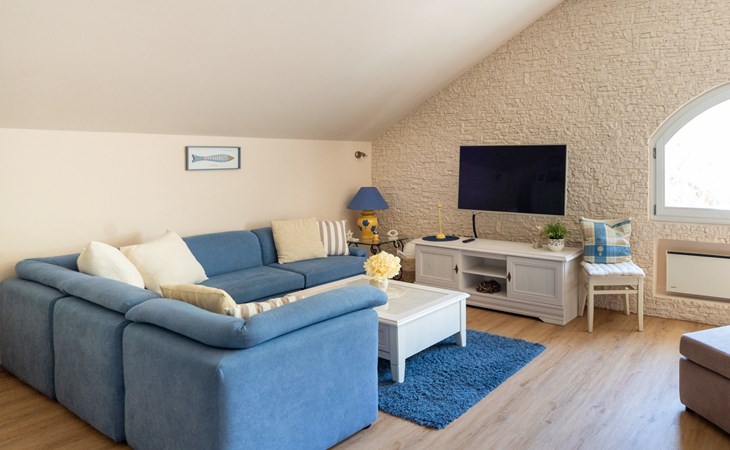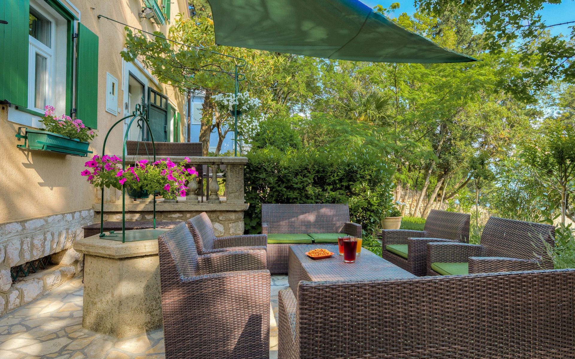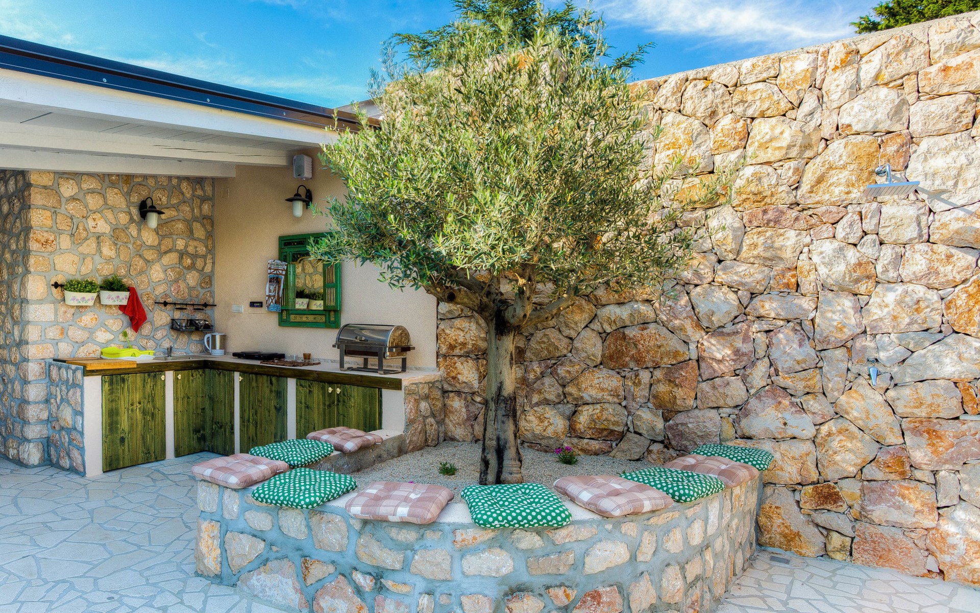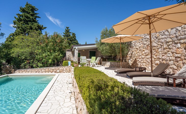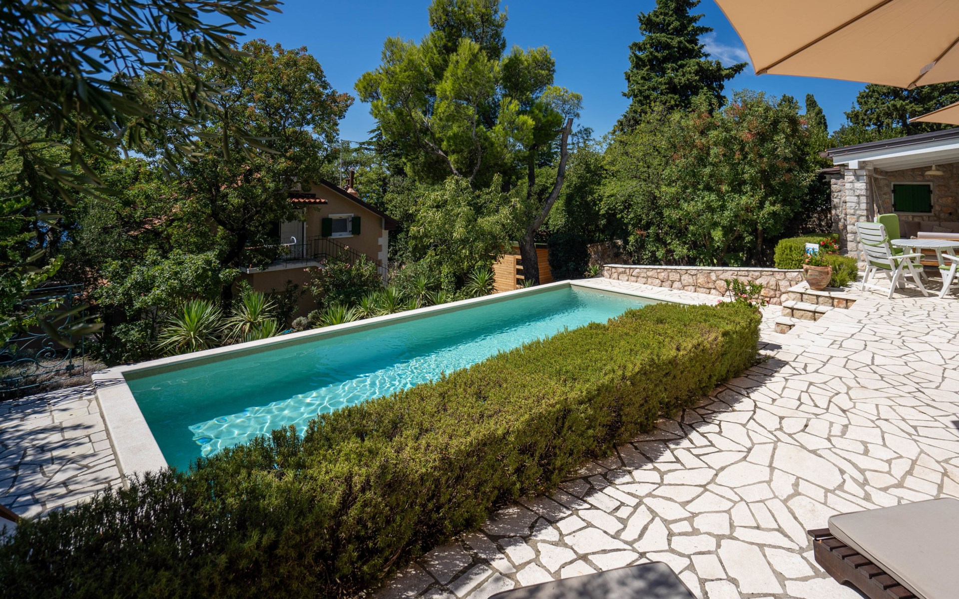 Single-family house "Villa Mo-Re", 2 storeys. 750 m from the centre of Novi Vinodolski, in a quiet, sunny position, 20 m from the sea, 20 m from the beach, in the countryside. Private: property 1'800 m2 (fenced), garden with lawn 300 m2 trees, swimming pool angular, heated (4 x 8 m, depth 140 cm, seasonal availability: 20.Apr. - 15.Oct.) with internal staircase. Outdoor shower, terrace (25 m2), garden furniture, barbecue (swing, sandbox). In the house: internet access, sauna, washing machine. Parking at the house on the premises. Supermarket 400 m, restaurant 130 m, bus stop 1 km, sandy beach 1.2 km pebble beach 1.2 km, rocky beach 20 m, public bathing area 550 m, concrete beach 20 m. Marina 300 m, tennis 1.1 km. Sauna at small, separate house on the property, 10 m from the pool. The house consists of 2 apartments rented as one unit. 2 massages (included in the price) on request. By groups of young people double deposit is requested on arrival. Property completely fenced, providing safety and privacy.