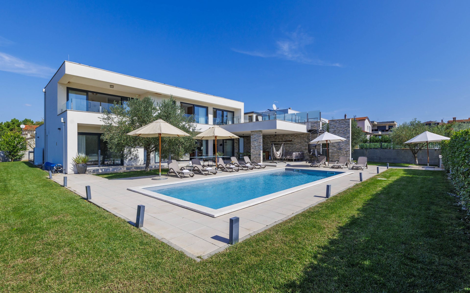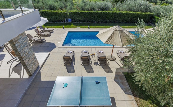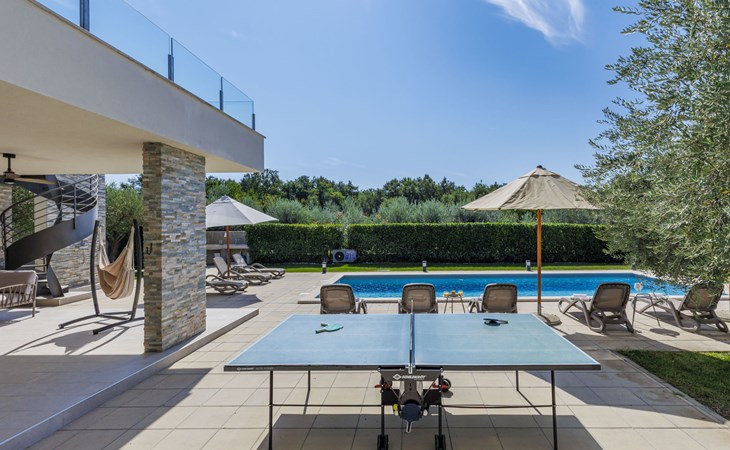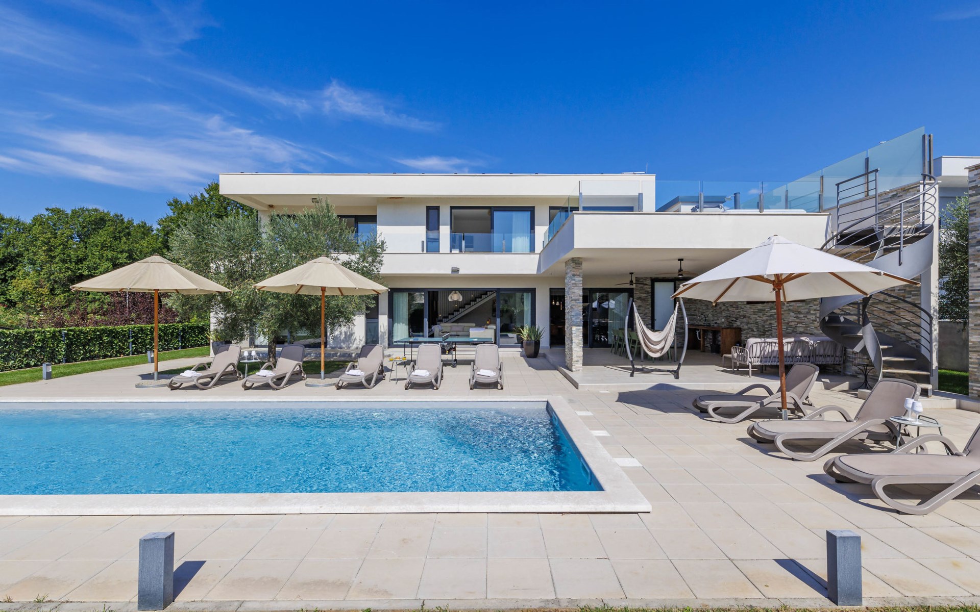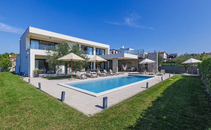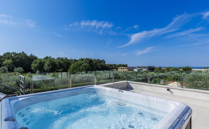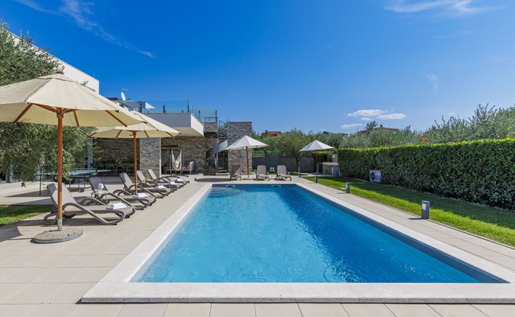 Luxurious villa "Bianca", 2 storeys. In the district of Sveti Servul 2 km from the centre of Novigrad, in a quiet, sunny position, 3 km from the sea, 3 km from the beach. Private: property 1'000 m2 with wildlife garden and trees, swimming pool angular, heated (10 x 4 m, depth 140 cm, seasonal availability: 01.Apr. - 30.Oct.) with internal staircase and salt-electrolysis pool-cleaning system. Outdoor shower, hot tub, terrace (50 m2), garden furniture, barbecue. In the house: internet access, sauna, table tennis, washing machine, tumble dryer. Available: bicycles (3). Parking (for 3 cars) at the house on the premises. E-charging station. Shop 1.5 km, supermarket 1.5 km, restaurant 500 m, bus stop 2 km, pebble beach 3 km, rocky beach 3 km. Golf course (18 hole) 25 km, tennis 2 km, walking paths from the house 500 m, cycle lane 550 m. Nearby attractions: Aquapark 5 km. Please note: airfield 60 km from the property. Swimming pool heated (extra). It is necessary to announce 7 days in advance if the pool heating is required.
