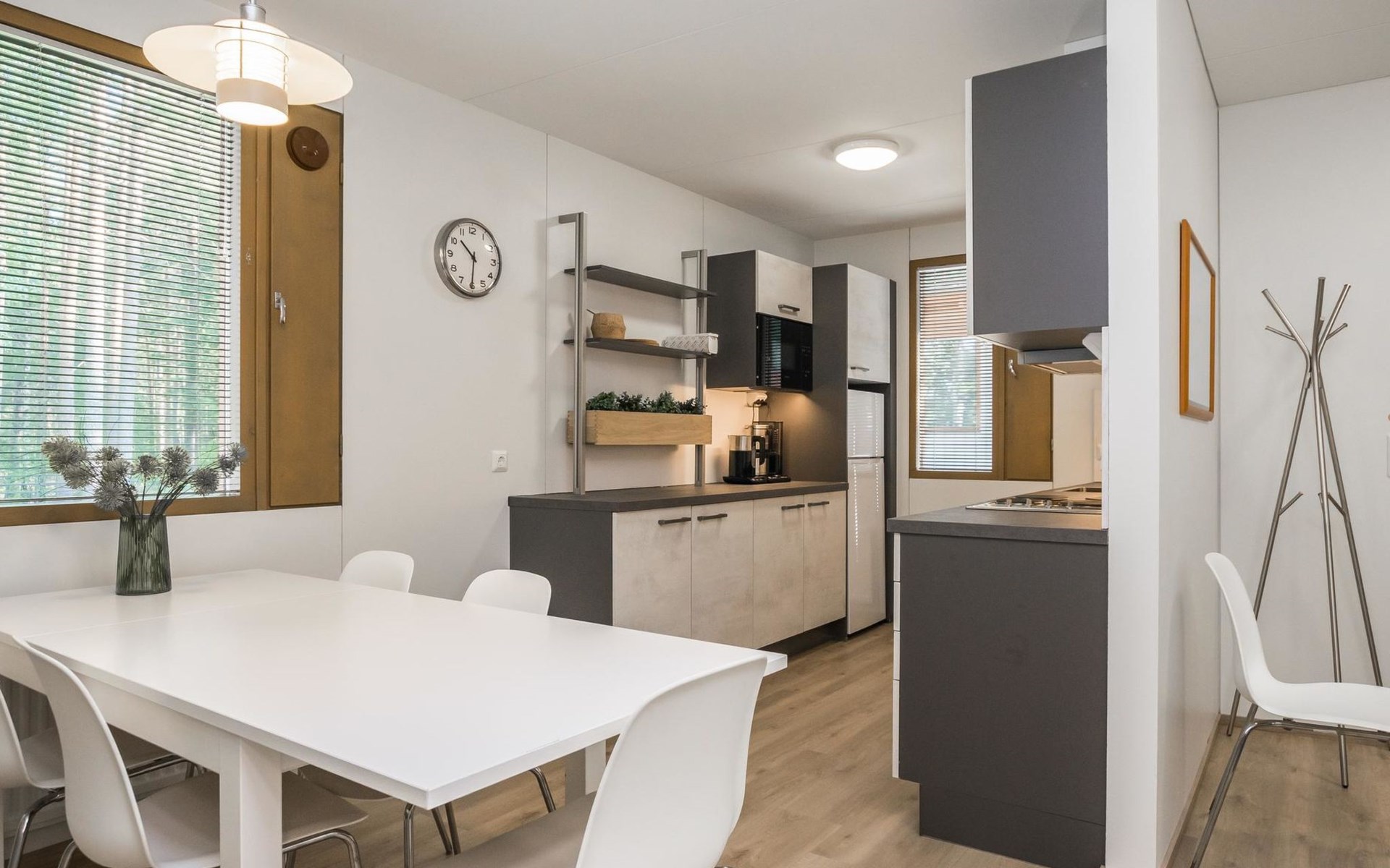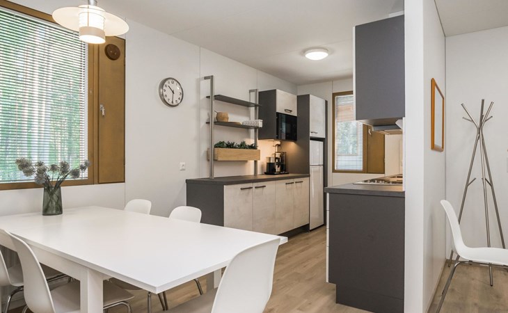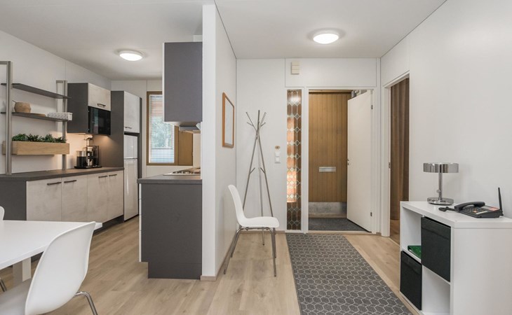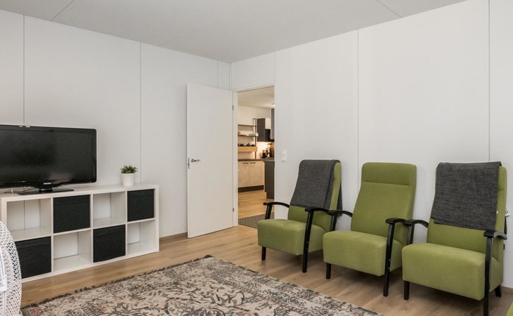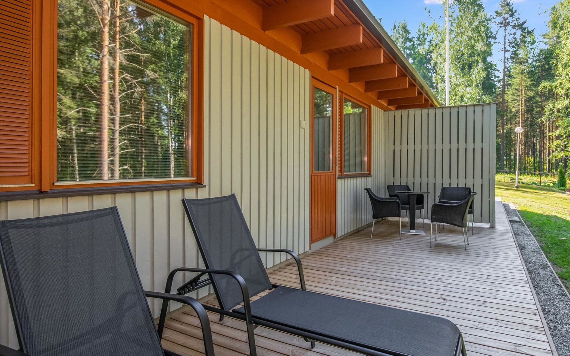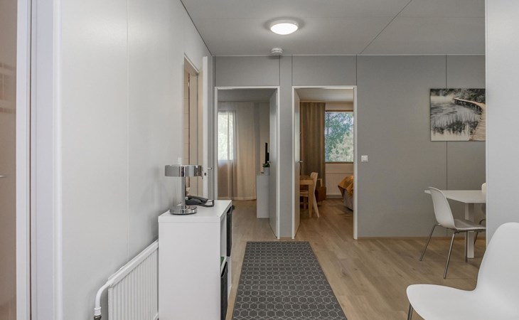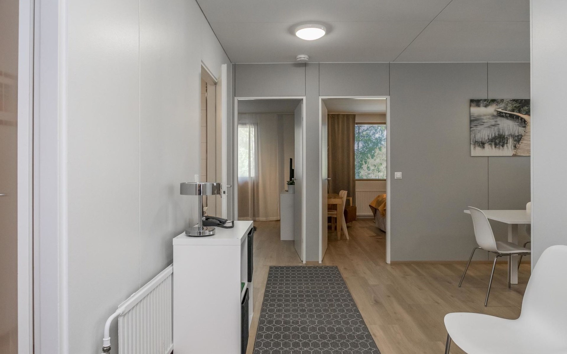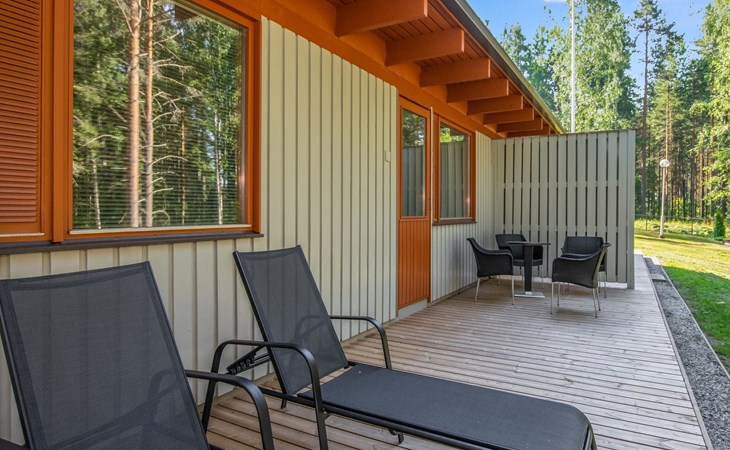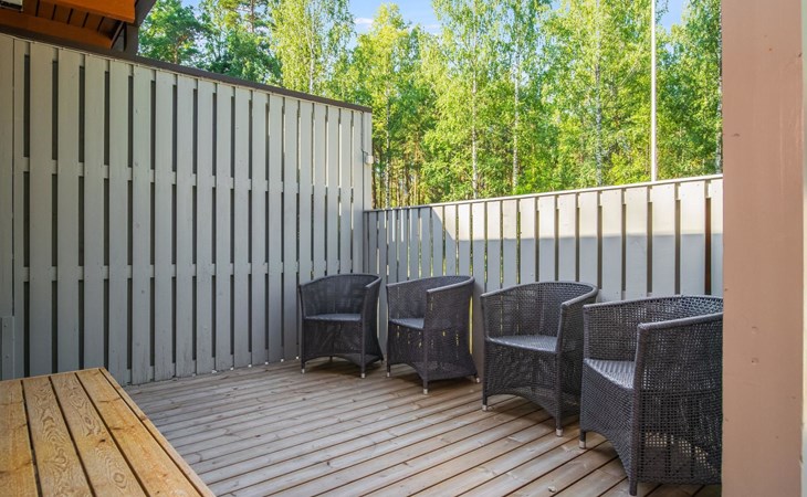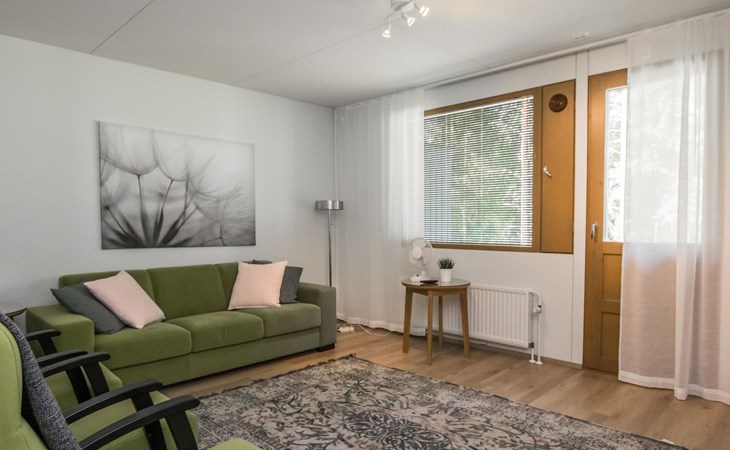 Apartment in wood-built row house, house is built in 1980 and renovated in 2022. Apartment has kitchen, living room, 2 bedrooms with 2 beds in each, washroom with shower, WC and terrace.
