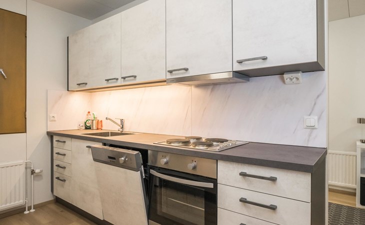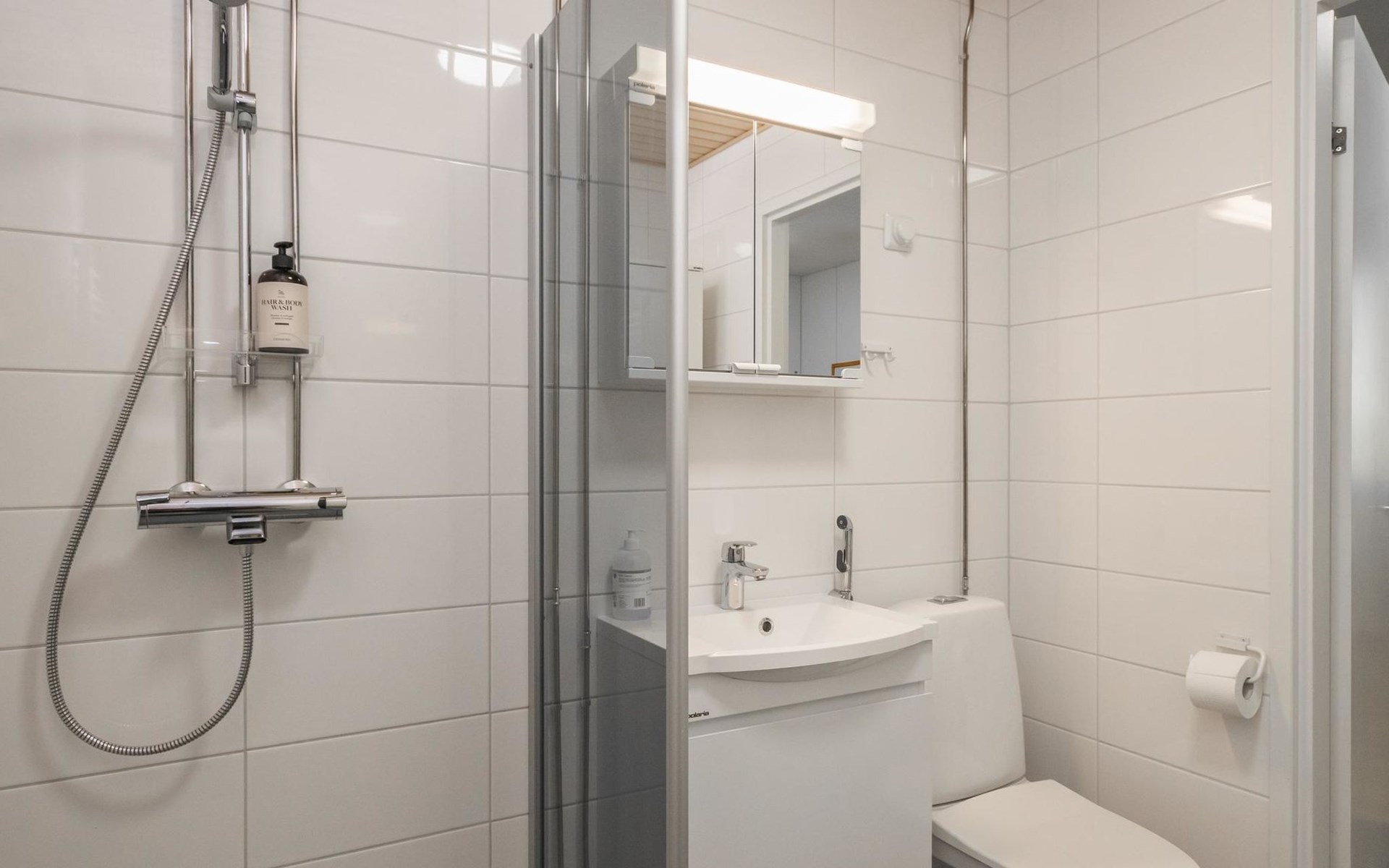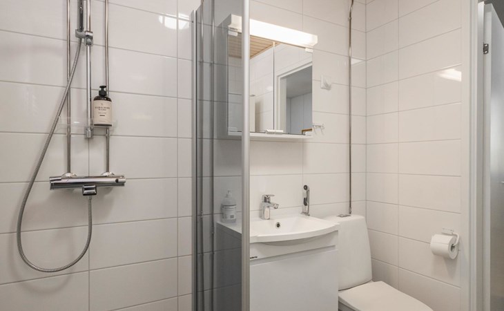 Sauna facilities shared by nine apartments. Sauna facilities includes dressing room, washroom, electric sauna stove, cooling terrace and washing machine. Sauna sessions (included in the price) can be booked at the reception.