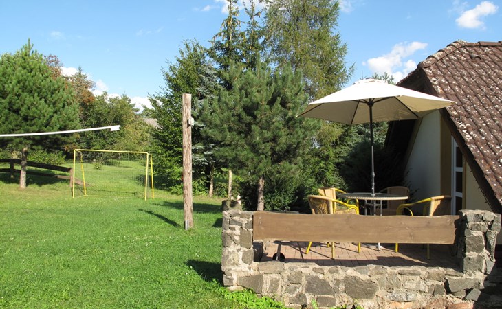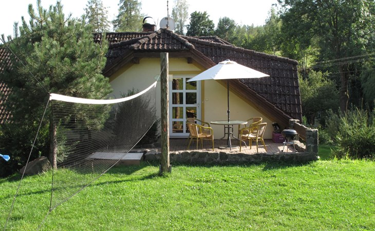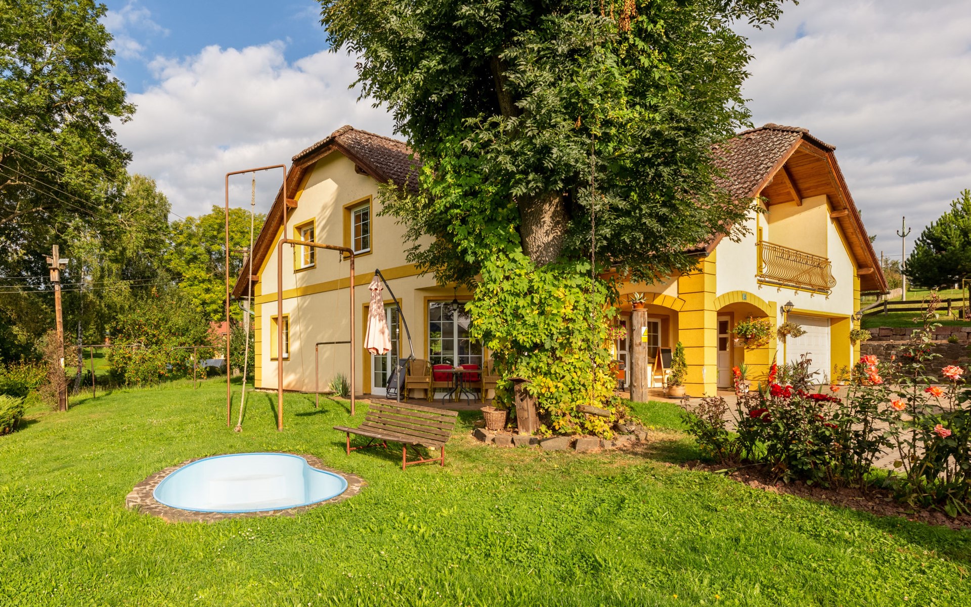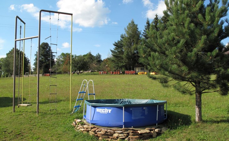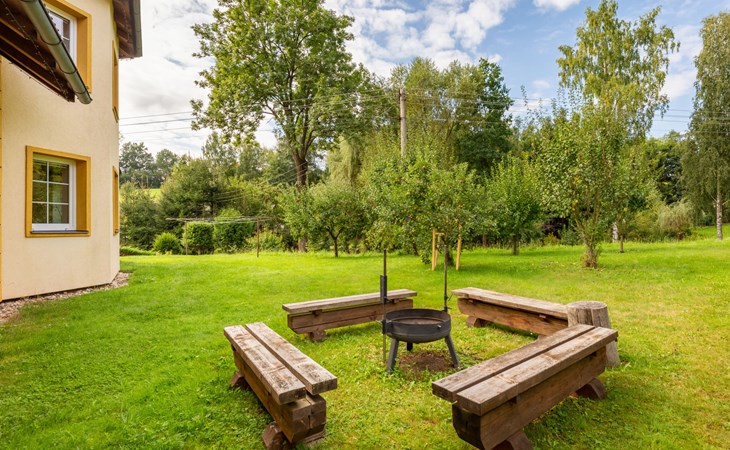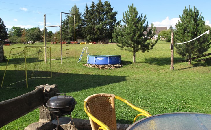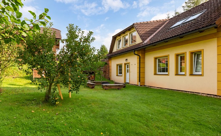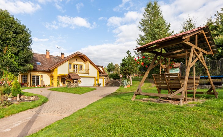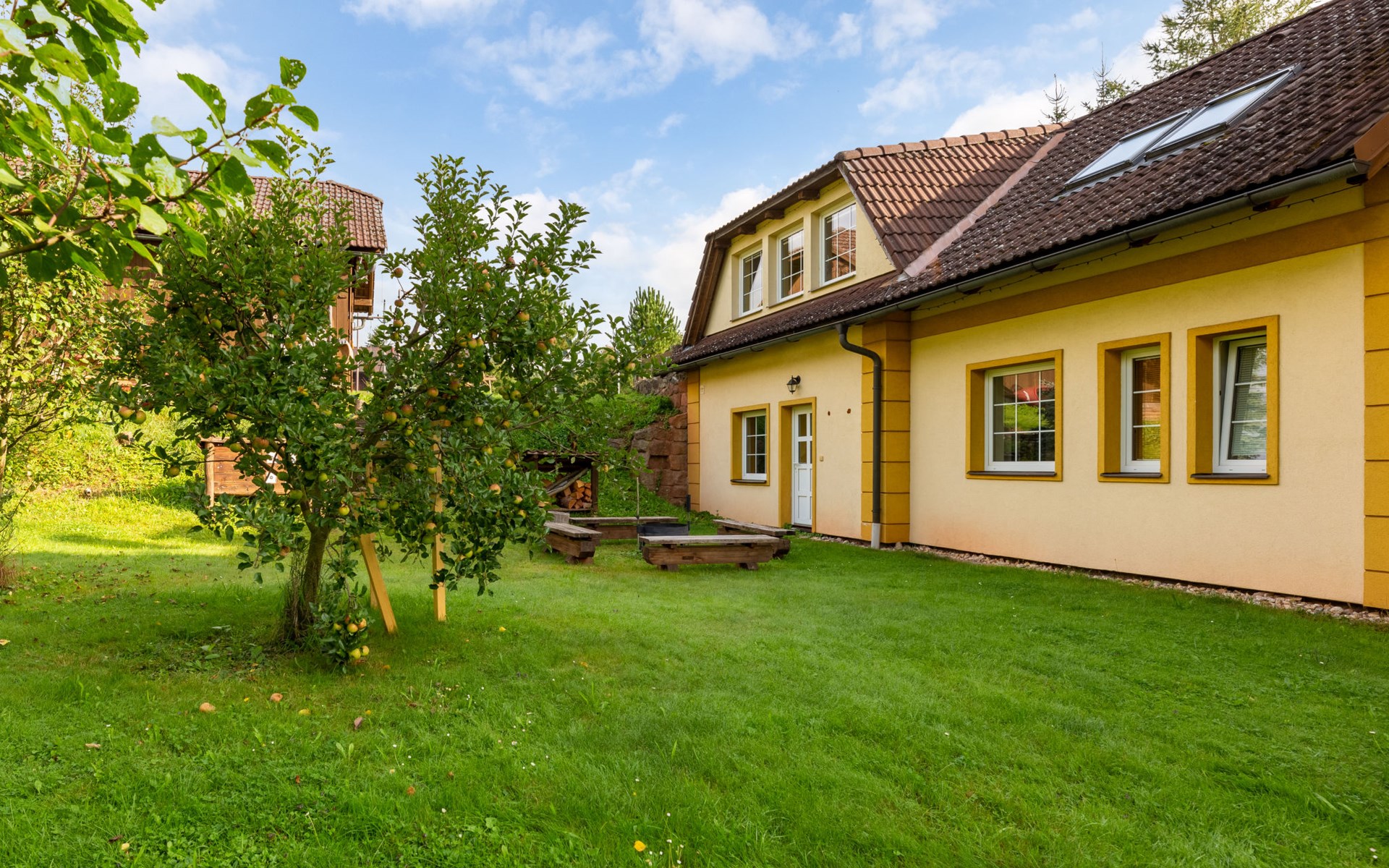 Slemeno, 2 km from Dolní Kalná: Modern, beautiful 2-family house "Relax apartment", 400 m a.s.l.. 900 m from the centre of Slemeno, on the outskirts, 5 km from the centre of Hostinné, 13 km from the centre of Jilemnice, 6 km from the skiing area. For shared use: property 1'200 m2, lawn. Private: swimming pool (above ground) round (3,6 m diameter, depth 80 cm, seasonal availability: 01.Jul. - 31.Aug.). Terrace, garden furniture, barbecue, fireplace, parking (for 2 cars) at the house. Shop 2 km, supermarket 5 km, restaurant 4 km, bus stop 900 m, railway station "Hostinné" 5 km, outdoor swimming pool 3 km, indoor swimming pool 13 km. Golf course (18 hole) 20 km, walking paths from the house, cycle lane 50 m, ski lift 16 km, chair lift 20 km, slopes 6 km, ski rental 16 km, ski school 16 km, children's ski school 16 km, cross country ski track 6 km. Nearby attractions: Jilemnice 13 km, Zvičina 15 km, Vrchlabí 16 km, Trutnov 17 km, Pec pod Sněžkou 34 km, Zoo Dvůr Králové, zámek Kuks (UNESCO). Well-known ski regions can easily be reached: Kněžický vrch - Vrchlabí 16 km, Mladé Buky 20 km, Pec pod Sněžkou 34 km. Well-known lakes can easily be reached: Dolce 18 km. Please note: the owner lives in the same residence. Owner lives in separate semi-detached house. Separate grass pitch available including goals and net for ball games.