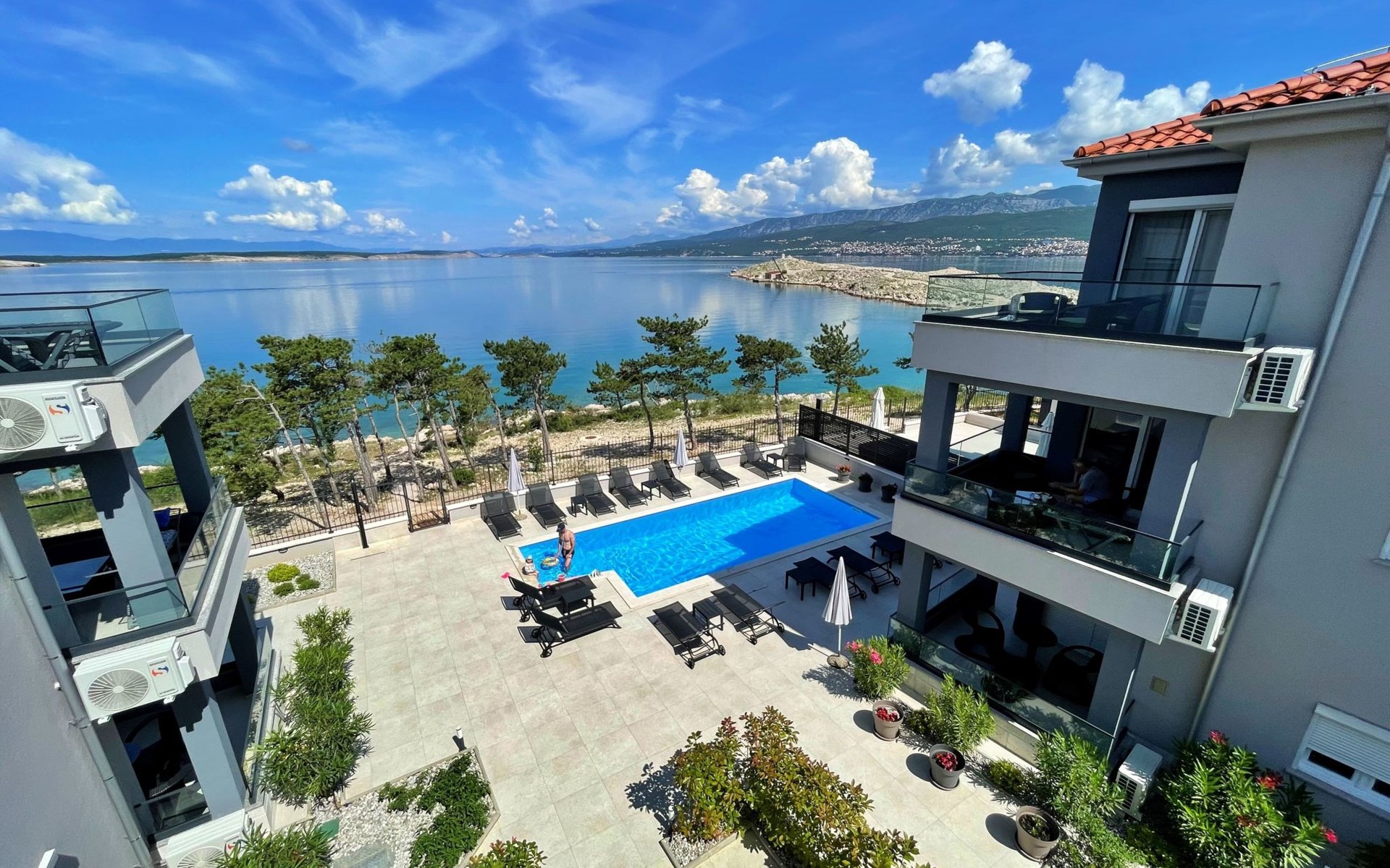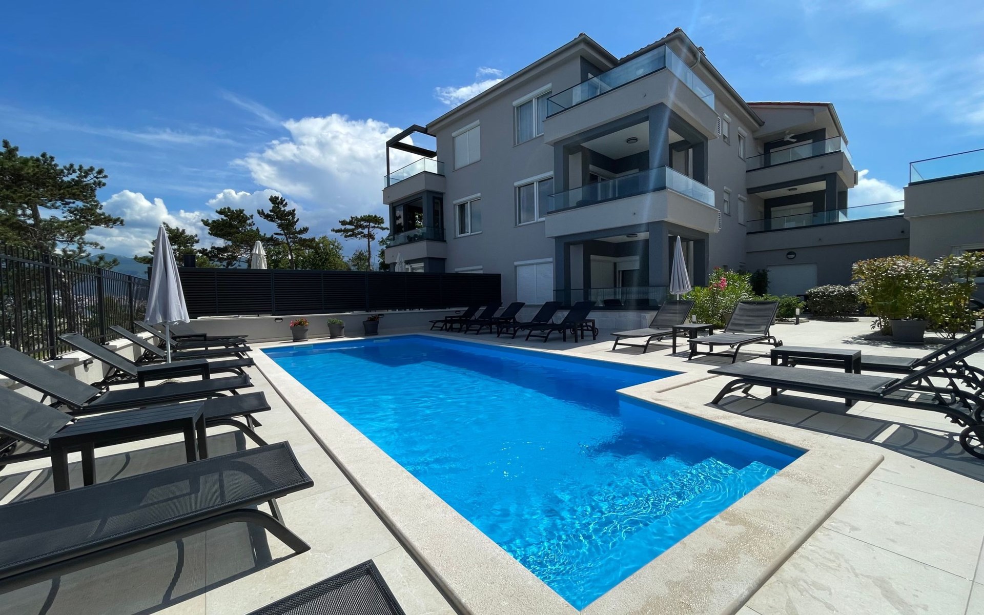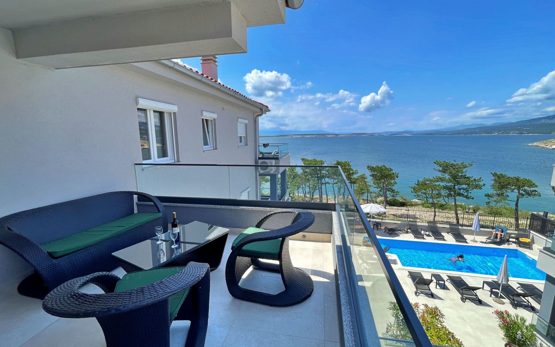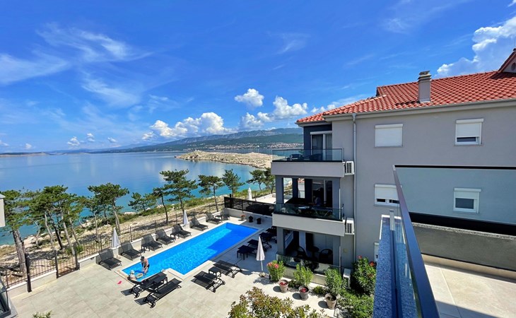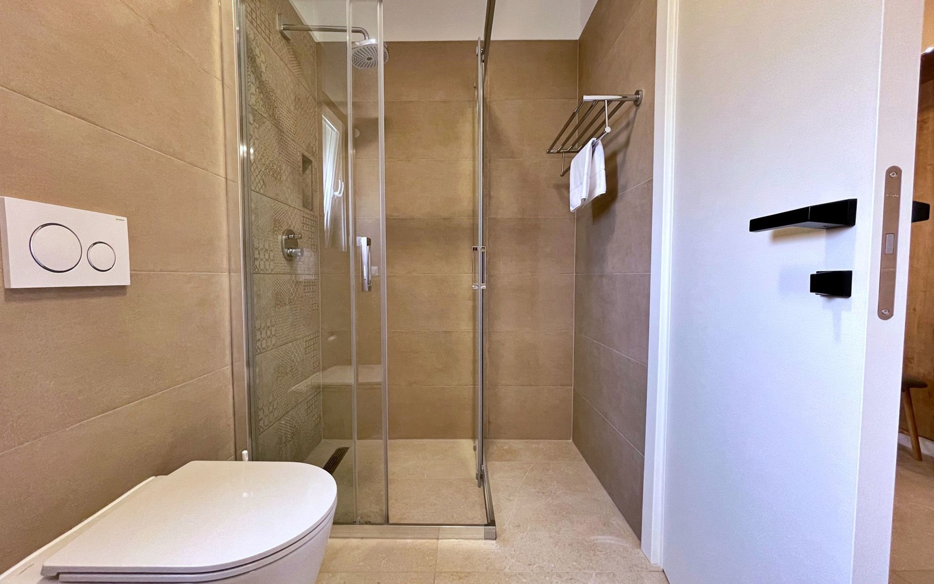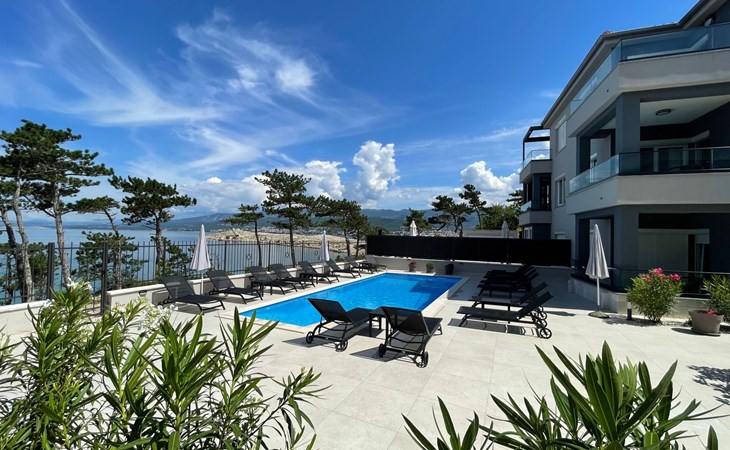 The furnished, covered balcony (11 m2) offers a beautiful view of the pool and the sea. The pool area on the ground floor is equipped with sun loungers, parasols and an outdoor shower and offers direct access to the sea for comfortable swimming. A communal laundry room on the ground floor includes a washing machine, washing capsules/detergent and an iron for guests' use.