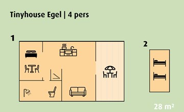 The Tinyhouse is a cozy, compact holiday home for up to 4 people. Due to the space, this Tinyhouse is ideal for a family with two adults and two children. The Tinyhouse has a kitchen with refrigerator, a living area with TV and a private bathroom.