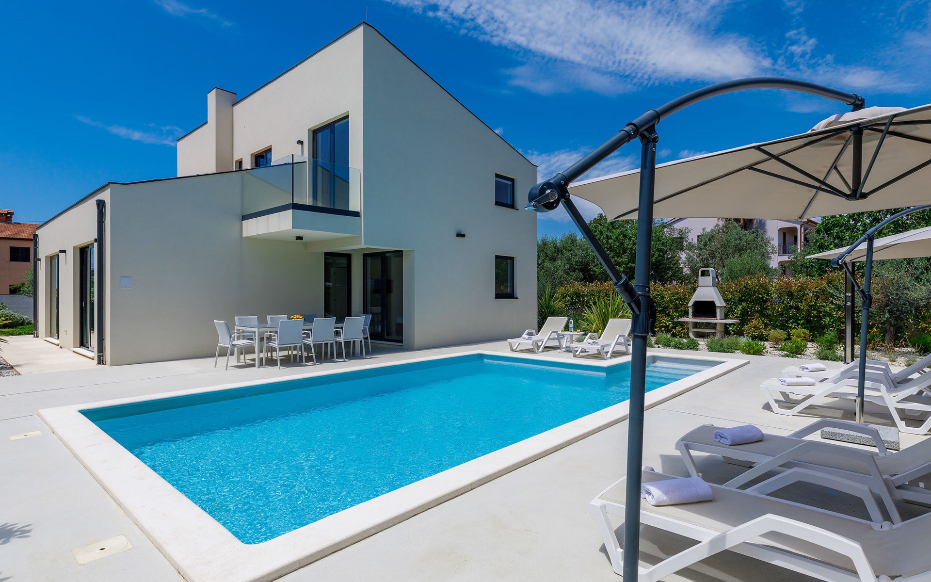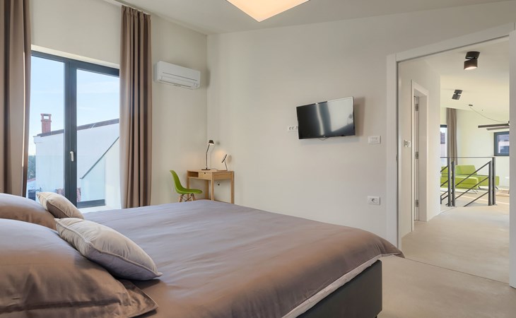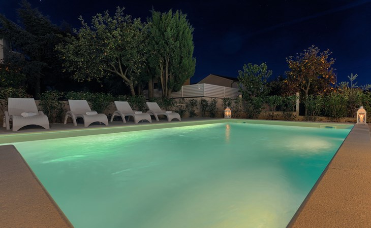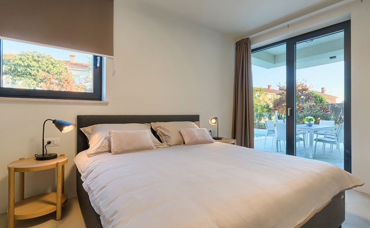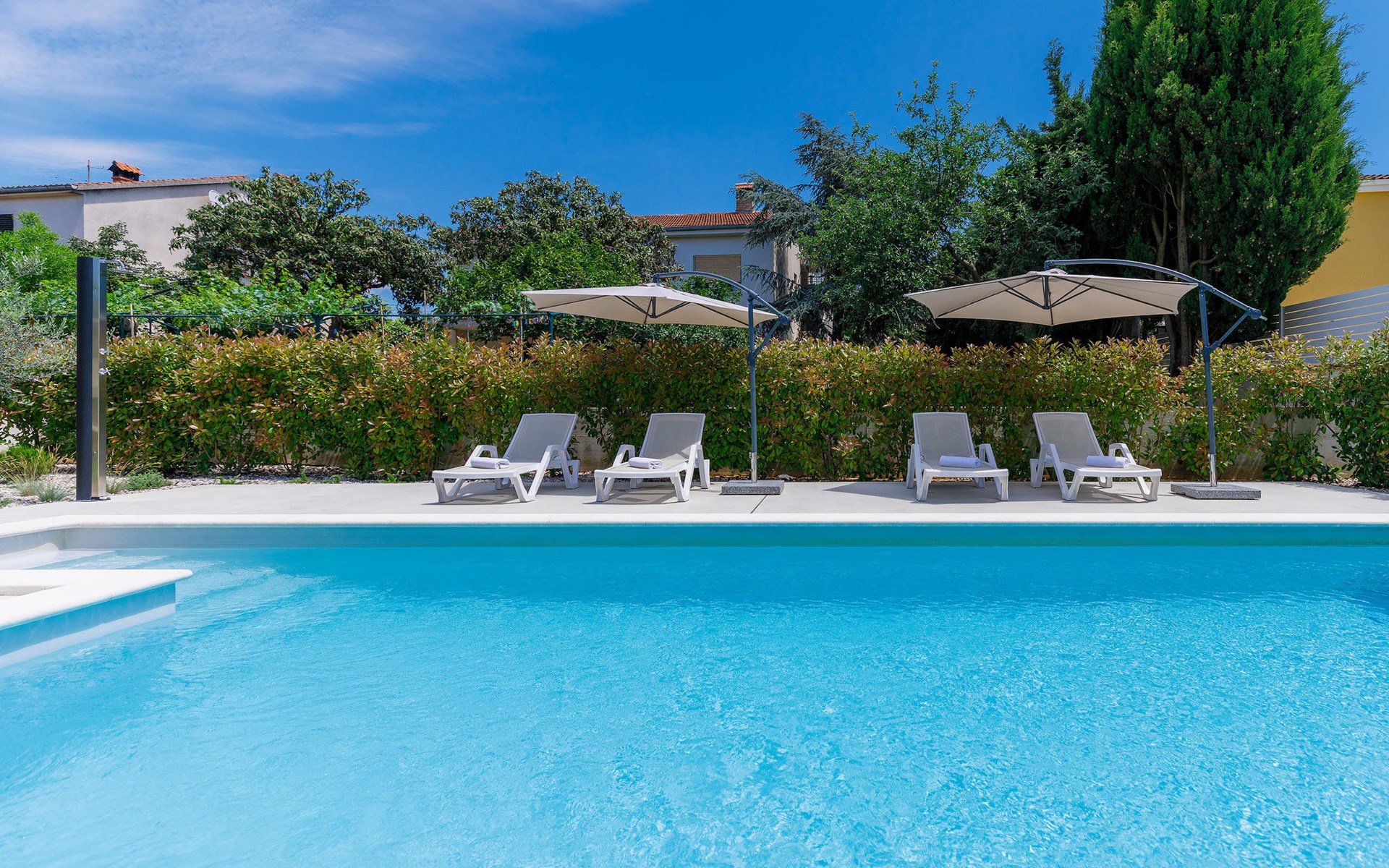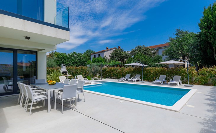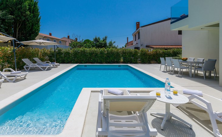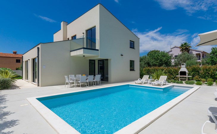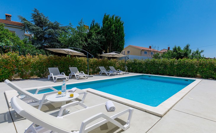 Štinjan 5 km from Pula: Villa "Anna", 2 storeys. 3 km from the centre of Fažana, in a sunny position, 1 km from the sea, 1 km from the beach. Private: property 750 m2 (fenced), garden with swimming pool angular, heated (8 x 4 m, depth 140 cm, seasonal availability: 01.Jan. - 31.Dec.) with internal staircase. Outdoor shower, barbecue. In the house: internet access, washing machine. Parking (for 3 cars) at the house on the premises. Shop 100 m, restaurant 800 m, bus stop 10 m, pebble beach 1 km, rocky beach 1 km. Golf course (18 hole) 5 km, sailing school 5 km, tennis 500 m, riding stable 4 km, walking paths from the house 500 m, cycle lane 550 m. The owner does not accept any youth groups. Please note: airfield 15 km from the property. Swimming pool heated (extra). It is necessary to announce 7 days in advance if the pool heating is required.