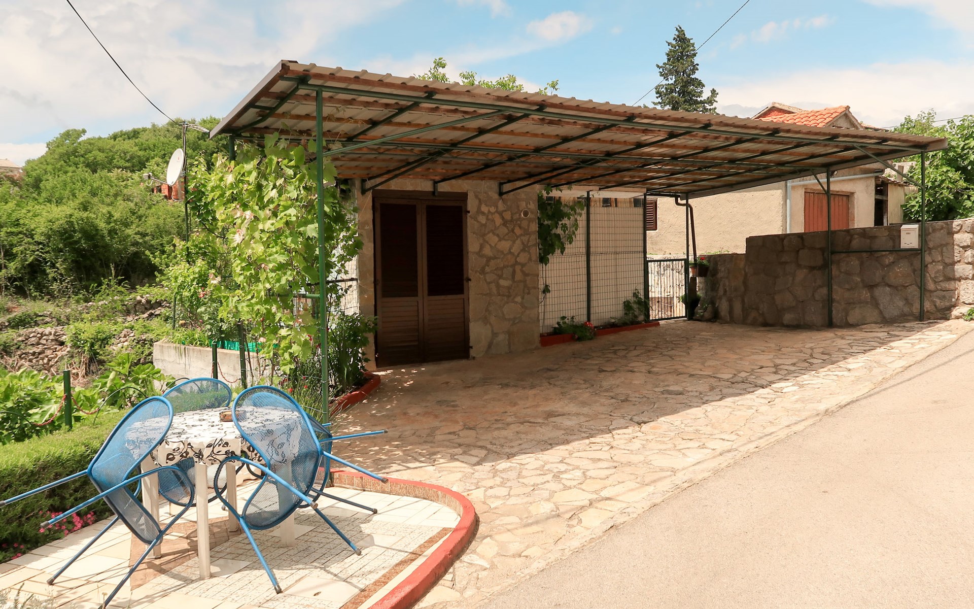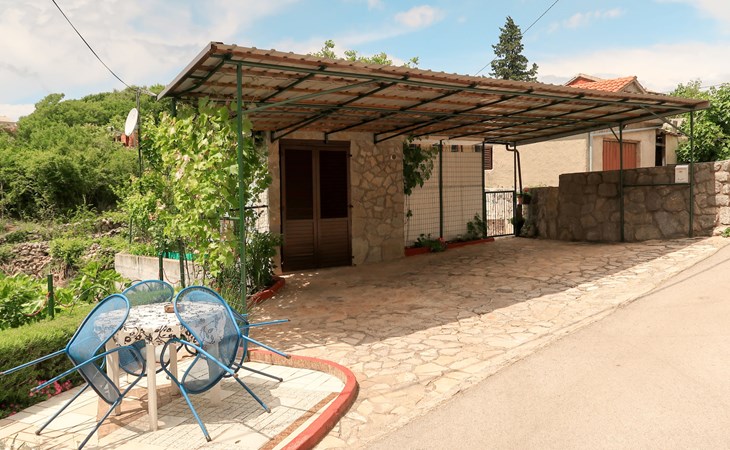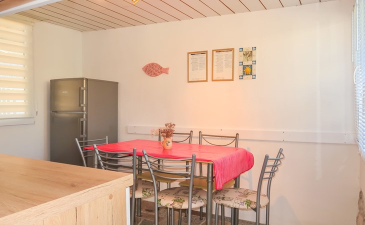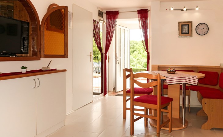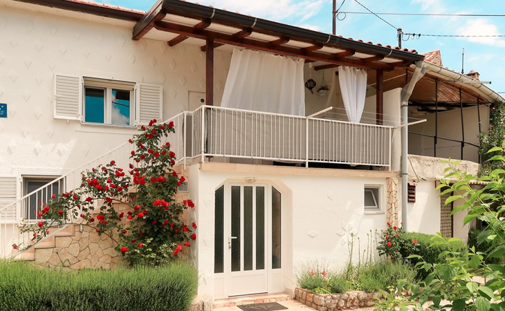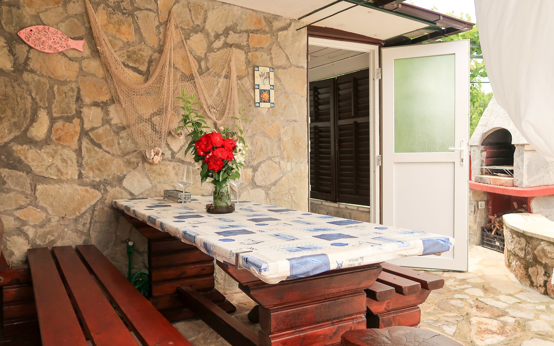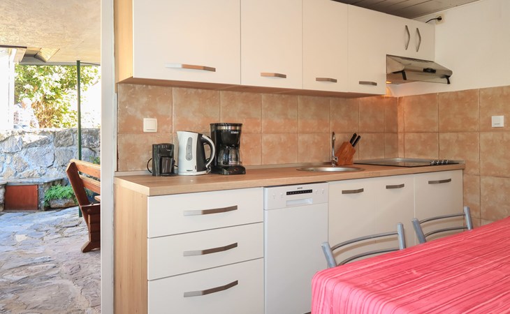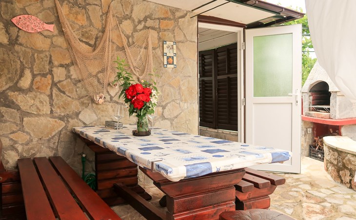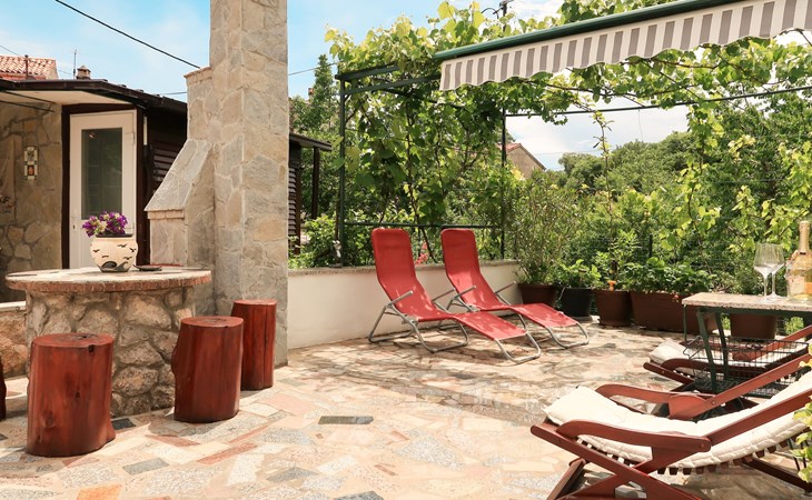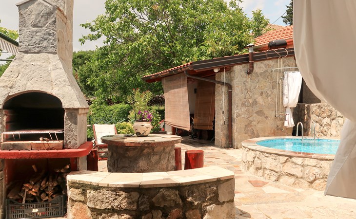 Terraced house "Margeta", 2 storeys. In the hamlet Lakmartin 5 km from the centre of Krk, 2 km from the centre of Kornić, 3.5 km from the centre of Punat, 3 km from the sea, 3 km from the beach. For shared use: property. Private: swimming pool round (2.5 m diameter, depth 80 cm, seasonal availability: 01.May. - 01.Nov.). Terrace (45 m2), garden furniture, barbecue. In the house: internet access, washing machine. Roofed, parking (for 2 cars). Shop 2 km, restaurant 3.5 km, bus stop 2 km, pebble beach 3 km. Please note: airfield 25 km from the property. For privately use: summer kitchen (4 ceramic hobs, dishwasher, fridge). The owner lives on the edge of the property (access via terrace, 45 m2).