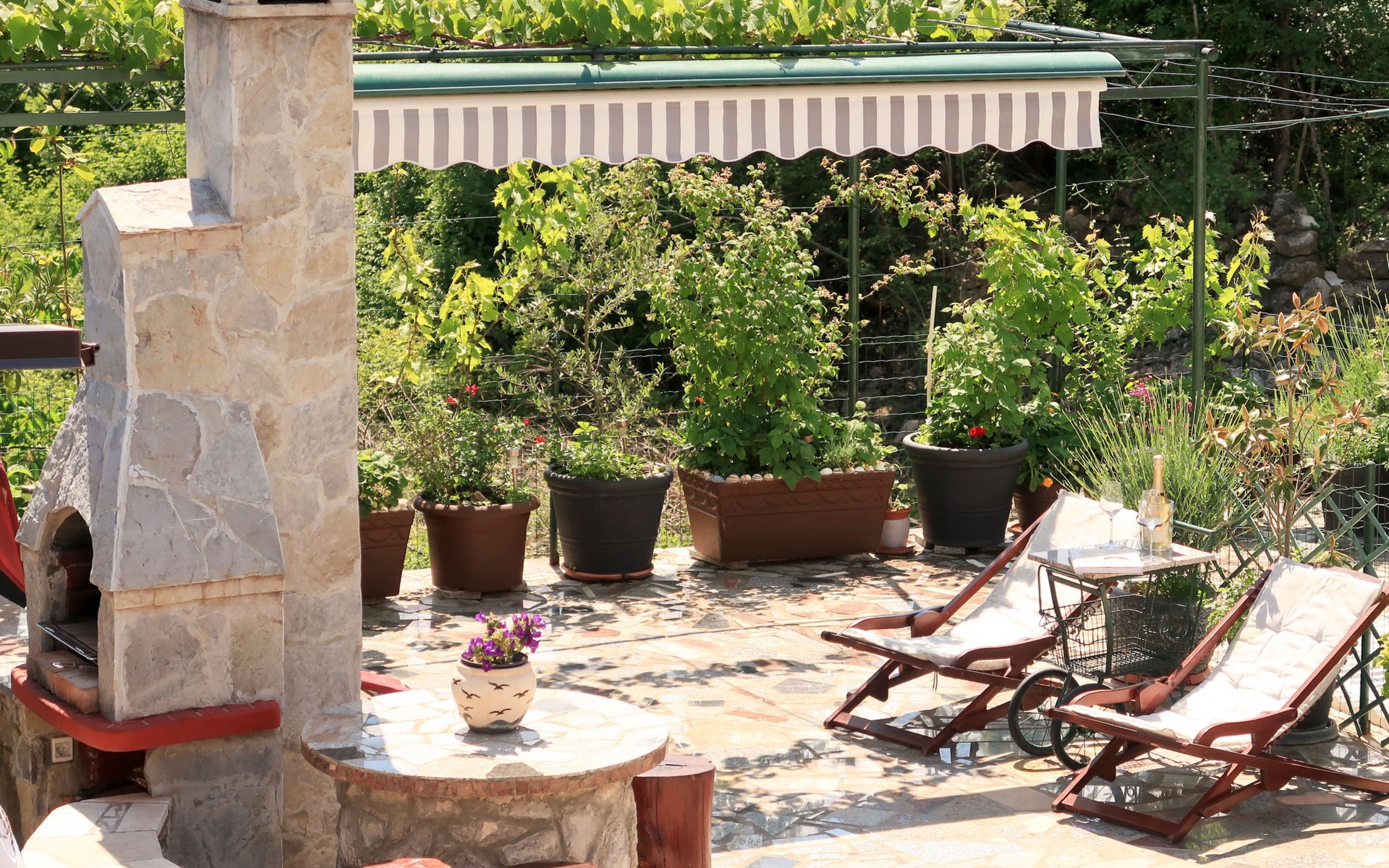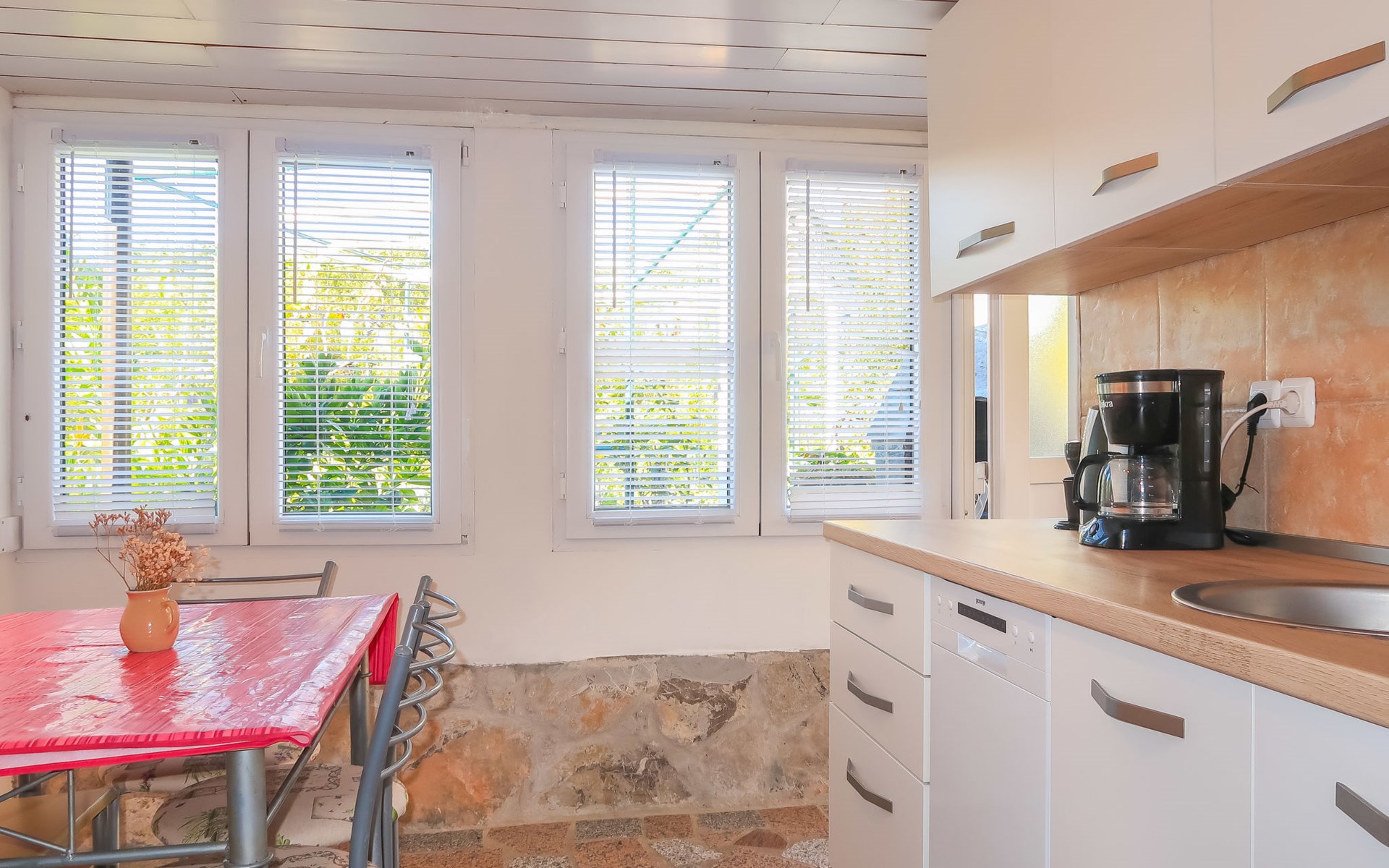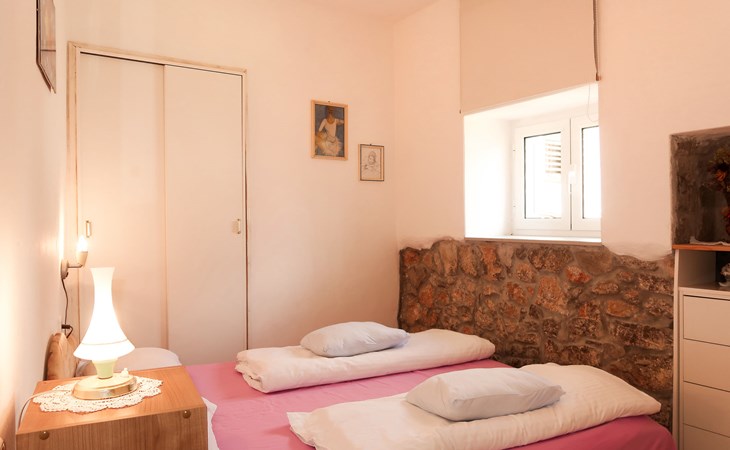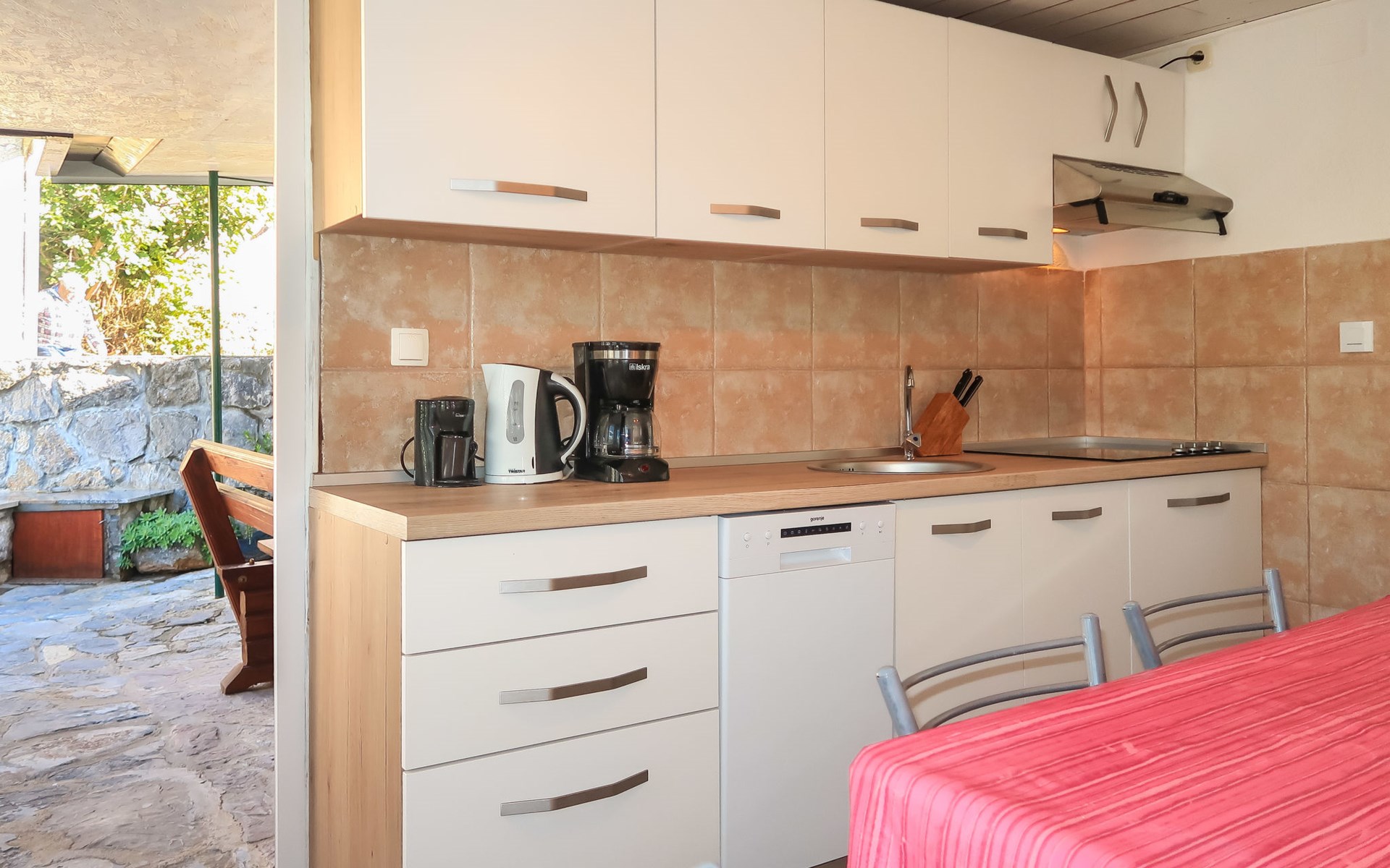 Terraced house "Margeta", 2 storeys. In the hamlet Lakmartin 5 km from the centre of Krk, 2 km from the centre of Kornić, 3.5 km from the centre of Punat, 3 km from the sea, 3 km from the beach. For shared use: property. Private: swimming pool round (2.5 m diameter, depth 80 cm, seasonal availability: 01.May. - 01.Nov.). Terrace (45 m2), garden furniture, barbecue. In the house: internet access, washing machine. Roofed, parking (for 2 cars). Shop 2 km, restaurant 3.5 km, bus stop 2 km, pebble beach 3 km. Please note: airfield 25 km from the property. For privately use: summer kitchen (4 ceramic hobs, dishwasher, fridge). The owner lives on the edge of the property (access via terrace, 45 m2).
