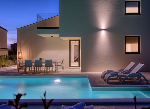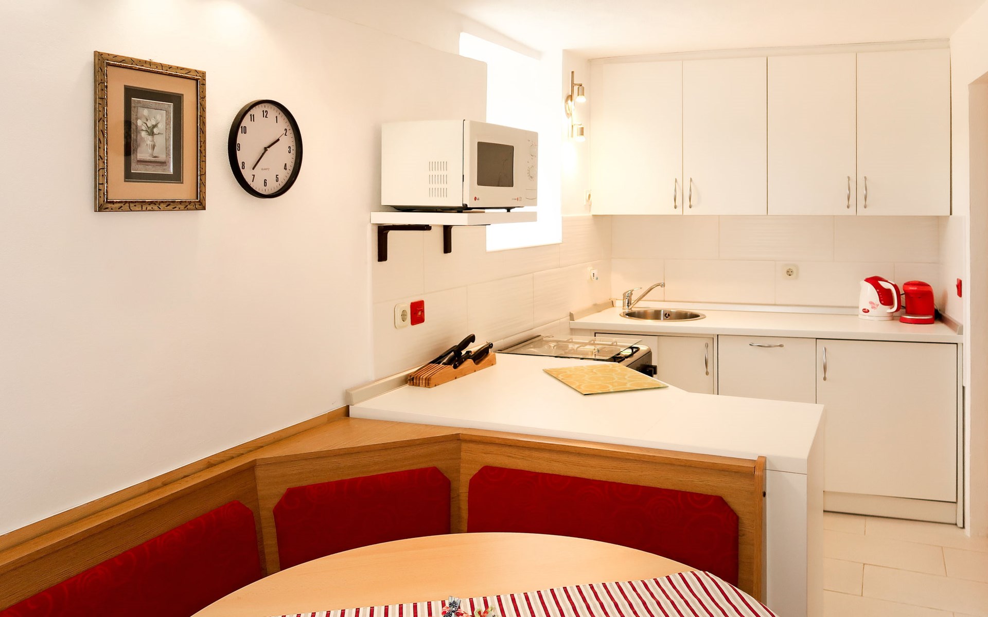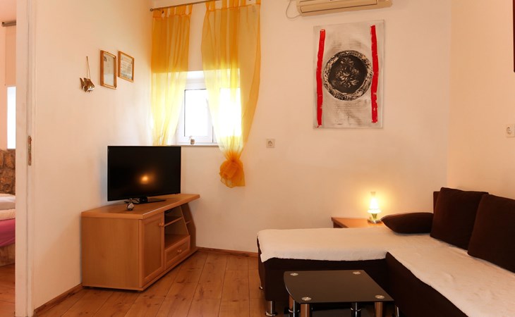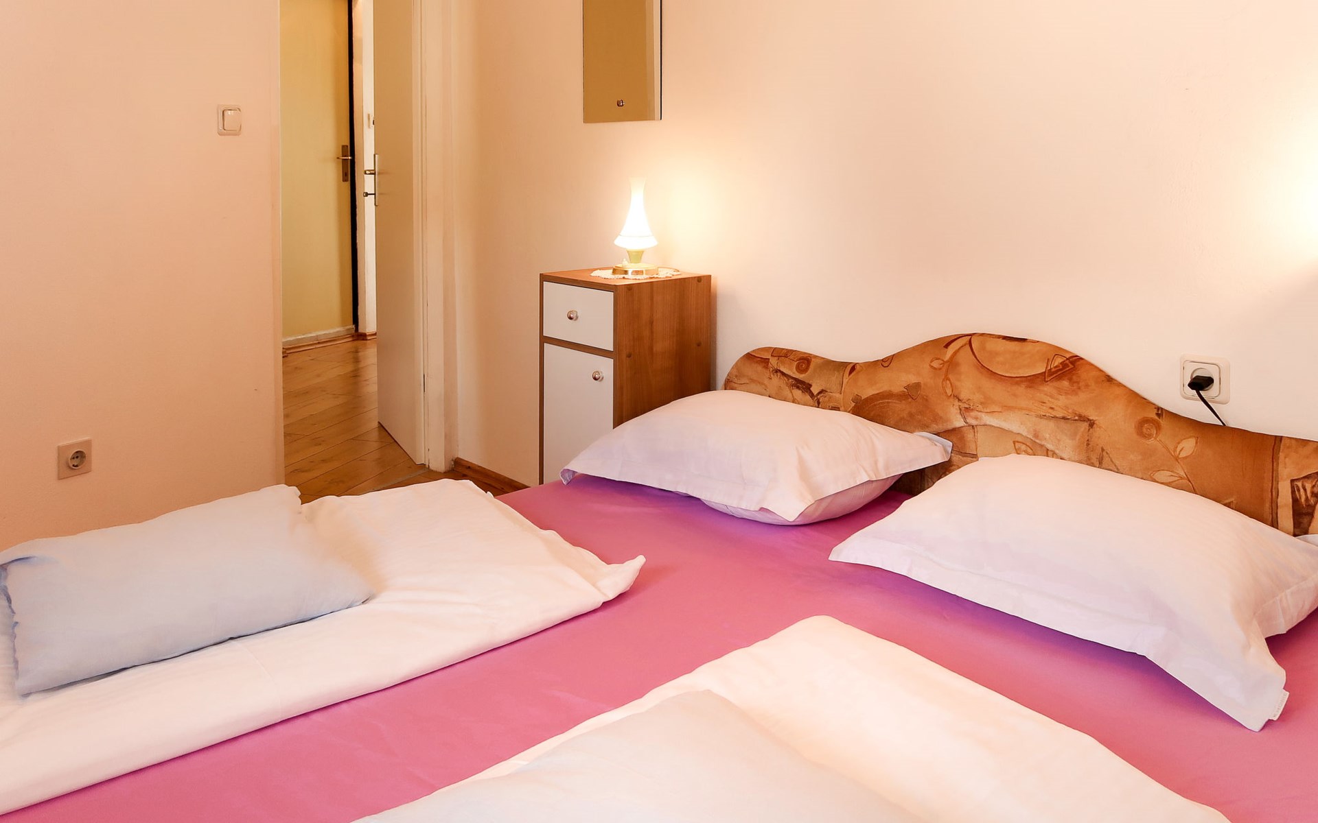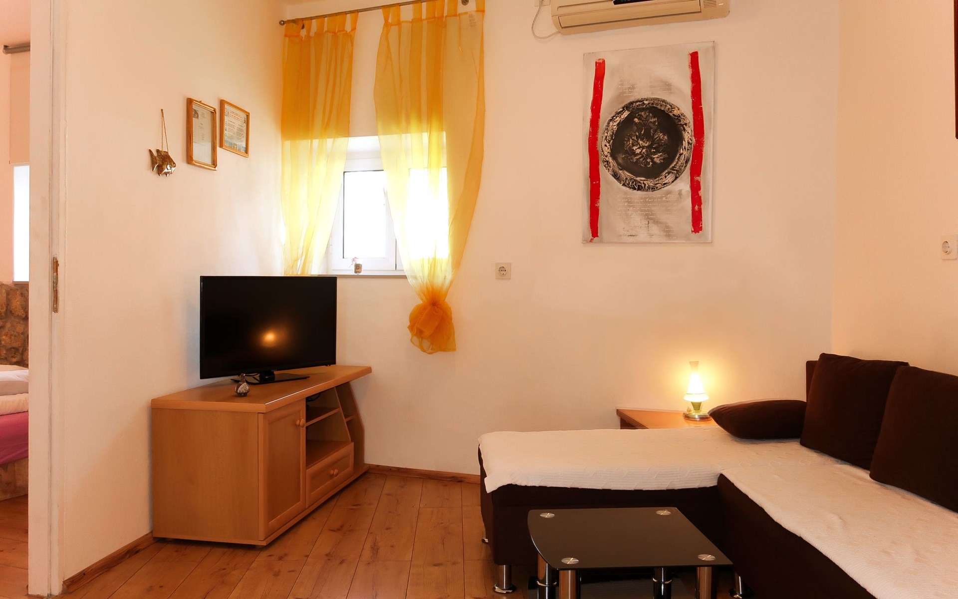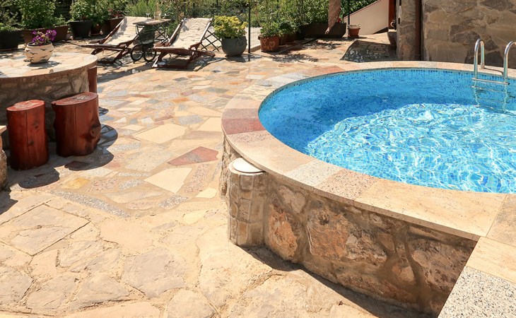 Terraced house "Margeta", 2 storeys. In the hamlet Lakmartin 5 km from the centre of Krk, 2 km from the centre of Kornić, 3.5 km from the centre of Punat, 3 km from the sea, 3 km from the beach. For shared use: property. Private: swimming pool round (2.5 m diameter, depth 80 cm, seasonal availability: 01.May. - 01.Nov.). Terrace (45 m2), garden furniture, barbecue. In the house: internet access, washing machine. Roofed, parking (for 2 cars). Shop 2 km, restaurant 3.5 km, bus stop 2 km, pebble beach 3 km. Please note: airfield 25 km from the property. For privately use: summer kitchen (4 ceramic hobs, dishwasher, fridge). The owner lives on the edge of the property (access via terrace, 45 m2).