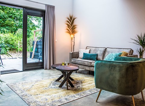 The L-Cube MIVA 4 has a modern and robust appearance and is suitable for 4 people. The detached, single-storey chalet is built in an L-shape and has been adapted for the disabled. For example, the house has an adapted bathroom and wide entrance and interior doors and thresholds have been removed or lowered as much as possible. Thanks to the high ceiling and large windows, there is a lot of light. In the spacious living area, you will find a sitting area, television and an atmospheric fireplace. The open kitchen is equipped with a dishwasher, electric kettle, combination microwave oven and a Nespresso Professional Machine (capsules for this machine are only available at the reception/mini-market).There are 2 bedrooms in total, each with two single box-spring beds.There is also a bathroom with a spacious walk-in shower and toilet. Through the sliding doors in the living room you can access the sun terrace with garden furniture. You can park 1 car at the house and there is free Wi-Fi available.