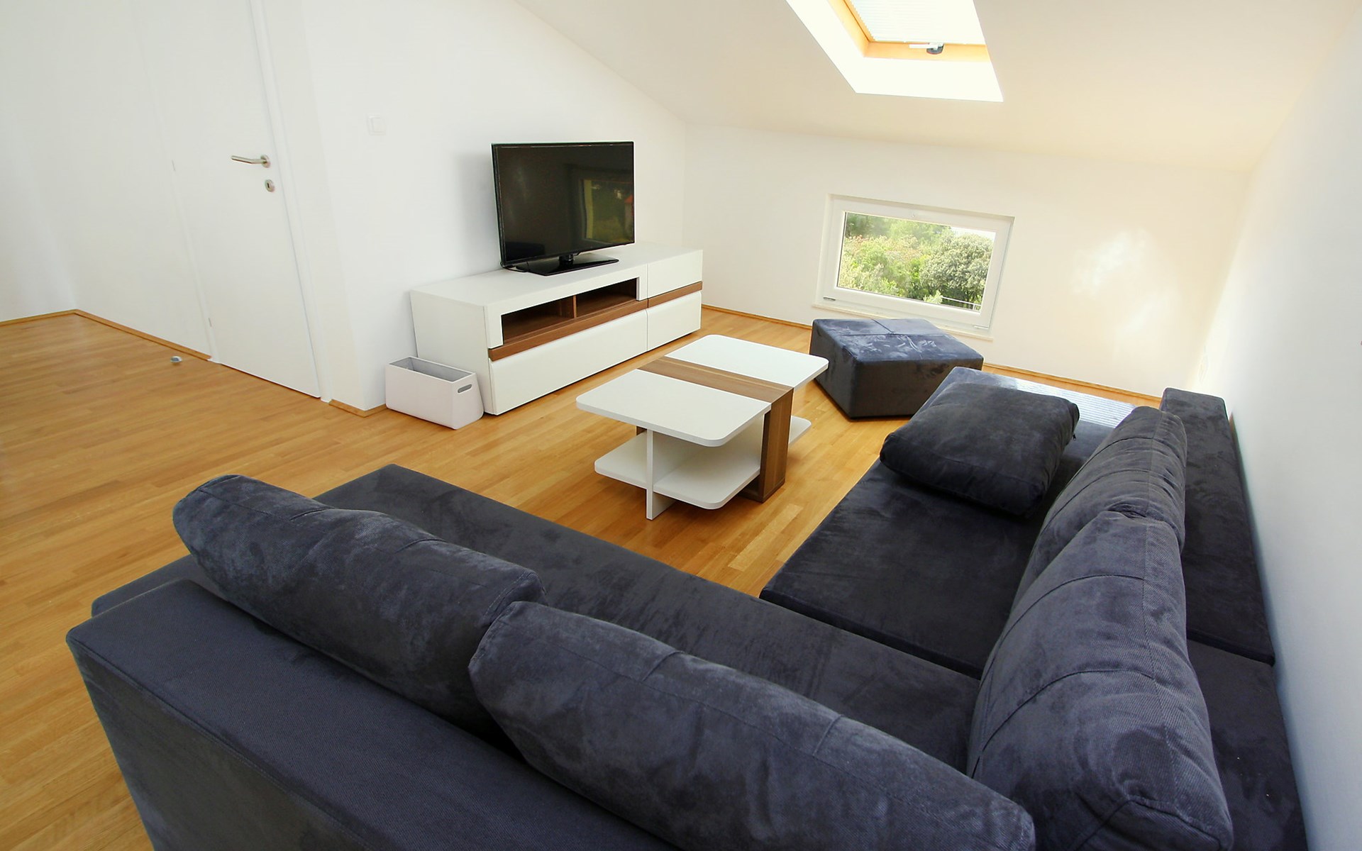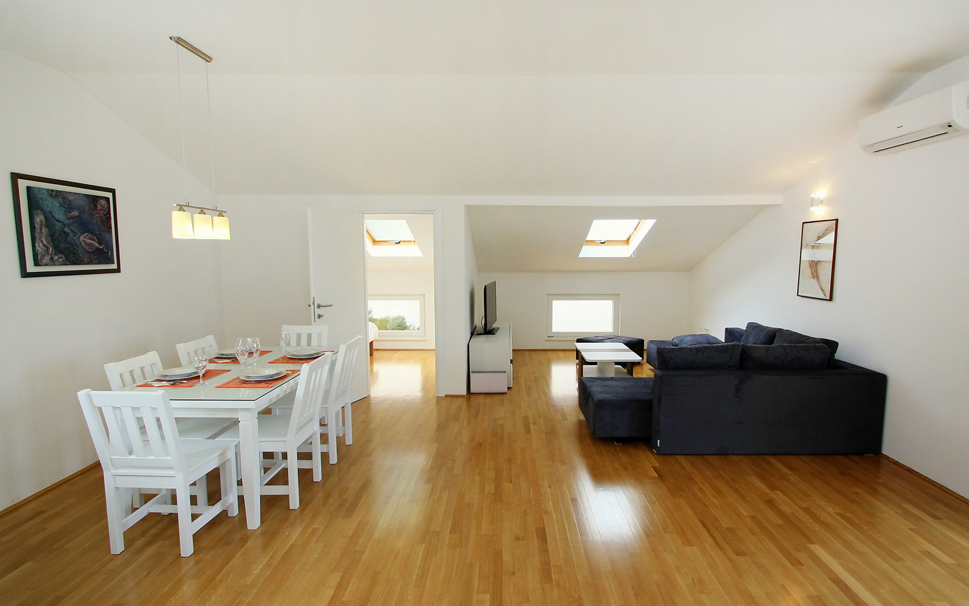 9-room house 210 m2 on 3 levels, north facing position. Living/dining room with satellite TV and air conditioning. Exit to the terrace. 1 room with 2 beds (90 cm, length 200 cm). Open kitchen (4 hot plates, oven, freezer). Shower/WC. Upper floor: (exterior staircase) living/dining room with 1 sofabed (160 cm, length 200 cm), satellite TV and air conditioning. Exit to the terrace. 1 room with 1 french bed (160 cm, length 200 cm). 1 room with 1 x 2 bunk beds (90 cm, length 200 cm). Open kitchen (4 hot plates, oven, dishwasher, freezer). Shower/bidet/WC. 2nd upper floor: (exterior staircase) living/dining room, with sloping ceilings, ceiling height 130 - 270 cm with rooflight with satellite TV and air conditioning. Exit to the balcony. 1 room with 1 french bed (160 cm, length 200 cm). 1 room with 2 beds (90 cm, length 200 cm). 1 room with sloping ceilings, ceiling height 130 - 200 cm with rooflight with 1 bed (90 cm, length 200 cm). Open kitchen (4 hot plates, oven, dishwasher, freezer). Shower/bidet/WC, sep. WC. Balcony 2 m2, terrace 12 m2, terrace 7 m2, roofed. Terrace furniture, deck chairs. Partial view of the sea. Facilities: washing machine. Internet (WiFi, free). The unit consists of 3 apartments rented as one unit. Each floor with one apartment.