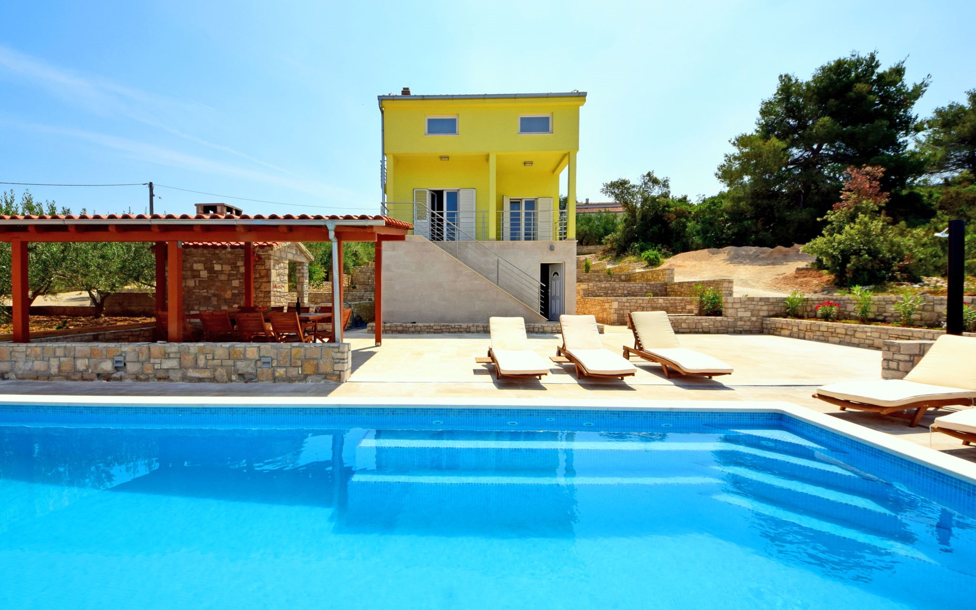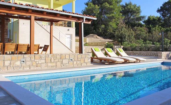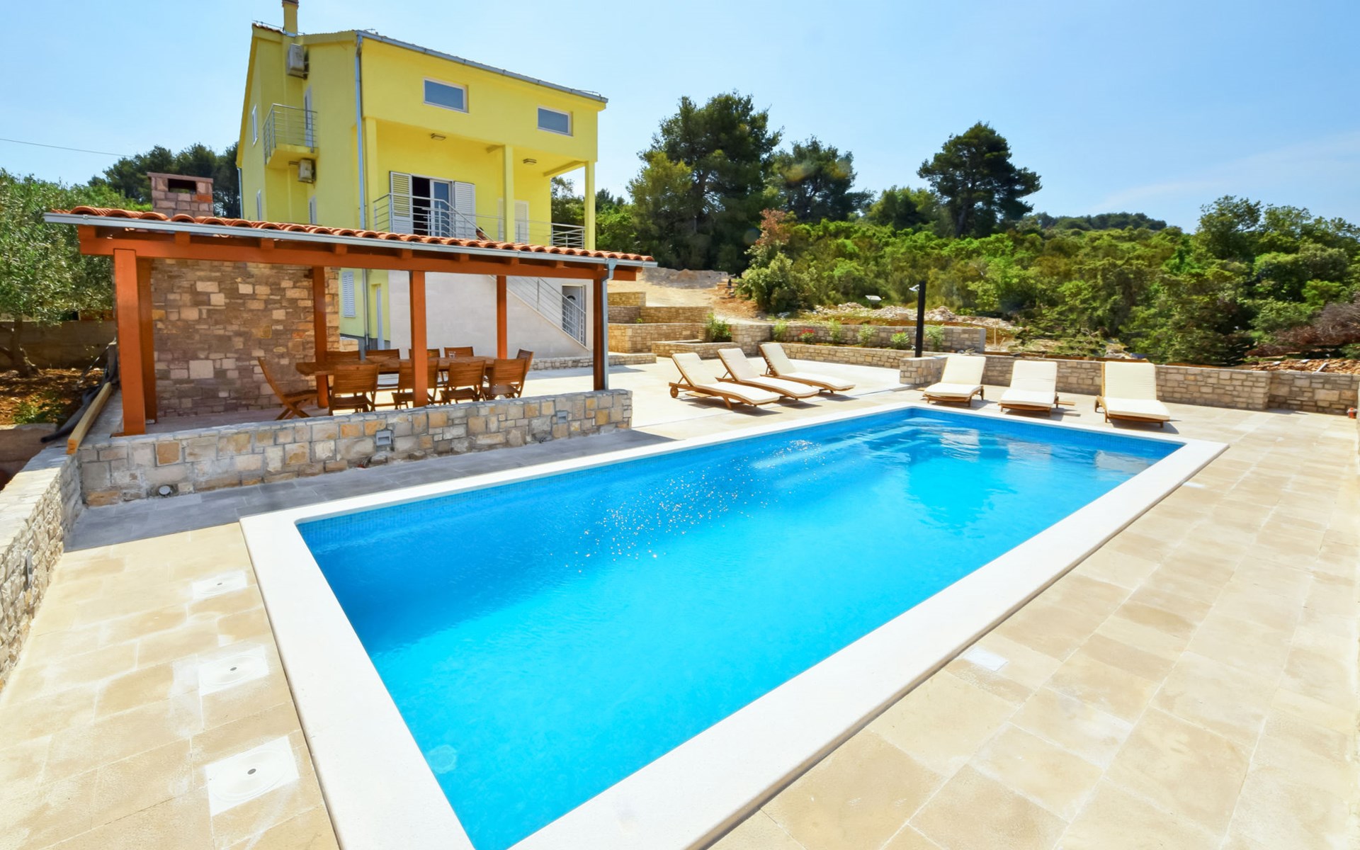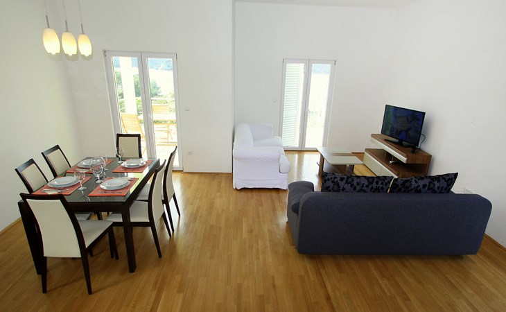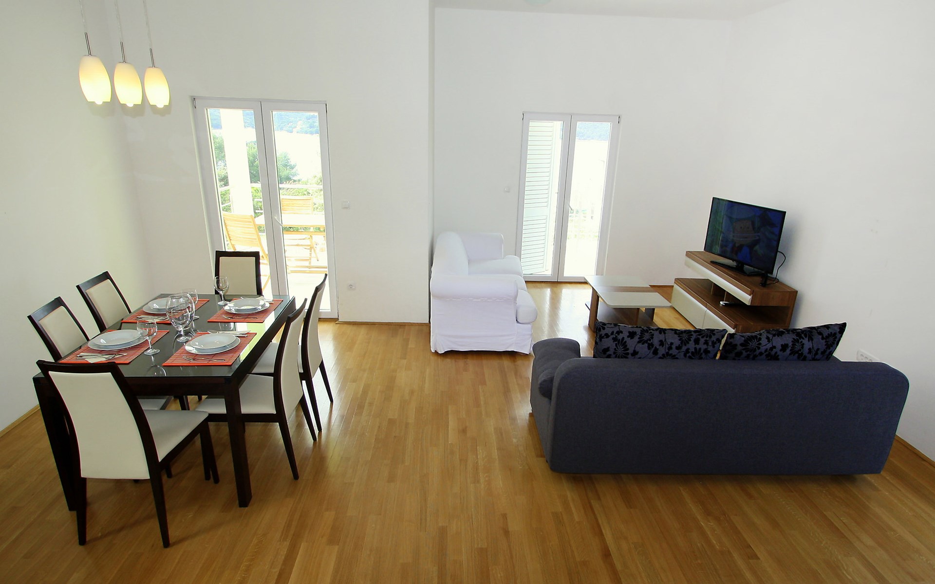 3-family house "Gabriela", 3 storeys. In a quiet, sunny, elevated position, 200 m from the sea, 200 m from the beach. Private: swimming pool angular (9 x 3 m, 29 m2, depth 150 cm, seasonal availability: 01.May. - 01.Oct.) with internal staircase. Outdoor shower, garden furniture, barbecue. In the house: internet access, washing machine. Parking at the house on the premises. Shop 5 km, restaurant 250 m, bus stop 550 m, pebble beach 500 m, rocky beach 200 m. Shop 850 m (15.06.-15.09.).