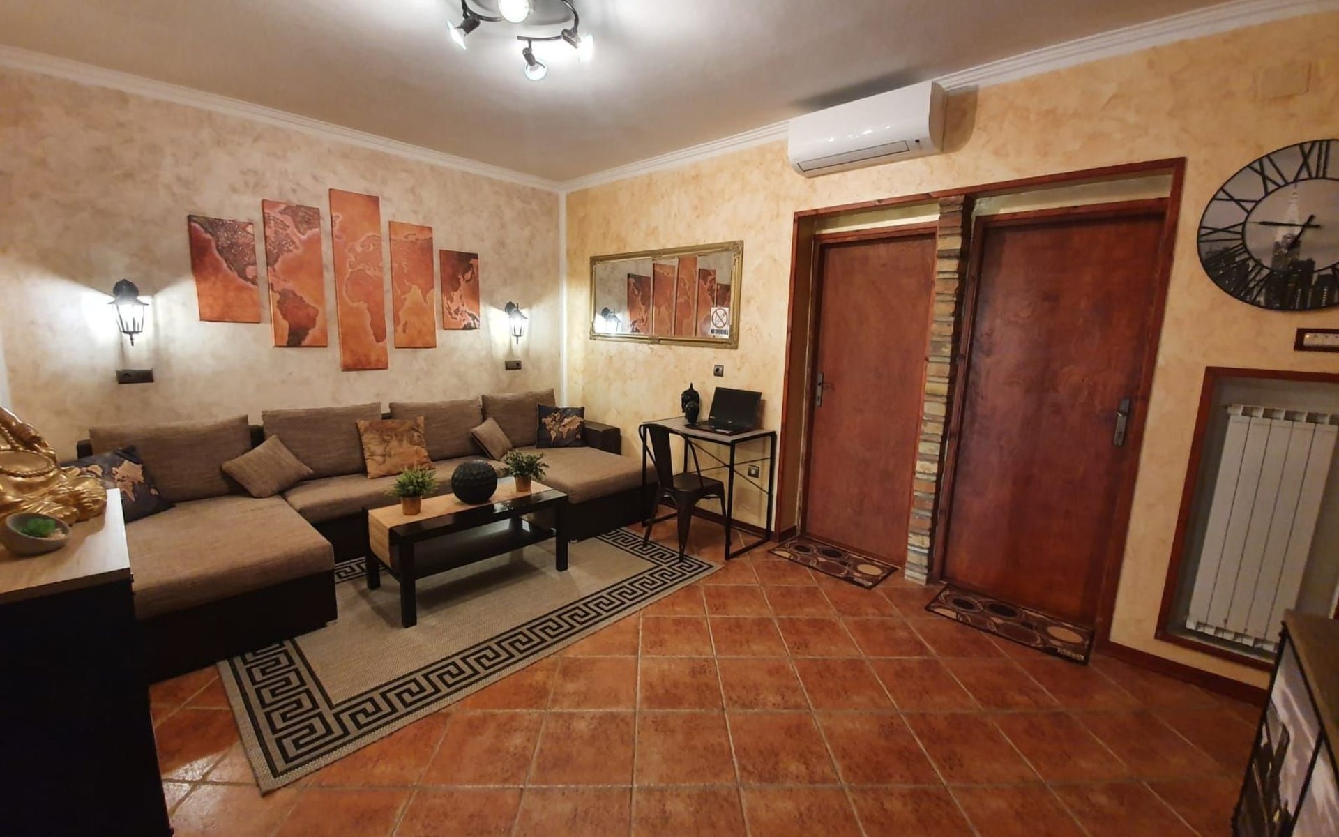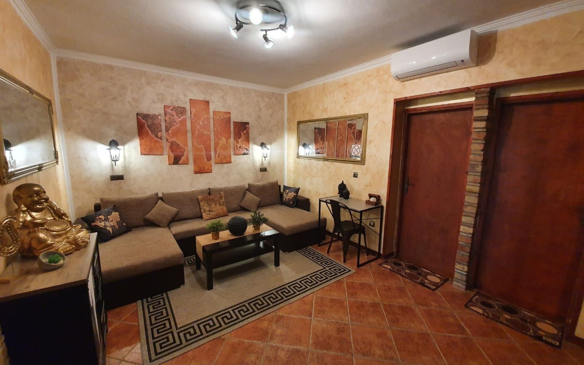 The comfortable holiday flat measures approximately 100 square metres and is located on the ground floor of a two-storey residential building. It consists of a spacious living room (25 square metres), two double bedrooms (13 and 16 square metres), a bathroom (7.5 square metres) and a large, fully equipped kitchen with modern appliances. Both bedrooms are furnished with double beds (190 x 200 cm and 200 x 200 cm), one of which also has a cot (120 x 70 cm). A sofa bed (160 x 190 cm) provides additional sleeping space. All rooms can be heated. Bed linen, towels, final cleaning and all additional costs are already included in the rental price. WLAN can be used free of charge. There is air conditioning (Daikin A/C) in the living room.