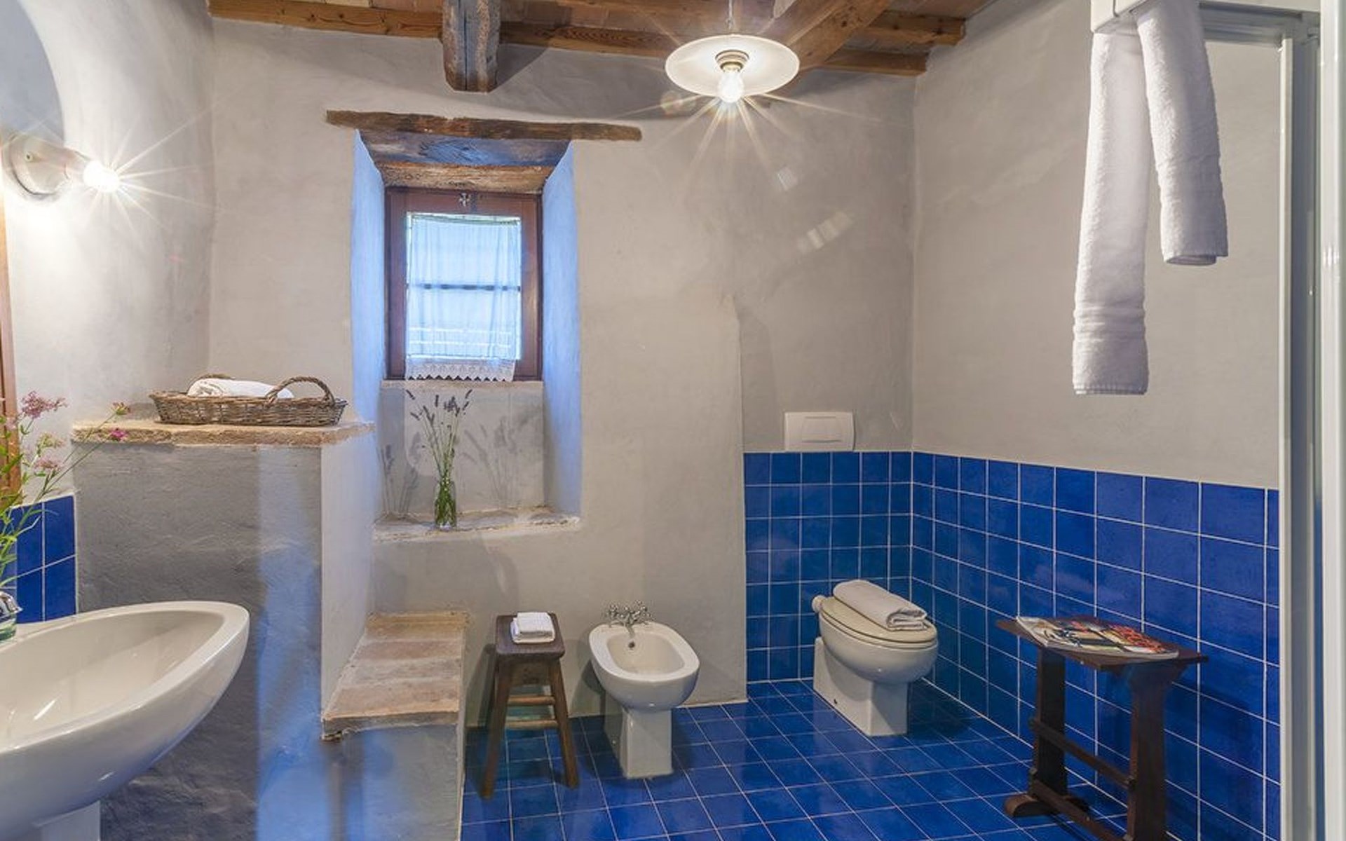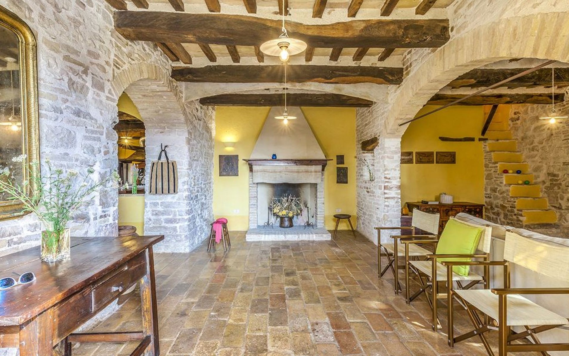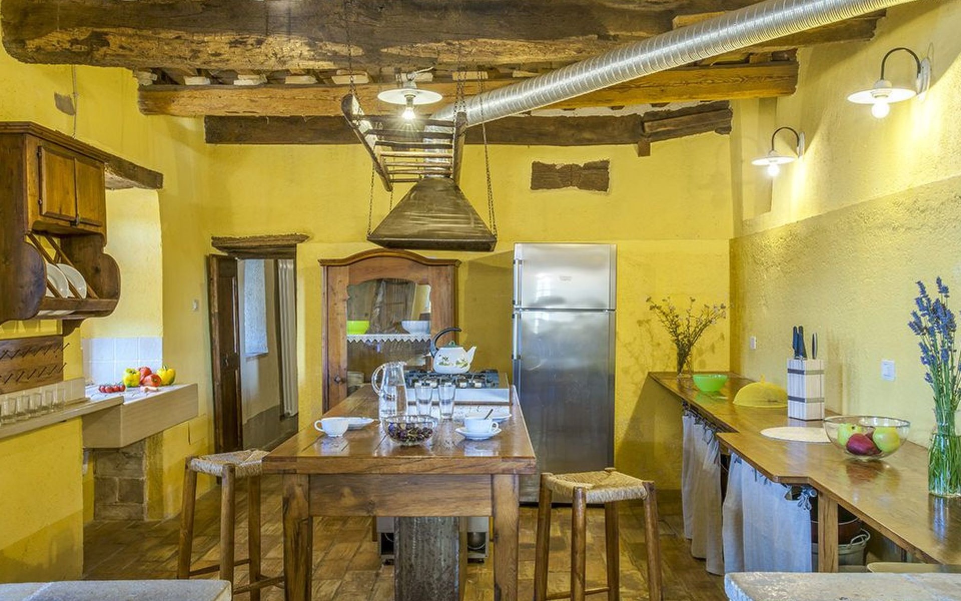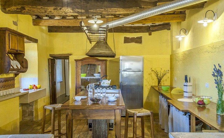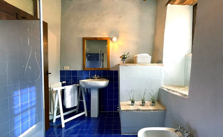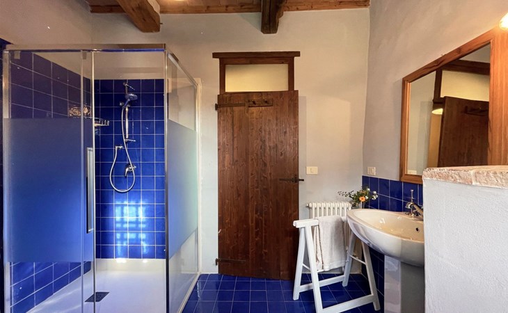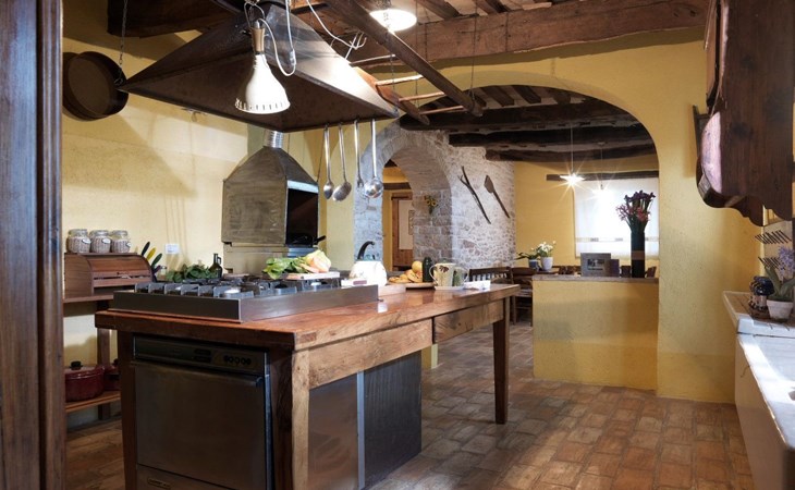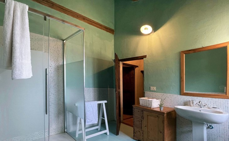 The villa is well structured to accommodate groups. On the ground floor the kitchen is large, bright and well equipped, with professional facilities; there is a dining room, a large living room with fireplace, and a self-contained area with study, double bedroom and bathroom with shower. On the upper floor there is a living room with fireplace, a double bedroom with en suite bathroom with shower, 4 other double bedrooms and 3 bathrooms: 1 with bath and 2 with shower.