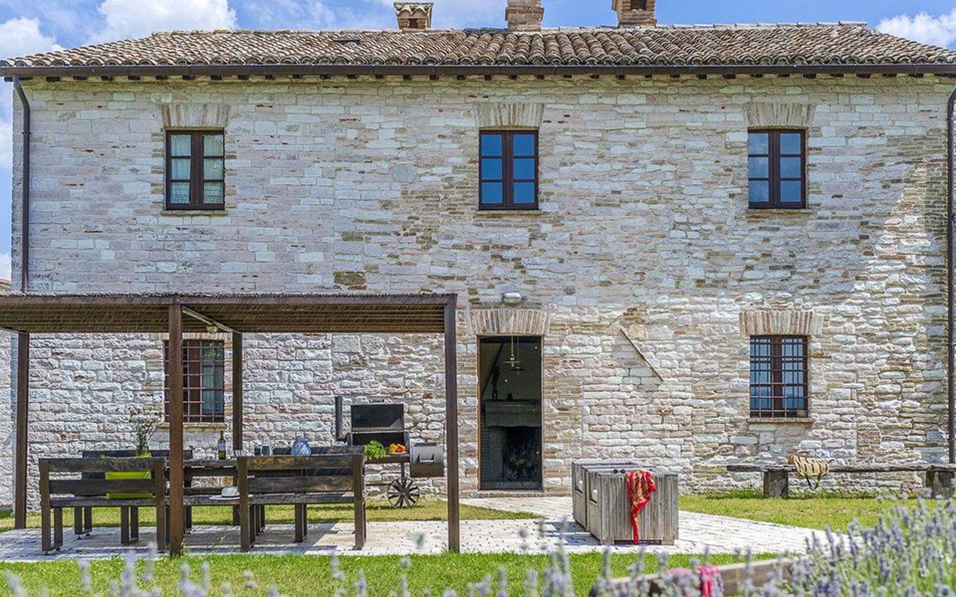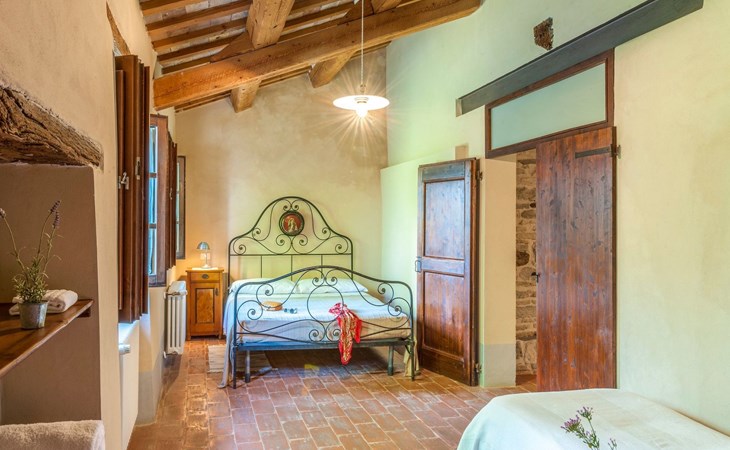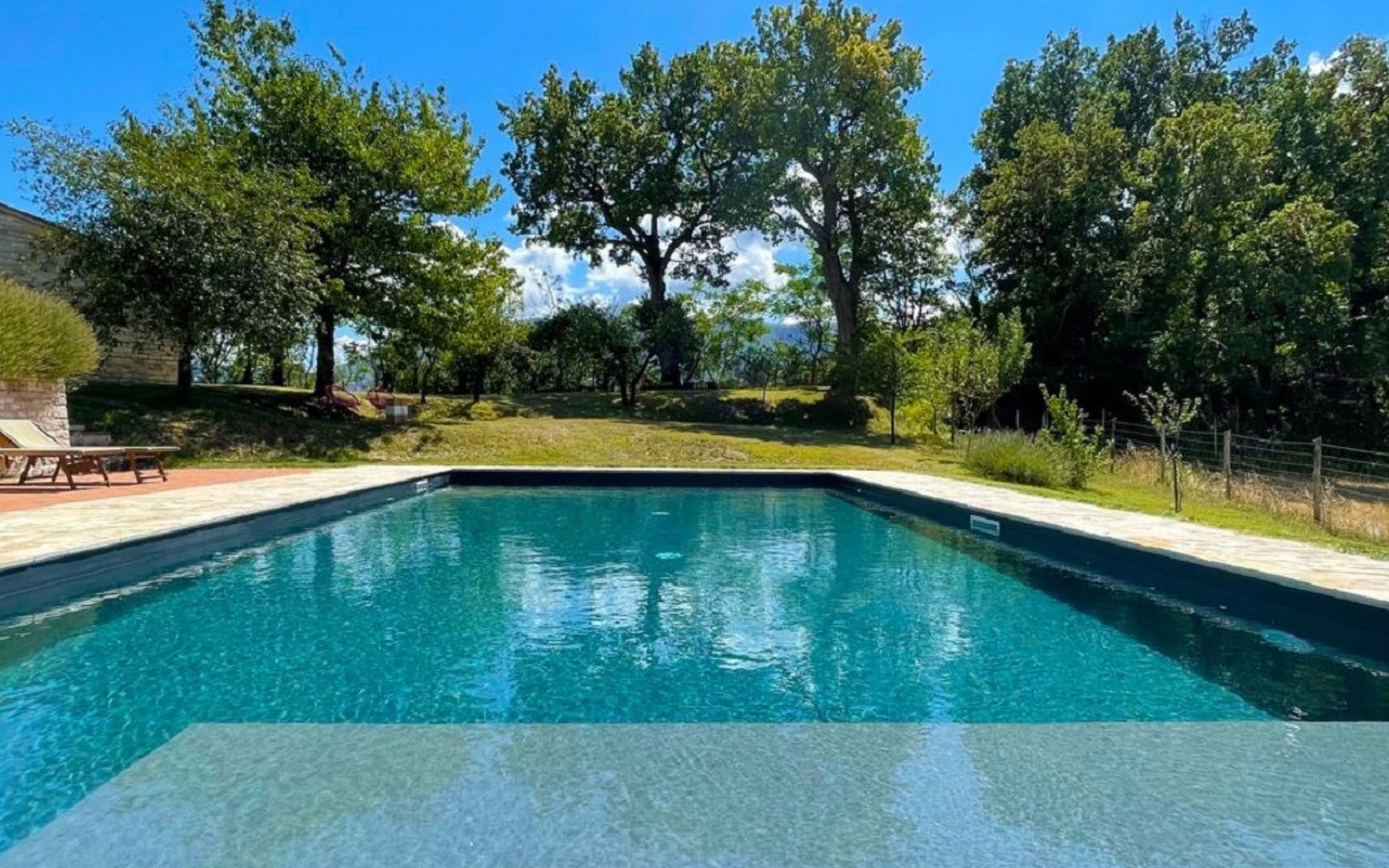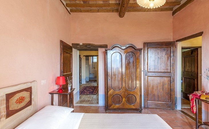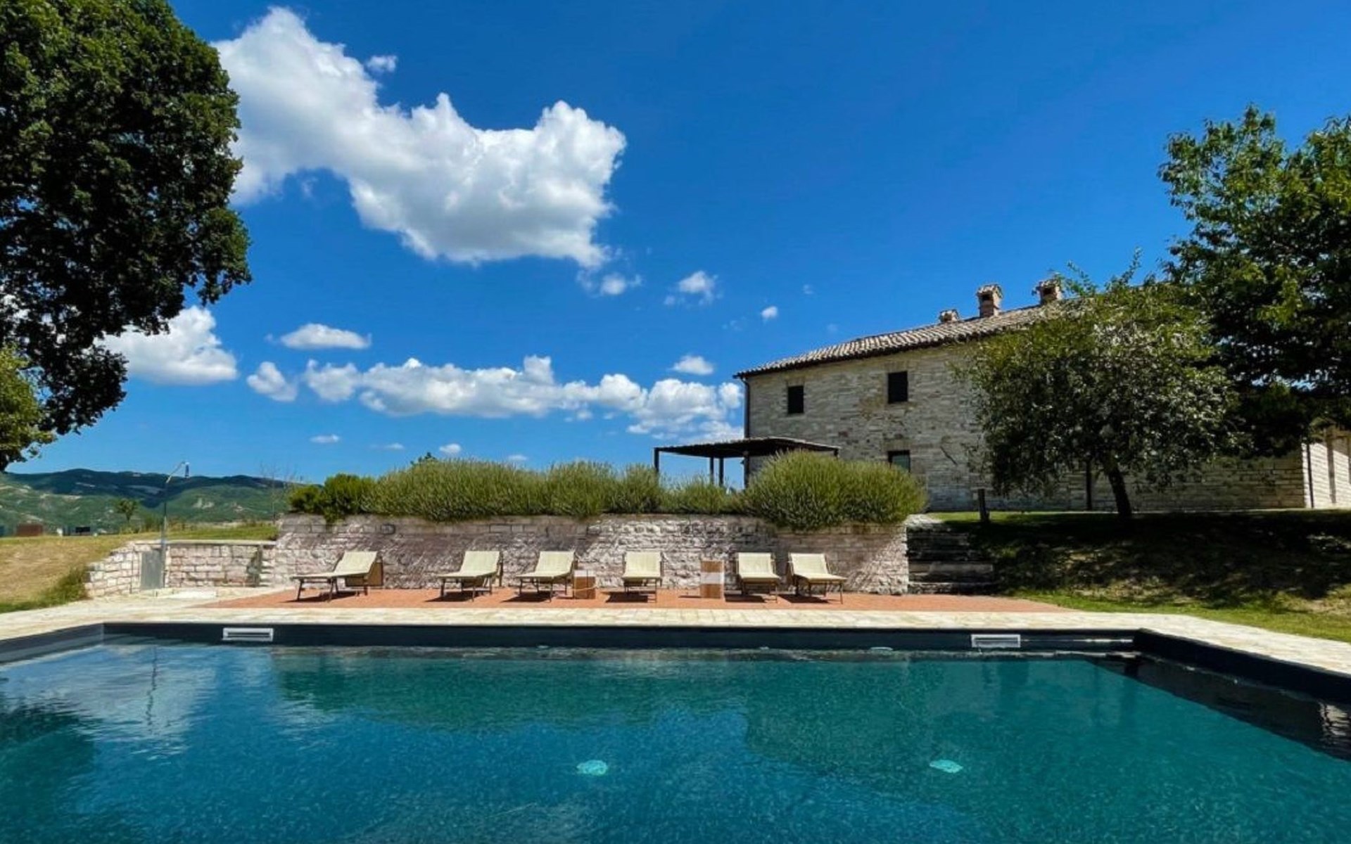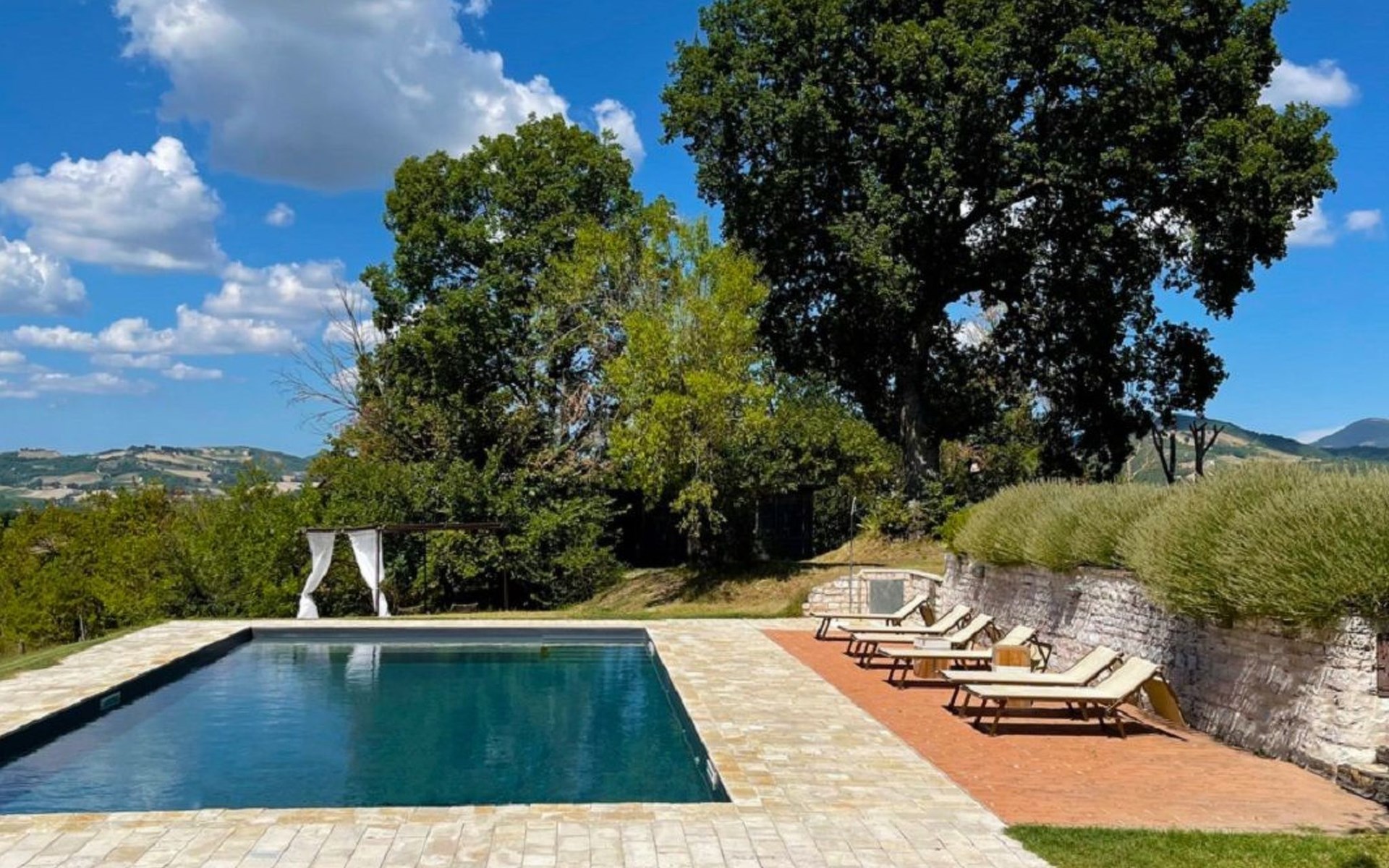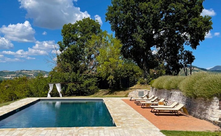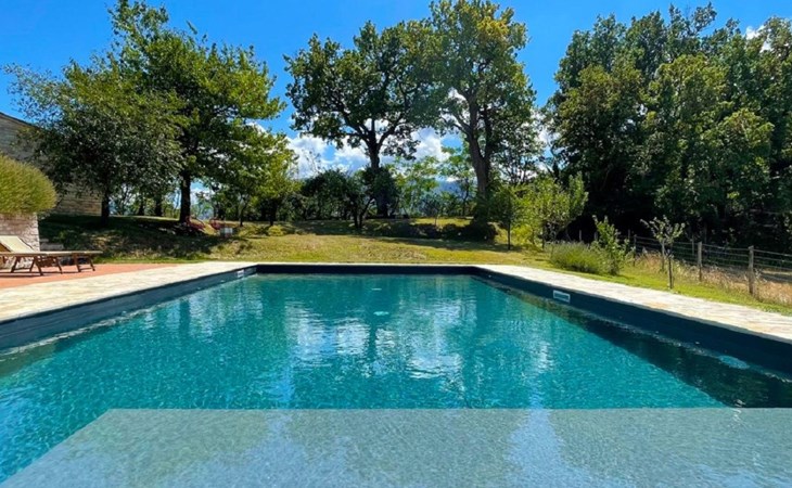 The pool is spacious, with a sunbathing area equipped with sun loungers, where you can sunbathe, have fun and enjoy the splendid panorama in total privacy. You can imagine yourself like this at Villa Checello: under the pergola, with a glass of wine and some good homemade bread, enjoying the sunset, with the long shadows of the evening tinged with warm tones and the scent of lavender and wild roses.