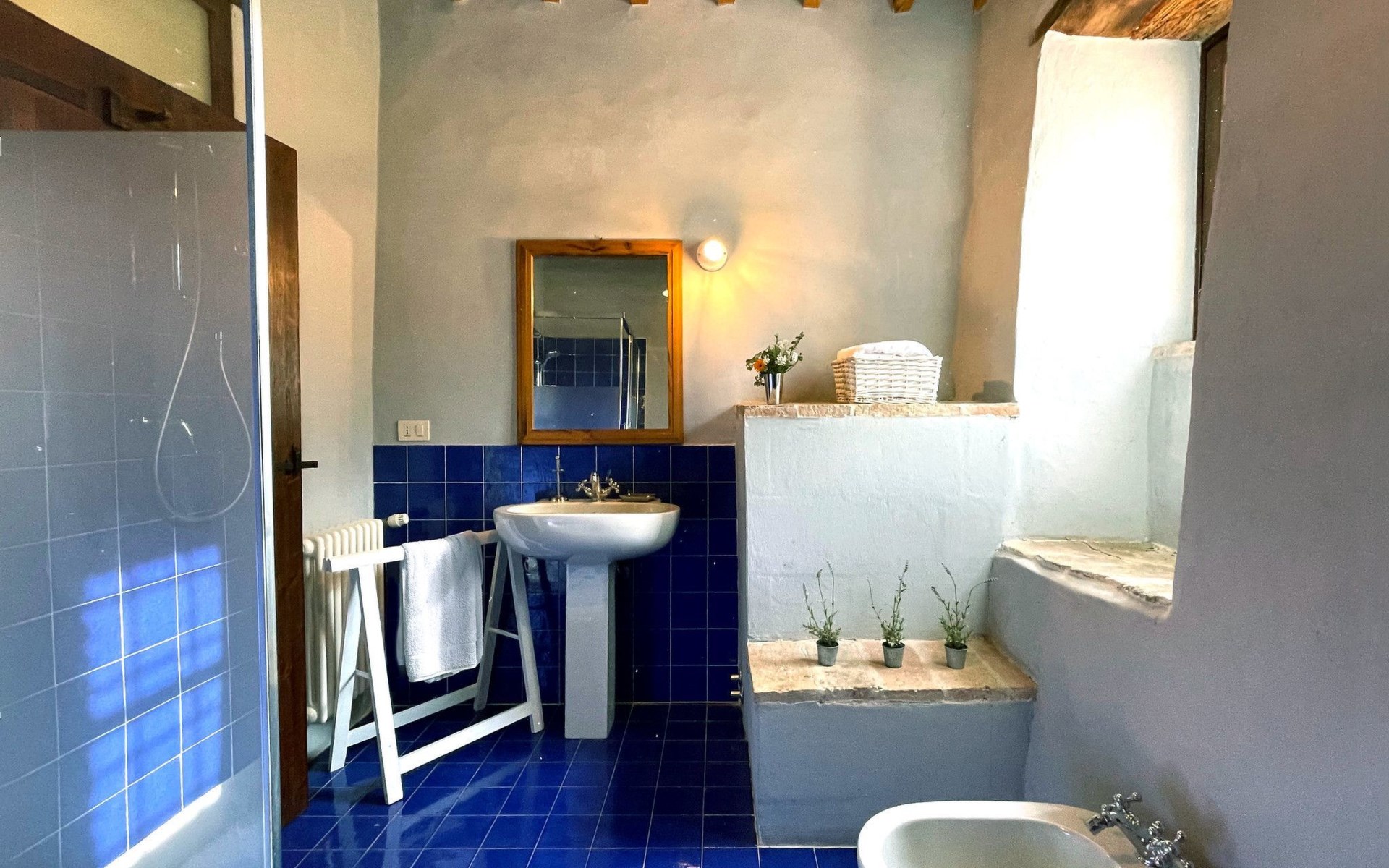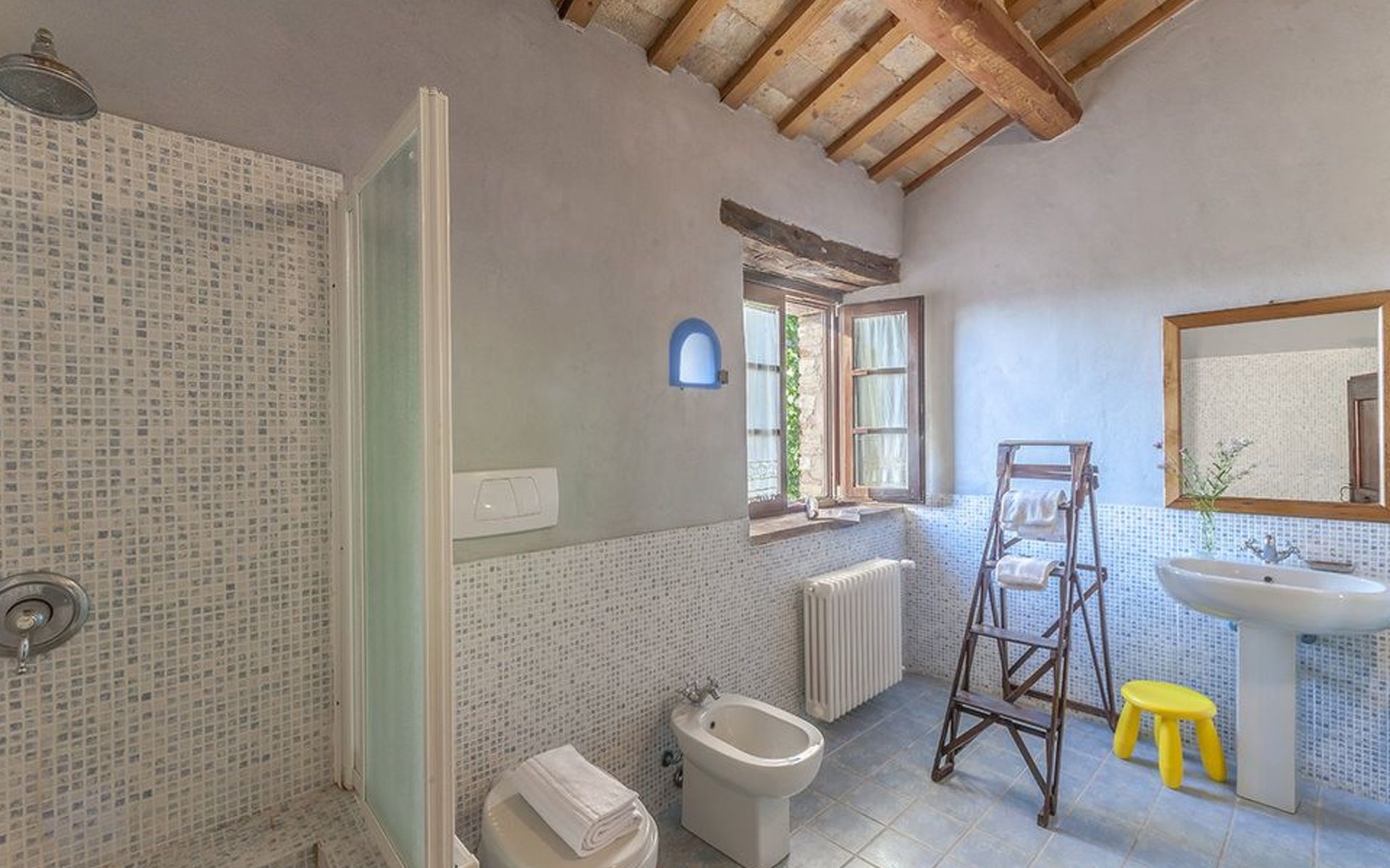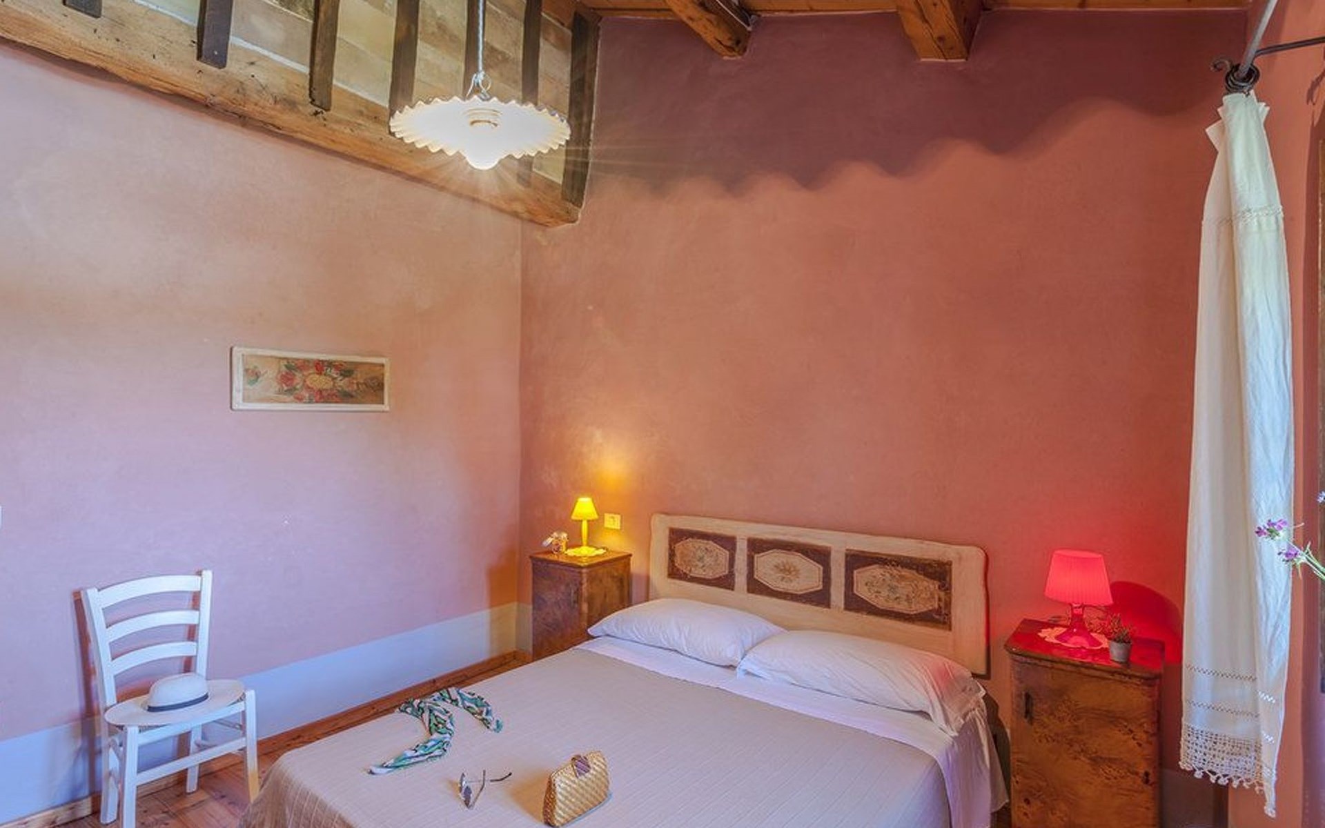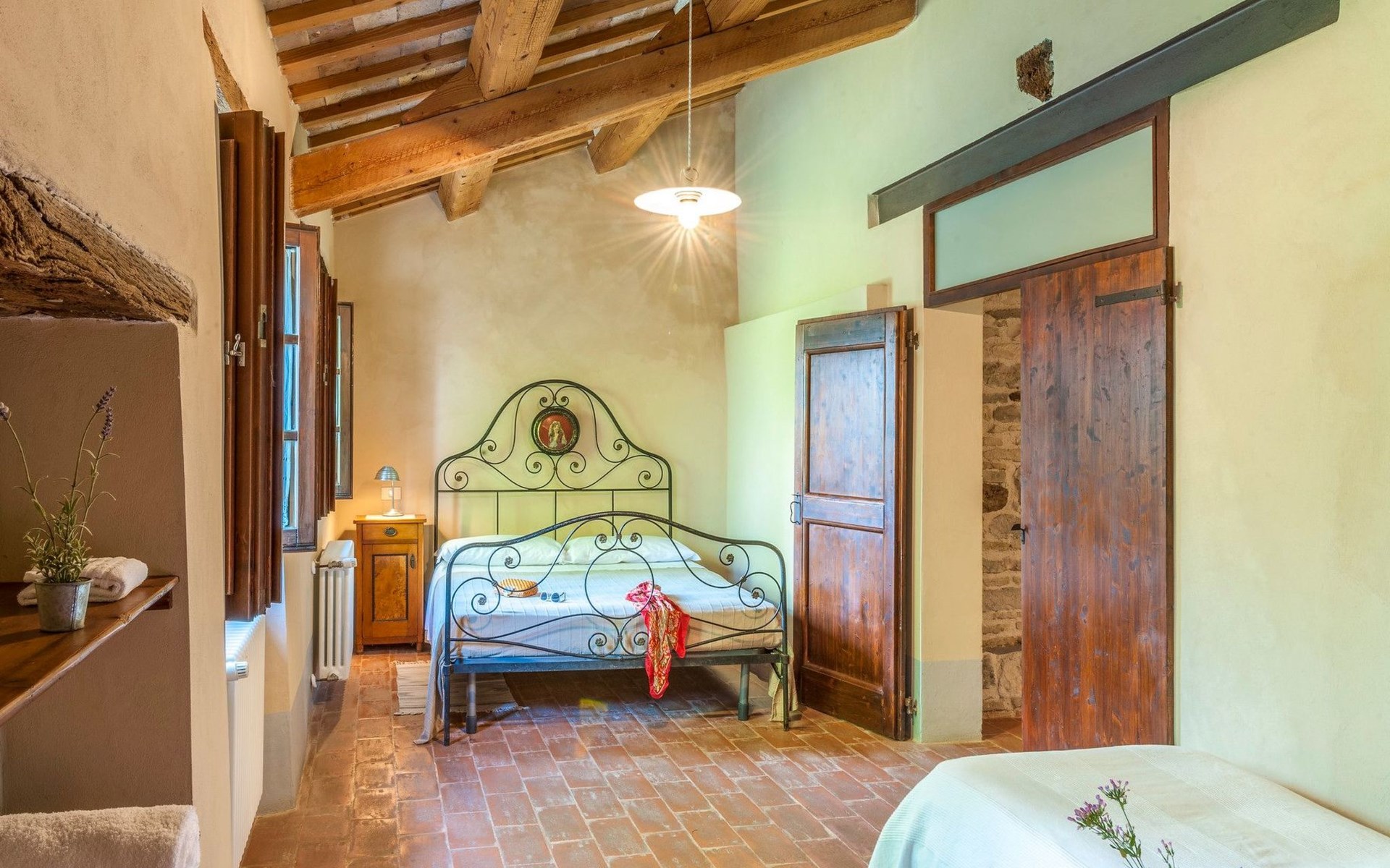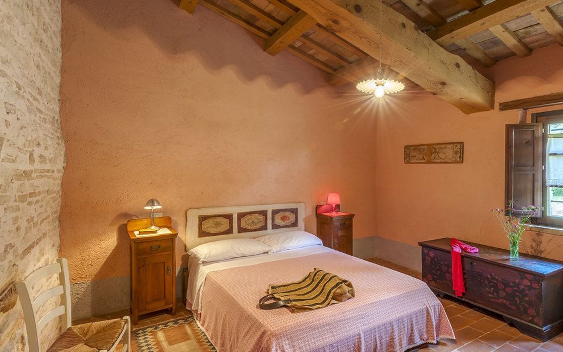 The pool is spacious, with a sunbathing area equipped with sun loungers, where you can sunbathe, have fun and enjoy the splendid panorama in total privacy. You can imagine yourself like this at Villa Checello: under the pergola, with a glass of wine and some good homemade bread, enjoying the sunset, with the long shadows of the evening tinged with warm tones and the scent of lavender and wild roses.