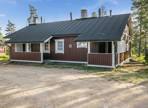 Cosy row house of massive logs, built in 2000. Roomy living room and kitchenette, with a sofa bed, fire place room with and a sofa bed, sauna, 2 WC’s, storage room, and terrace. 3 bedrooms with 2 beds in each. Firewood includes in price. Pets 30€/reservation