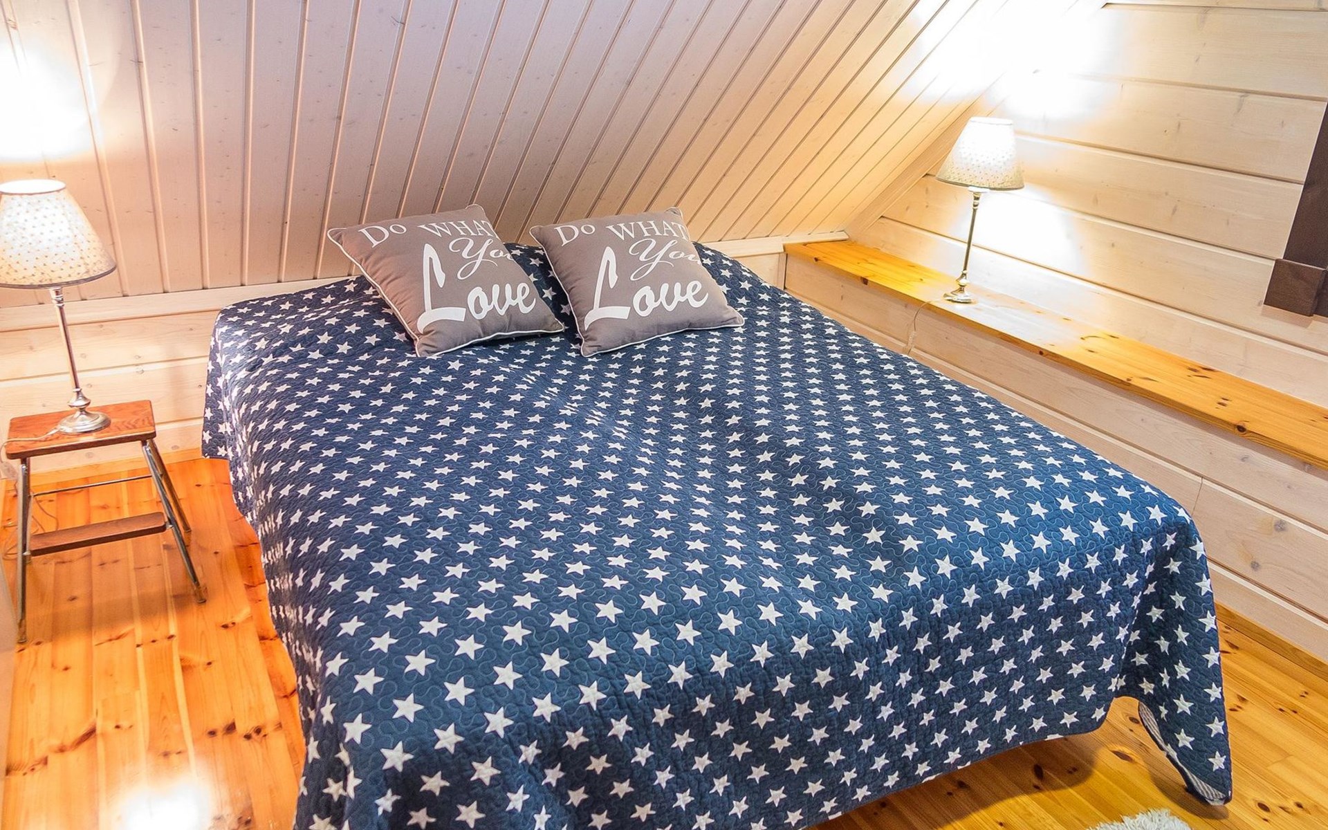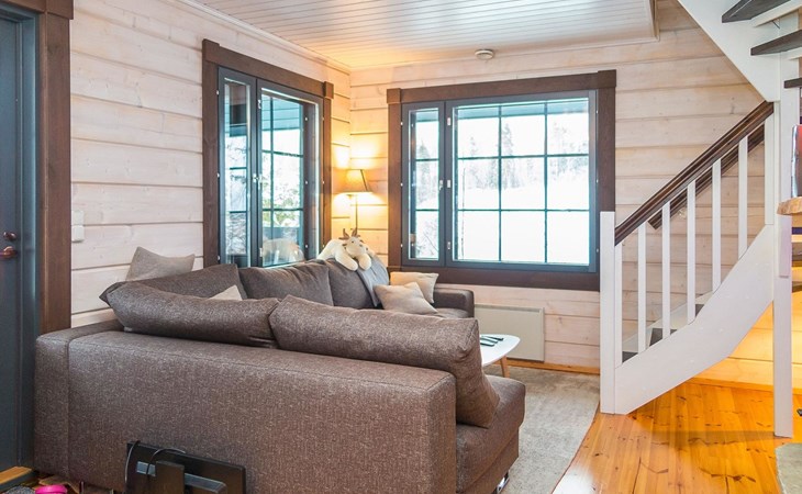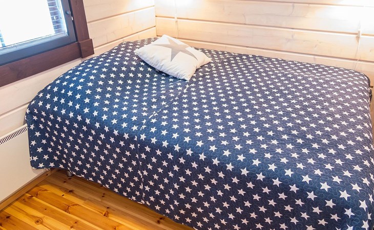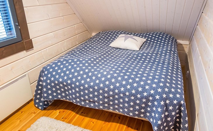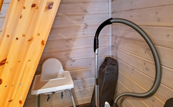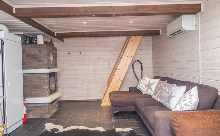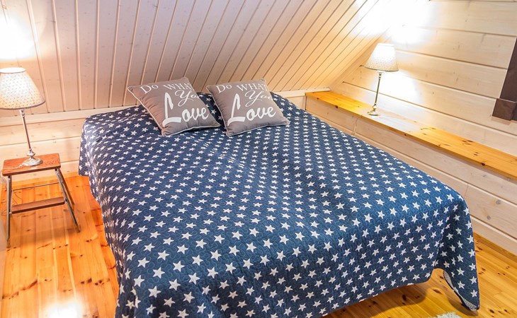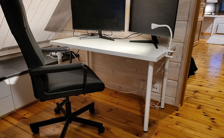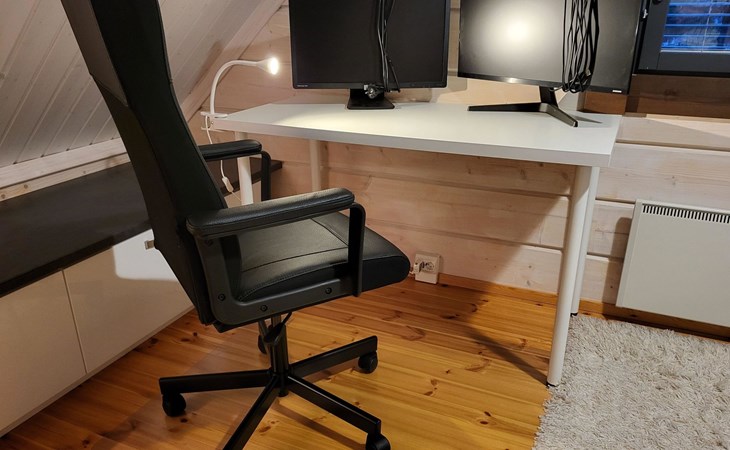 The log cabin has three floors; on the middle floor there is a living room / kitchen, a bedroom with a double bed, a separate toilet and a terrace. Upstairs 2 bedrooms with a double bed in each, a sofa bed in the lobby with 2 extra beds. Both upstairs bedrooms have office chairs and desks, 2 x screens / desk and lamps.