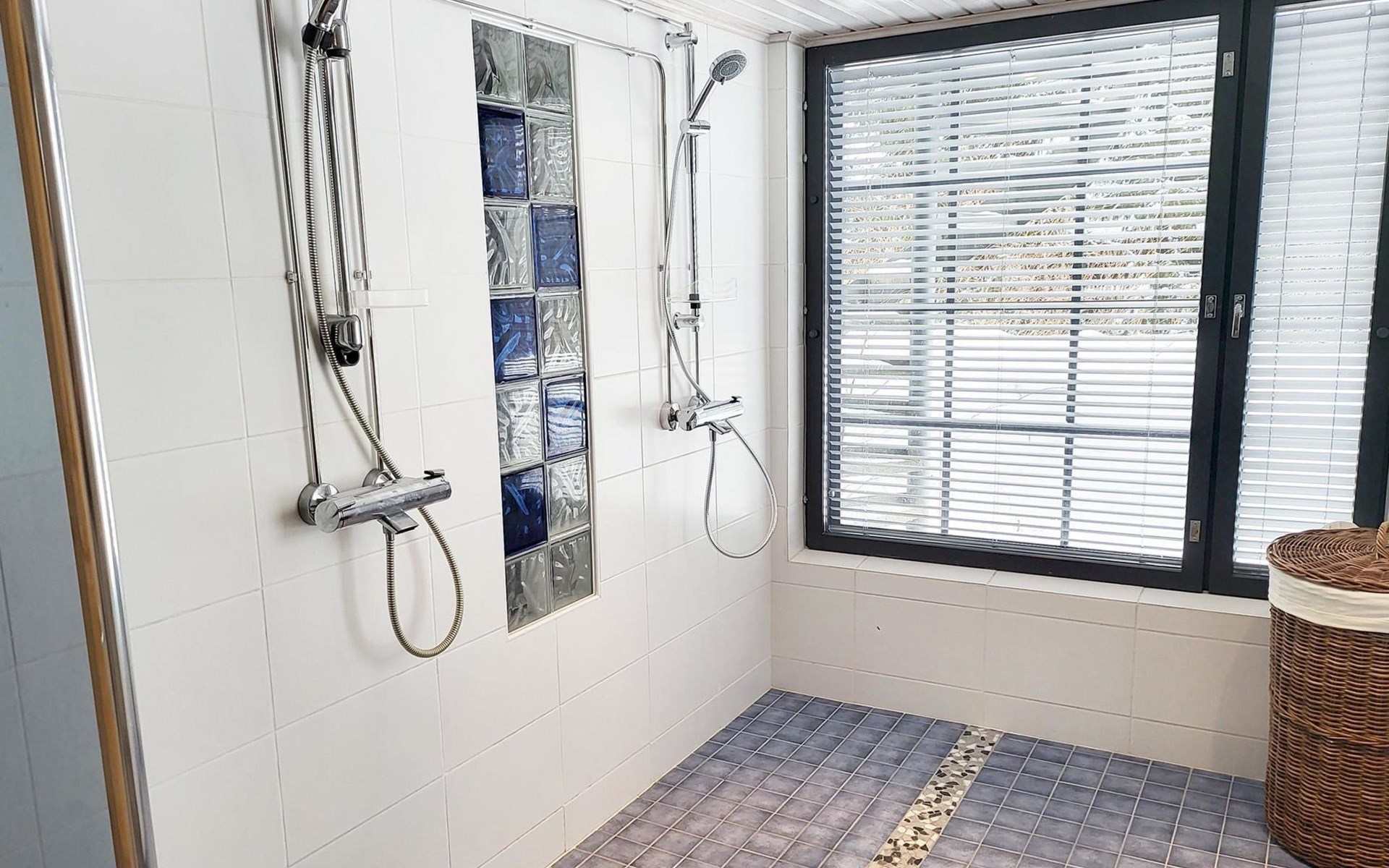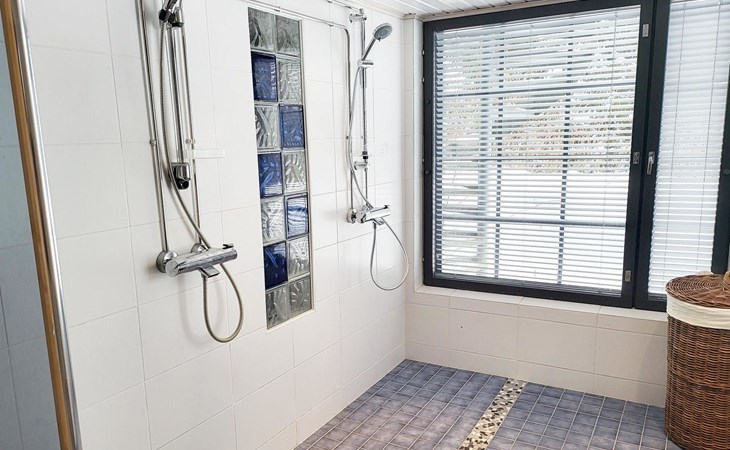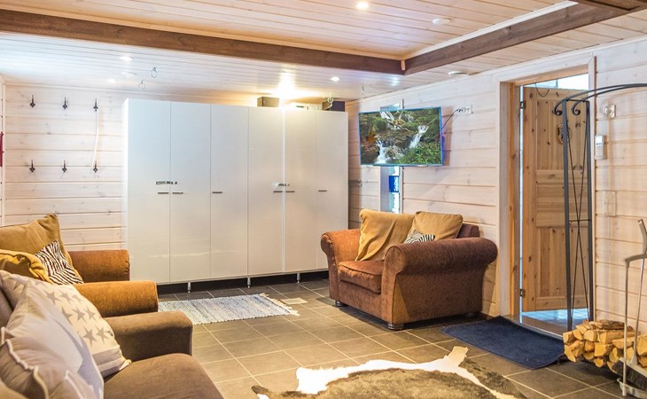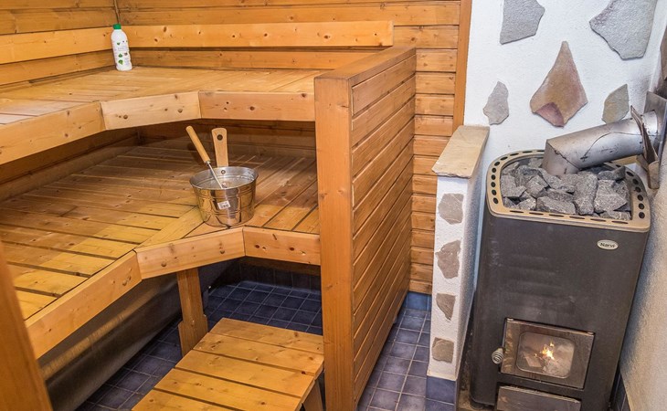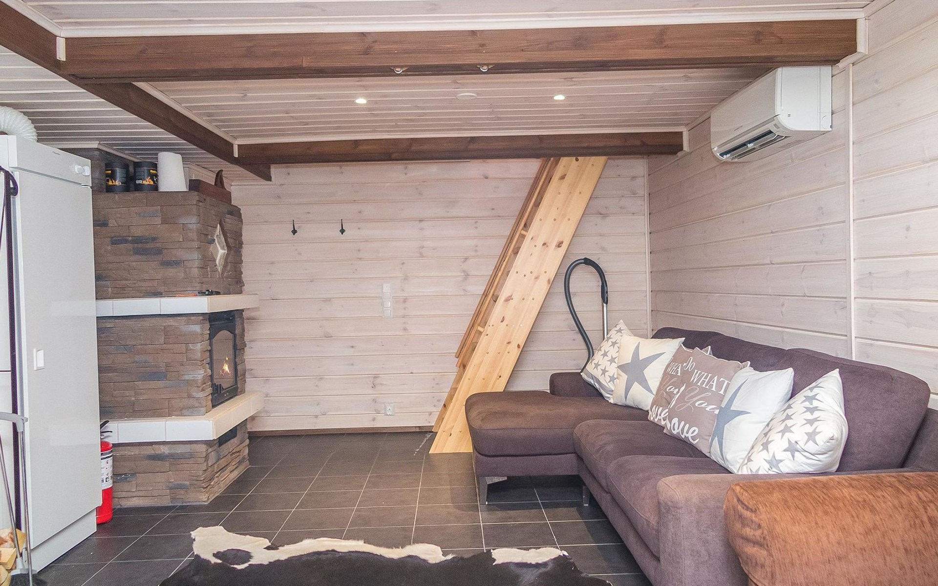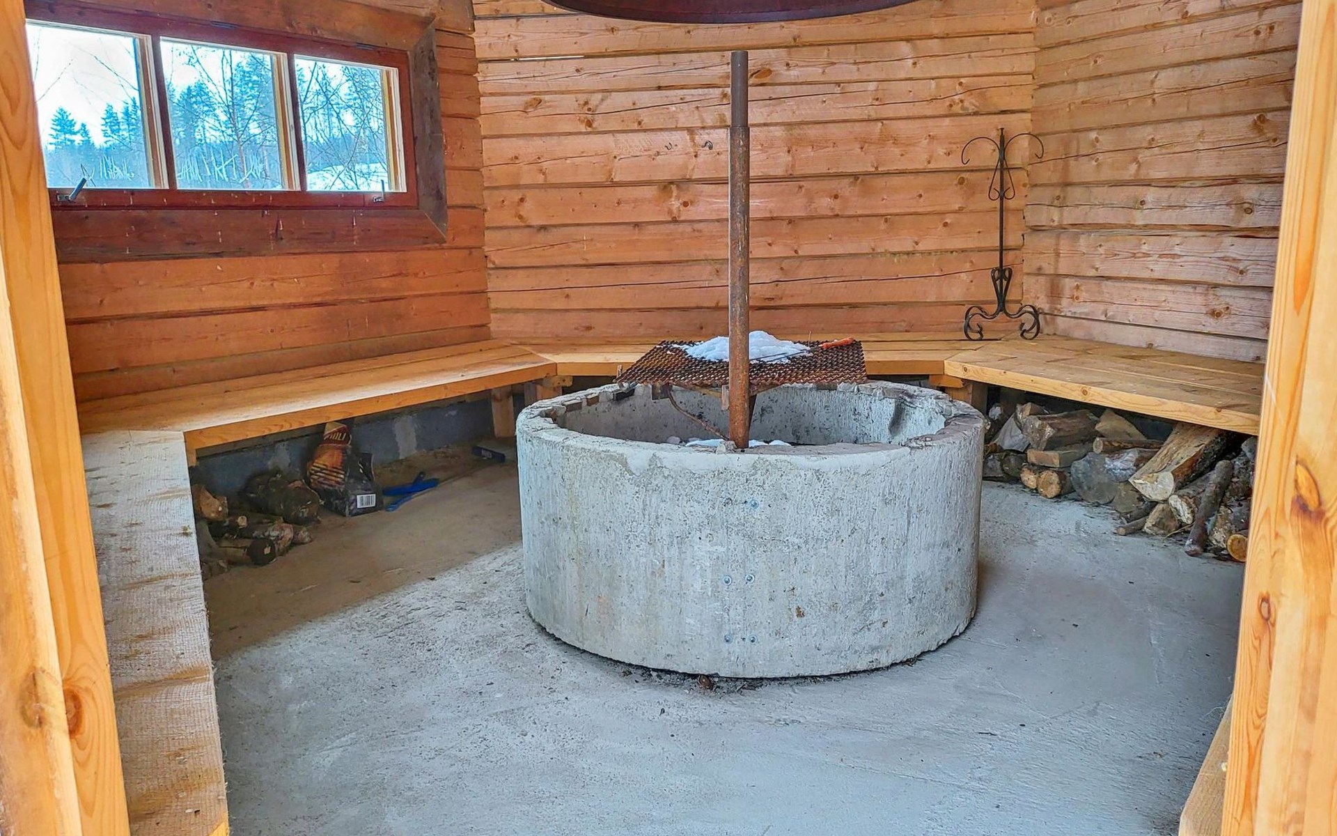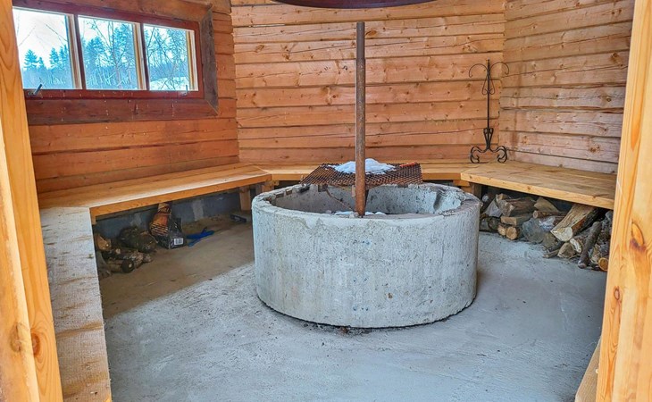 Downstairs living room with fireplace, washroom (2 showers and another toilet), sauna with wood-burning stove. There are steep stairs to the ground floor, but the ground floor can also be reached by turning around from the outside.