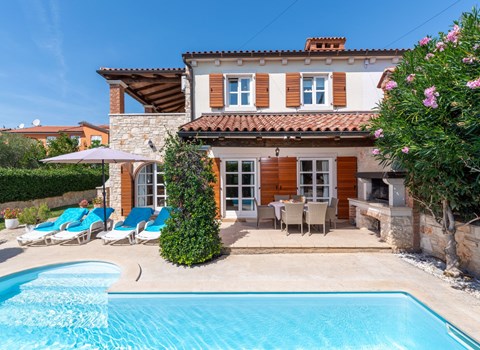 Gornja Hlapa 2 km from Dobrinj: Single-family house "Ivana", 3 storeys, built in 2018. 3 km from the centre of Solin, 5 km from the centre of Klimno, 12.5 km from the centre of Malinska, in a quiet, sunny position, 2.5 km from the sea, 2.5 km from the beach, in a cul-de-sac. Private: property 580 m2 (fenced) with wildlife garden, swimming pool angular, heated (8 x 4 m, depth 140 cm, seasonal availability: 01.May. - 15.Oct.) with internal staircase. Outdoor shower. In the house: internet access, sauna, burglar alarm system, washing machine. Parking (for 3 cars) at the house on the premises. Shop 950 m, supermarket 11 km, restaurant 950 m, bus stop 5.2 km, pebble beach 2.5 km, concrete beach 2.5 km. Groups of teenagers on request only. By groups of young people double deposit is requested on arrival. Swimming pool heated (extra).