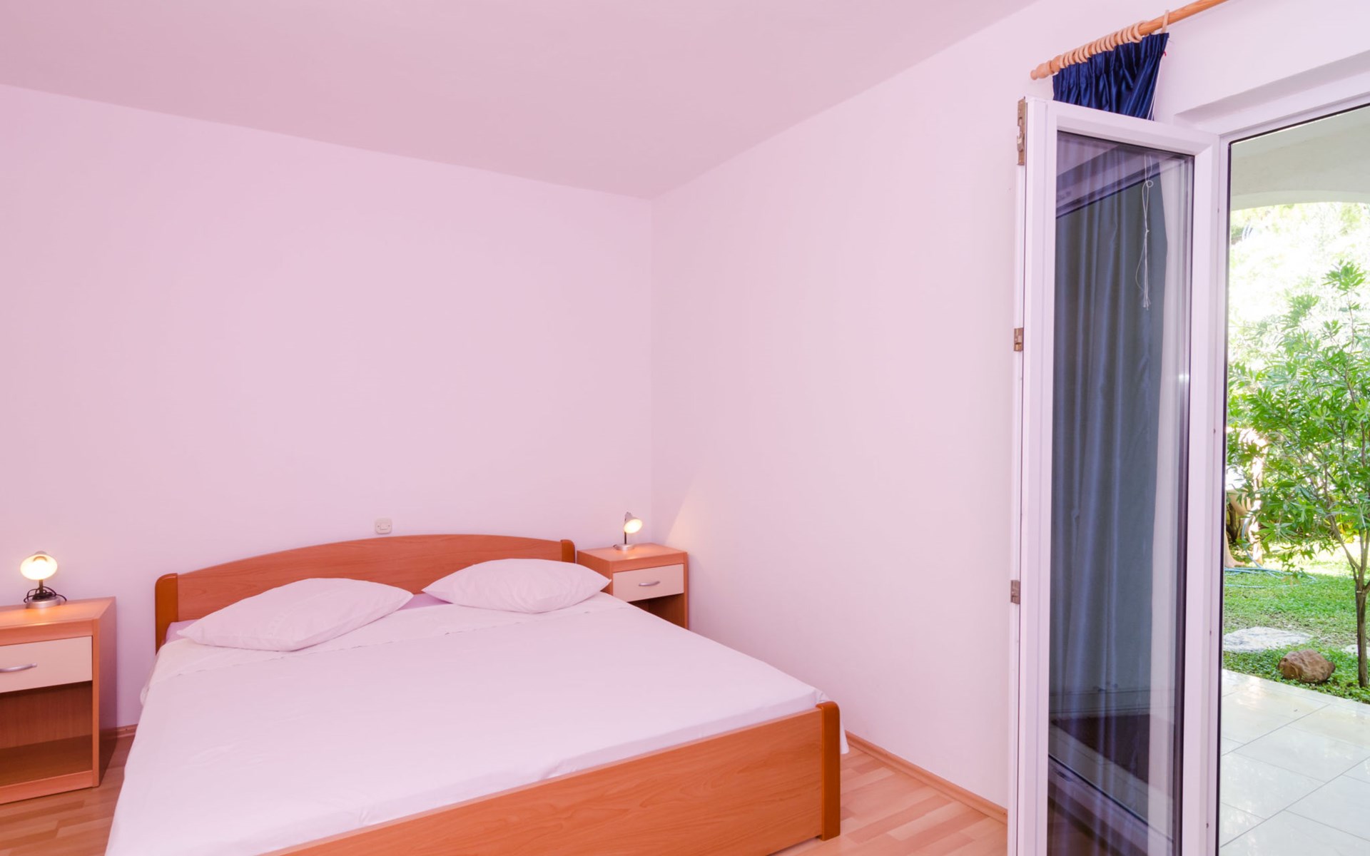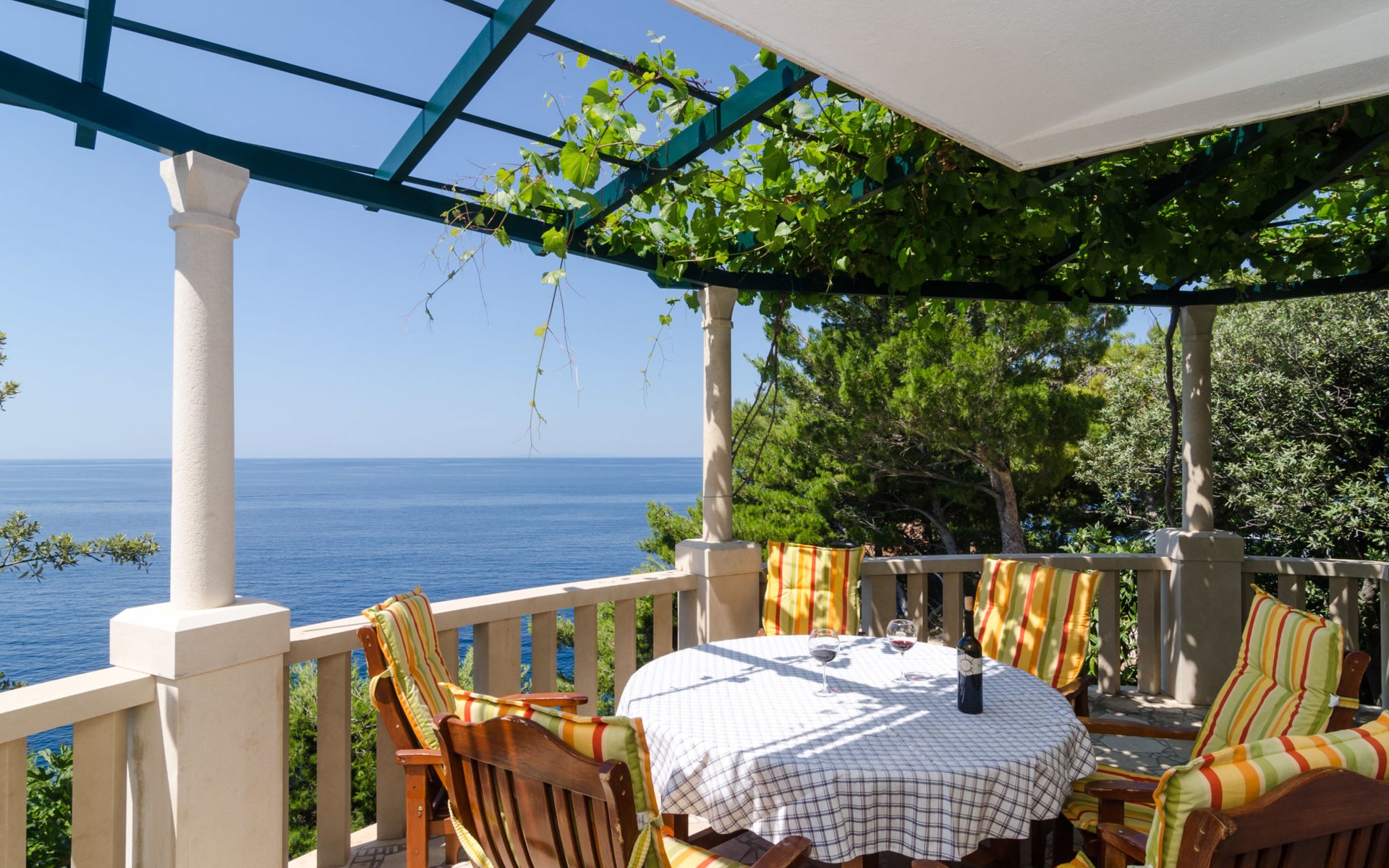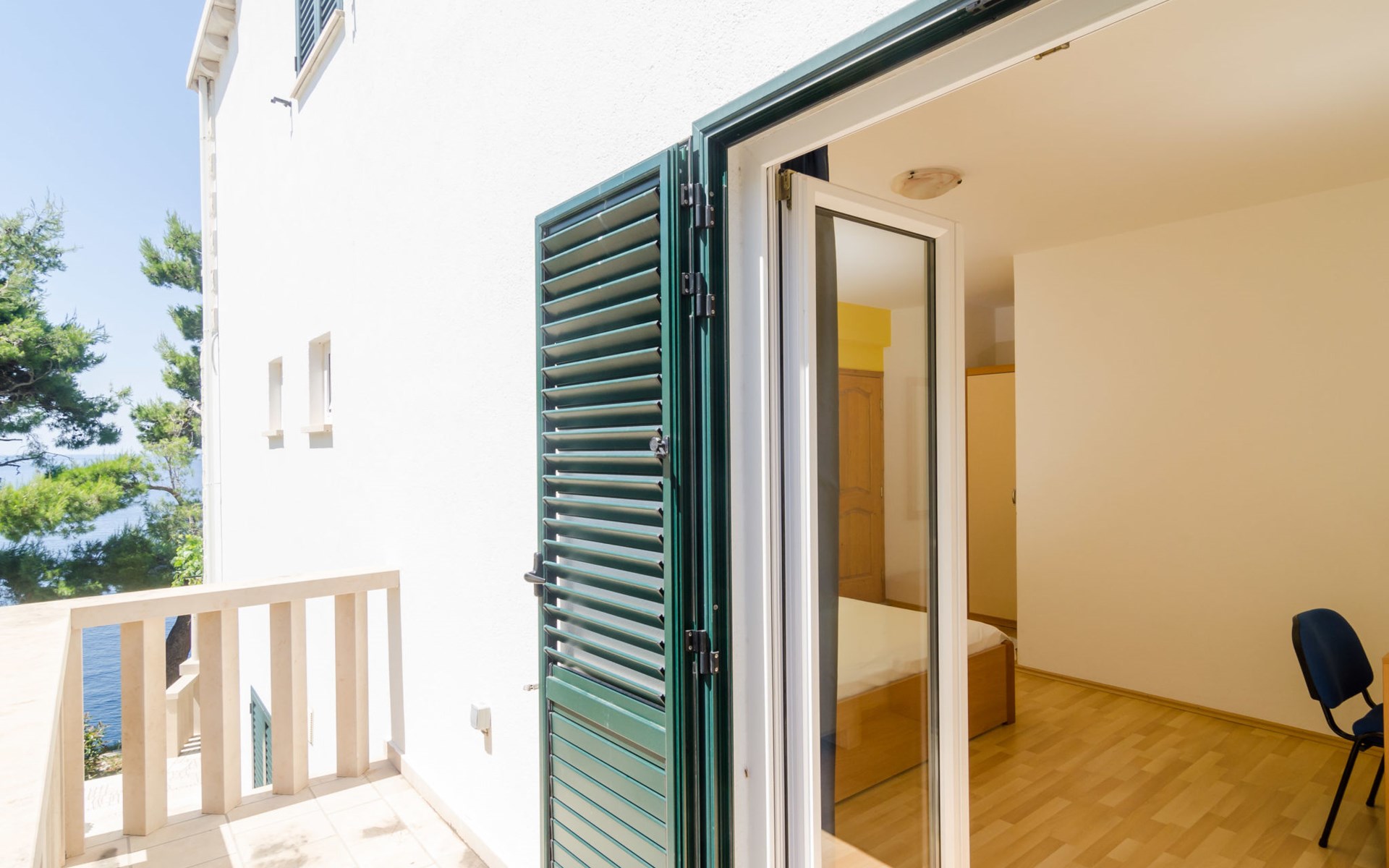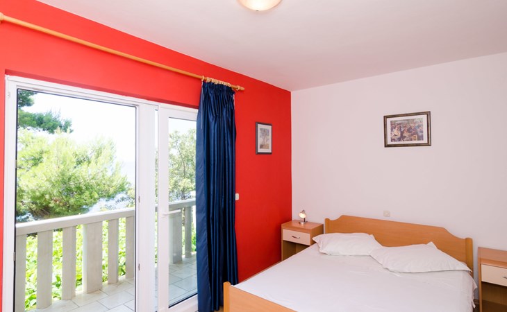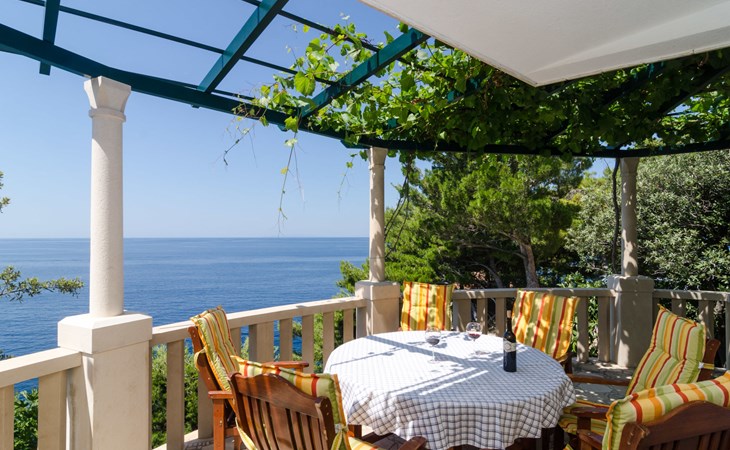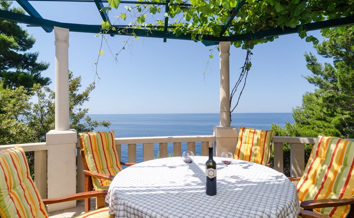 Dingač - Borak 5 km from Trstenik: Beautiful apartment house "Plavac Mali". Outside the resort, 4 km from the centre of Potomje, in a quiet, sunny position on a slope, 30 m from the sea, 30 m from the beach, in a cul-de-sac, in the countryside, south facing position. For shared use: outdoor shower, barbecue. In the house: internet access. Parking at the house on the premises. Shop 4 km, restaurant 30 m, bus stop 4.2 km, pebble beach 130 m, rocky beach 30 m. The restaurant 30m from the house opened from 20.06. - 01.09. Further restaurant in Trstenik, 5km from the house. In Borak renting of diving equipement and boat diving excursions. In Žuljana diving school, 24 km from Borak.