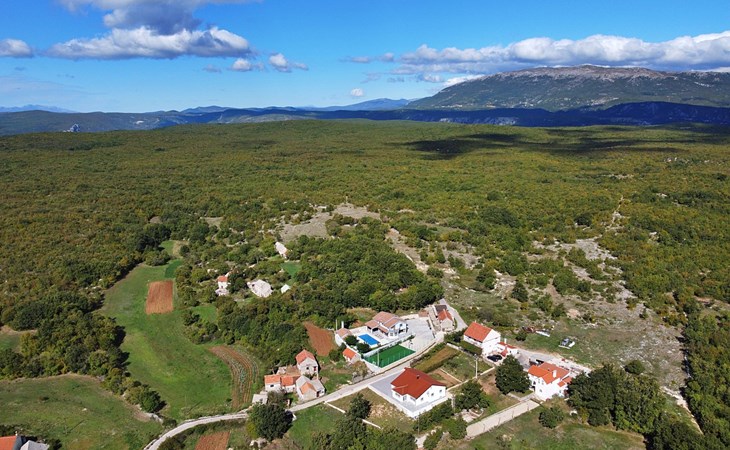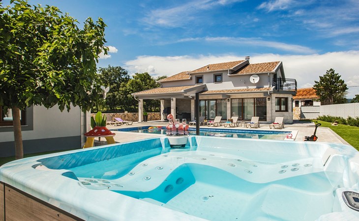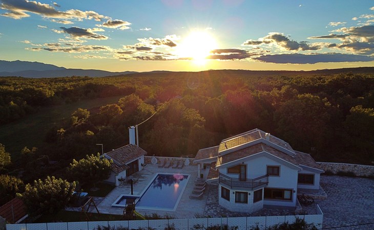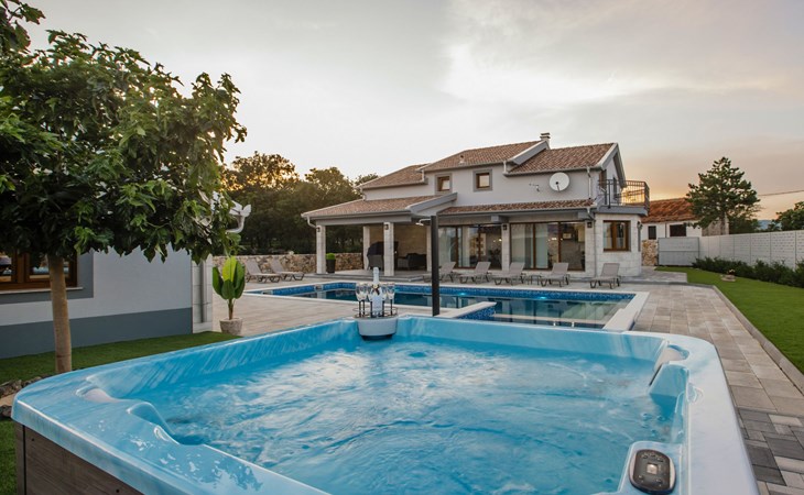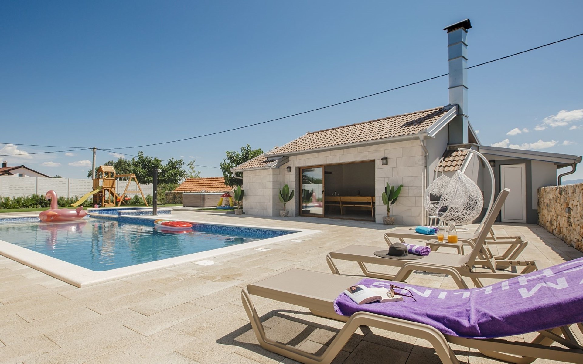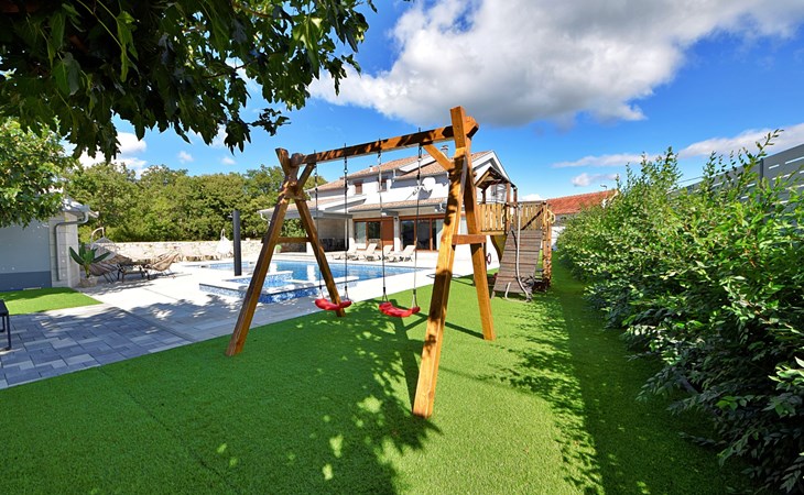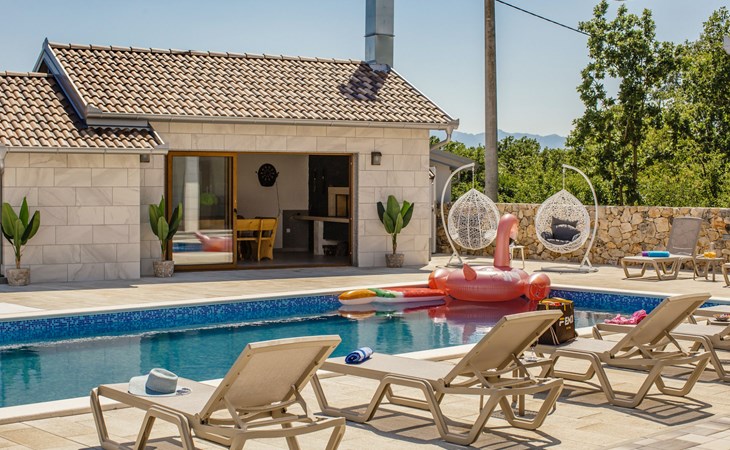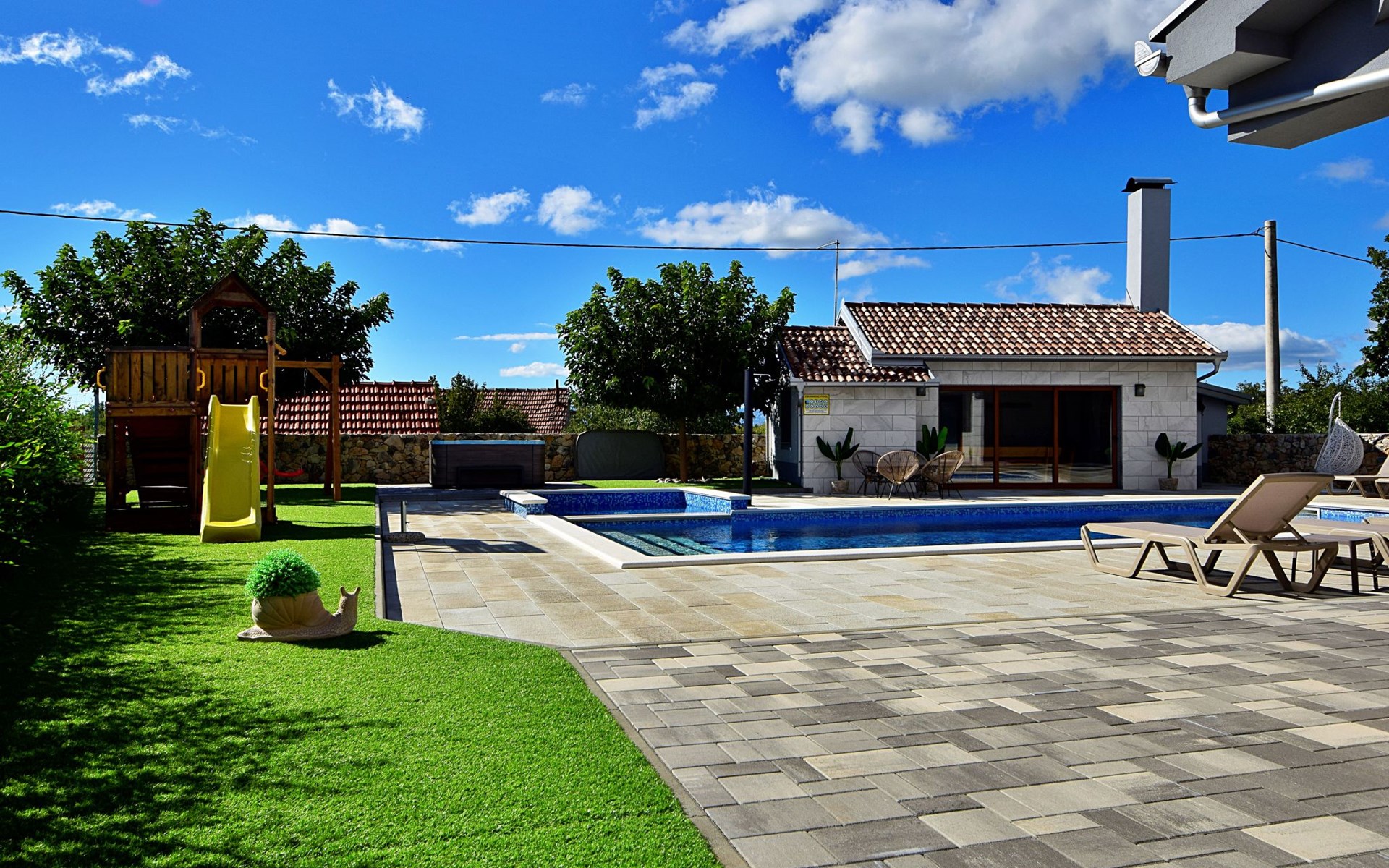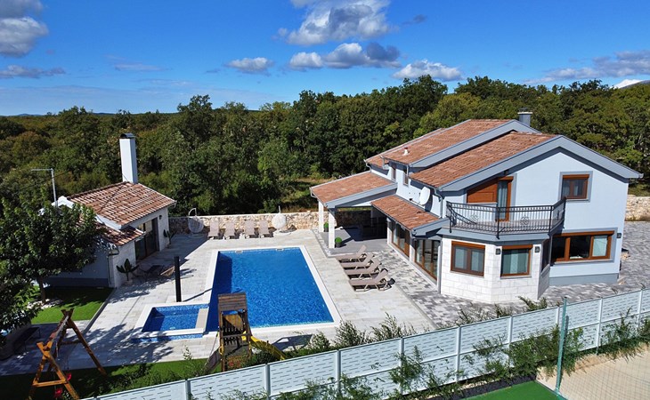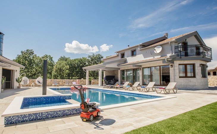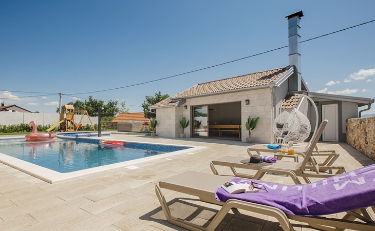 Gornji Proložac 6 km from Imotski: Child friendly, modern, beautiful villa "Oasis of peace", 2 storeys, built in 2019. In a quiet, sunny position, 38 km from the sea. Private: property 1'370 m2 (fenced), swimming pool angular, heated (12 x 5 m, depth 150 cm, seasonal availability: 01.May. - 01.Oct.) with internal staircase and salt-electrolysis pool-cleaning system. Paddling pool, outdoor shower, hot tub, pool house with fridge, WC and cooking stove, barbecue, children's playground (slide, swing). In the house: internet access, storage room for bicycles, washing machine. Available: bicycles. Parking (for 4 cars) at the house on the premises. Shop 6 km, restaurant 1 km, bus stop 7.3 km, pebble beach 38 km. Walking paths from the house 1 km, cycle lane 1 km. Well-known lakes can easily be reached: Modro jezero 1 km, Crveno jezero 1 km. Please note: suitable for families. The owner does not accept any youth groups. It is necessary to announce 7 days in advance if the pool heating is required. Pool house: kitchen with dining table and satellite TV. Private: small football playground (included).