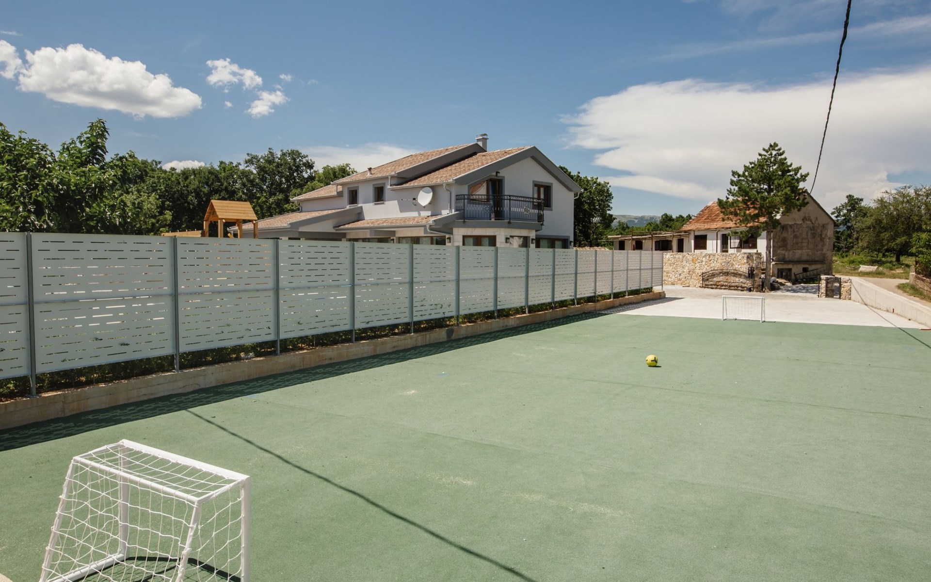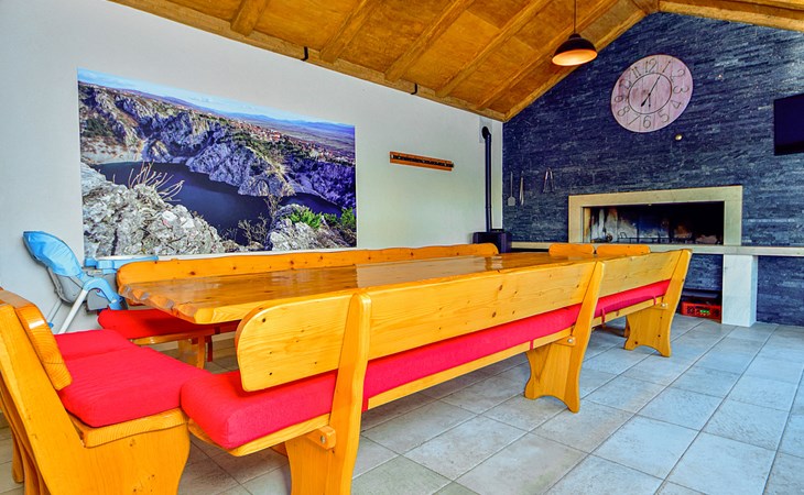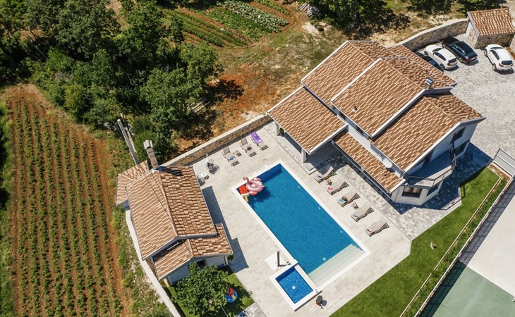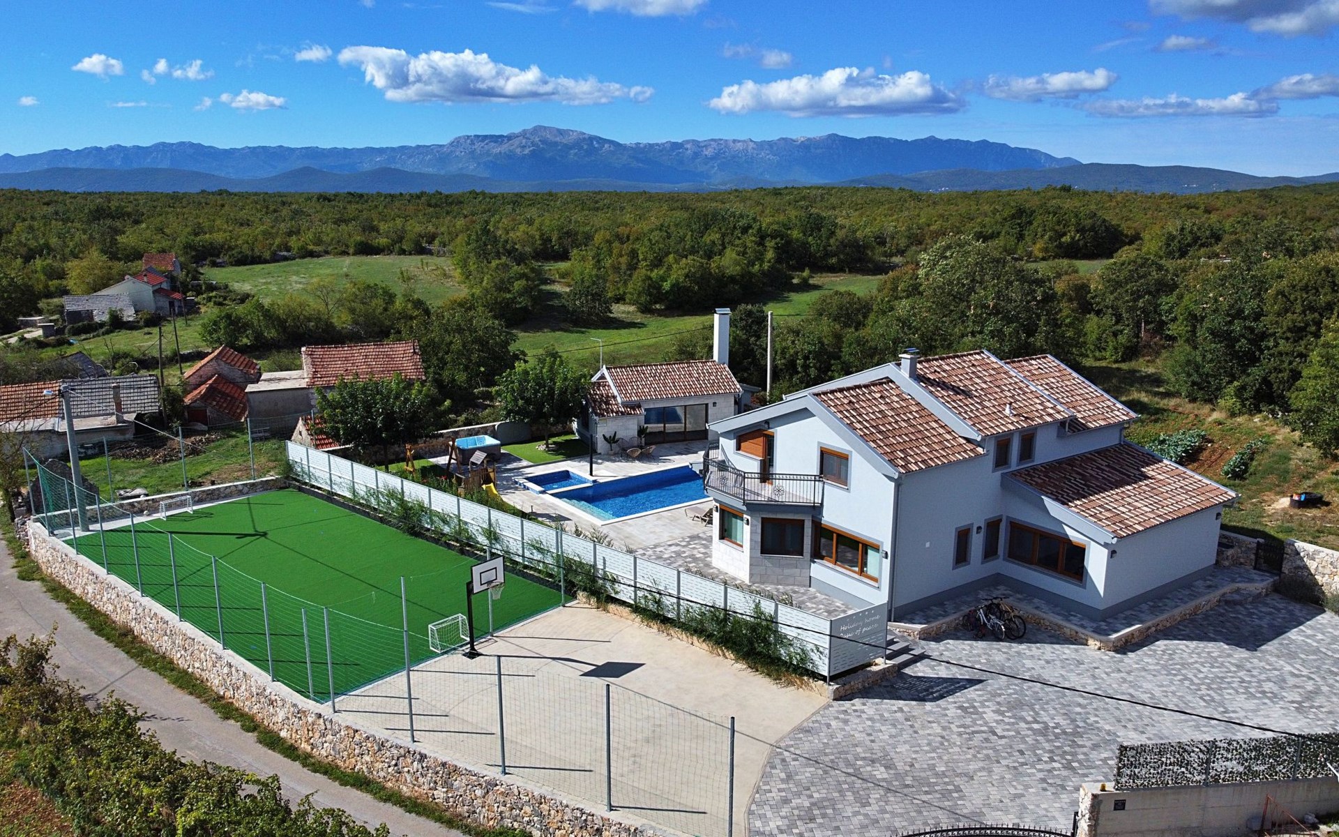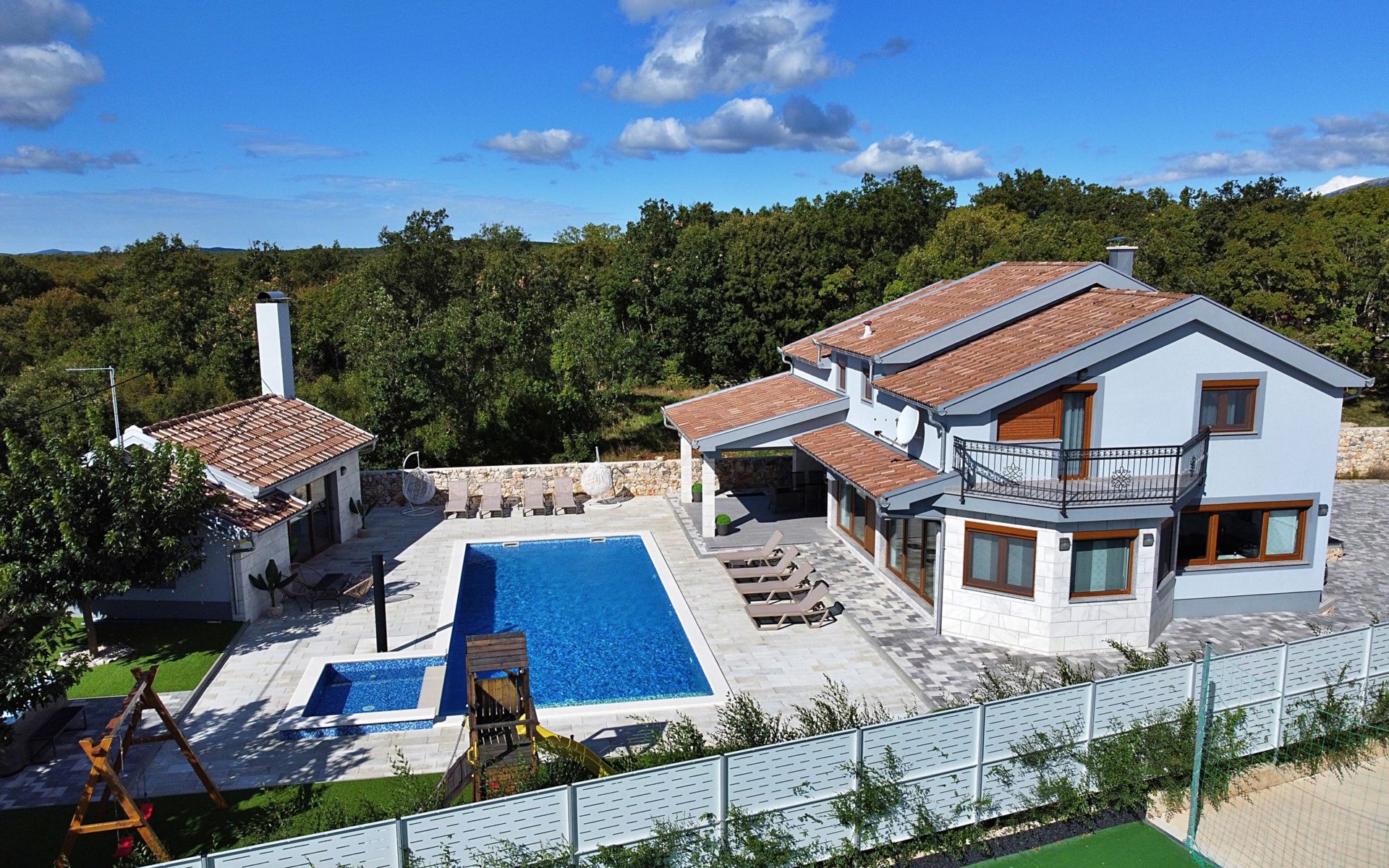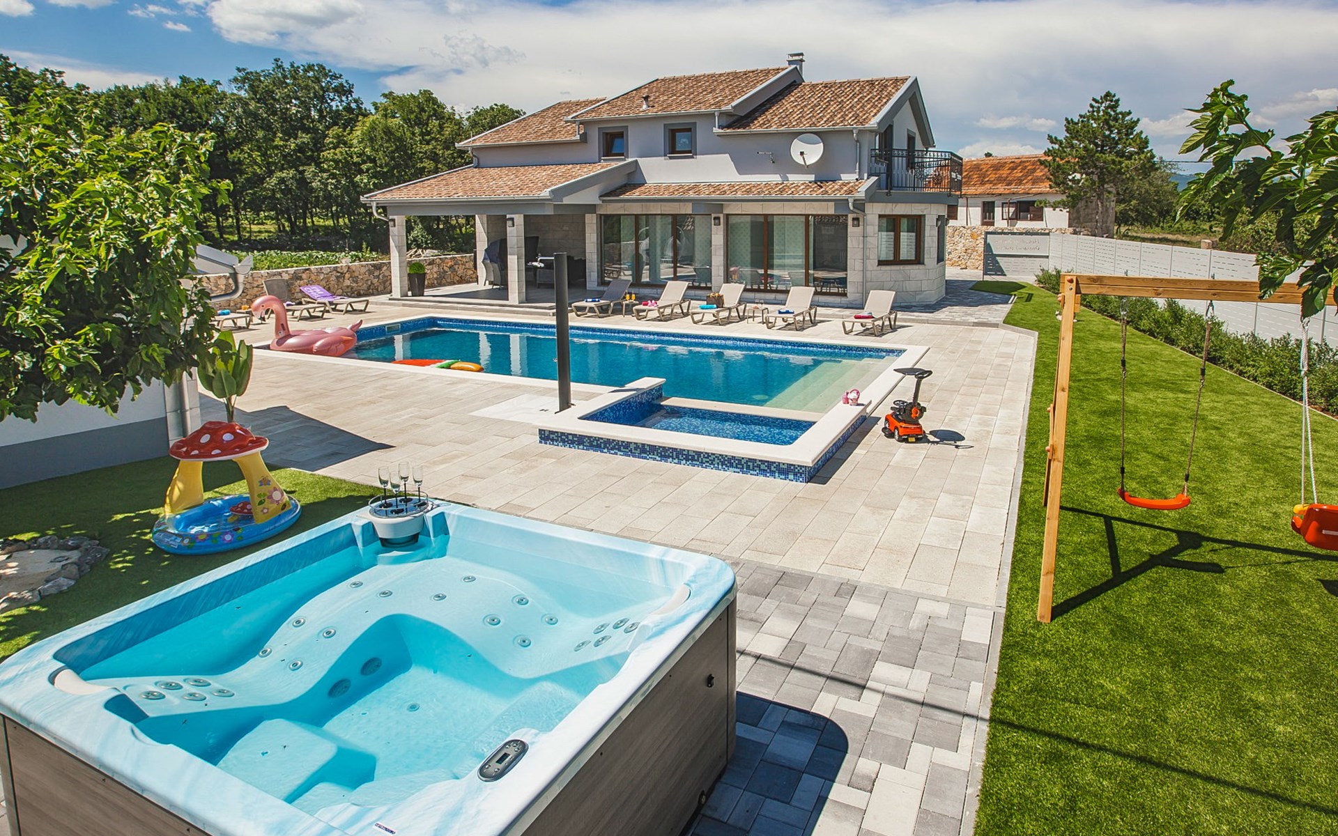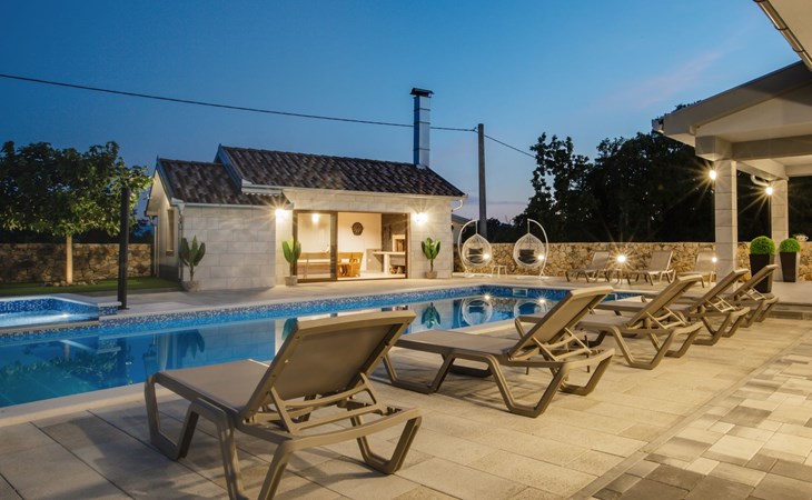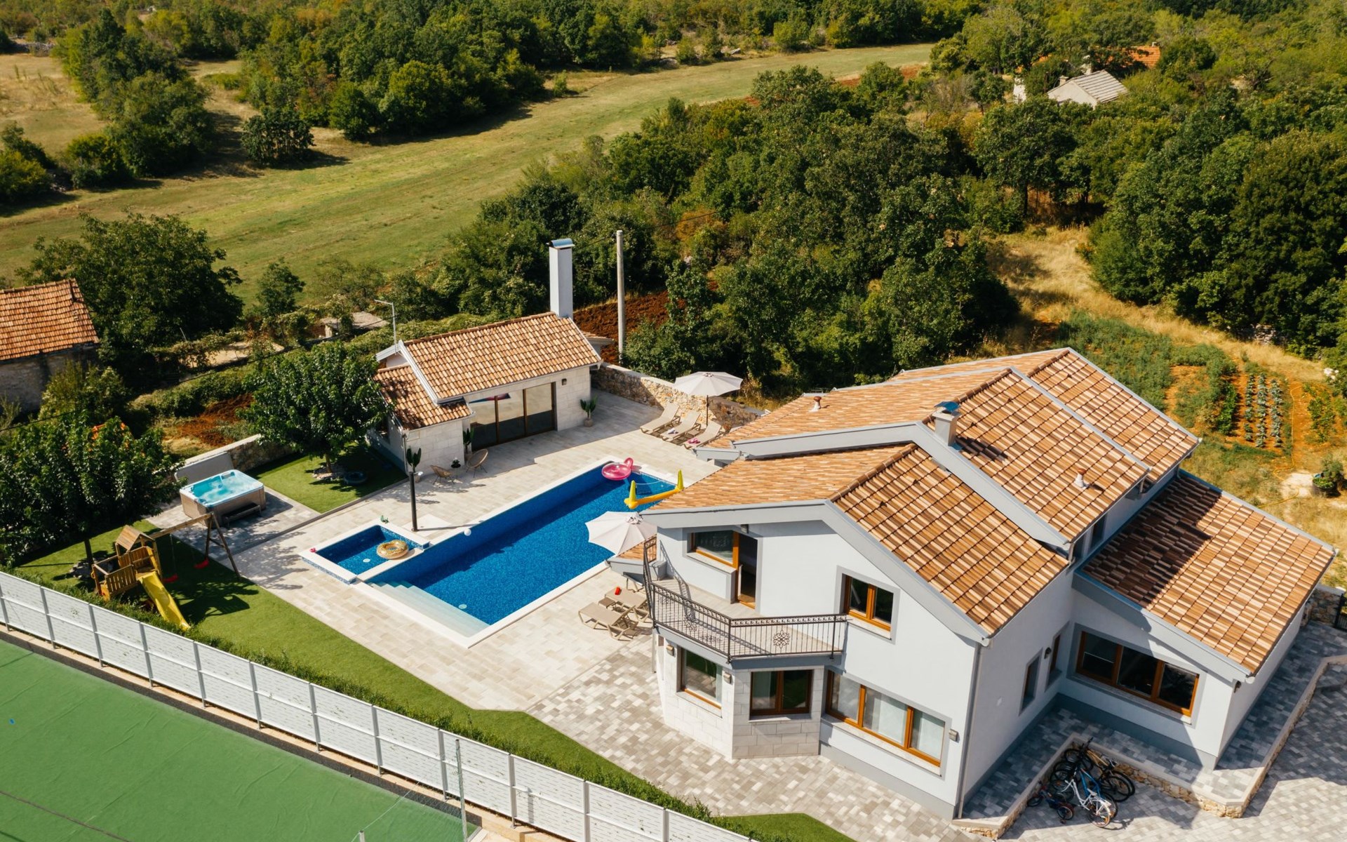 Gornji Proložac 6 km from Imotski: Child friendly, modern, beautiful villa "Oasis of peace", 2 storeys, built in 2019. In a quiet, sunny position, 38 km from the sea. Private: property 1'370 m2 (fenced), swimming pool angular, heated (12 x 5 m, depth 150 cm, seasonal availability: 01.May. - 01.Oct.) with internal staircase and salt-electrolysis pool-cleaning system. Paddling pool, outdoor shower, hot tub, pool house with fridge, WC and cooking stove, barbecue, children's playground (slide, swing). In the house: internet access, storage room for bicycles, washing machine. Available: bicycles. Parking (for 4 cars) at the house on the premises. Shop 6 km, restaurant 1 km, bus stop 7.3 km, pebble beach 38 km. Walking paths from the house 1 km, cycle lane 1 km. Well-known lakes can easily be reached: Modro jezero 1 km, Crveno jezero 1 km. Please note: suitable for families. The owner does not accept any youth groups. It is necessary to announce 7 days in advance if the pool heating is required. Pool house: kitchen with dining table and satellite TV. Private: small football playground (included).