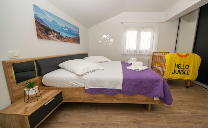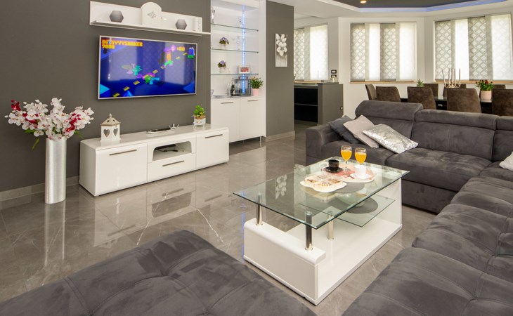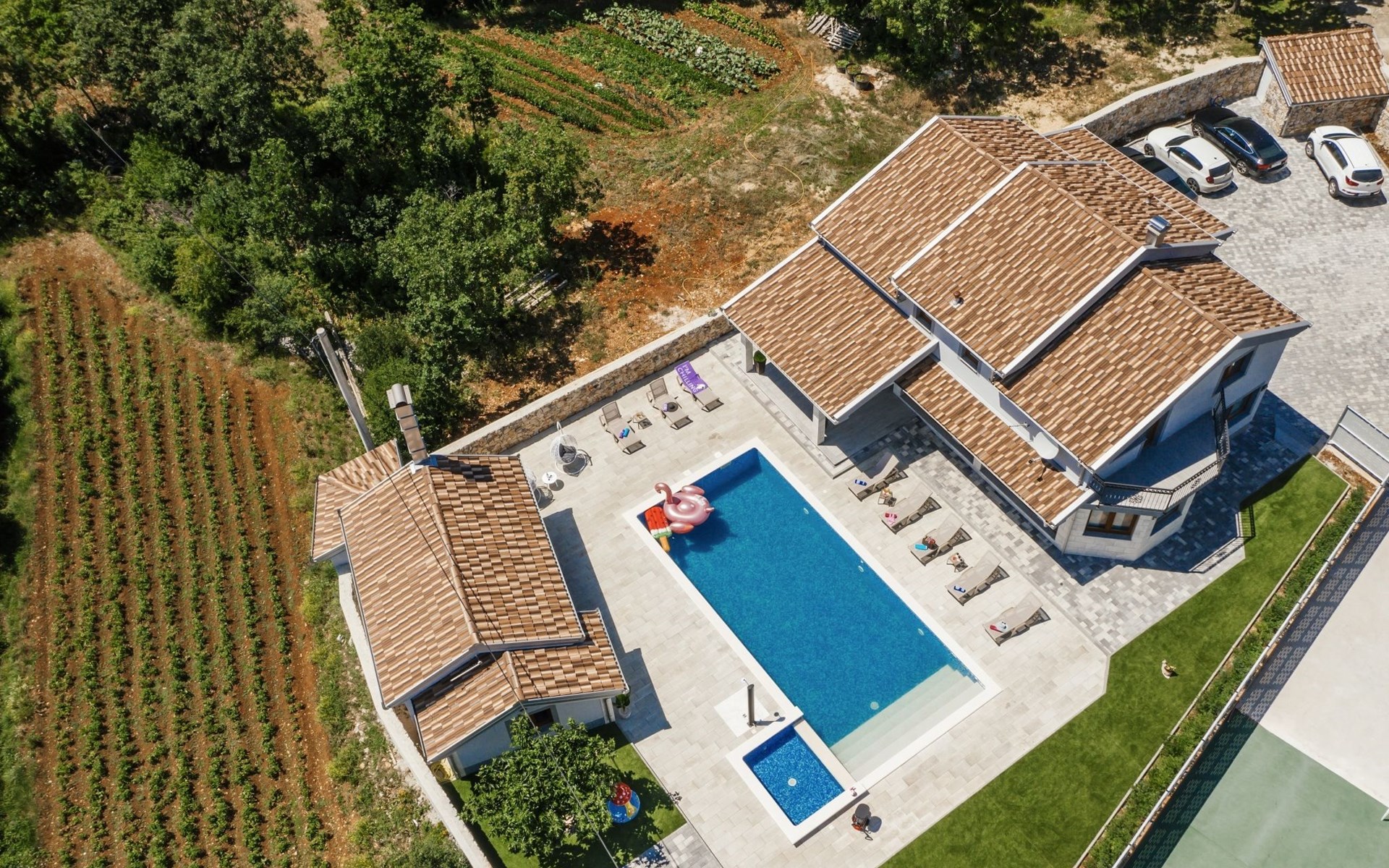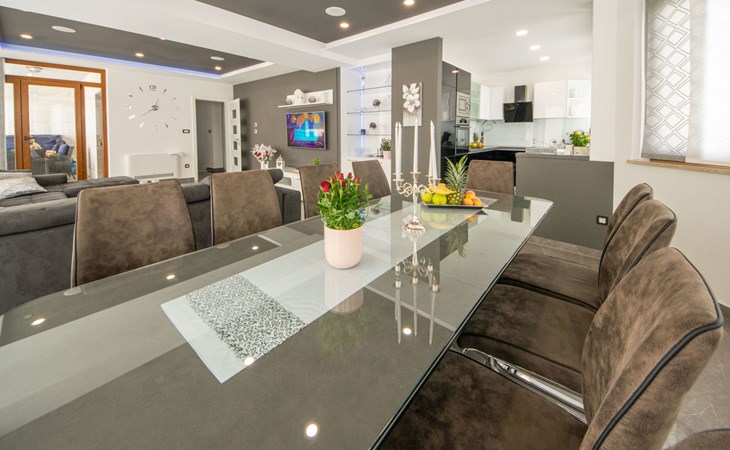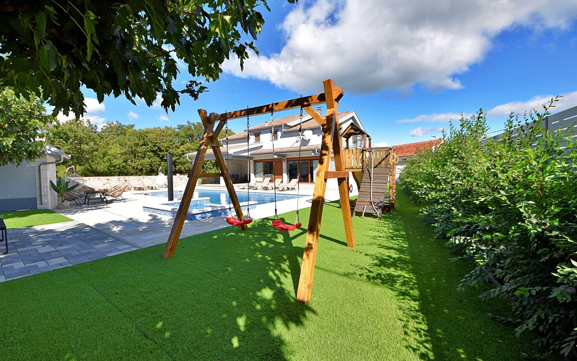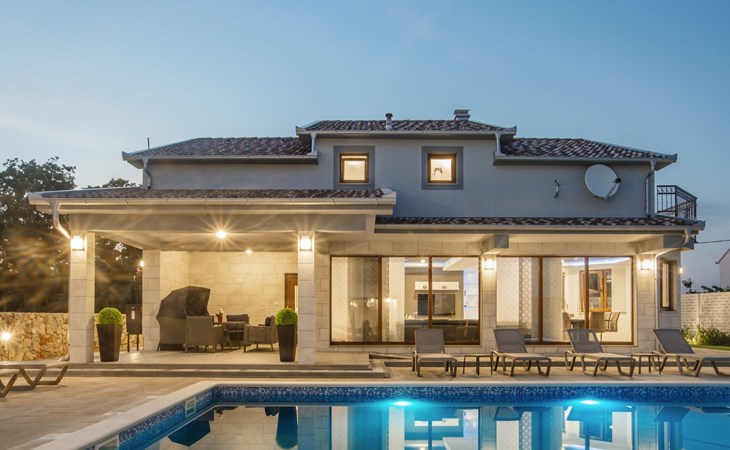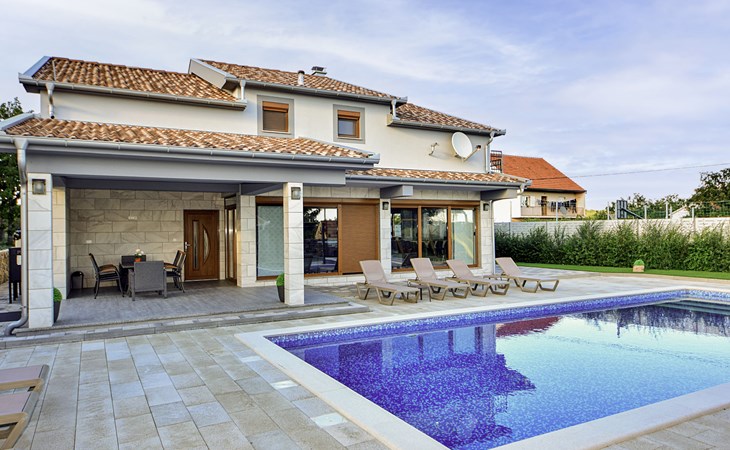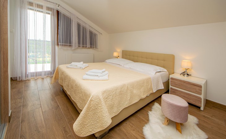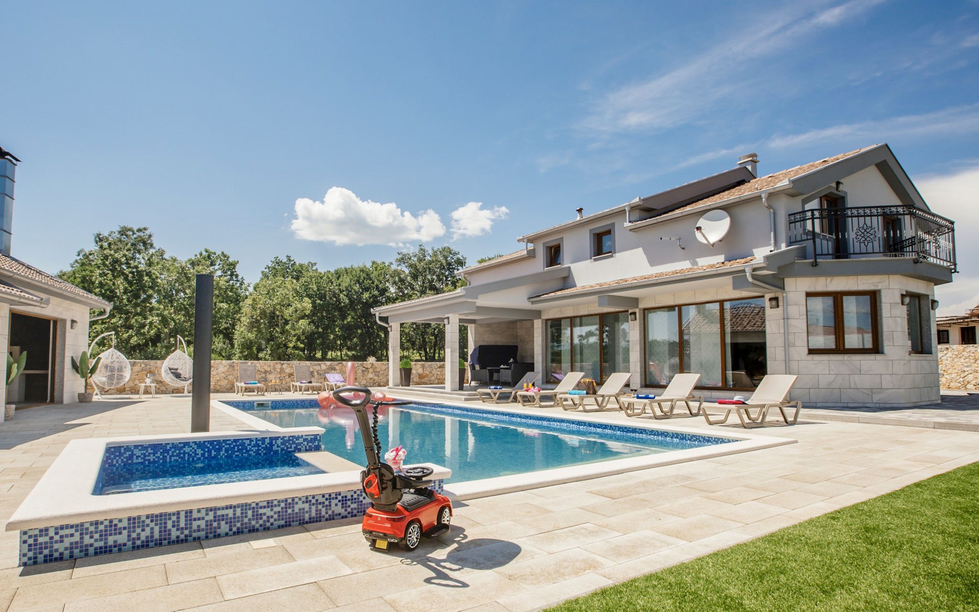 Gornji Proložac 6 km from Imotski: Child friendly, modern, beautiful villa "Oasis of peace", 2 storeys, built in 2019. In a quiet, sunny position, 38 km from the sea. Private: property 1'370 m2 (fenced), swimming pool angular, heated (12 x 5 m, depth 150 cm, seasonal availability: 01.May. - 01.Oct.) with internal staircase and salt-electrolysis pool-cleaning system. Paddling pool, outdoor shower, hot tub, pool house with fridge, WC and cooking stove, barbecue, children's playground (slide, swing). In the house: internet access, storage room for bicycles, washing machine. Available: bicycles. Parking (for 4 cars) at the house on the premises. Shop 6 km, restaurant 1 km, bus stop 7.3 km, pebble beach 38 km. Walking paths from the house 1 km, cycle lane 1 km. Well-known lakes can easily be reached: Modro jezero 1 km, Crveno jezero 1 km. Please note: suitable for families. The owner does not accept any youth groups. It is necessary to announce 7 days in advance if the pool heating is required. Pool house: kitchen with dining table and satellite TV. Private: small football playground (included).