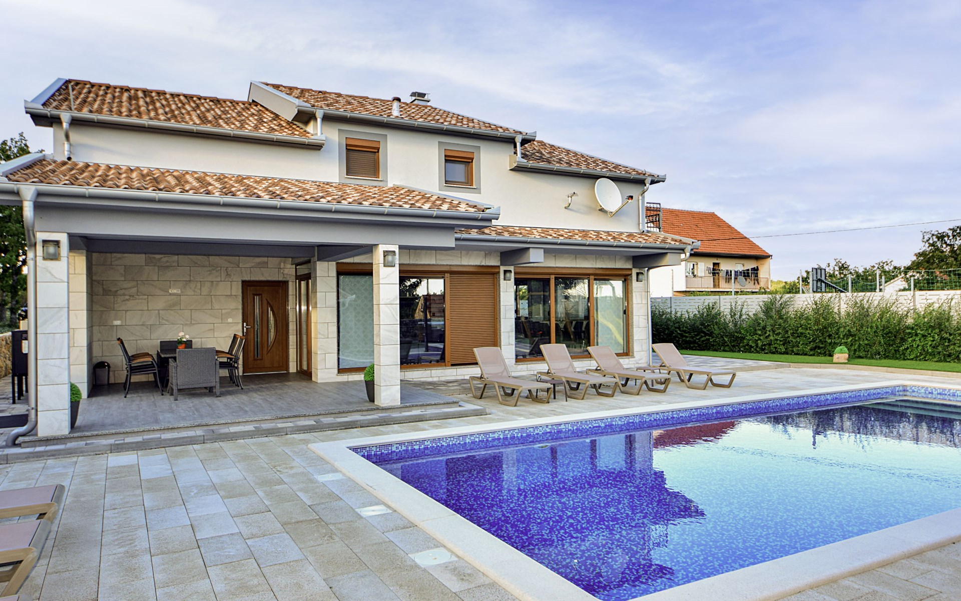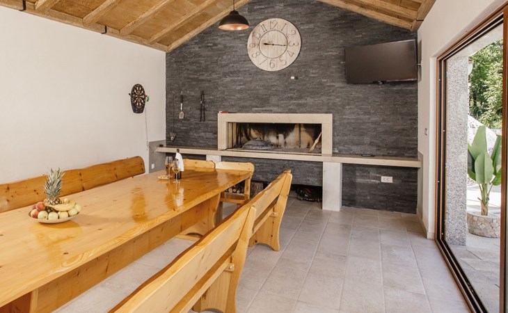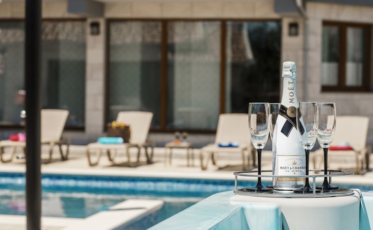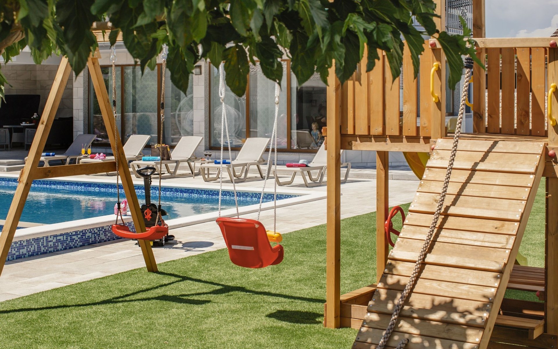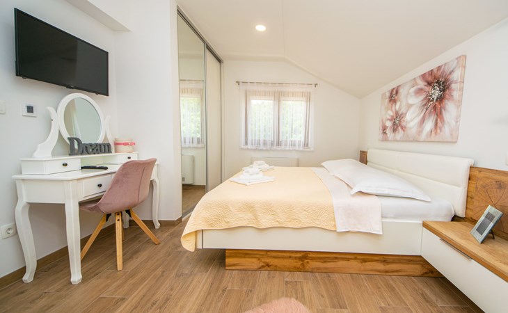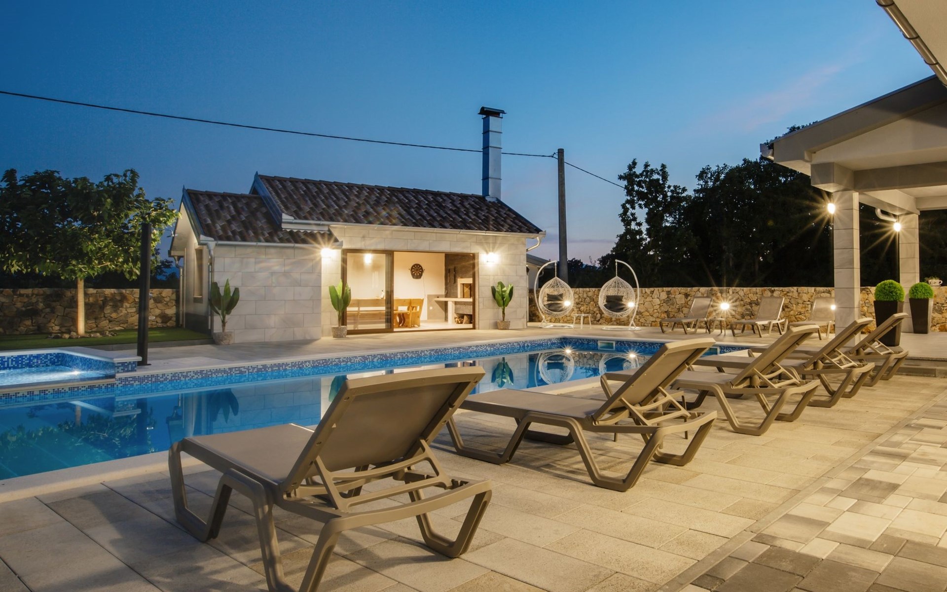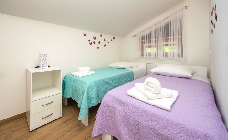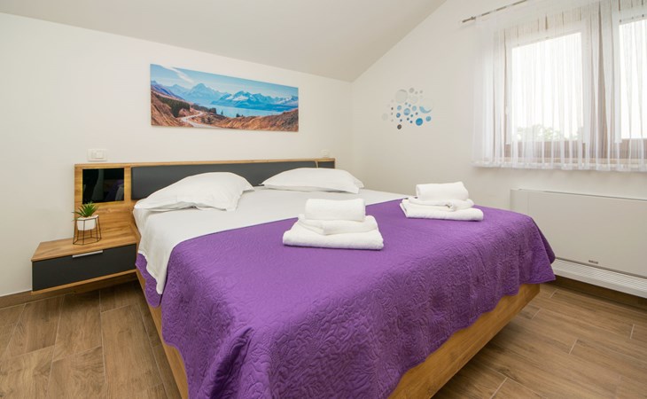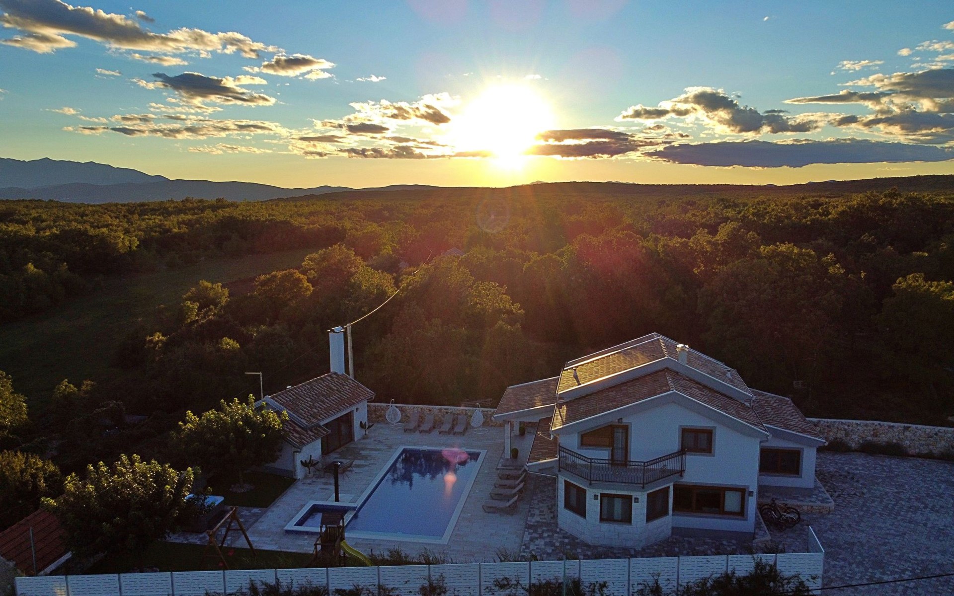Gornji Proložac 6 km from Imotski: Child friendly, modern, beautiful villa "Oasis of peace", 2 storeys, built in 2019. In a quiet, sunny position, 38 km from the sea. Private: property 1'370 m2 (fenced), swimming pool angular, heated (12 x 5 m, depth 150 cm, seasonal availability: 01.May. - 01.Oct.) with internal staircase and salt-electrolysis pool-cleaning system. Paddling pool, outdoor shower, hot tub, pool house with fridge, WC and cooking stove, barbecue, children's playground (slide, swing). In the house: internet access, storage room for bicycles, washing machine. Available: bicycles. Parking (for 4 cars) at the house on the premises. Shop 6 km, restaurant 1 km, bus stop 7.3 km, pebble beach 38 km. Walking paths from the house 1 km, cycle lane 1 km. Well-known lakes can easily be reached: Modro jezero 1 km, Crveno jezero 1 km. Please note: suitable for families. The owner does not accept any youth groups. It is necessary to announce 7 days in advance if the pool heating is required. Pool house: kitchen with dining table and satellite TV. Private: small football playground (included).