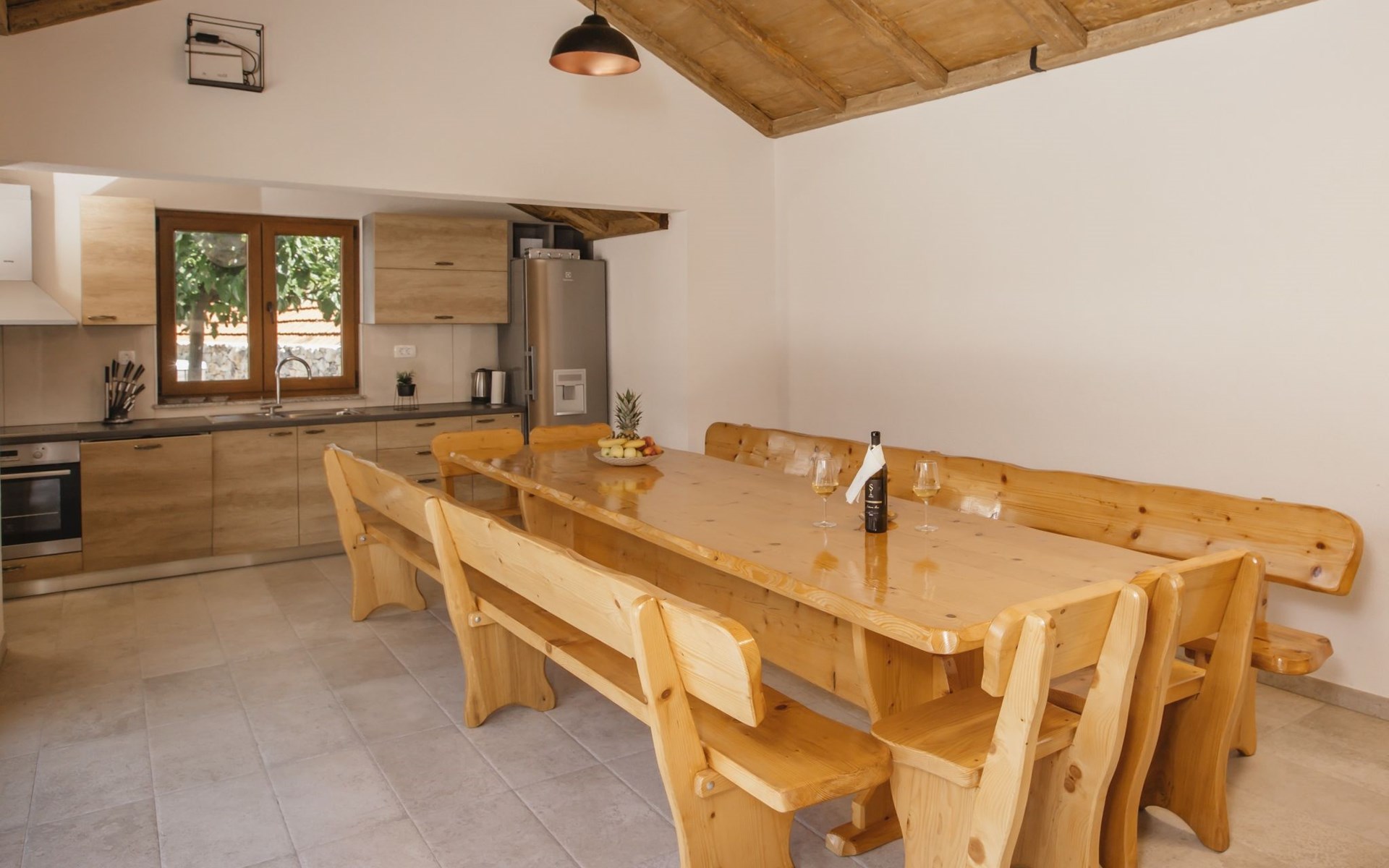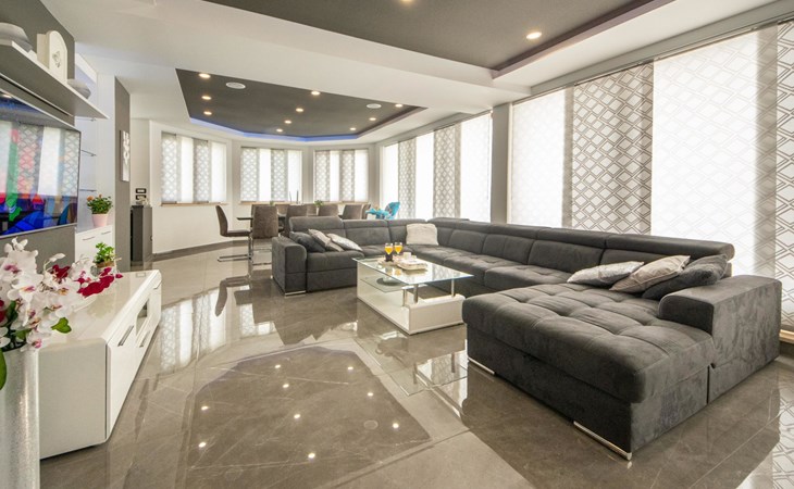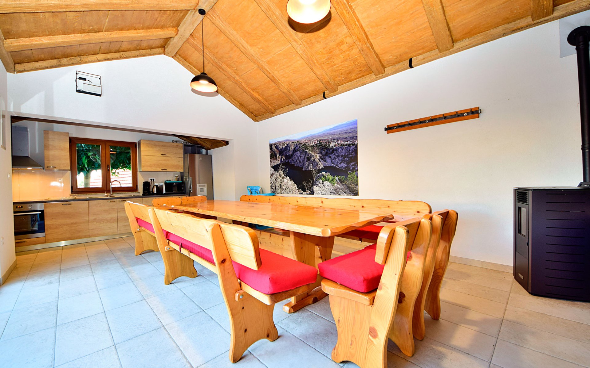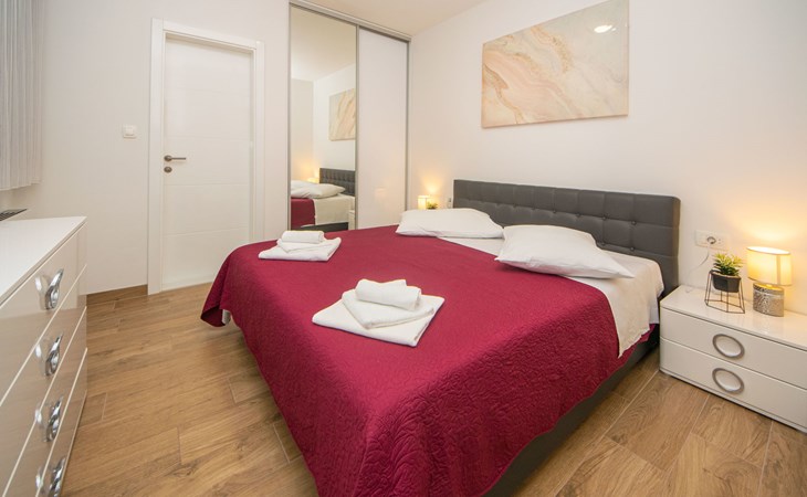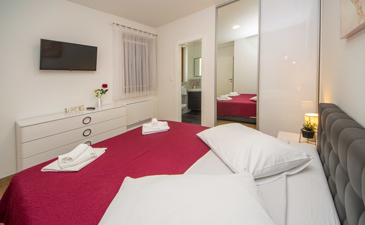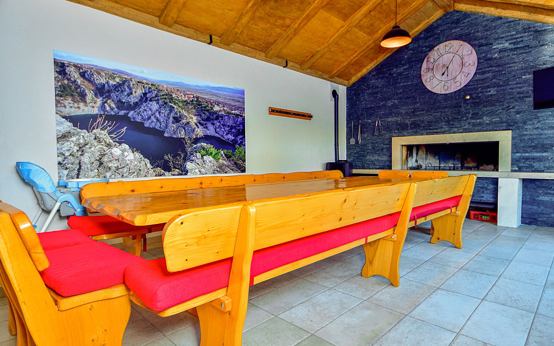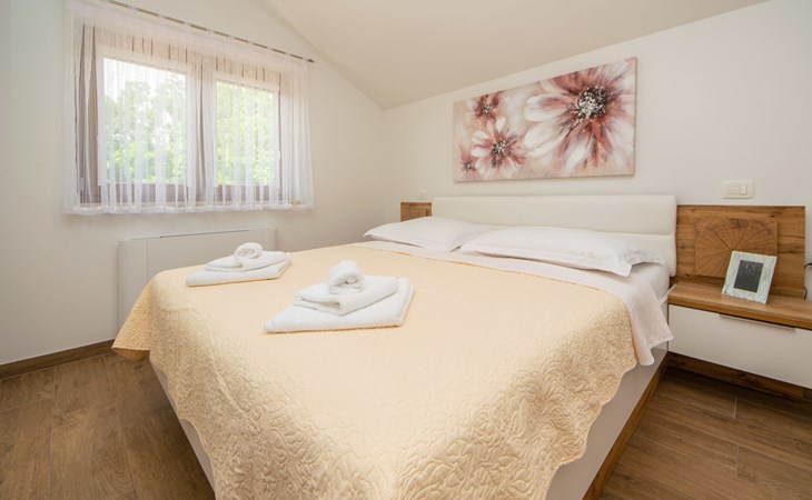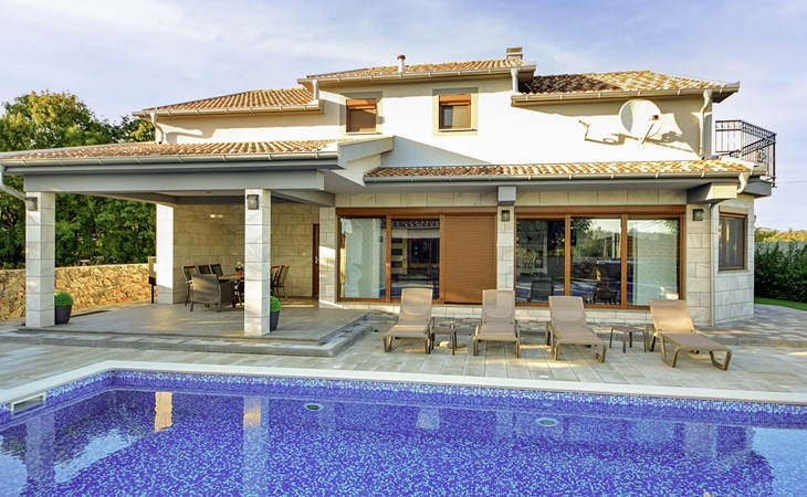 Gornji Proložac 6 km from Imotski: Child friendly, modern, beautiful villa "Oasis of peace", 2 storeys, built in 2019. In a quiet, sunny position, 38 km from the sea. Private: property 1'370 m2 (fenced), swimming pool angular, heated (12 x 5 m, depth 150 cm, seasonal availability: 01.May. - 01.Oct.) with internal staircase and salt-electrolysis pool-cleaning system. Paddling pool, outdoor shower, hot tub, pool house with fridge, WC and cooking stove, barbecue, children's playground (slide, swing). In the house: internet access, storage room for bicycles, washing machine. Available: bicycles. Parking (for 4 cars) at the house on the premises. Shop 6 km, restaurant 1 km, bus stop 7.3 km, pebble beach 38 km. Walking paths from the house 1 km, cycle lane 1 km. Well-known lakes can easily be reached: Modro jezero 1 km, Crveno jezero 1 km. Please note: suitable for families. The owner does not accept any youth groups. It is necessary to announce 7 days in advance if the pool heating is required. Pool house: kitchen with dining table and satellite TV. Private: small football playground (included).