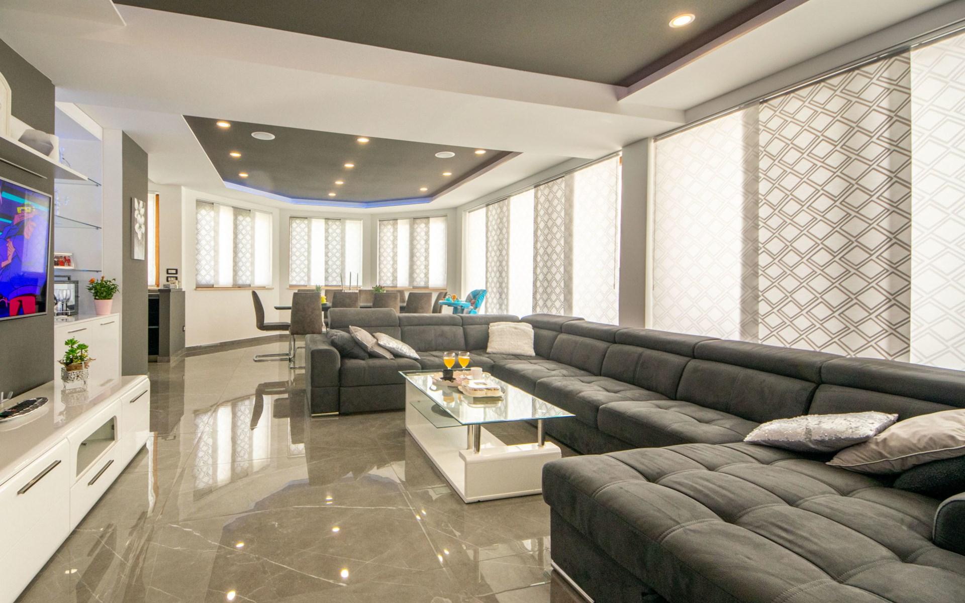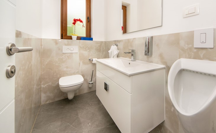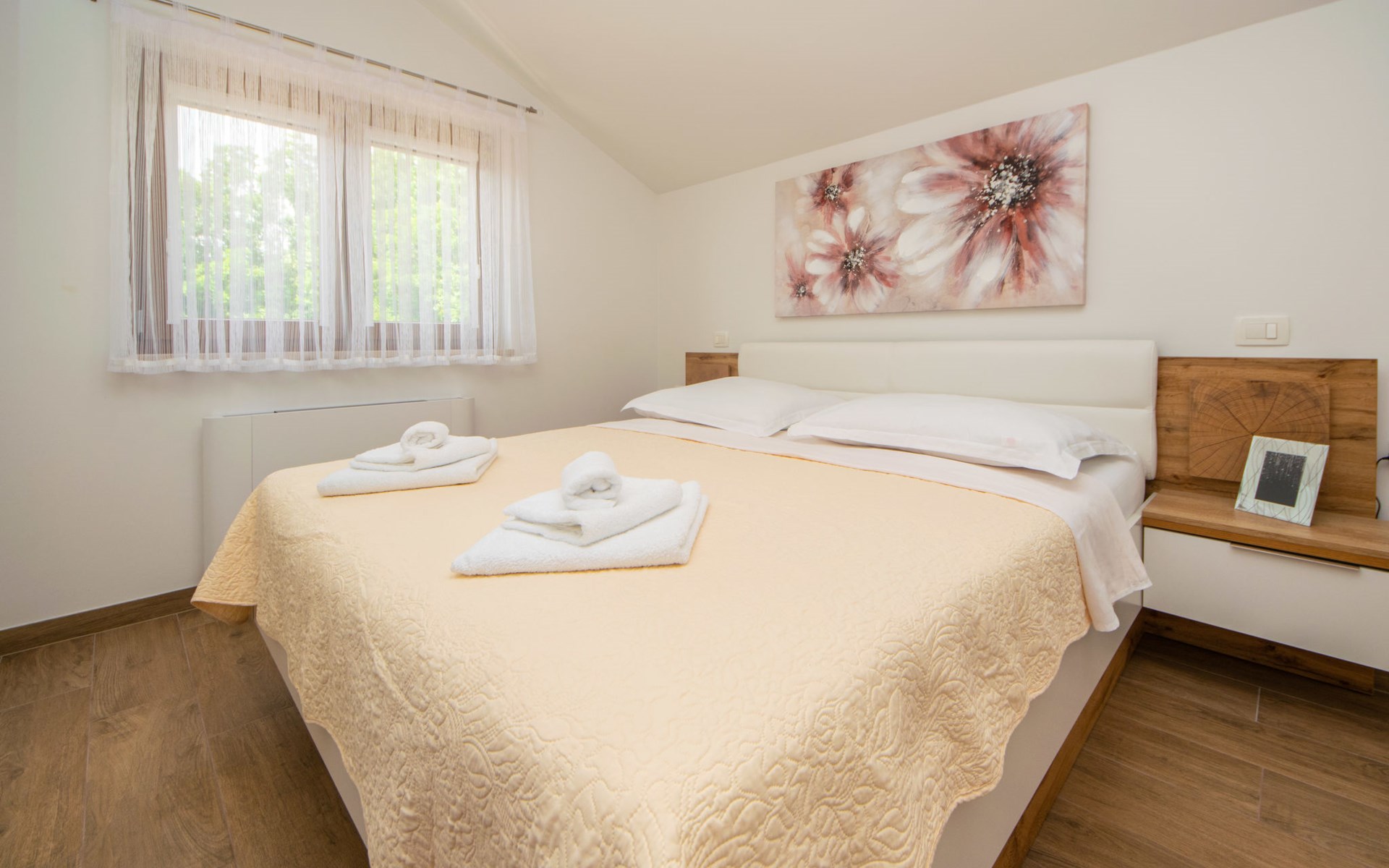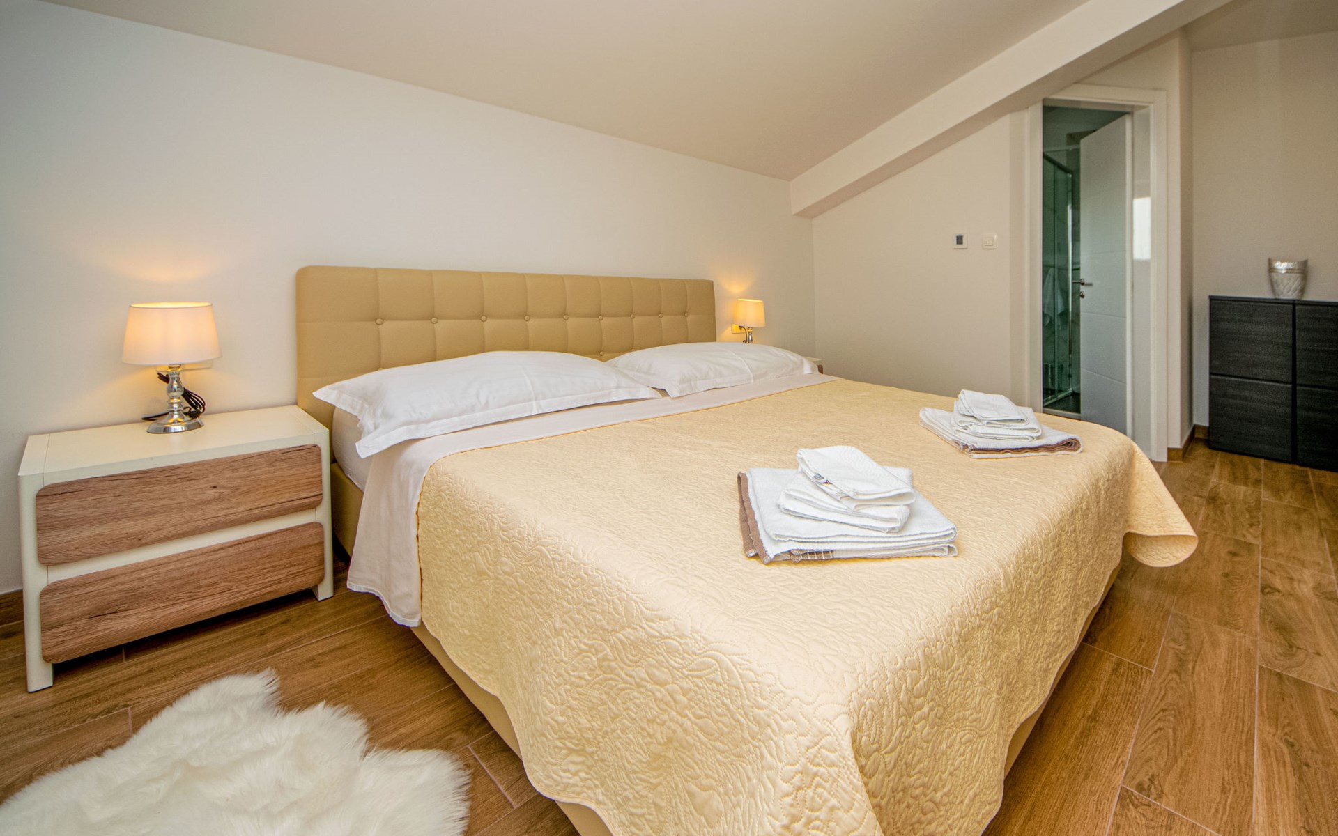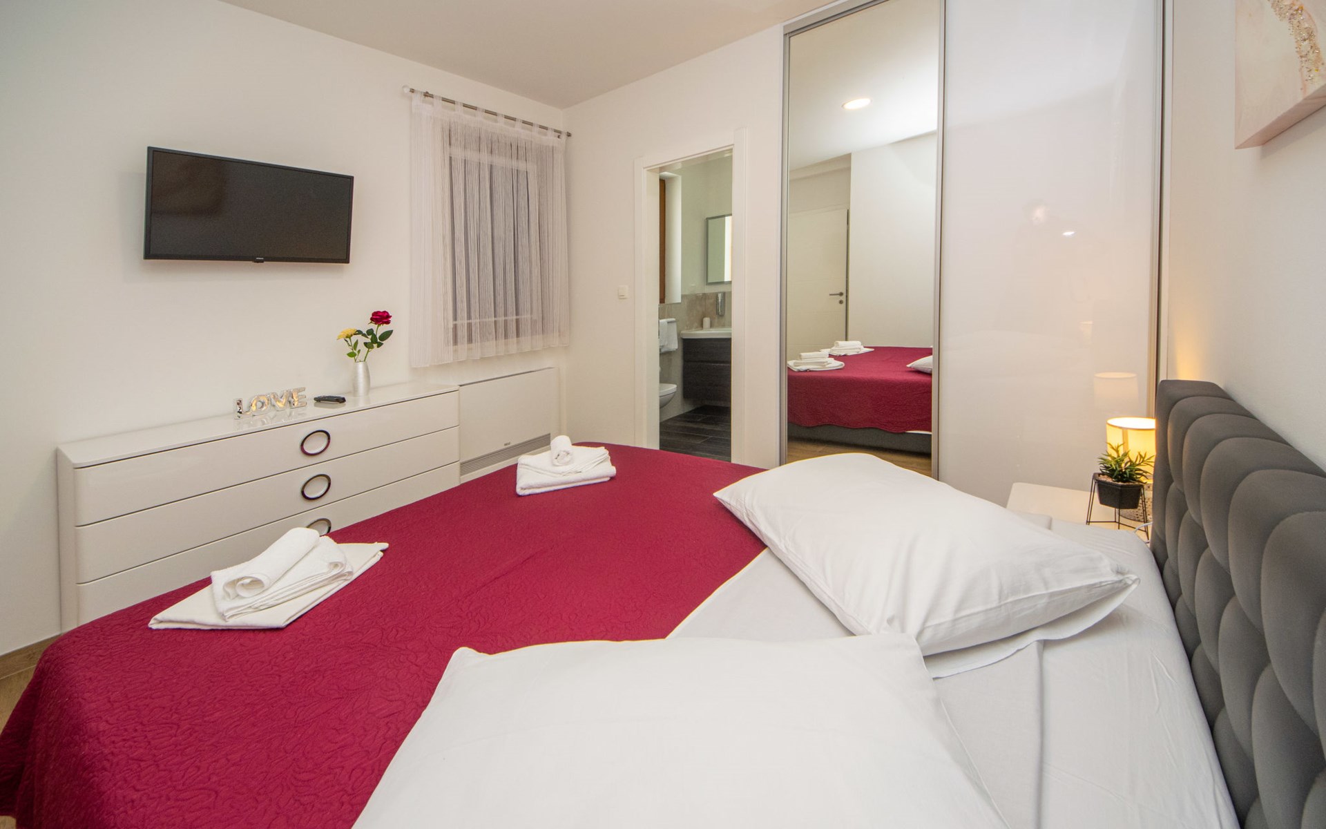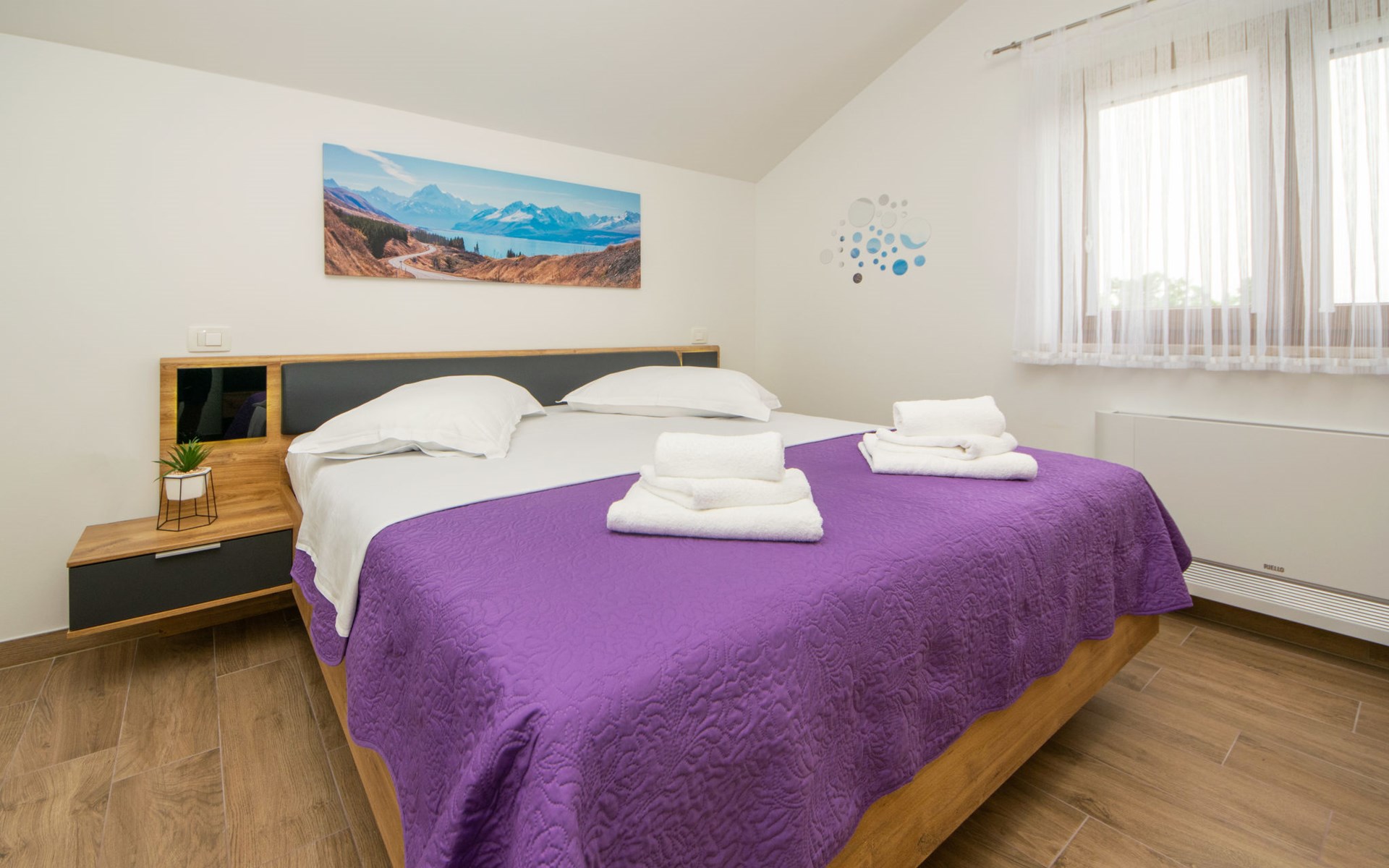 Gornji Proložac 6 km from Imotski: Child friendly, modern, beautiful villa "Oasis of peace", 2 storeys, built in 2019. In a quiet, sunny position, 38 km from the sea. Private: property 1'370 m2 (fenced), swimming pool angular, heated (12 x 5 m, depth 150 cm, seasonal availability: 01.May. - 01.Oct.) with internal staircase and salt-electrolysis pool-cleaning system. Paddling pool, outdoor shower, hot tub, pool house with fridge, WC and cooking stove, barbecue, children's playground (slide, swing). In the house: internet access, storage room for bicycles, washing machine. Available: bicycles. Parking (for 4 cars) at the house on the premises. Shop 6 km, restaurant 1 km, bus stop 7.3 km, pebble beach 38 km. Walking paths from the house 1 km, cycle lane 1 km. Well-known lakes can easily be reached: Modro jezero 1 km, Crveno jezero 1 km. Please note: suitable for families. The owner does not accept any youth groups. It is necessary to announce 7 days in advance if the pool heating is required. Pool house: kitchen with dining table and satellite TV. Private: small football playground (included).