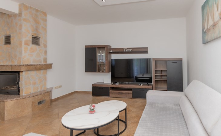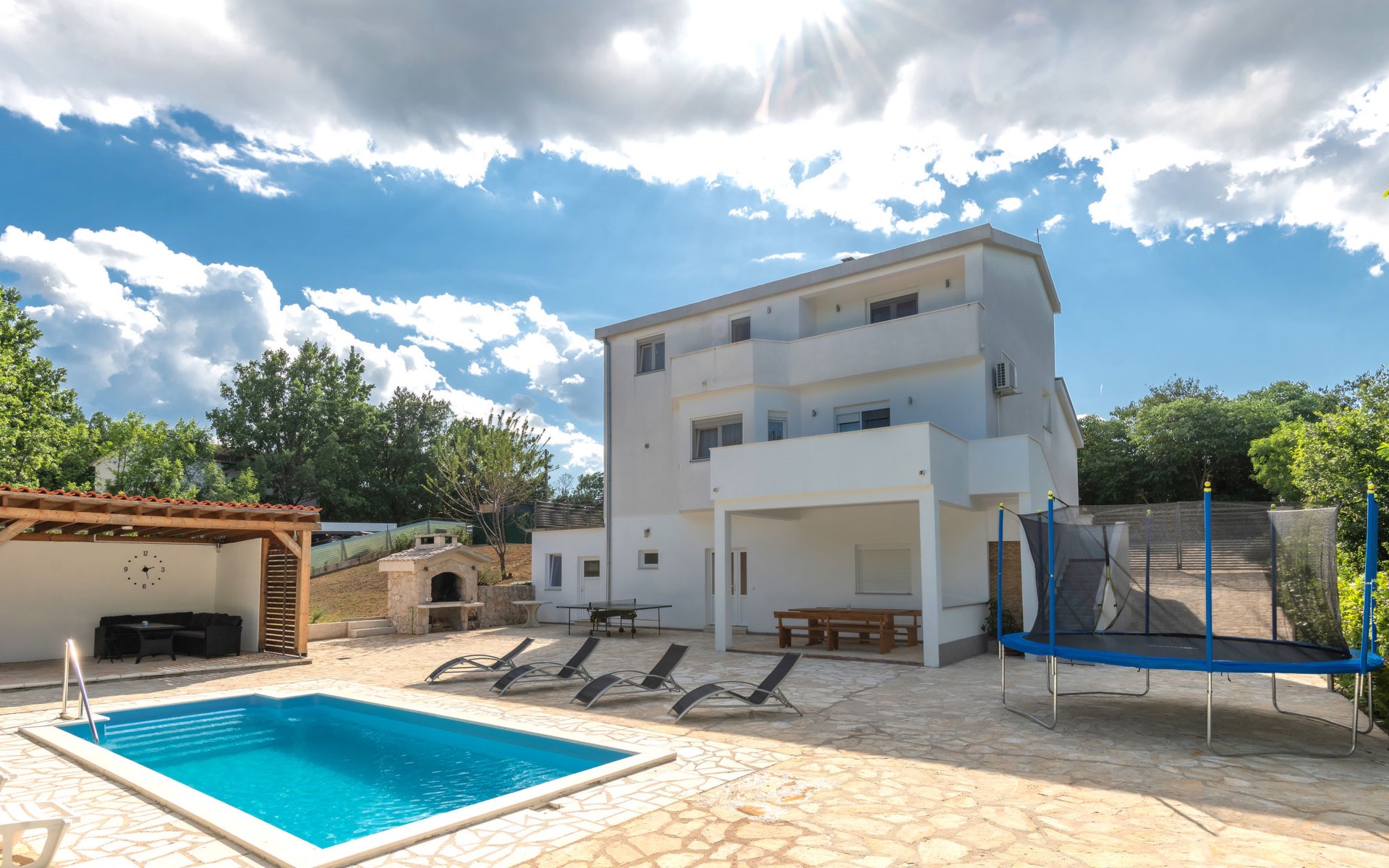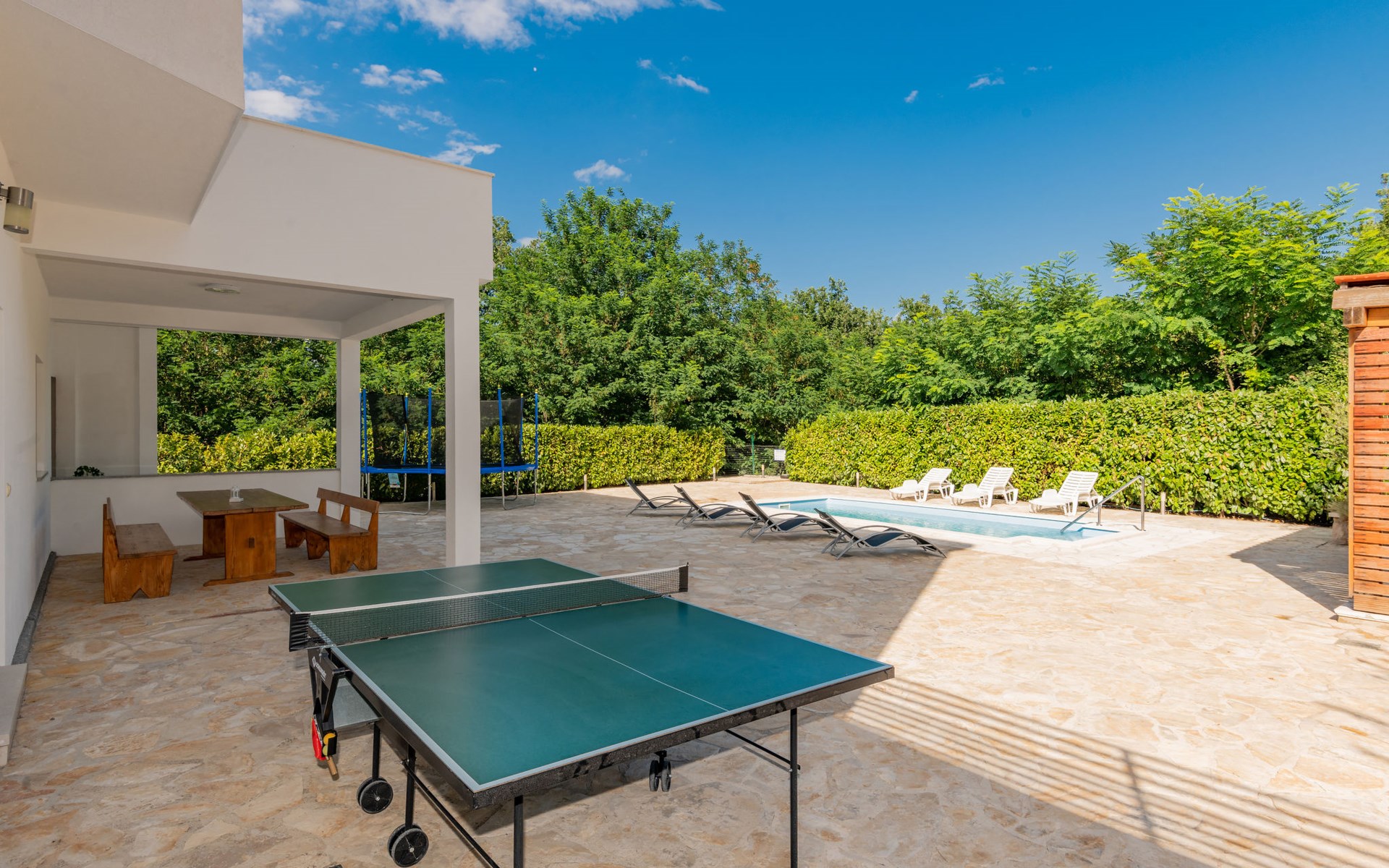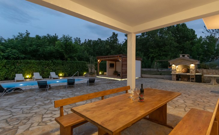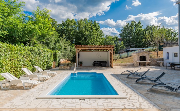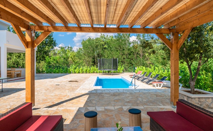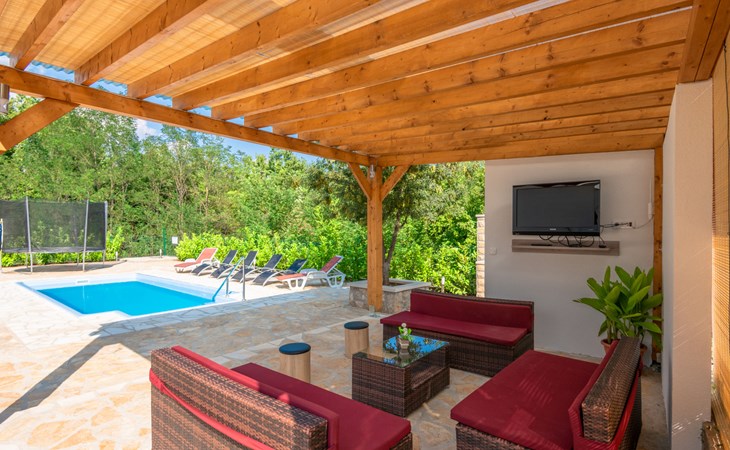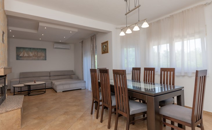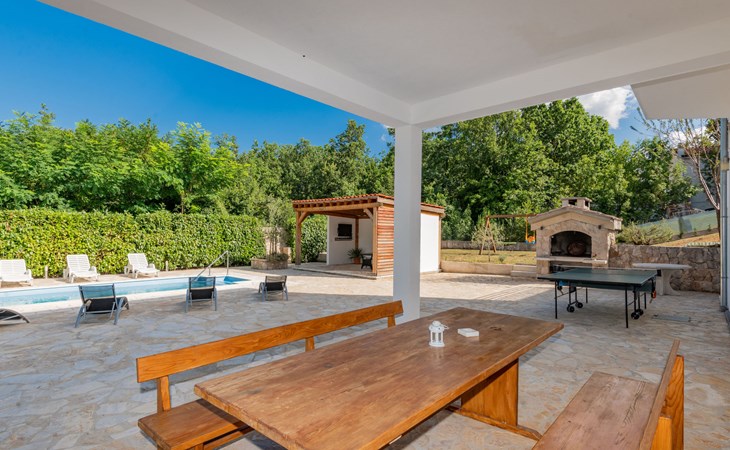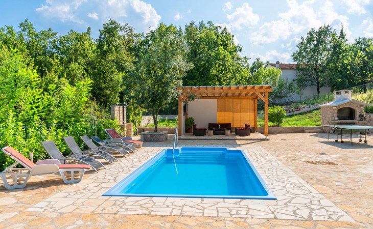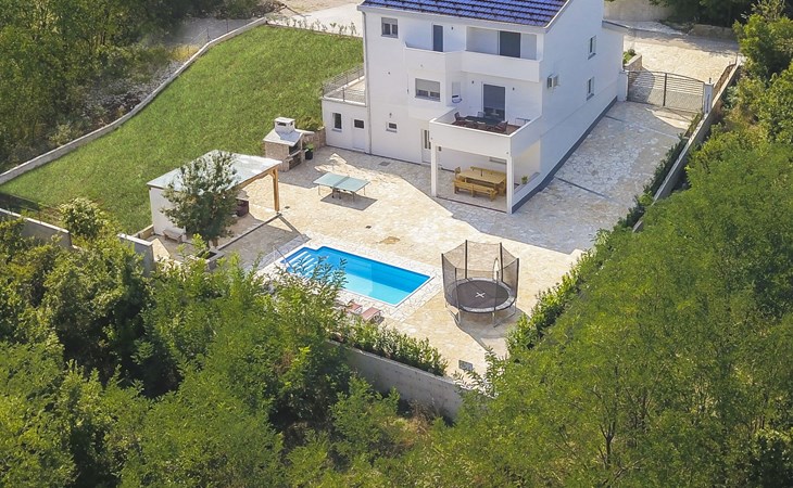 Single-family house "Villa Dalmatina", 2 storeys. 7.5 km from the centre of Imotski, in a quiet, sunny position, 30 km from the sea, 30 km from the beach, in a cul-de-sac. Private: property 3'000 m2 (fenced) with trees, swimming pool angular (7 x 4 m, depth 150 cm, seasonal availability: 15.Jun. - 01.Oct.). WC in the pool area, outdoor shower, pool house with fridge and cooking stove, table tennis, terrace (30 m2), barbecue. In the house: internet access, trampoline. Parking (for 5 cars) at the house on the premises. Shop 250 m, restaurant 7.5 km, bus stop 260 m, pebble beach 30 m. Nearby attractions: Modro jezero 10 km.