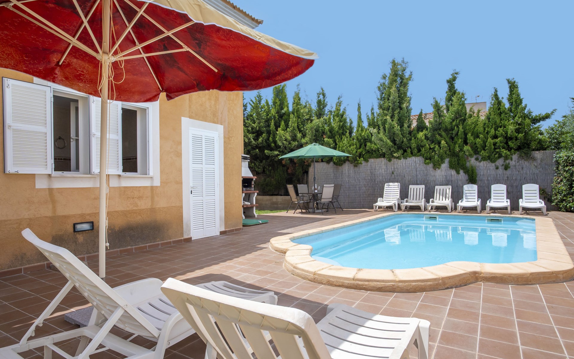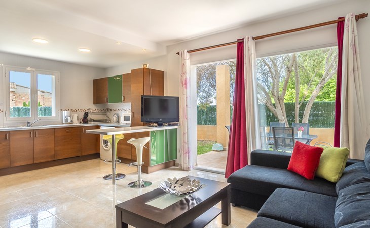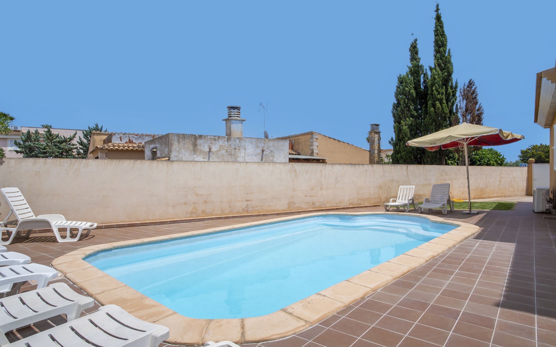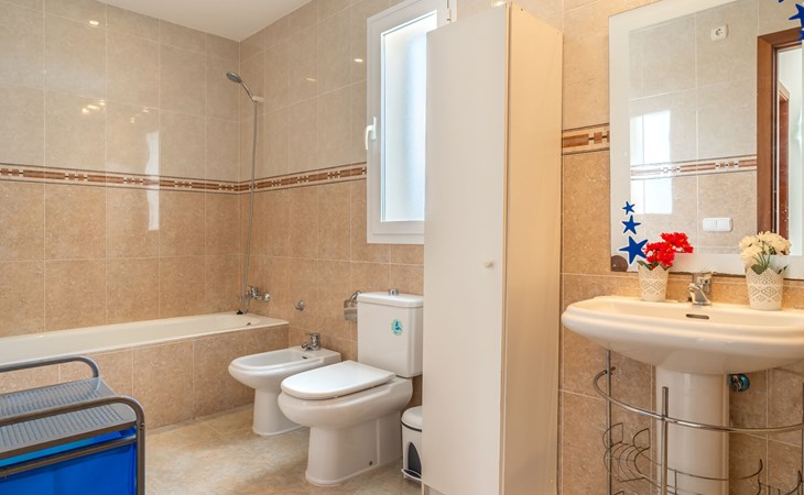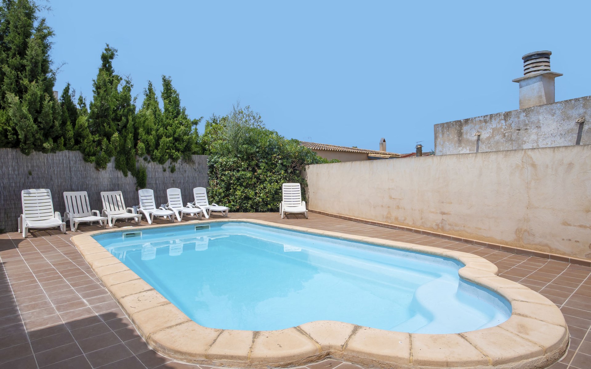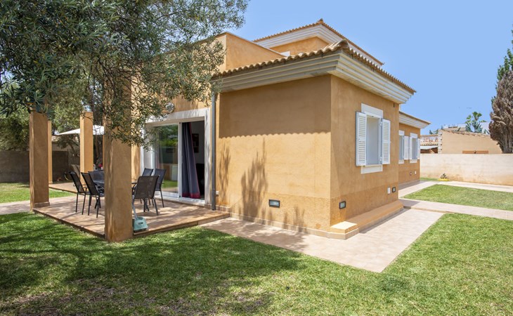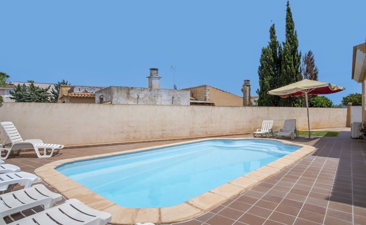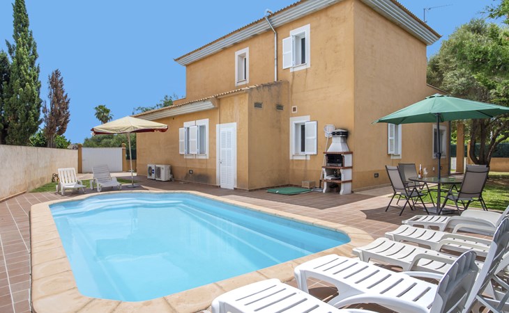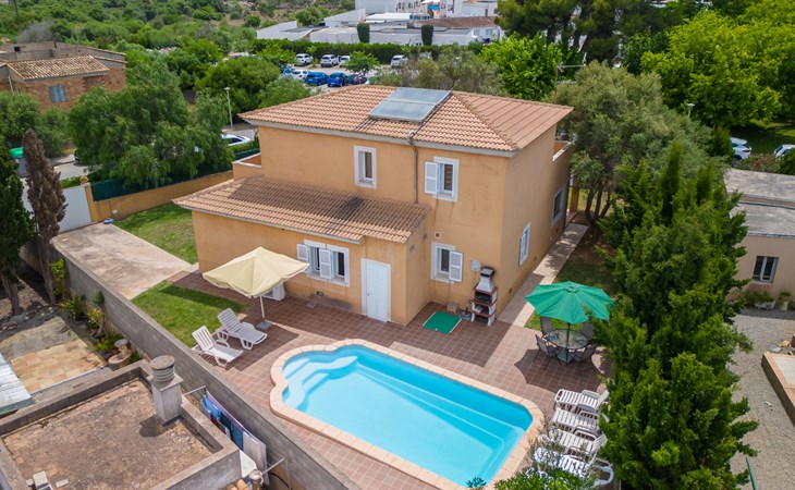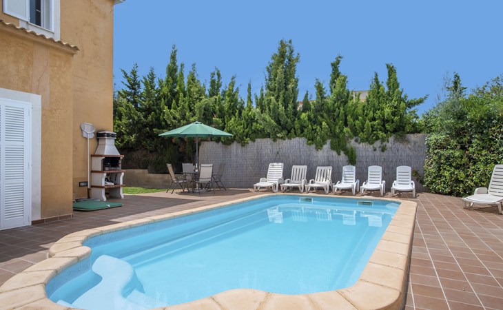 Sa Coma 2 km from Cala Millor: Large, cosy, comfortable single-family house "Sa Coma". 1 km from the centre of Sa Coma, 2 km from the centre of Cala Millor, 18 km from the centre of Manacor, in a central position in the residential district, 3 km from the edge of the forest, 2 km from the sea, 2 km from the beach, south-east facing position. Private: property 450 m2 (fenced), well-kept garden with lawn, swimming pool angular (6 x 3 m, seasonal availability: 01.Jan. - 31.Dec.). Outdoor shower, pool maintenance by the owner/gardener. In the house: air conditioning. Parking on the premises. Shop 3 km, grocery, supermarket 400 m, shopping centre 4 km, restaurant 400 m, bar 500 m, bakery 700 m, 10 minute walk to the centre, bus stop "Savines 1 (51002)" 1.4 km, railway station "Estación de Manacor" 18 km, sandy beach "Platja de Sa Coma" 2 km. Sports harbour 6 km, marina 6 km, golf course (18 hole) 9 km, surf school 6 km, sailing school 6 km, tennis 18 km, riding stable 3 km, walking paths from the house 10 km. Nearby attractions: Rafa Nadal Academy 16 km, Coves del Drac 8 km, Coves dels Hams 8 km, Es Trenc 50 km, Poblat Talaiòtic de Ses Païsses 15 km. Object suitable for 12 adults. The owner does not accept any youth groups. Please note: airfield 66 km from the property.