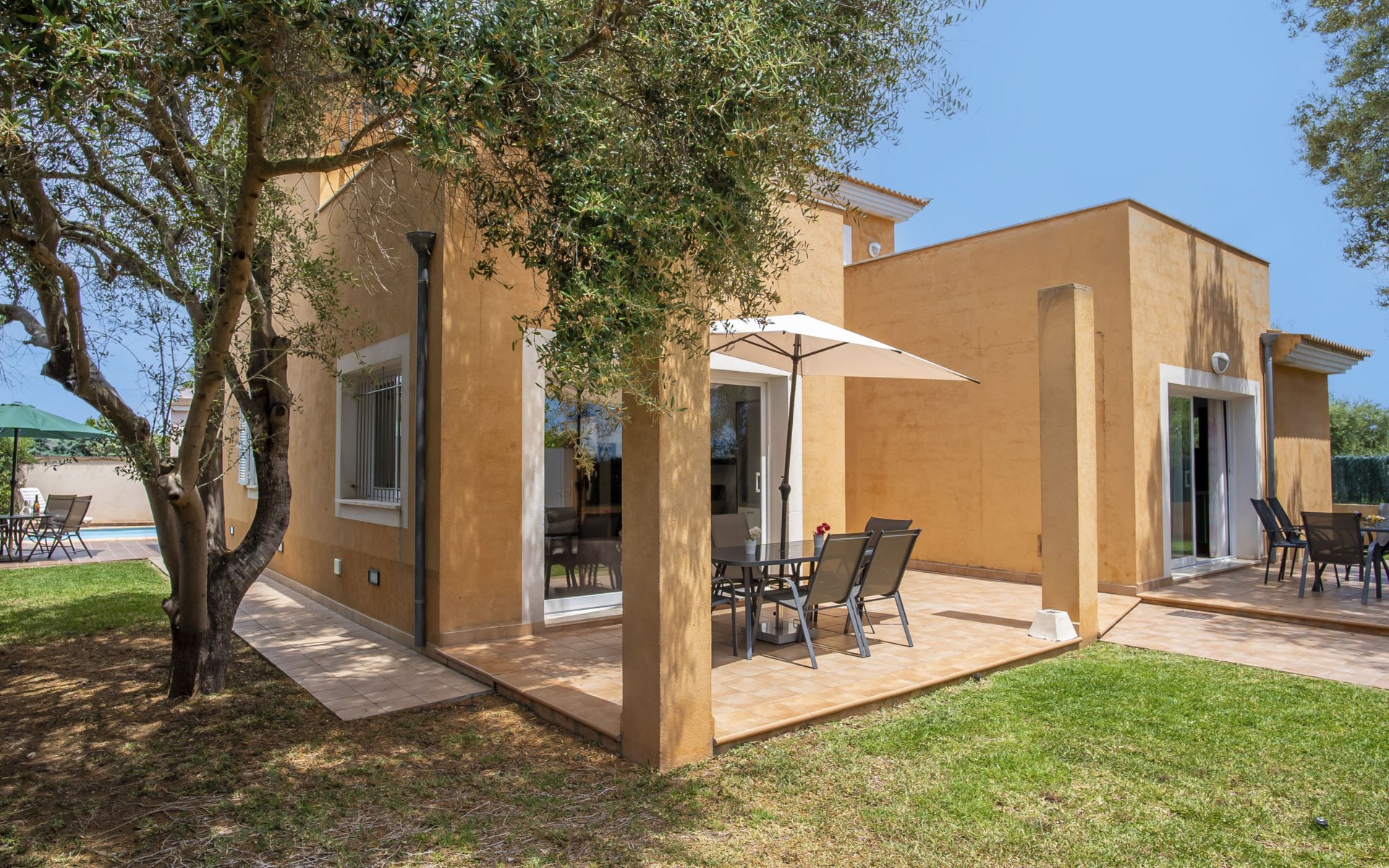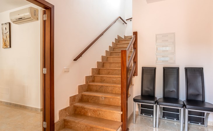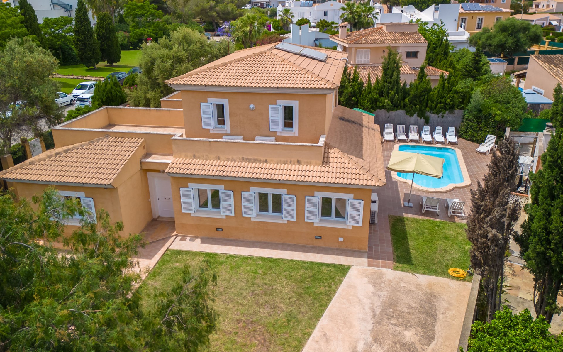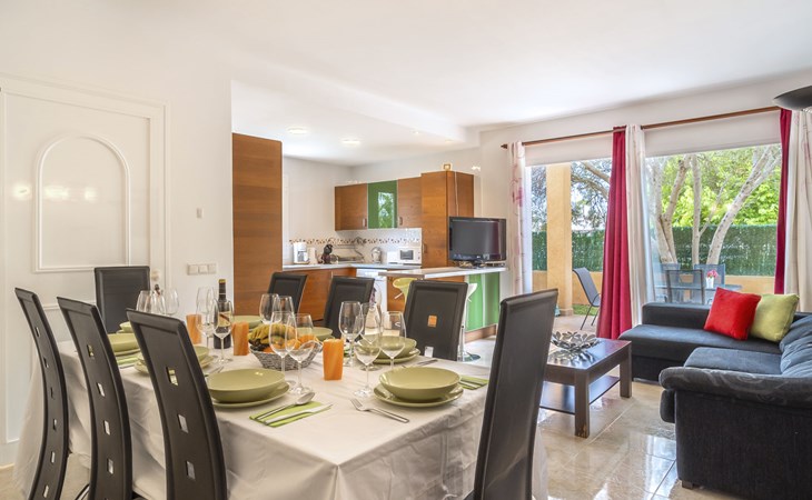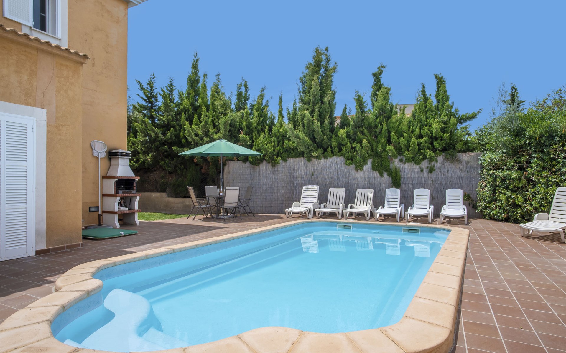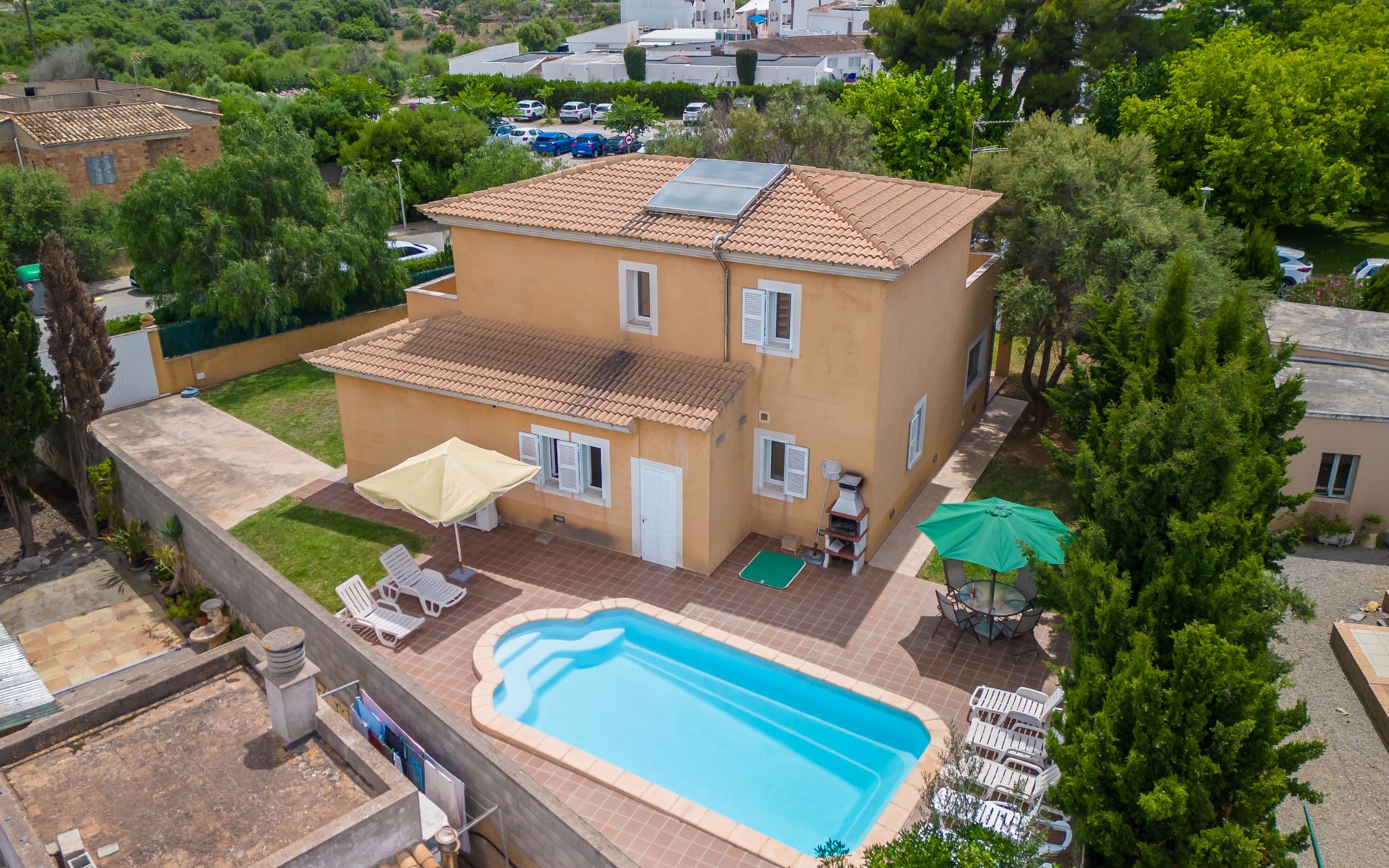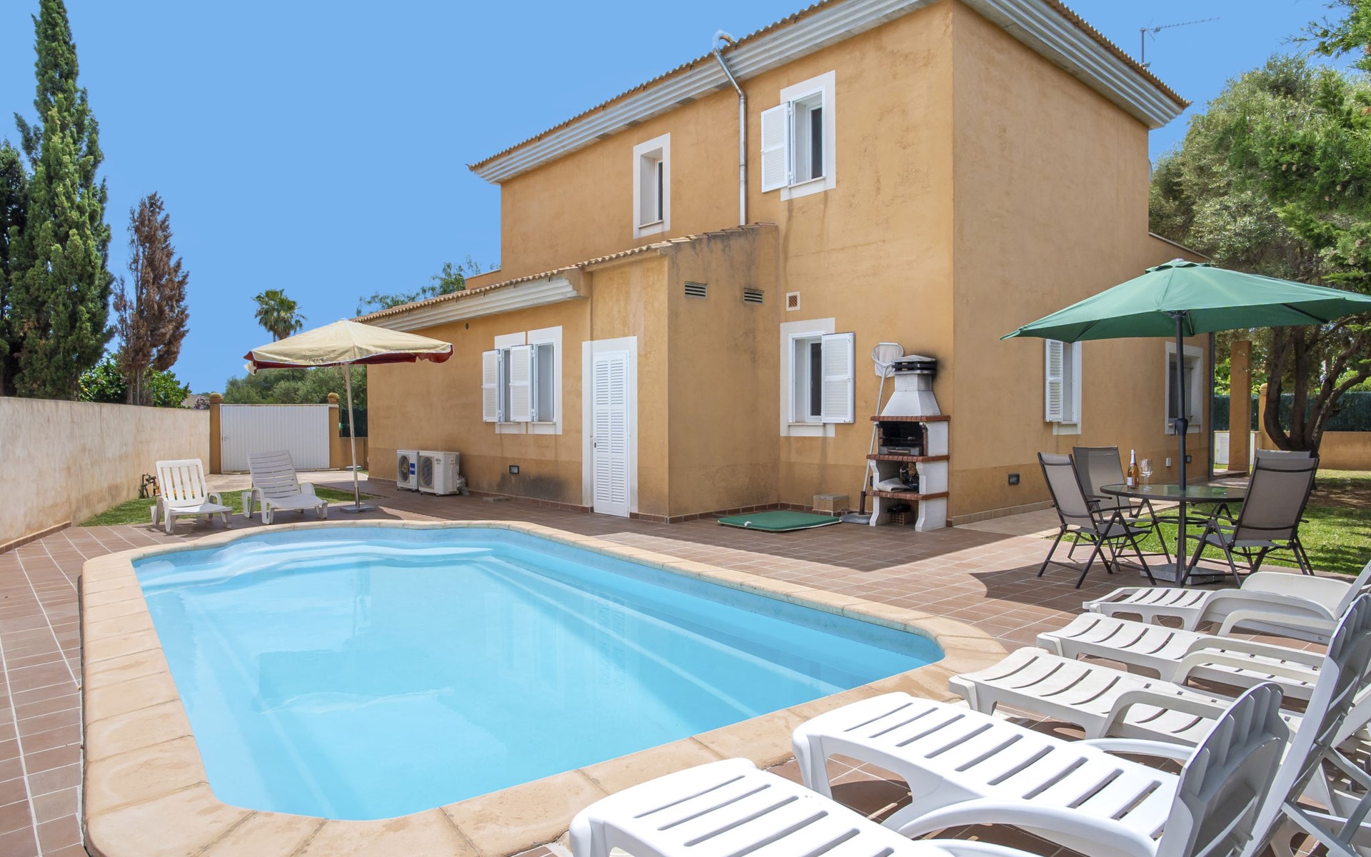 Sa Coma 2 km from Cala Millor: Large, cosy, comfortable single-family house "Sa Coma". 1 km from the centre of Sa Coma, 2 km from the centre of Cala Millor, 18 km from the centre of Manacor, in a central position in the residential district, 3 km from the edge of the forest, 2 km from the sea, 2 km from the beach, south-east facing position. Private: property 450 m2 (fenced), well-kept garden with lawn, swimming pool angular (6 x 3 m, seasonal availability: 01.Jan. - 31.Dec.). Outdoor shower, pool maintenance by the owner/gardener. In the house: air conditioning. Parking on the premises. Shop 3 km, grocery, supermarket 400 m, shopping centre 4 km, restaurant 400 m, bar 500 m, bakery 700 m, 10 minute walk to the centre, bus stop "Savines 1 (51002)" 1.4 km, railway station "Estación de Manacor" 18 km, sandy beach "Platja de Sa Coma" 2 km. Sports harbour 6 km, marina 6 km, golf course (18 hole) 9 km, surf school 6 km, sailing school 6 km, tennis 18 km, riding stable 3 km, walking paths from the house 10 km. Nearby attractions: Rafa Nadal Academy 16 km, Coves del Drac 8 km, Coves dels Hams 8 km, Es Trenc 50 km, Poblat Talaiòtic de Ses Païsses 15 km. Object suitable for 12 adults. The owner does not accept any youth groups. Please note: airfield 66 km from the property.