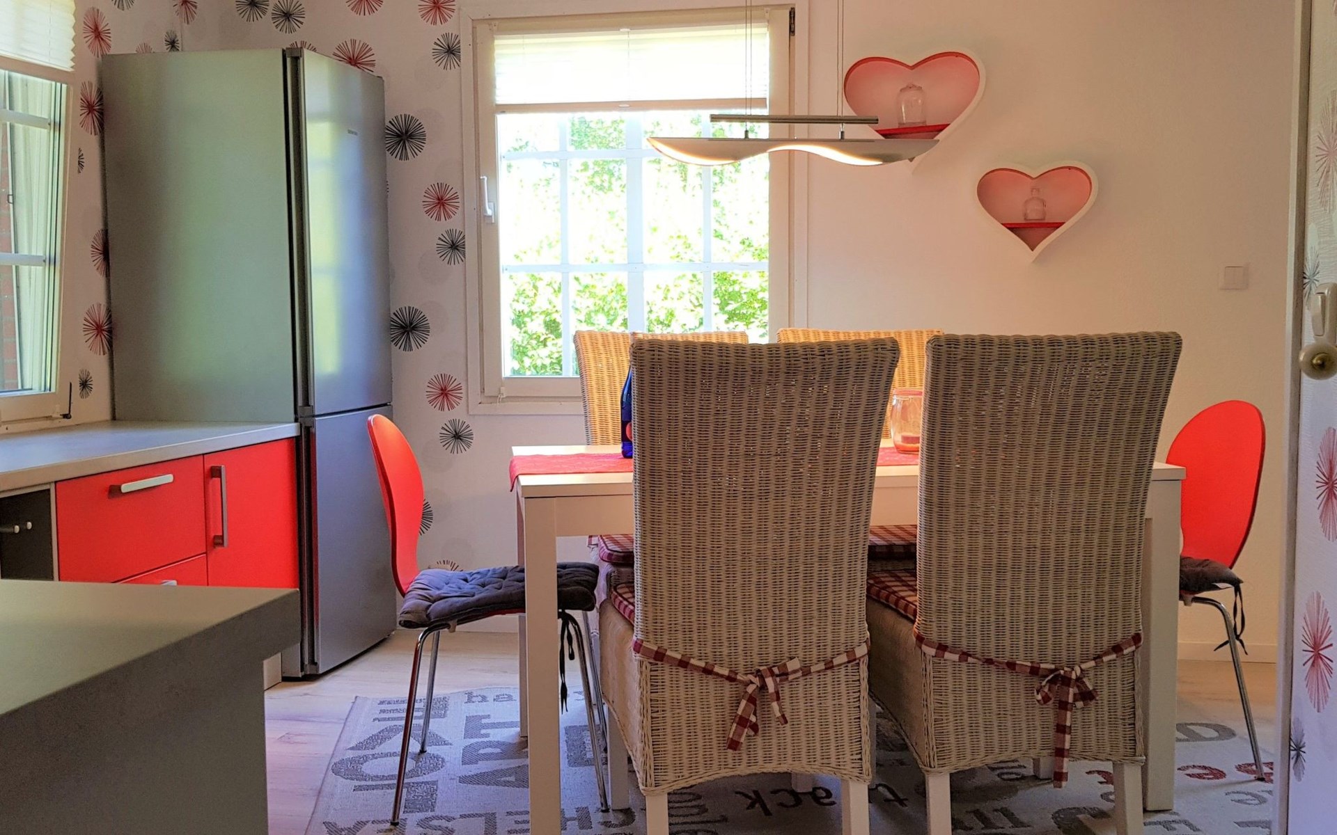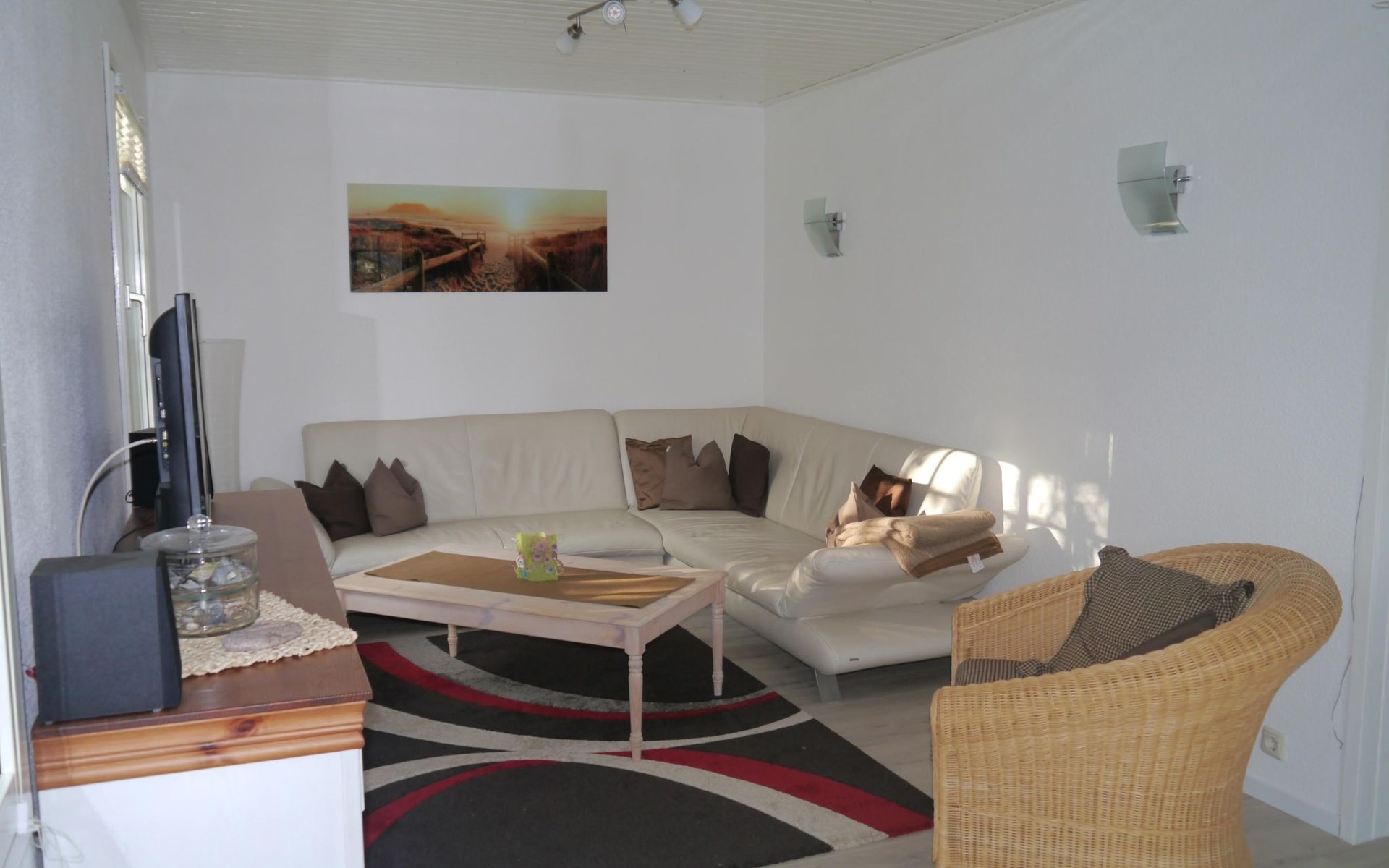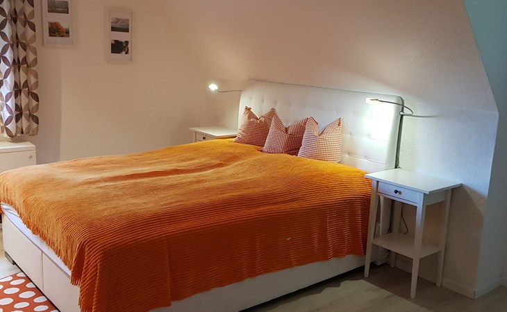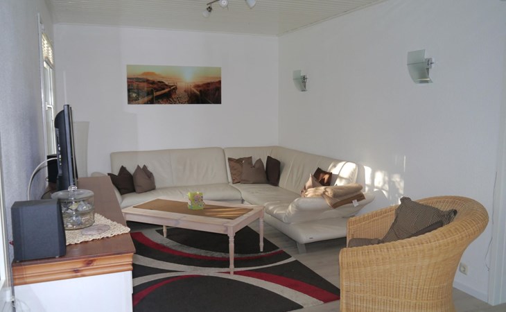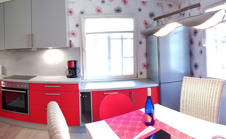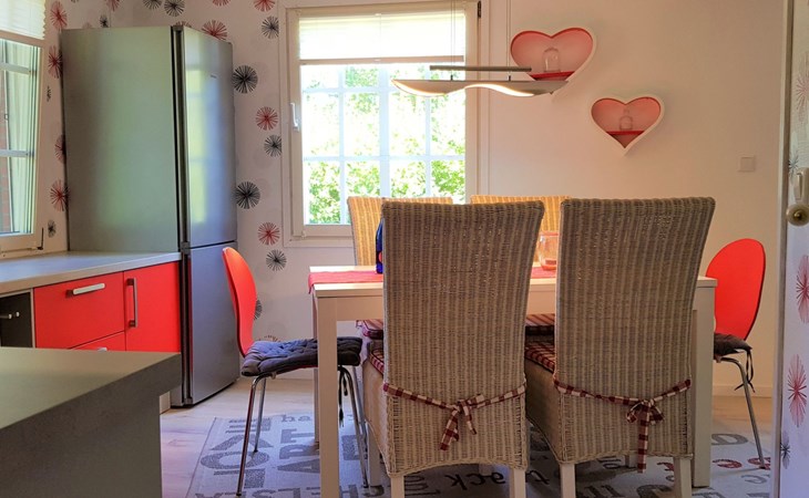 It has three bedrooms. The bedroom on the ground floor is furnished with two single beds (90 x 200cm) and there is also a guest WC with a washbasin. The two other bedrooms are on the upper floor. There is a generous sleeping area with a double bed (160 x 200cm), a walk-in wardrobe and comfortable seating, while the other bedroom has a comfortable French-style double bed (140 x 200cm). You go across the hallway to the spacious shower room with a washbasin and WC. The ground floor has a fully-equipped kitchen-diner with all the necessary appliances for cooking and baking. If you are in a hurry you can use the microwave. After cooking, the dishwasher takes over the rest of the work, so you can relax and dine. The coffee machine, toaster and kettle ensure that breakfast gets off to a good start. The fridge also has a freezer compartment, so groceries can be stored optimally during your stay. Directly adjoining the kitchen there is the living room with modern entertainment electronics. All the rooms have heating, so it is always pleasantly warm even in cold weather.