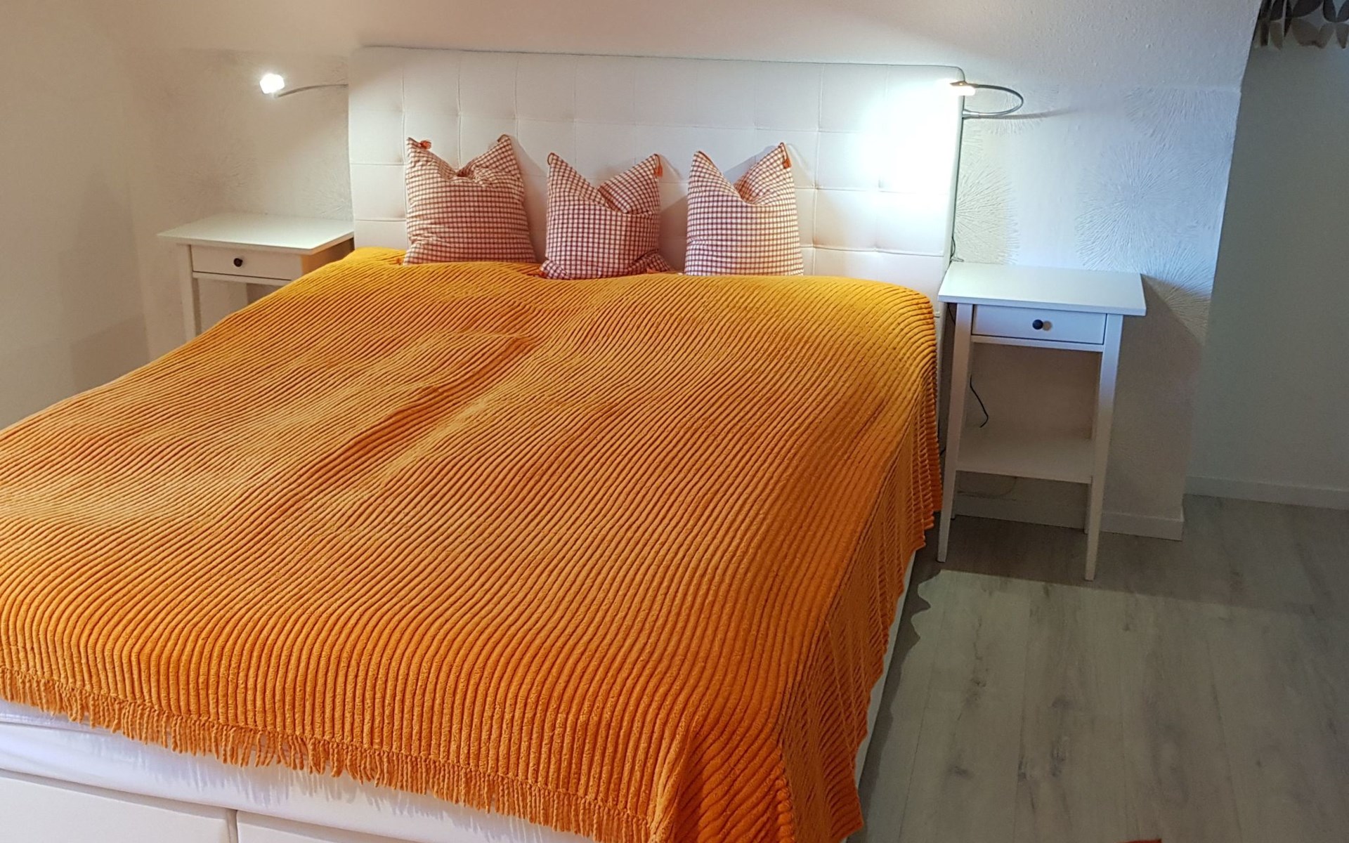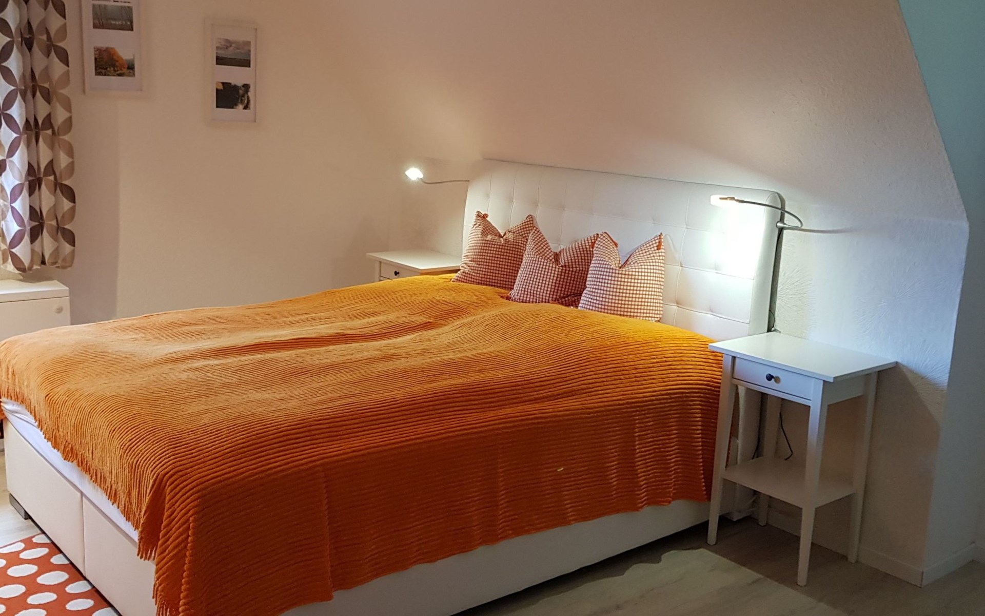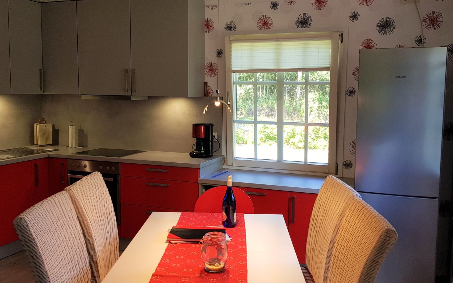 It has three bedrooms. The bedroom on the ground floor is furnished with two single beds (90 x 200cm) and there is also a guest WC with a washbasin. The two other bedrooms are on the upper floor. There is a generous sleeping area with a double bed (160 x 200cm), a walk-in wardrobe and comfortable seating, while the other bedroom has a comfortable French-style double bed (140 x 200cm). You go across the hallway to the spacious shower room with a washbasin and WC. The ground floor has a fully-equipped kitchen-diner with all the necessary appliances for cooking and baking. If you are in a hurry you can use the microwave. After cooking, the dishwasher takes over the rest of the work, so you can relax and dine. The coffee machine, toaster and kettle ensure that breakfast gets off to a good start. The fridge also has a freezer compartment, so groceries can be stored optimally during your stay. Directly adjoining the kitchen there is the living room with modern entertainment electronics. All the rooms have heating, so it is always pleasantly warm even in cold weather.