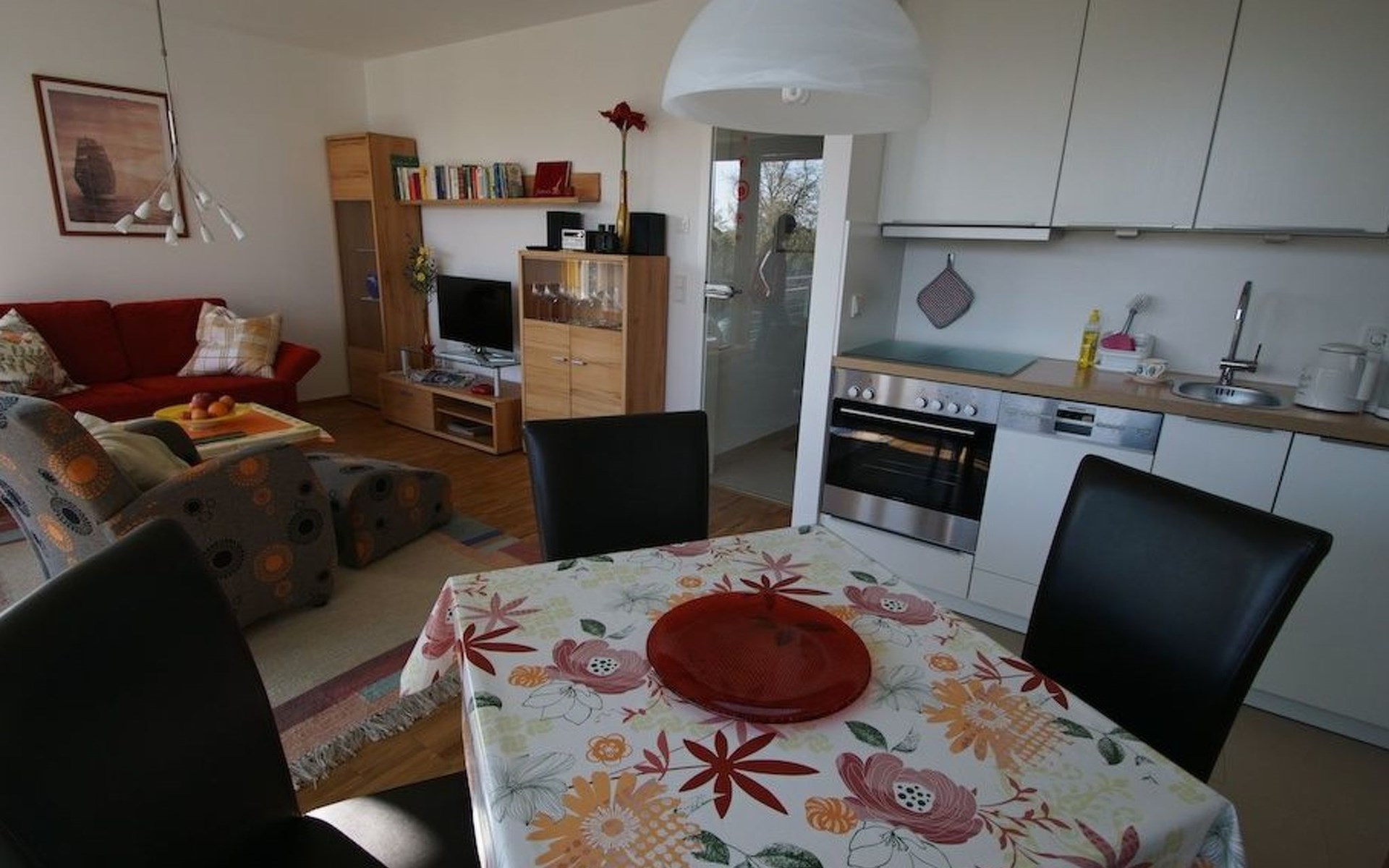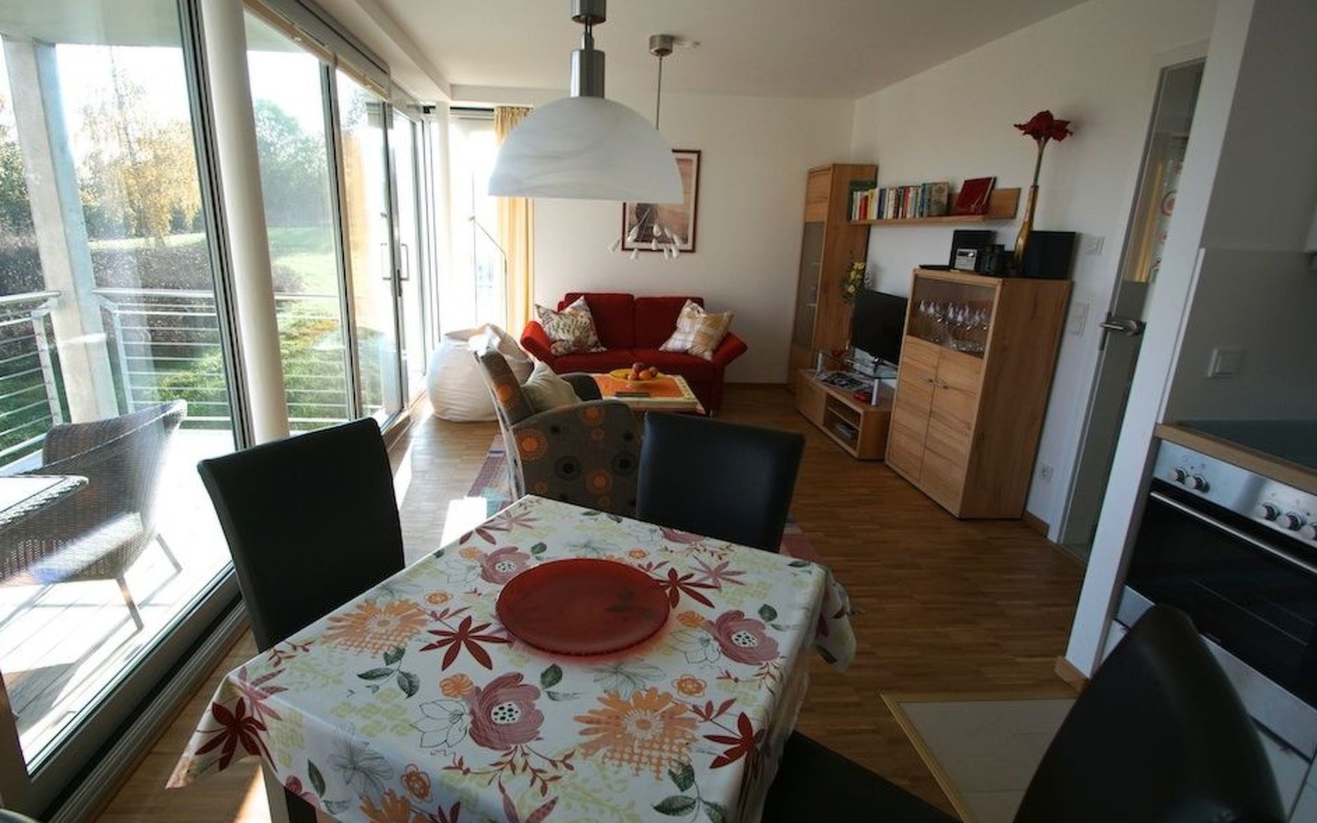 A comfortably furnished 49m² two-room apartment awaits you. The balcony side of the living space facing south-east is completely fitted with floor-to-ceiling sliding window elements, allowing ample daylight in and creating a loft character. The kitchen space is fully-equipped. The underfloor heating provides pleasant warmth. The bedroom is furnished with a double bed (180 x 200cm) with separate mattresses and a big wardrobe.