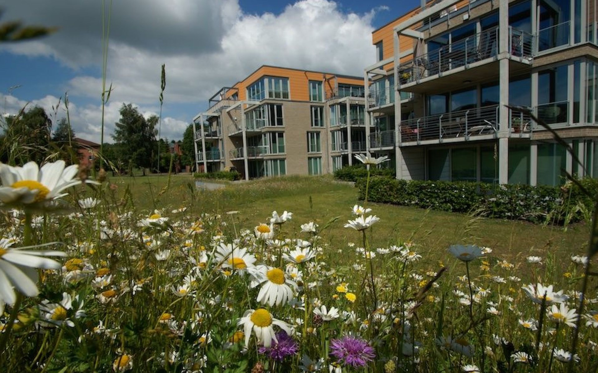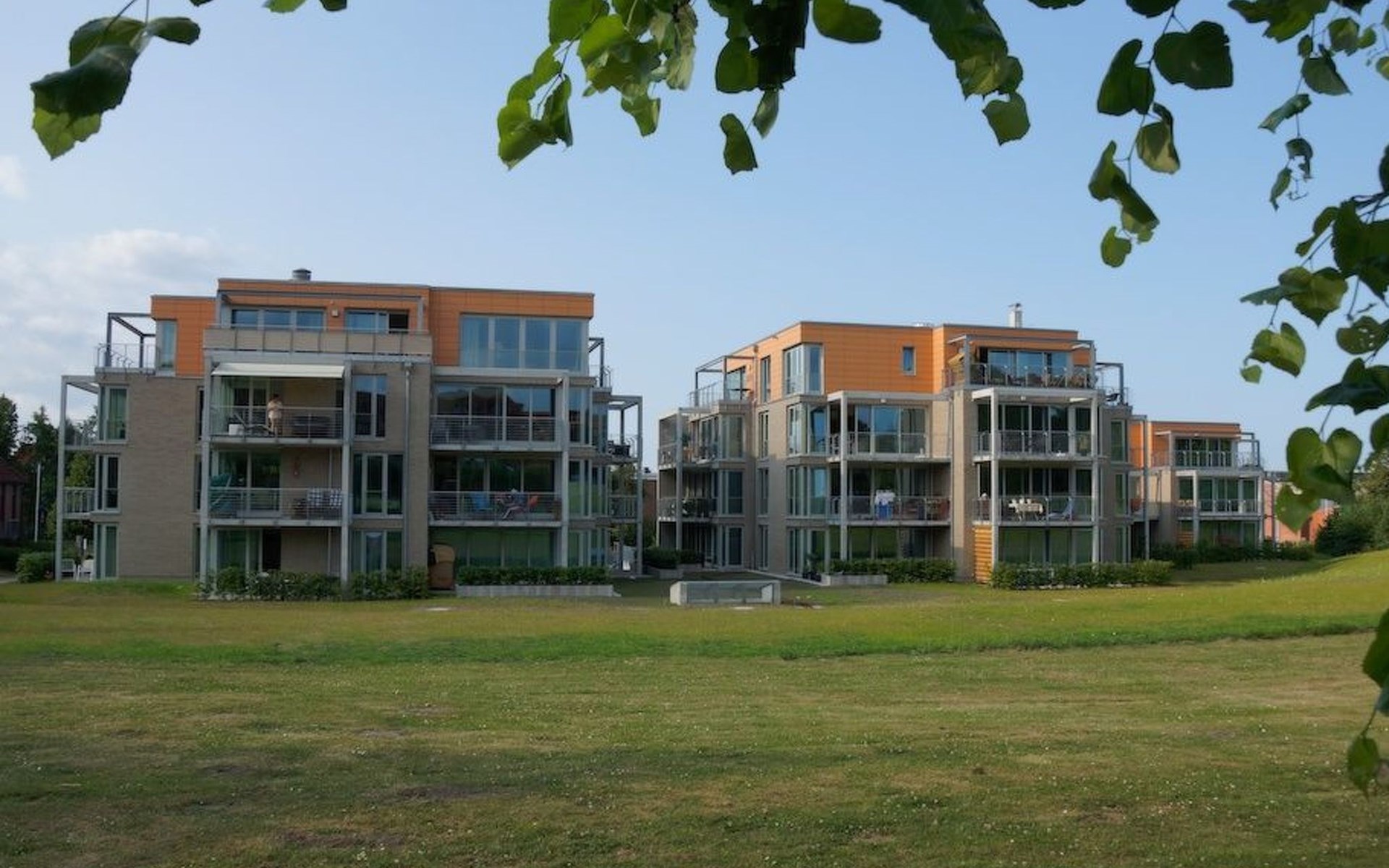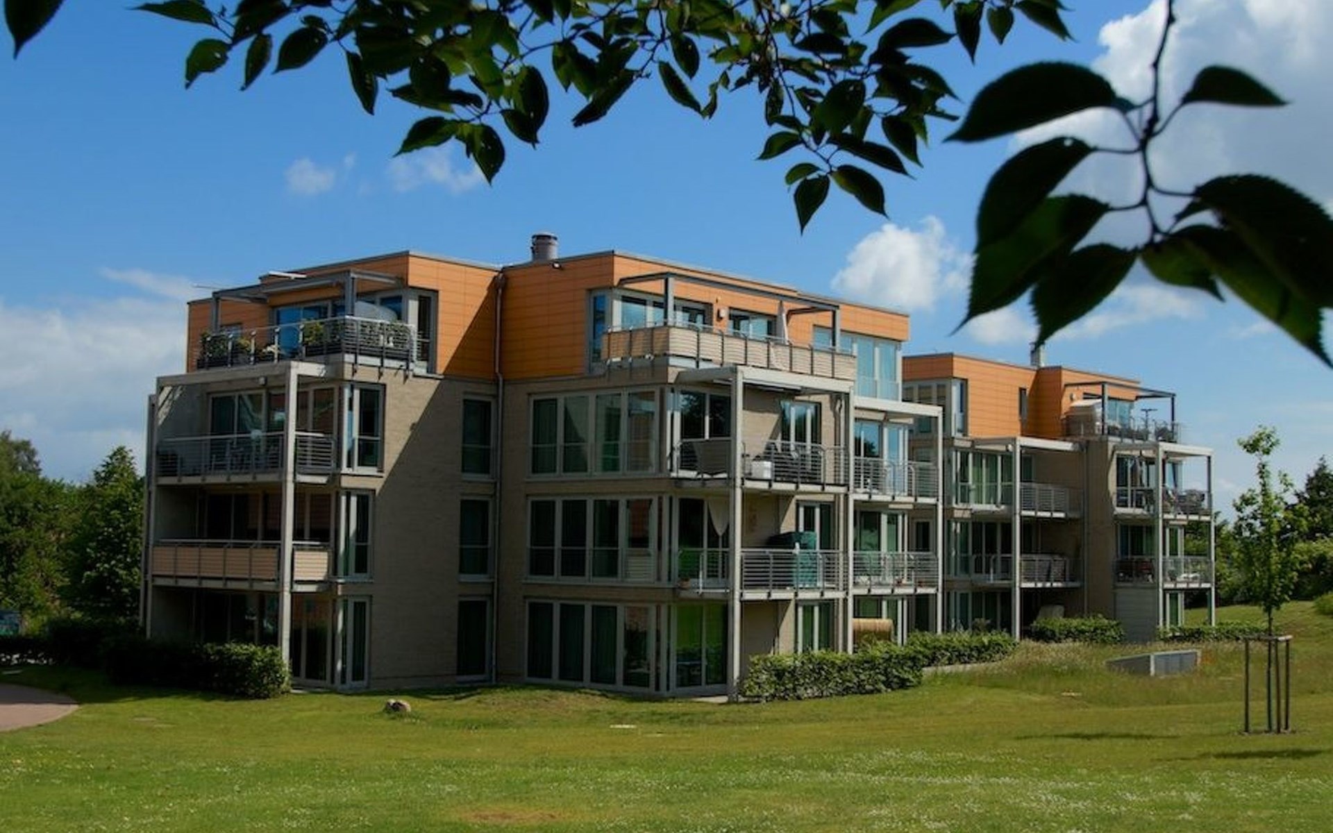 The balcony provides garden furniture, a parasol and garden loungers. The park-like site of around 7000m² has three offset houses, two of which have three storeys and one of which has two storeys. The attic storeys consist of penthouse apartments. The car parking space designated for the apartment is right in front of the house entrance.
