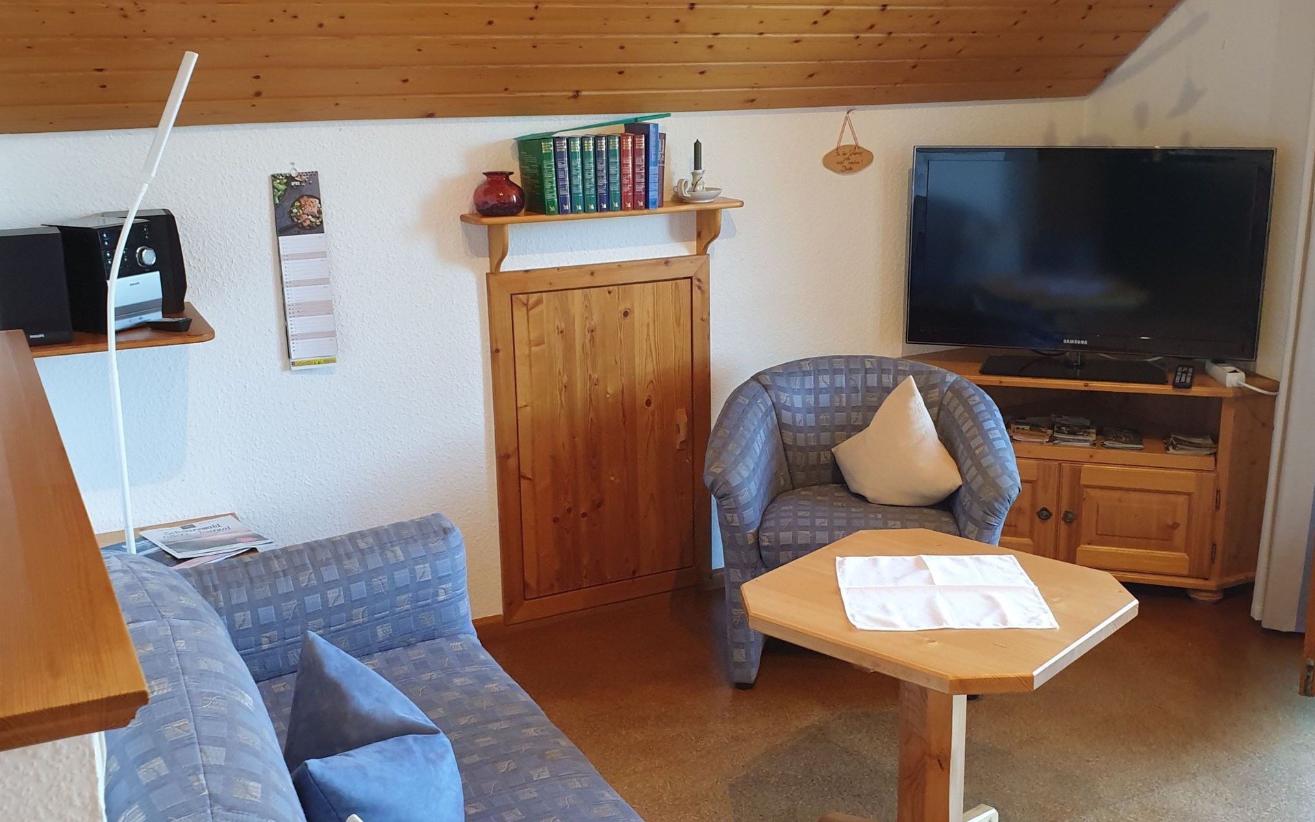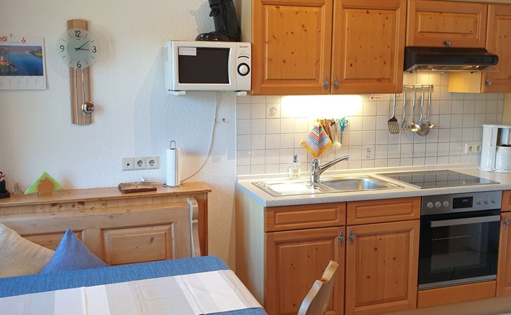- You can expect a cosy country-style furnished attic holiday flat with 45 sqm on the 1st floor accessible via 1 staircase with cork and tiled floors, covered balcony with table and chairs, separate entrance - 1 bedroom with double bed (180x200), in which an additional cot would be possible as an extra bed. - adjoining bathroom with shower/WC and urinal - a spacious eat-in kitchen with dining area and cosy sitting area, which can be used as a sofa bed (80x180 cm) if required, as well as flat-screen TV and stereo system - a fully equipped kitchenette with dishwasher, cooker with oven, bread machine, microwave, kettle/egg cooker, toaster, waffle iron, coffee machine, Senseo pad machine, blender, etc. - a bathroom with shower/WC and urinal.