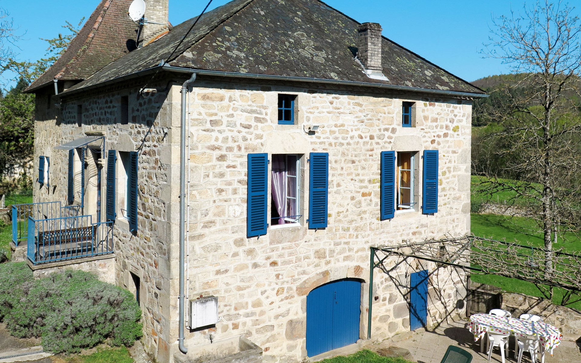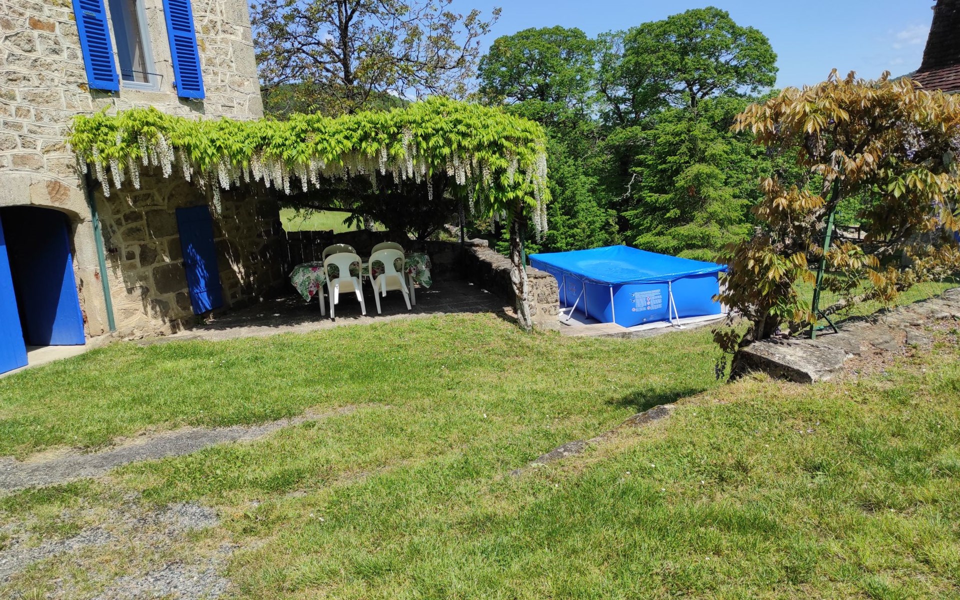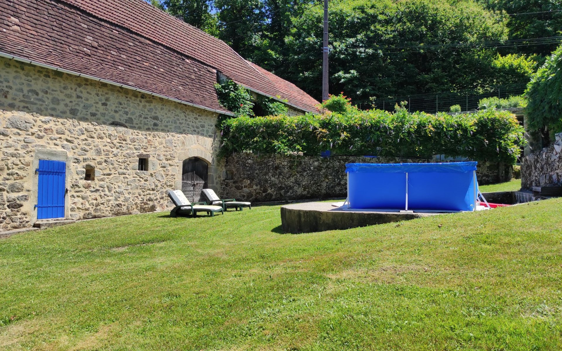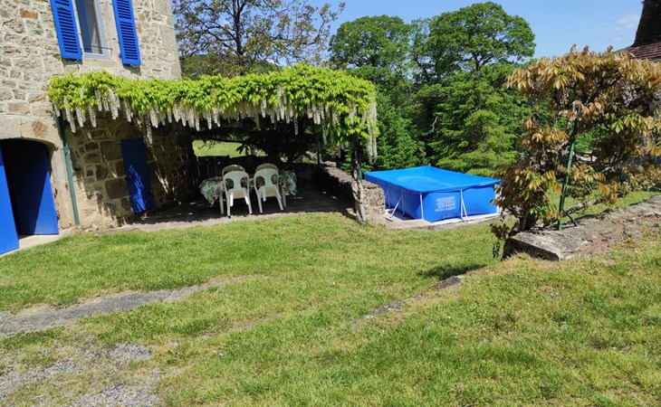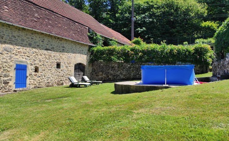 Rustic country house "Cazals", 430 m a.s.l., surrounded by meadows and fields. 700 m from the centre of Teyssieu, 13 km from the centre of Bretenoux, 14 km from the centre of Saint Céré, in a quiet position on a slope, 4 km from the river. Private: natural state property 5'000 m2 (fenced) with wildlife garden and trees, swimming pool (above ground) (3.80 m diameter, depth 90 cm, seasonal availability: 01.May. - 15.Sep.). Table tennis. Stepped path (4 steps) to the house. Parking at the house on the premises. Shop 700 m, supermarket 13 km, bus stop "Laval-de-Cère" 7 km. Golf course (9 hole) 14 km.